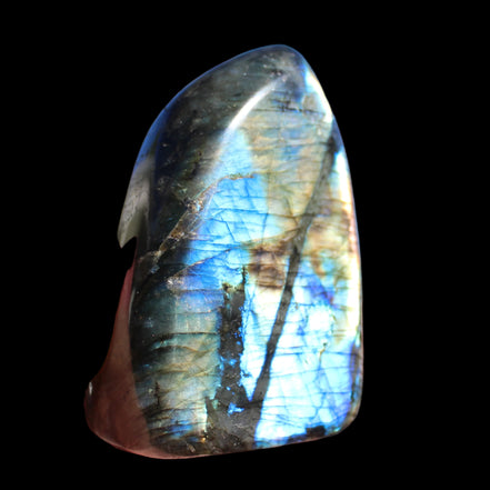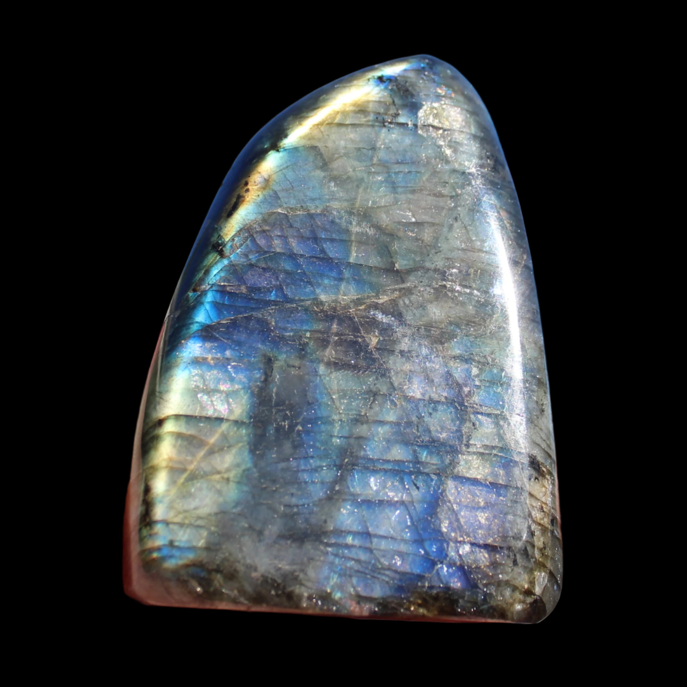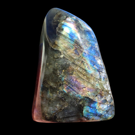 This Labradorite freeform weighs 412g. Labradorite is a crystalline form of Plagioclase Feldspar. It has a lamellar structure with a mixture of Albite and Anorthite in fine alternating layers. It was originally found at Ford Harbour, Paul Island, near Nain, off the east coast of Labrador, Newfoundland.