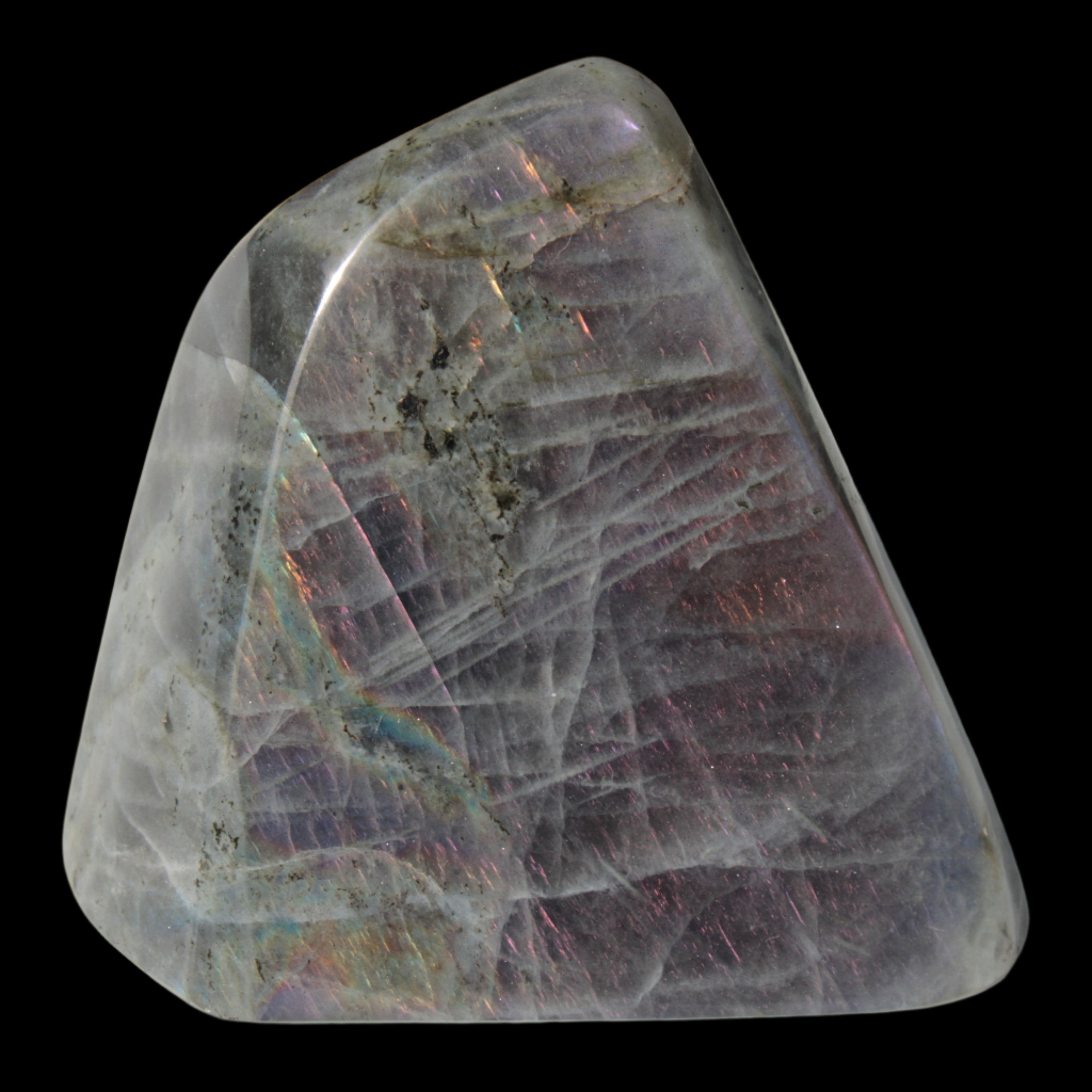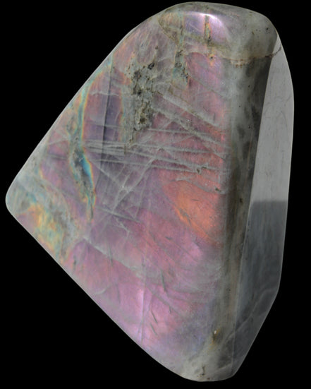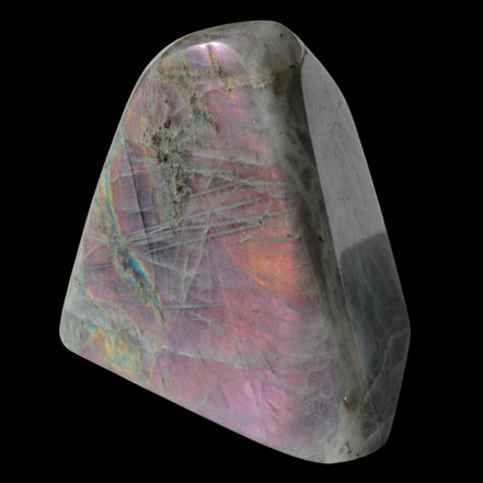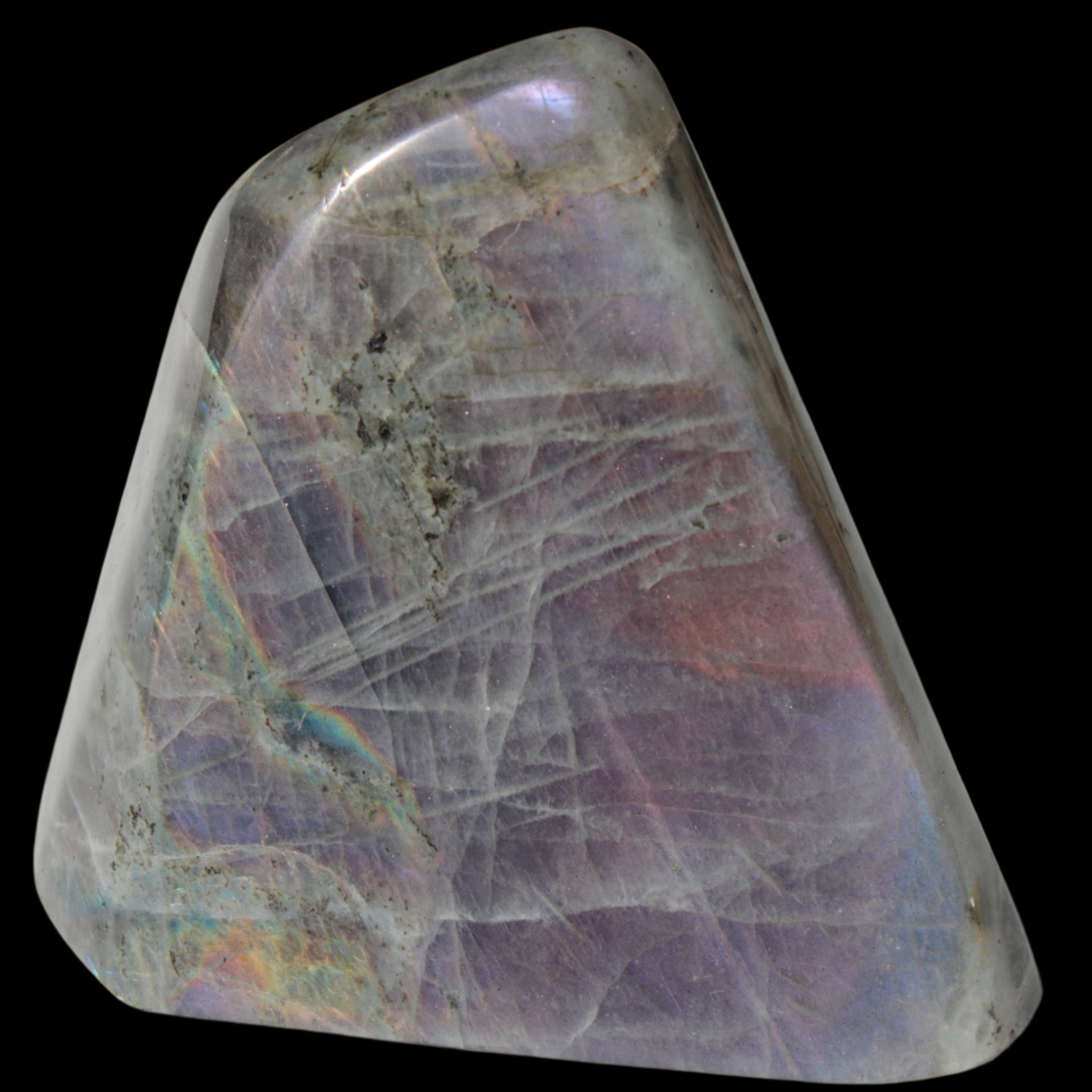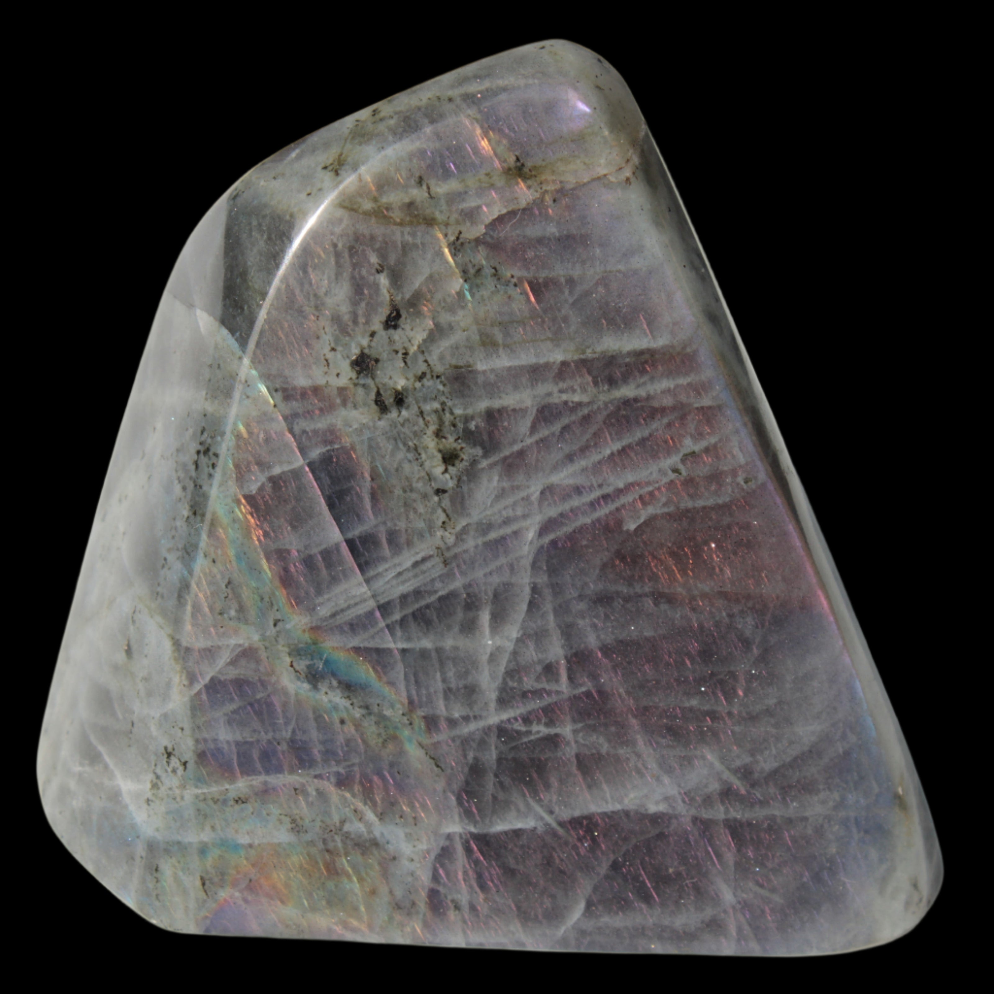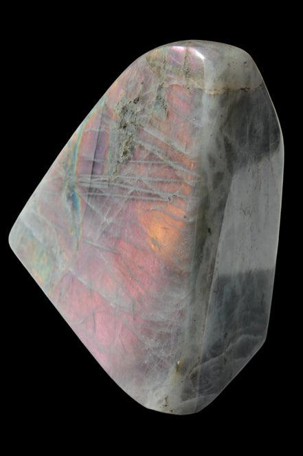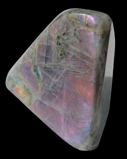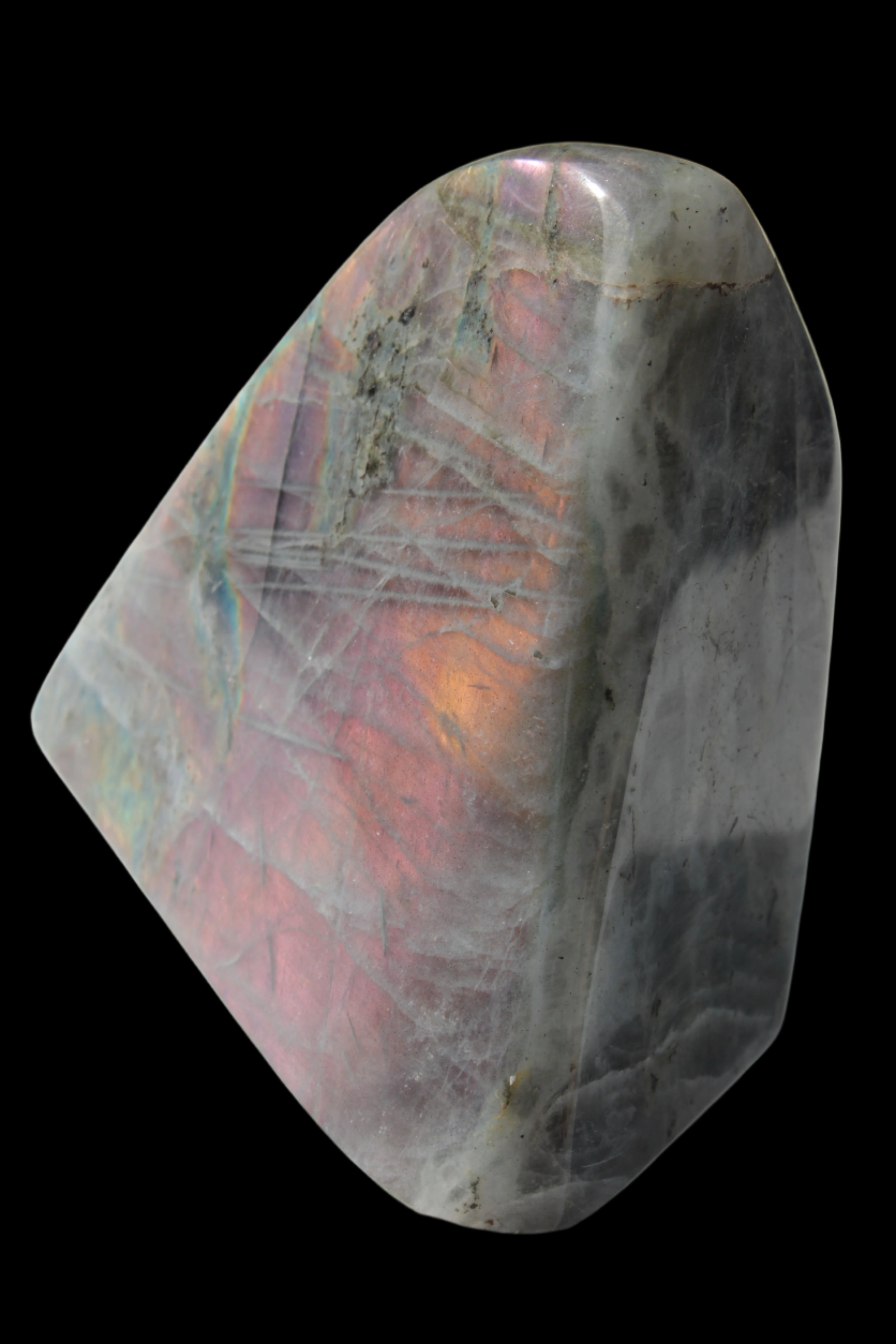 This Labradorite freeform weighs 557g. Labradorite is a crystalline form of Plagioclase Feldspar. It has a lamellar structure with a mixture of Albite and Anorthite in fine alternating layers. It was originally found at Ford Harbour, Paul Island, near Nain, off the east coast of Labrador, Newfoundland.