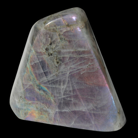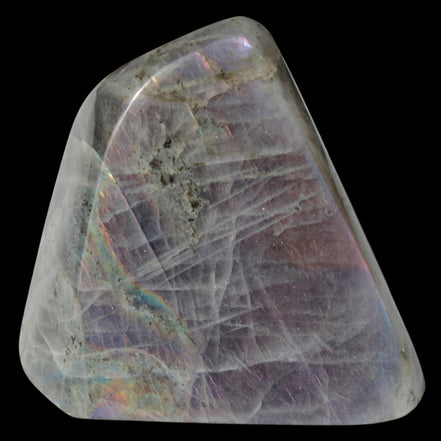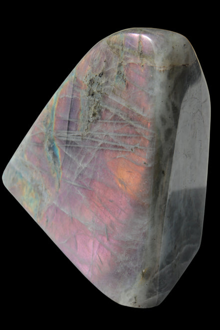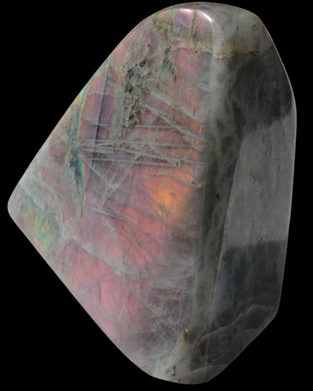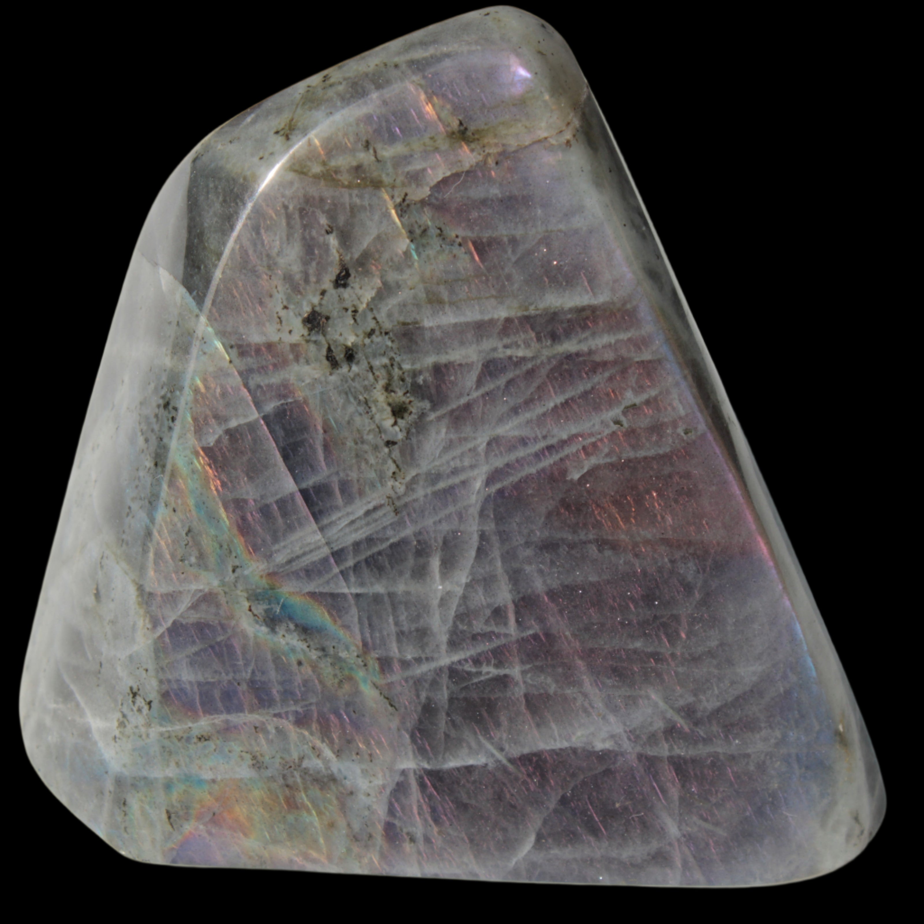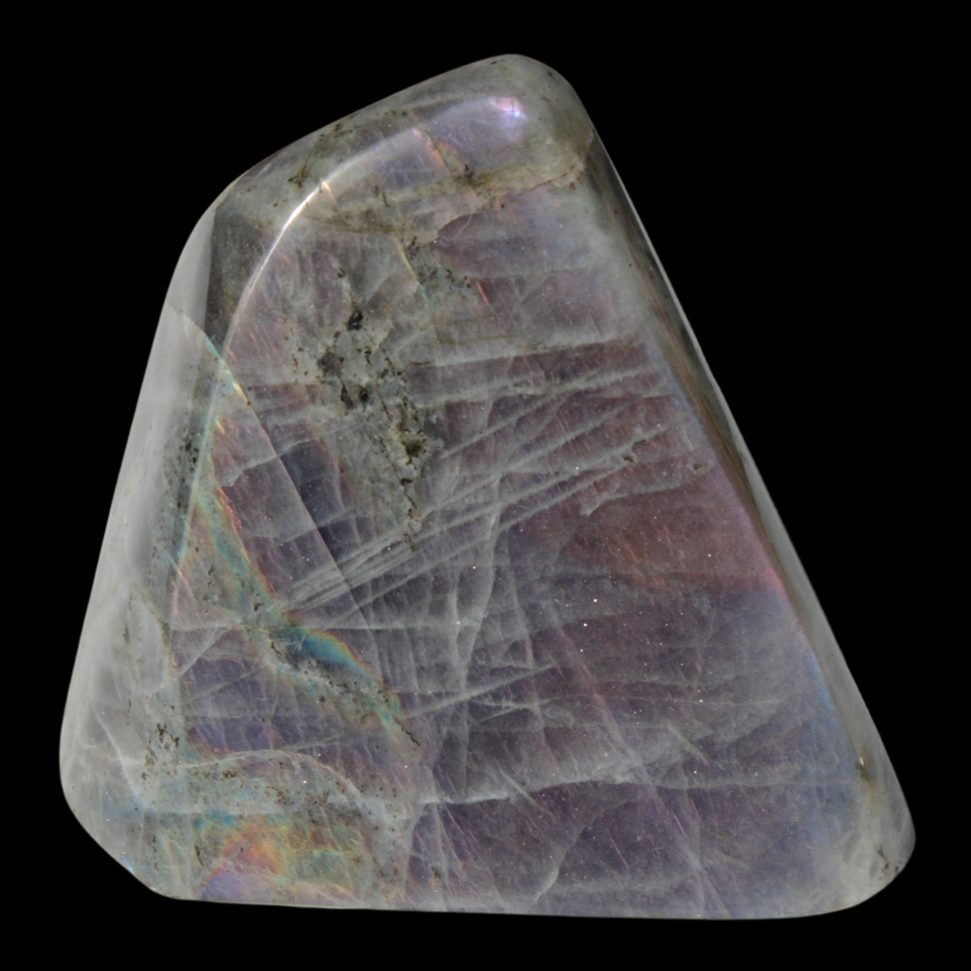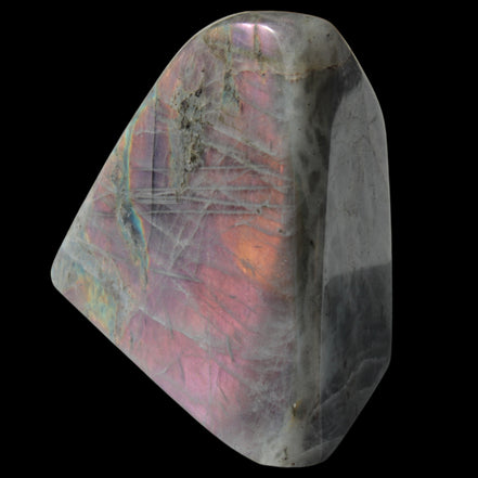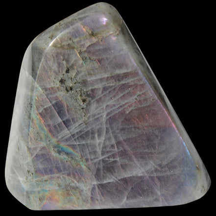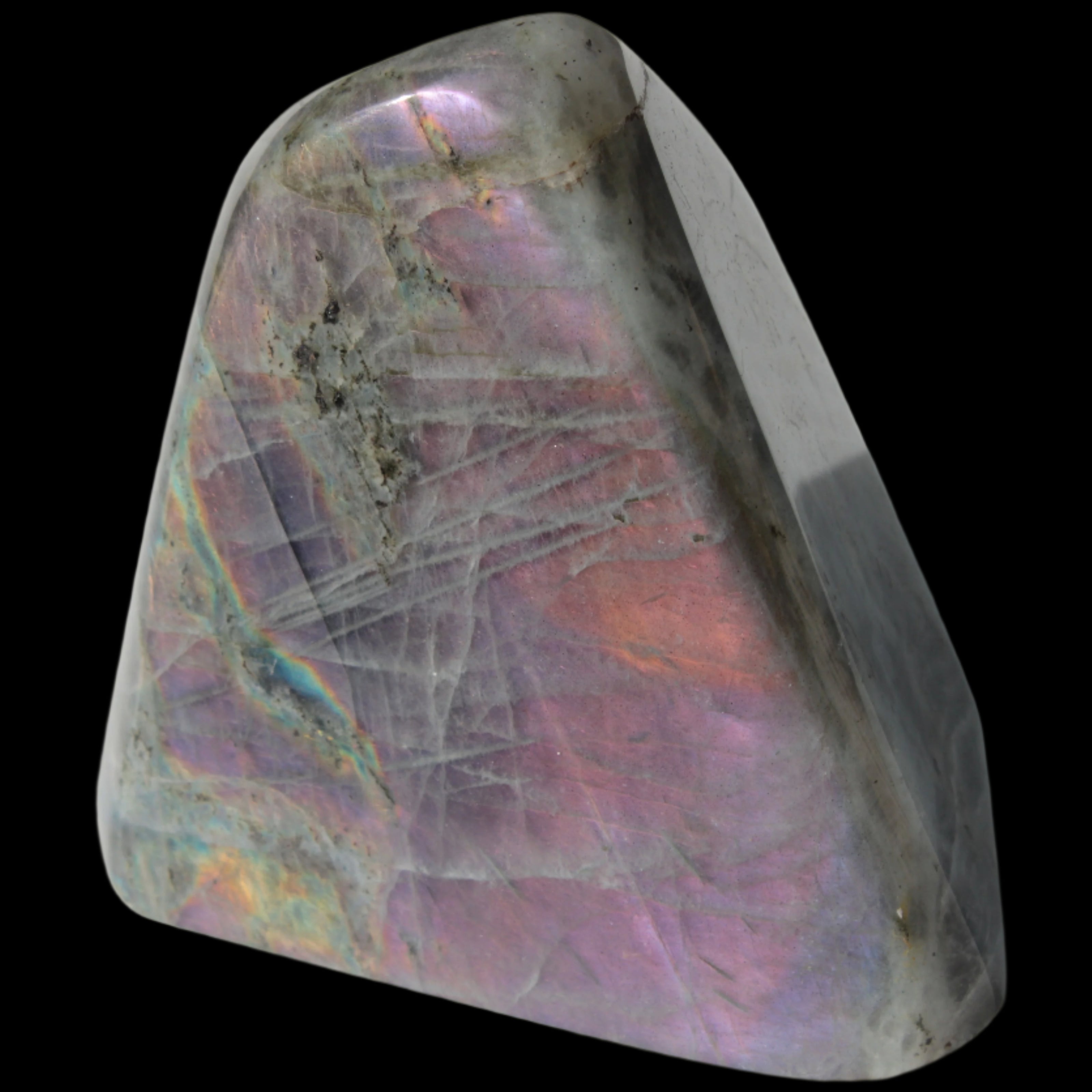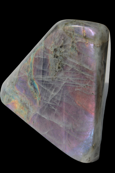 This Labradorite freeform weighs 557g. Labradorite is a crystalline form of Plagioclase Feldspar. It has a lamellar structure with a mixture of Albite and Anorthite in fine alternating layers. It was originally found at Ford Harbour, Paul Island, near Nain, off the east coast of Labrador, Newfoundland.