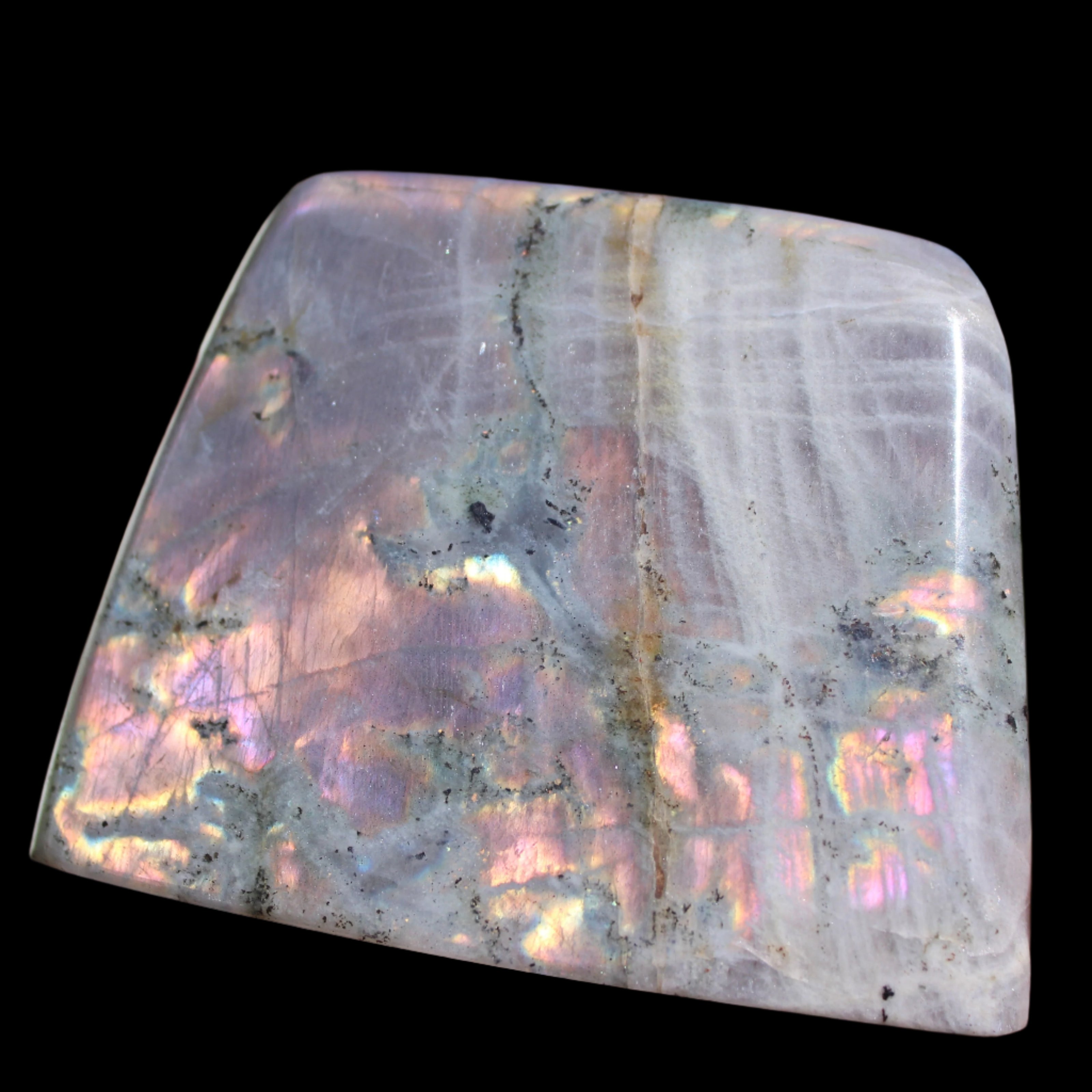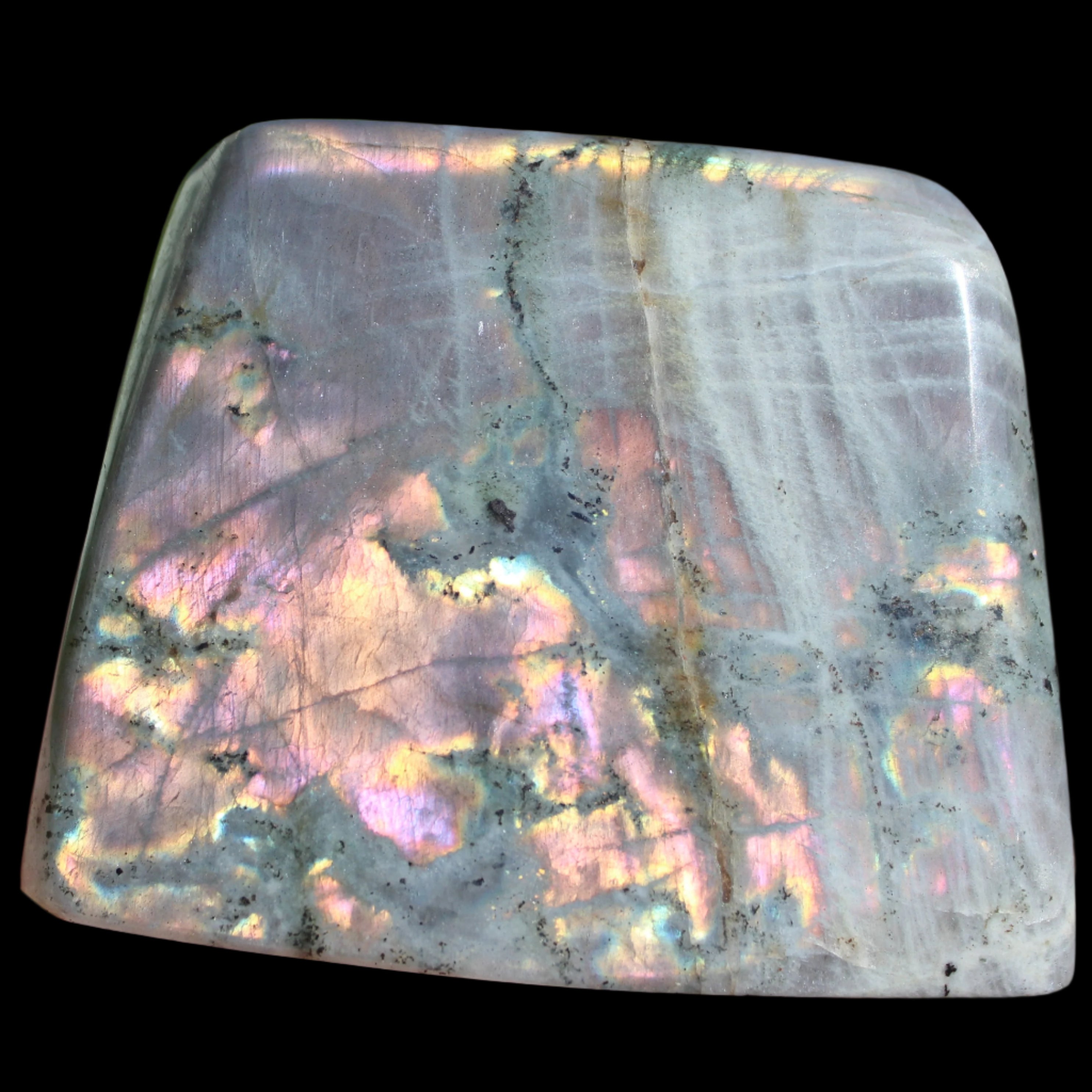 This Labradorite freeform weighs 888g. This freeform has a lot of violet and purple flash. Labradorite is a crystalline form of Feldspar. When polished, dark grey Labradorite flashes with colours deep within, including blue, green, gold and violet. Labradorite is a highly mystical stone that aids transformation and magic. Labradorite heightens intuition and enhances psychic abilities, making it great for working with the Third Eye Chakra. Labradorite is also very protective against negative energies, balancing, strengthening and protecting the aura and sealing the aura from energy leaks. Labradorite balances and clears. Labradorite is a stone of transformation and change. It provides clarity and insight into your destiny. Labradorite reduces anxiety and stress.