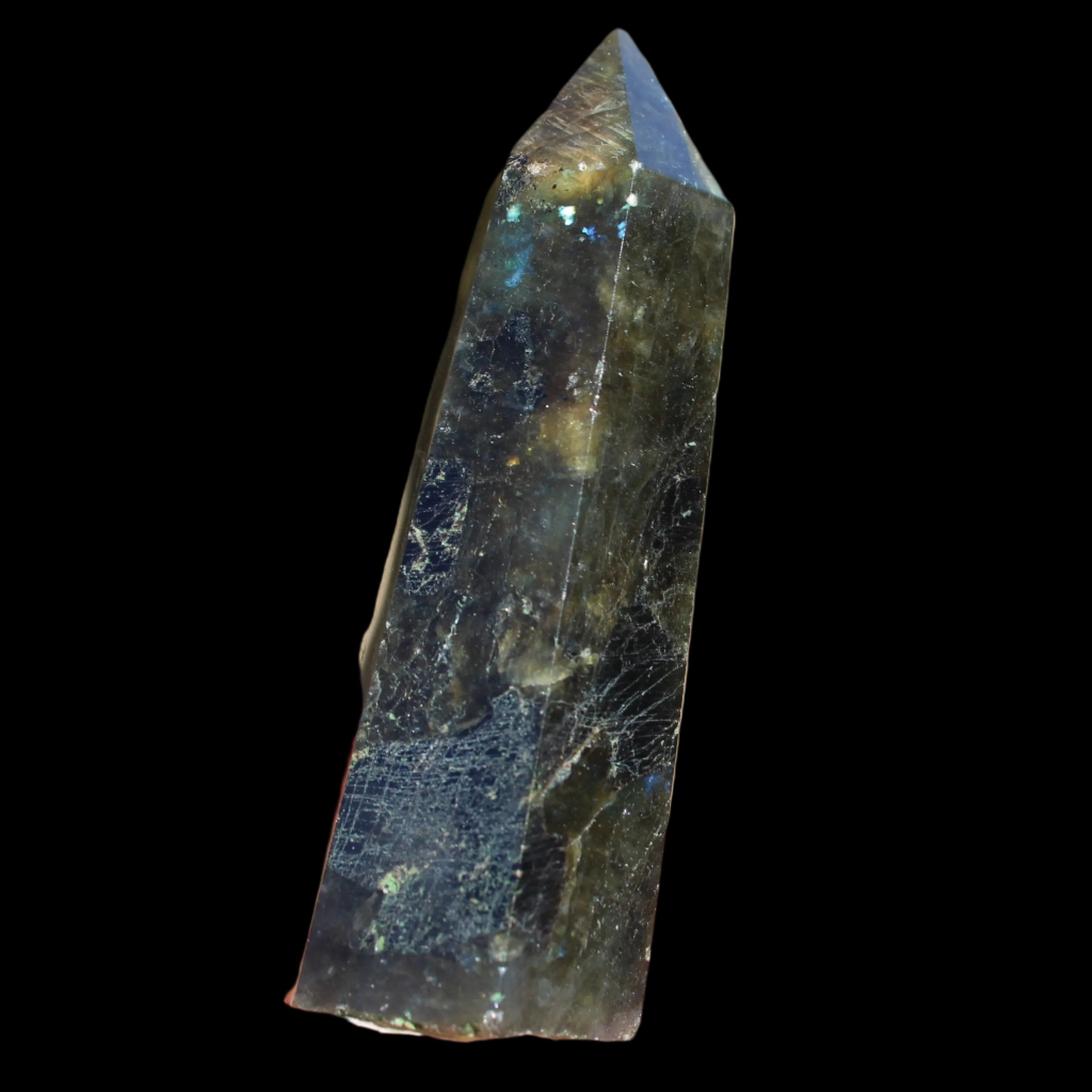 This Labradorite wand weighs 38g. Labradorite is a crystalline form of Feldspar. When polished, dark grey Labradorite flashes with colours deep within, including blue, green, gold and violet. Labradorite is a highly mystical stone that aids transformation and magic. Labradorite heightens intuition and enhances psychic abilities, making it great for working with the Third Eye Chakra. Labradorite is also very protective against negative energies, balancing, strengthening and protecting the aura and sealing the aura from energy leaks. Labradorite balances and clears. Labradorite is a stone of transformation and change. It provides clarity and insight into your destiny. Labradorite reduces anxiety and stress.