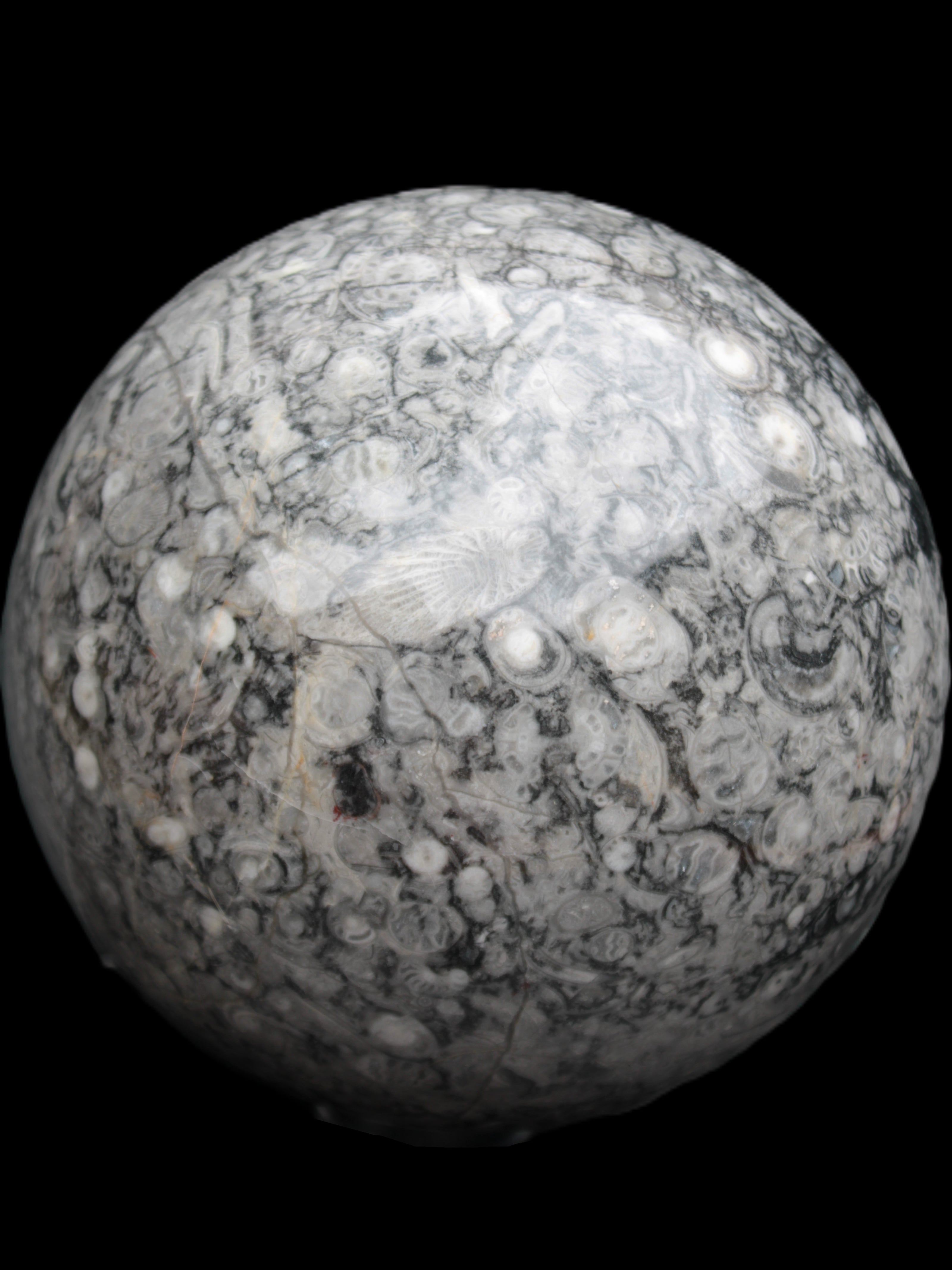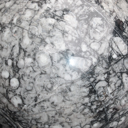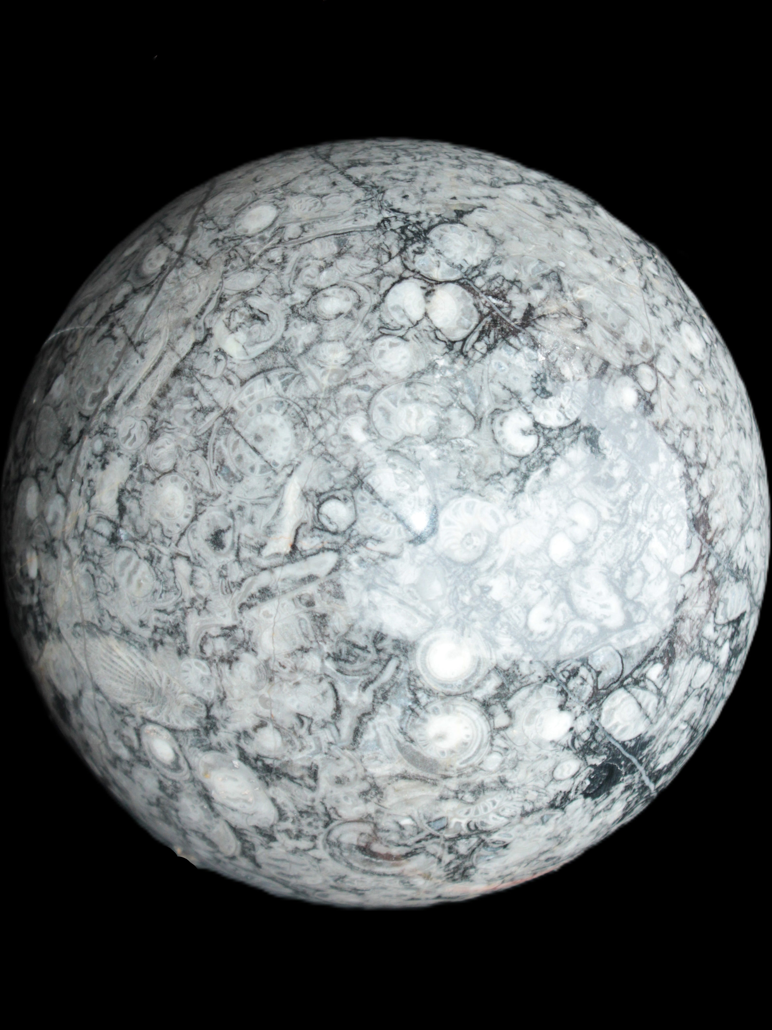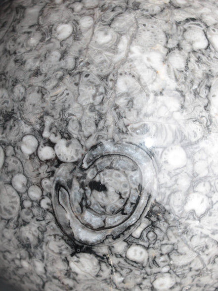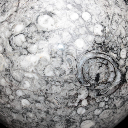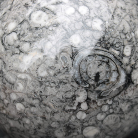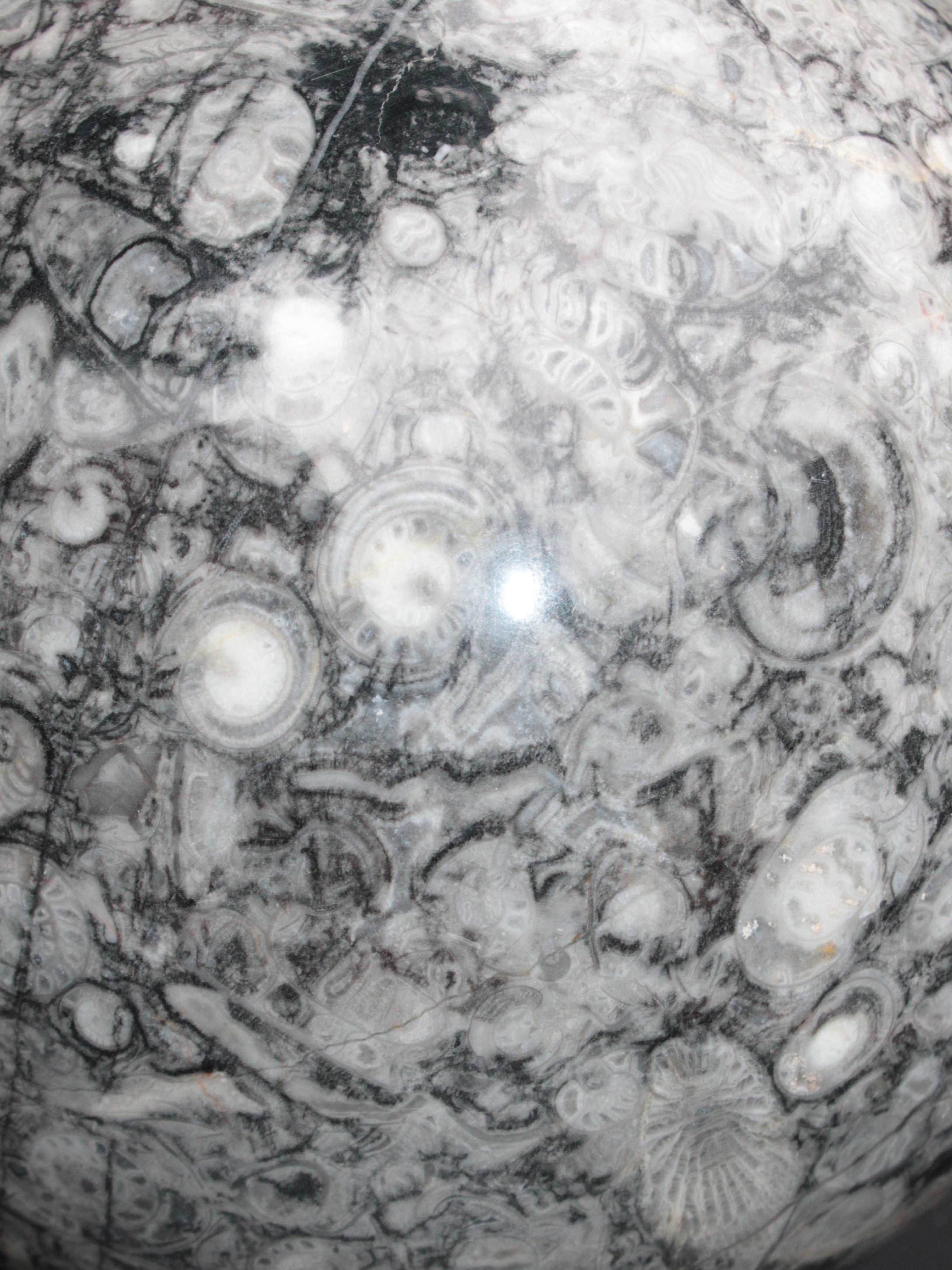 This Large Fossiliferous Ammonite and Orthoceras Marble sphere 173mm weighs 7440g. It is full of different fossilised remains of ancient ocean life.