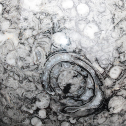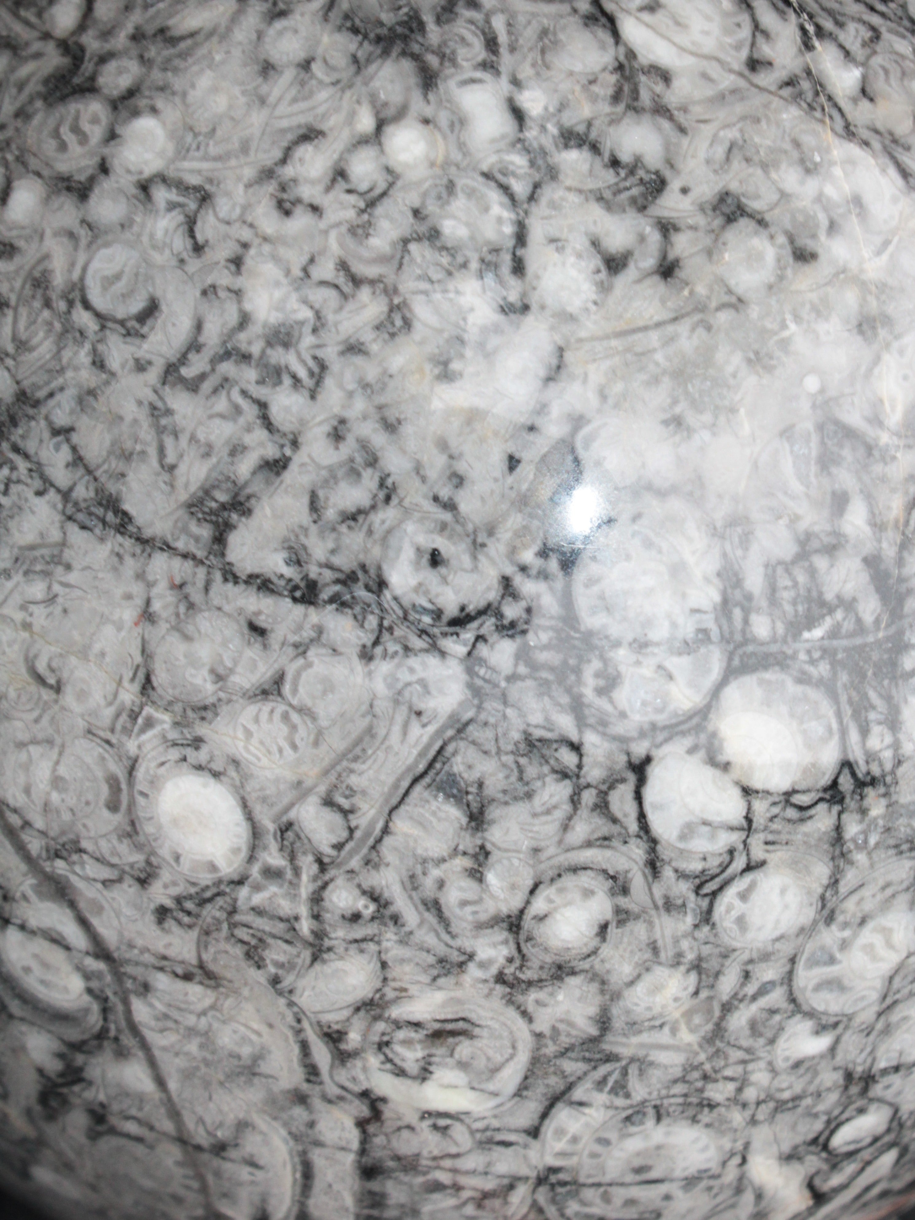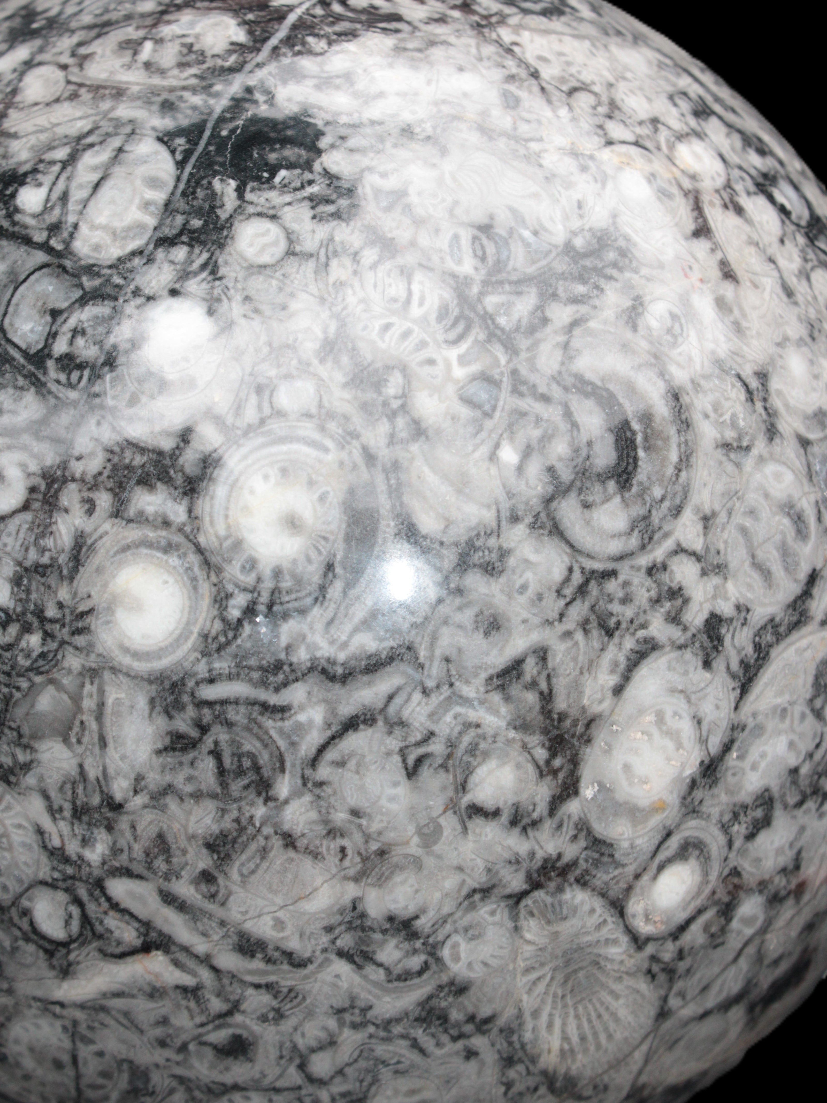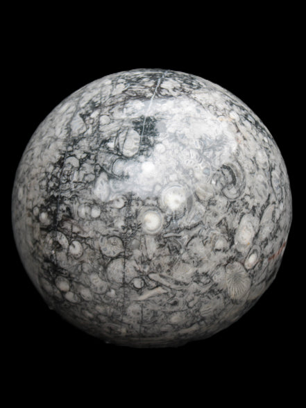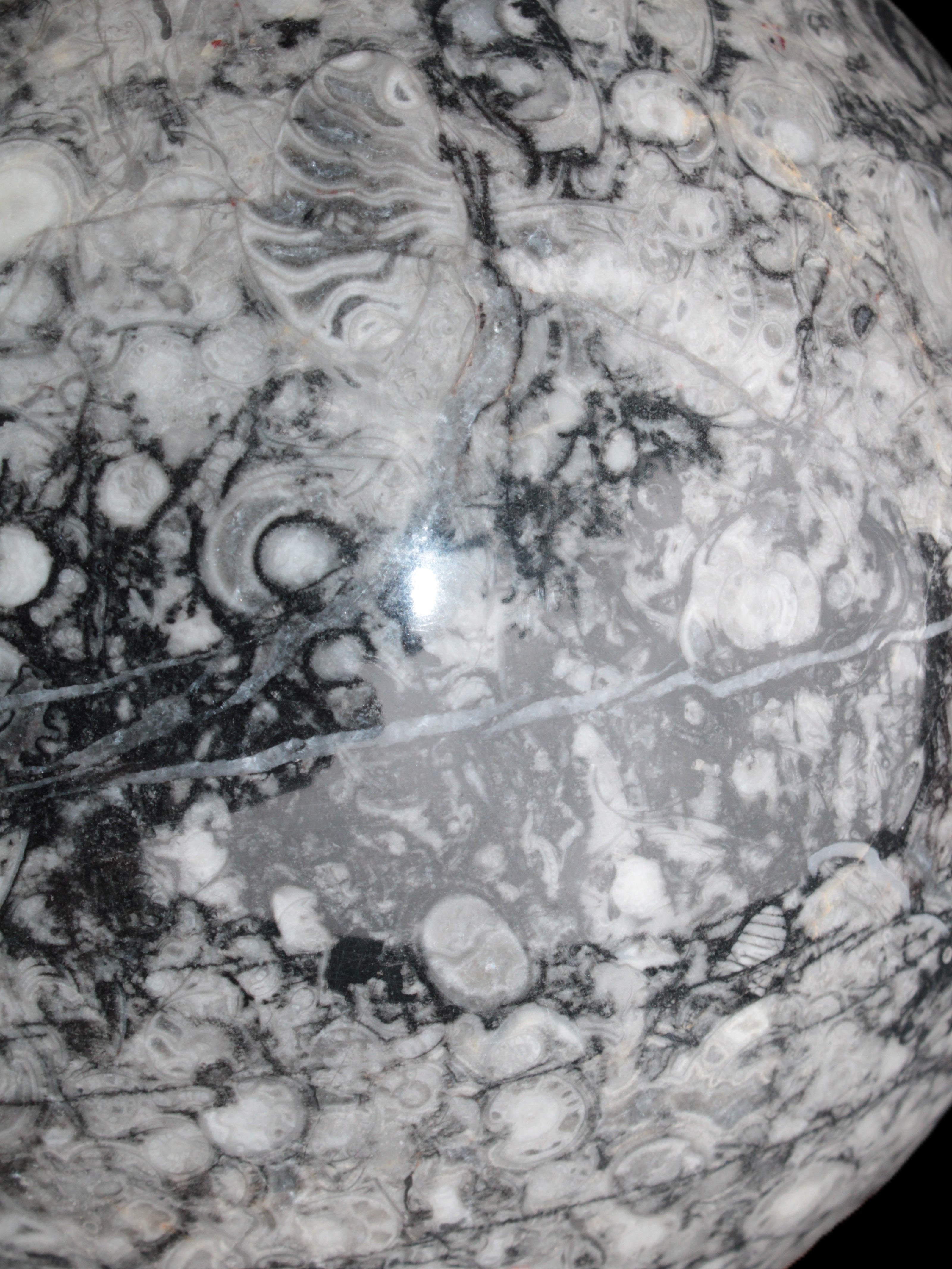 This Large Fossiliferous Ammonite and Orthoceras Marble sphere 173mm weighs 7440g. It is full of different fossilised remains of ancient ocean life.