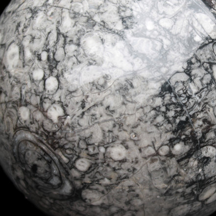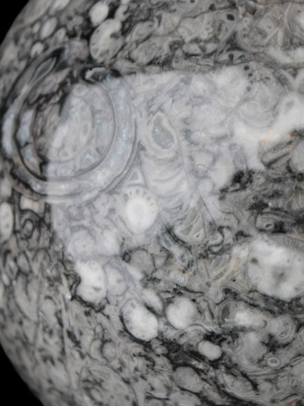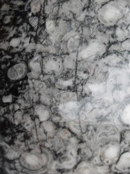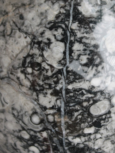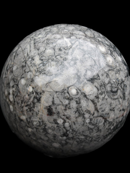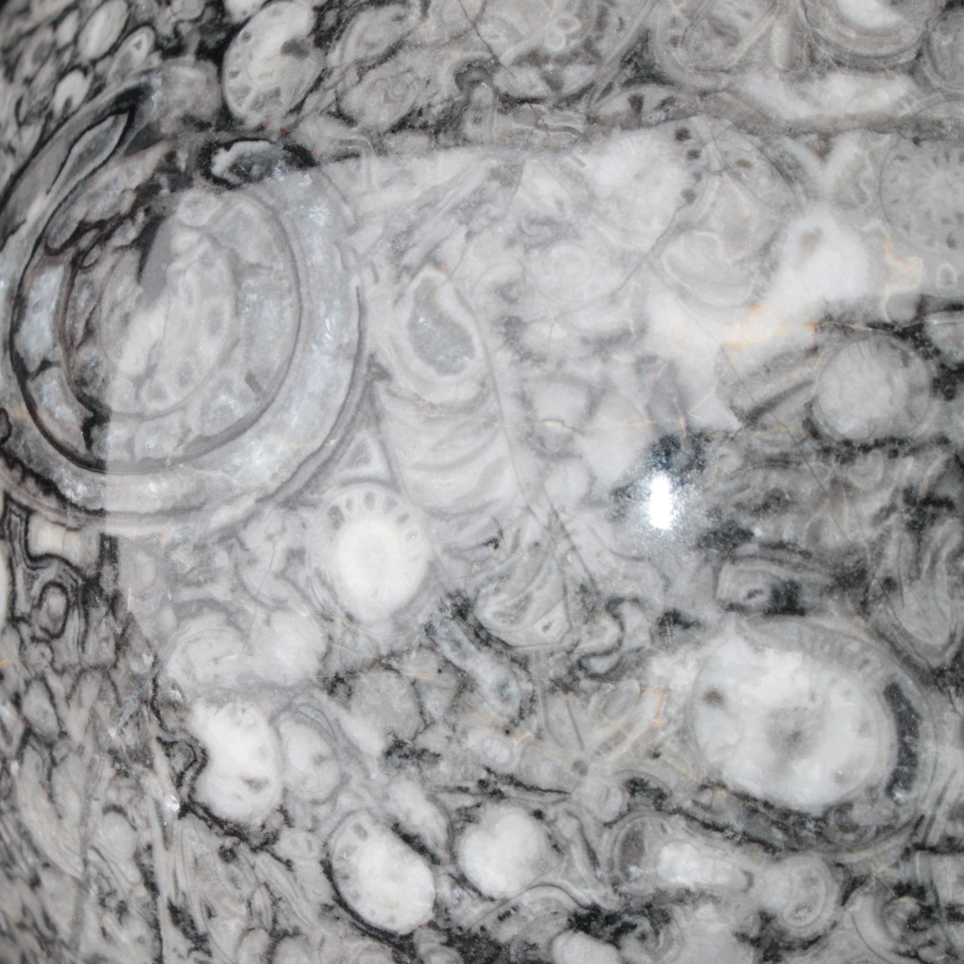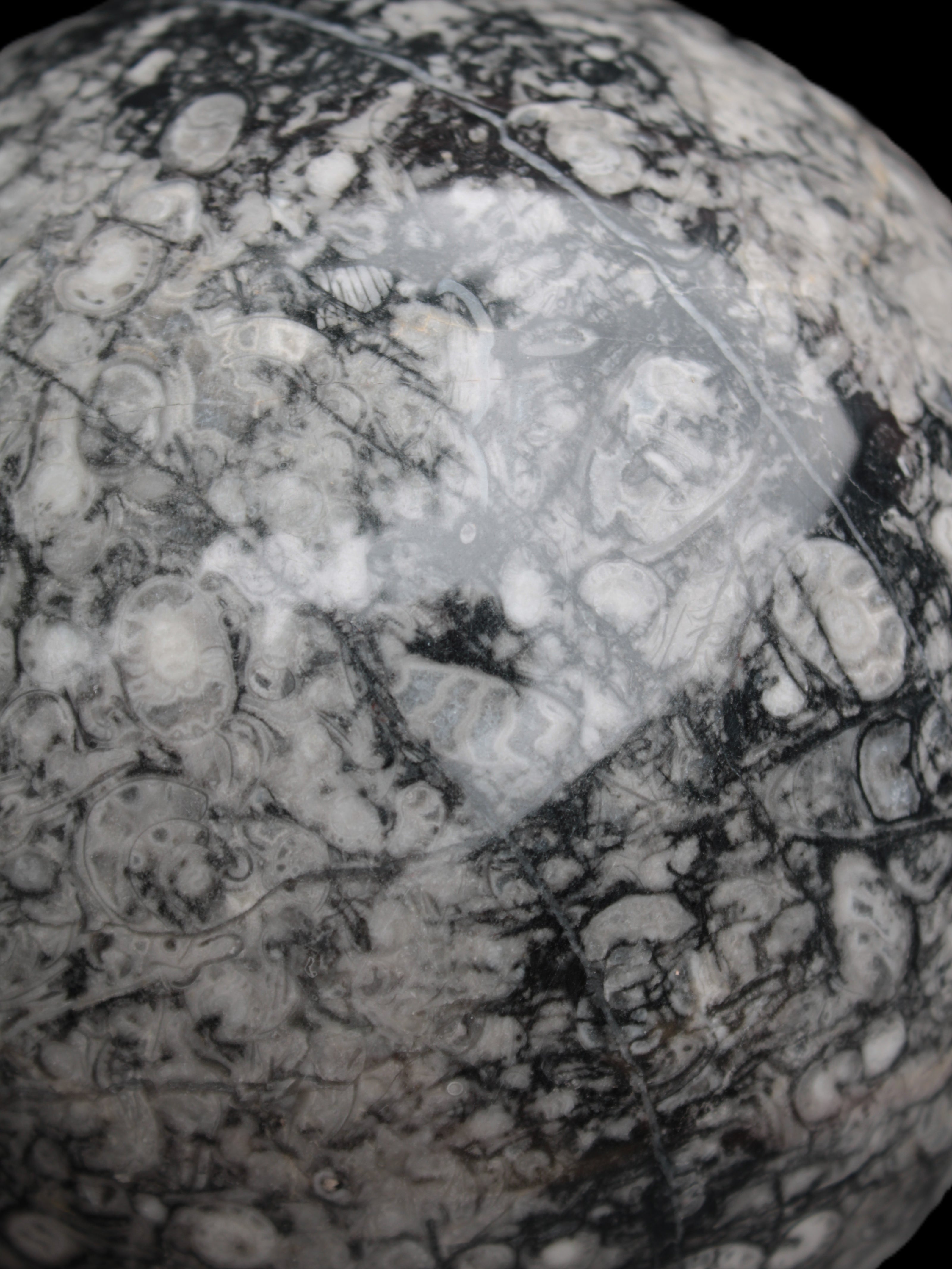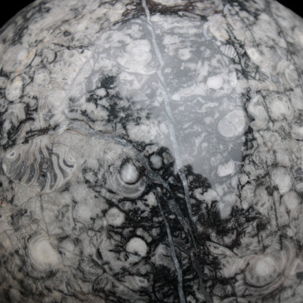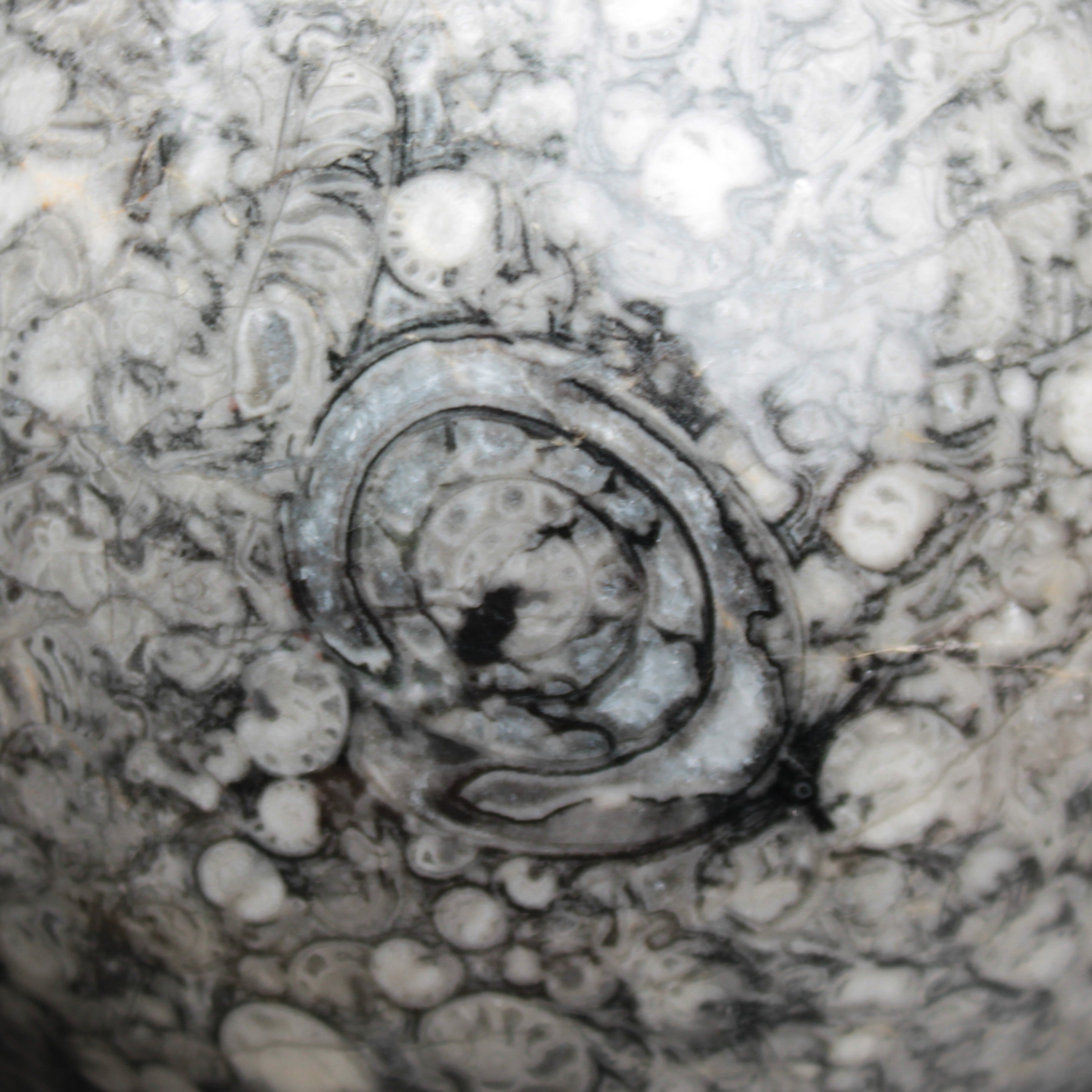 This Large Fossiliferous Ammonite and Orthoceras Marble sphere 173mm weighs 7440g. It is full of different fossilised remains of ancient ocean life.