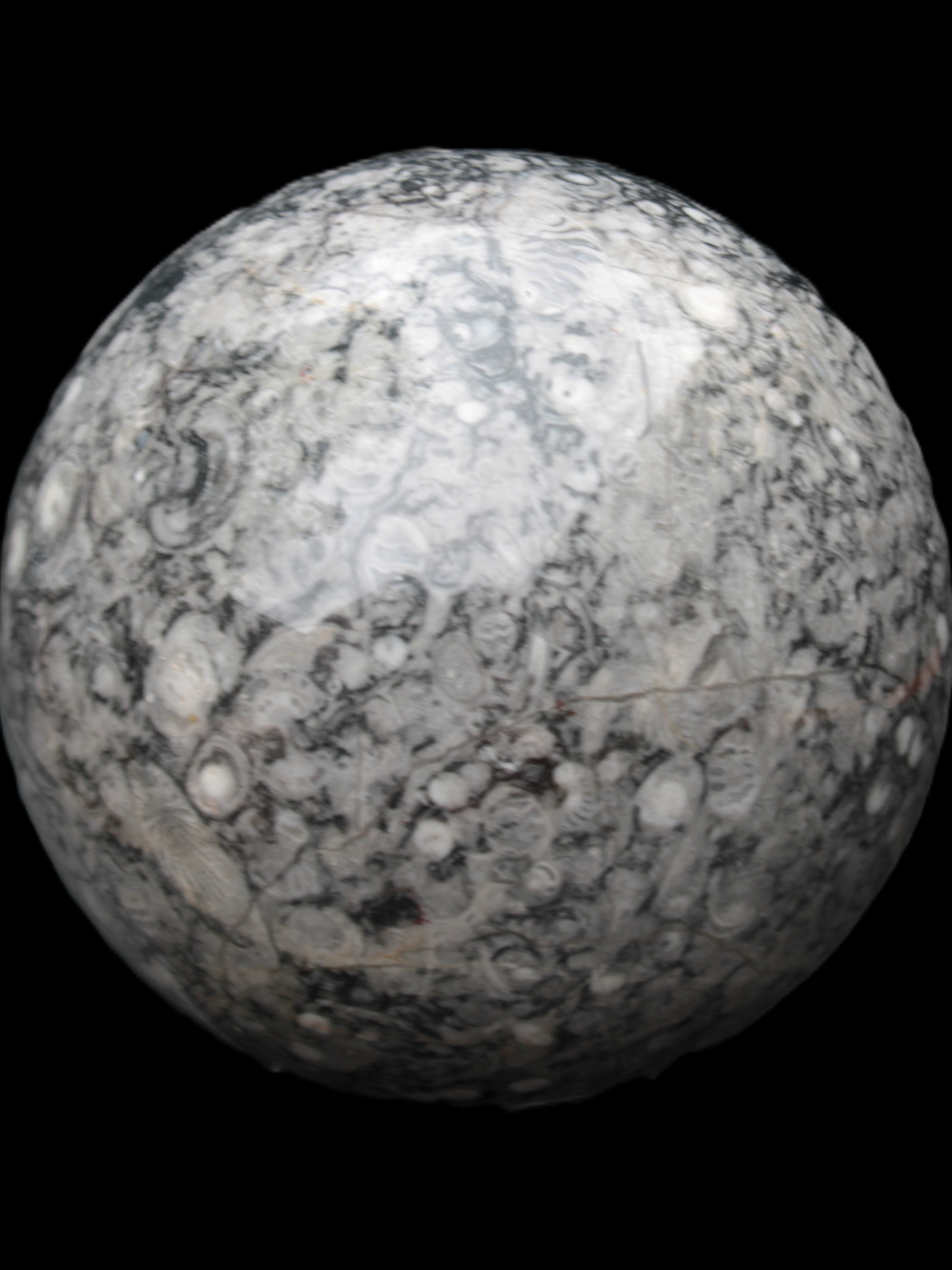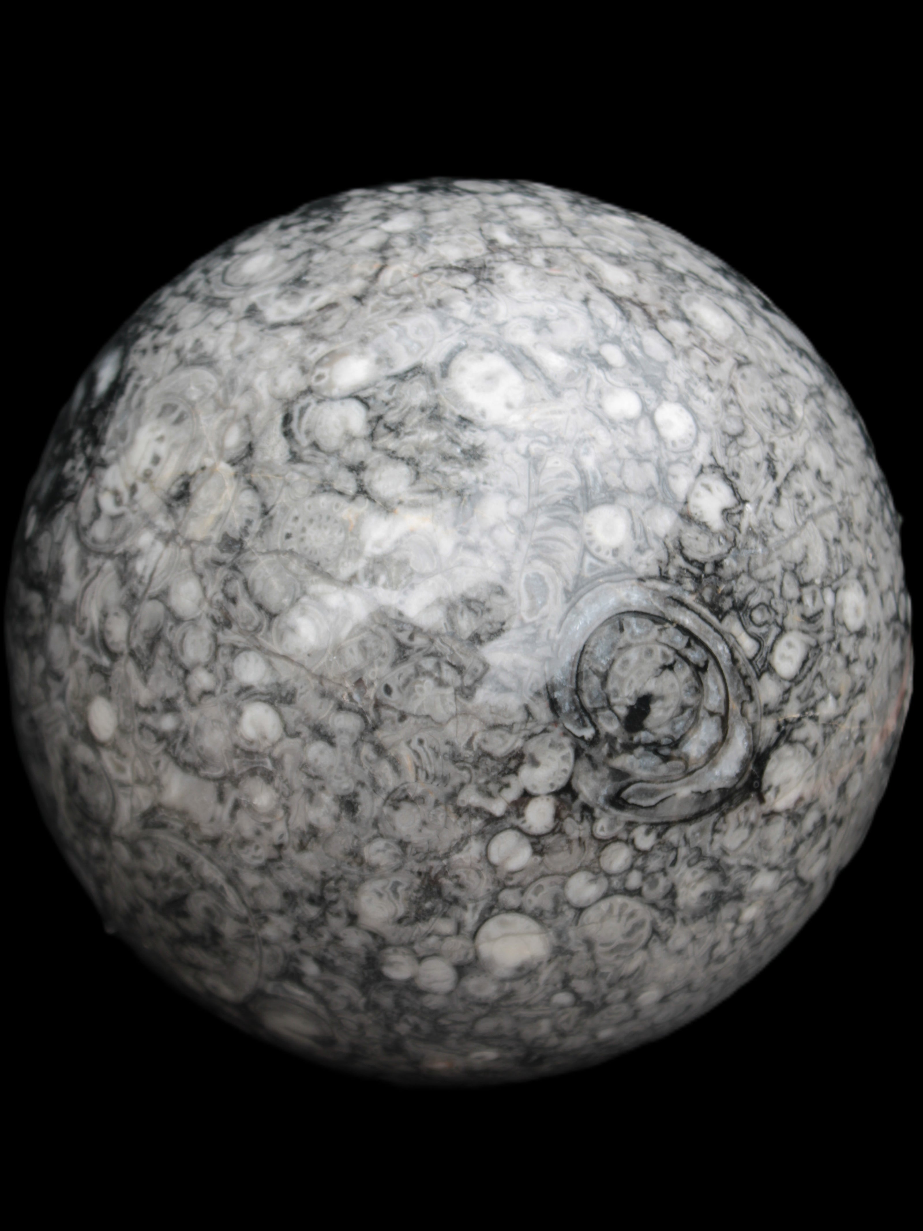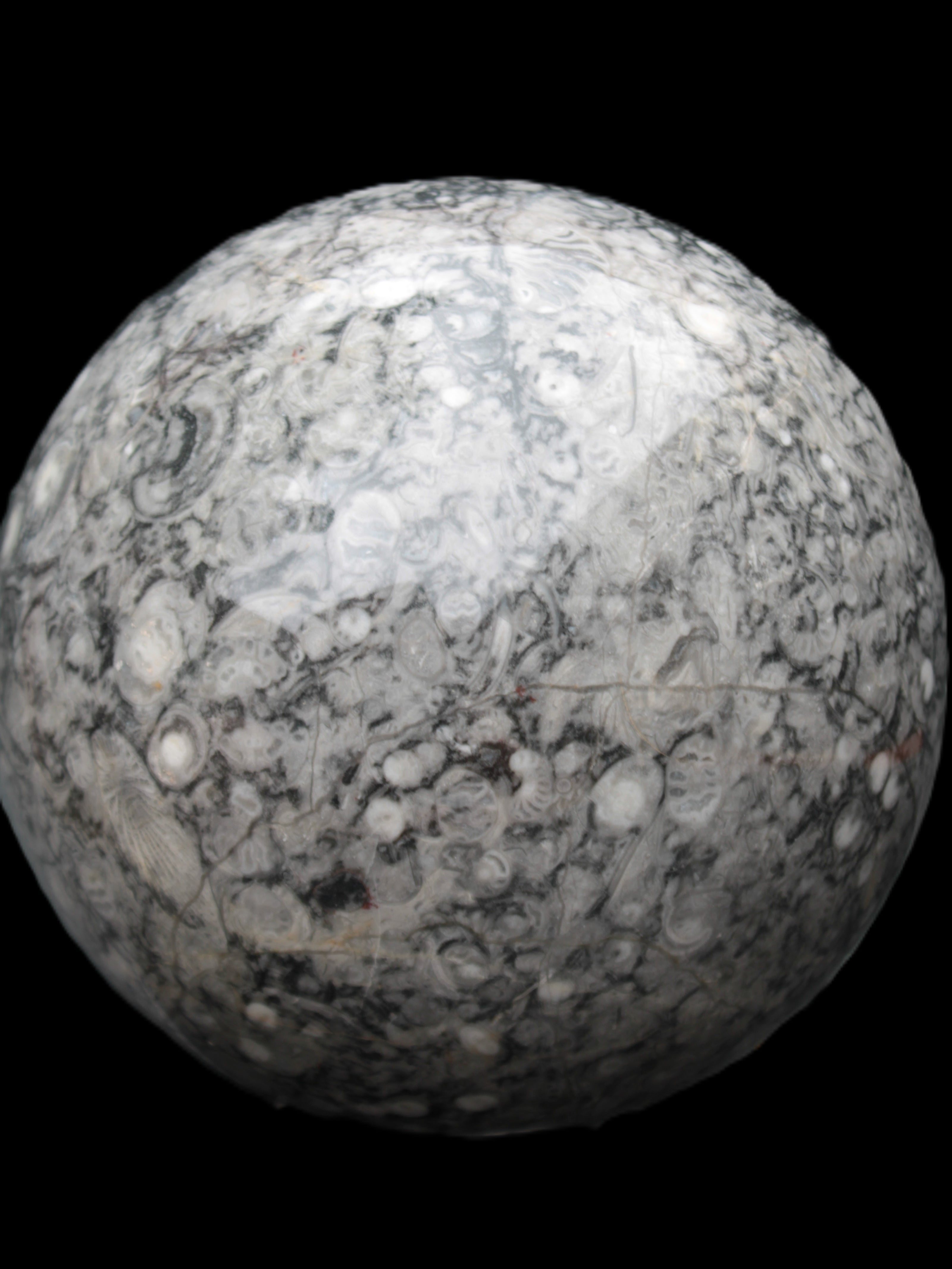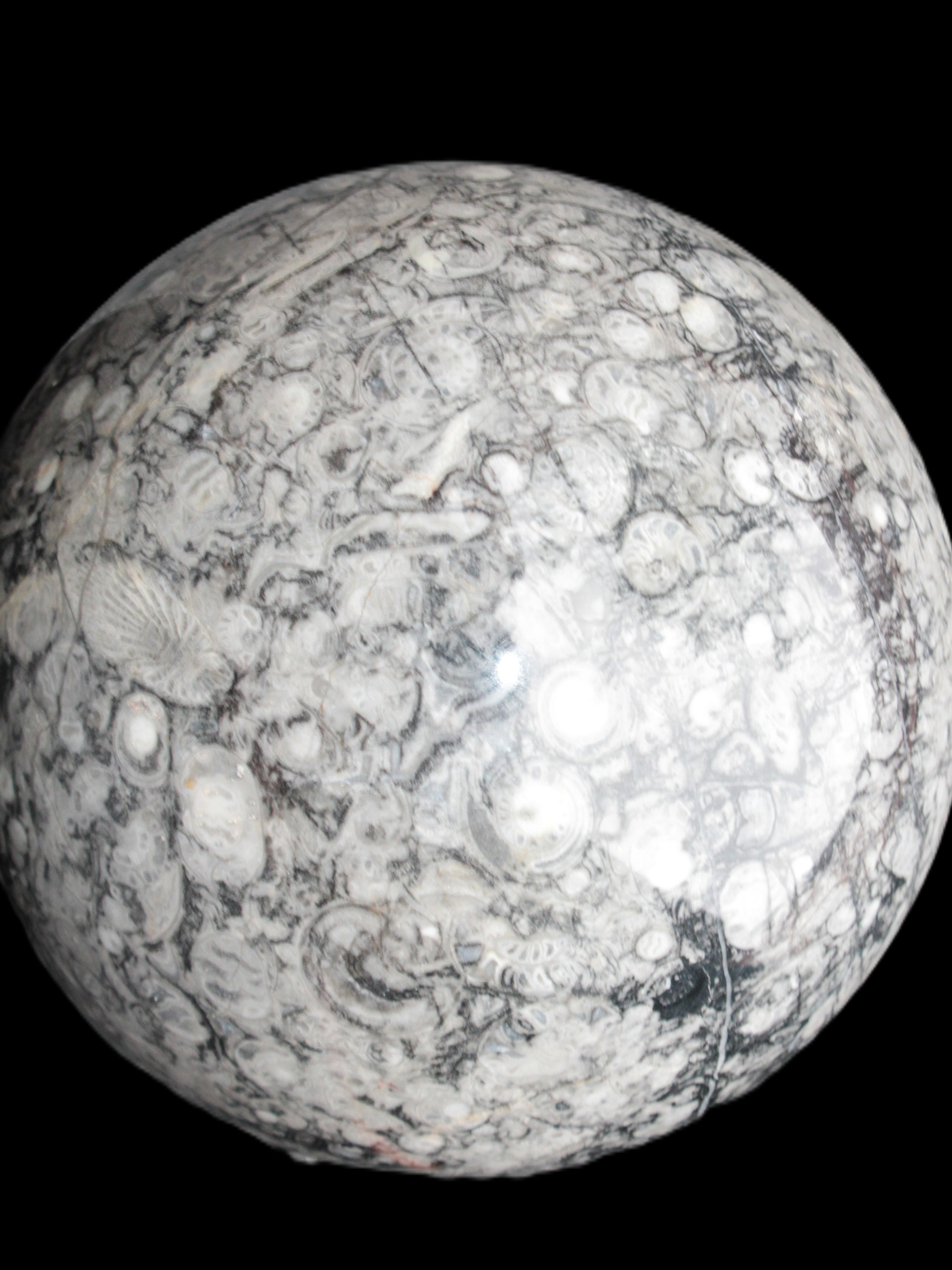 They are a long straight form of Ammonite fossil, mainly found and mined in Morocco. The fossil remains preserved in this stone originated there and were shaped into this sphere. Orthoceras fossils are among the earliest recognizable animals.