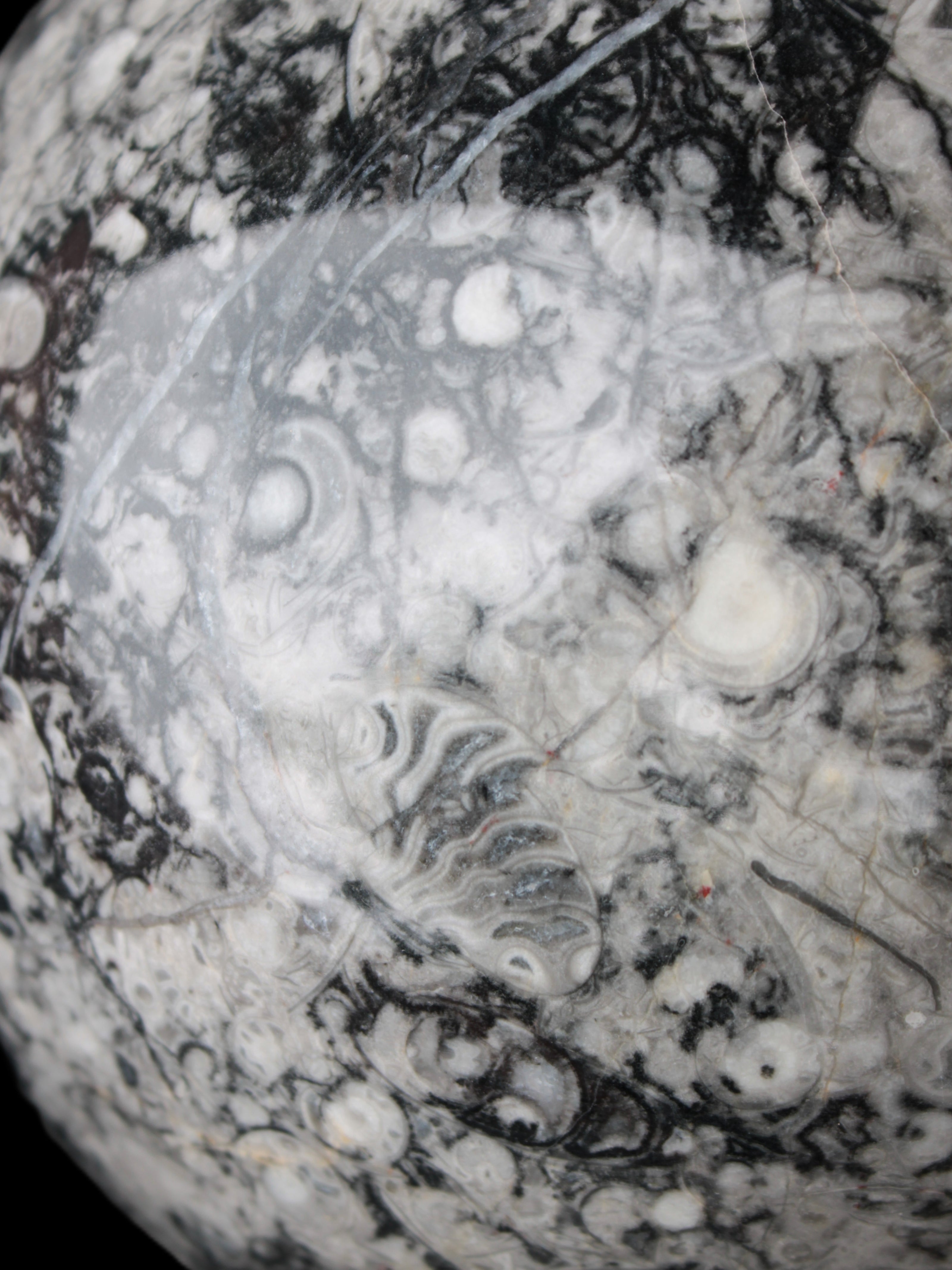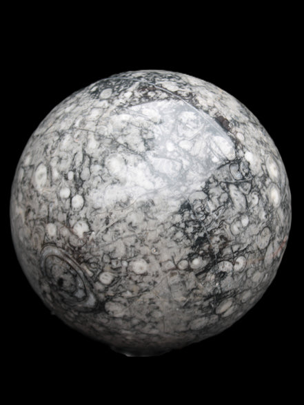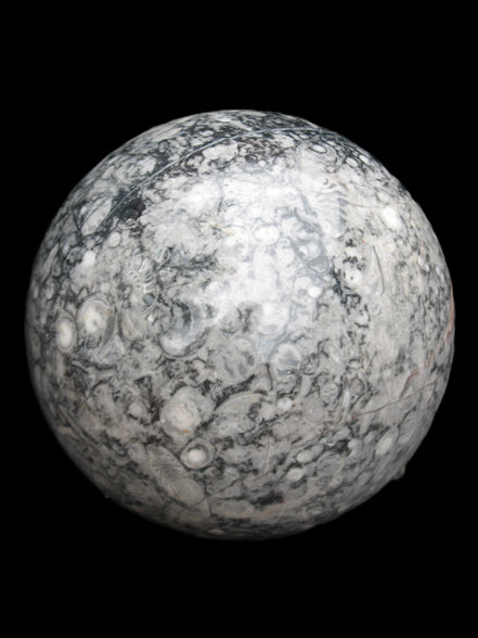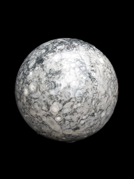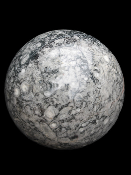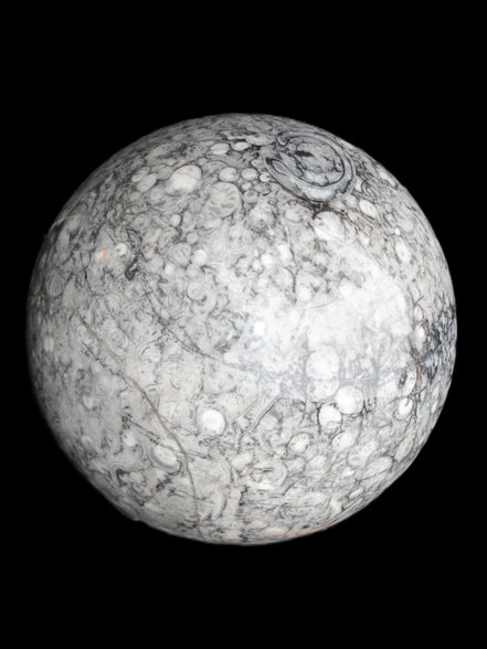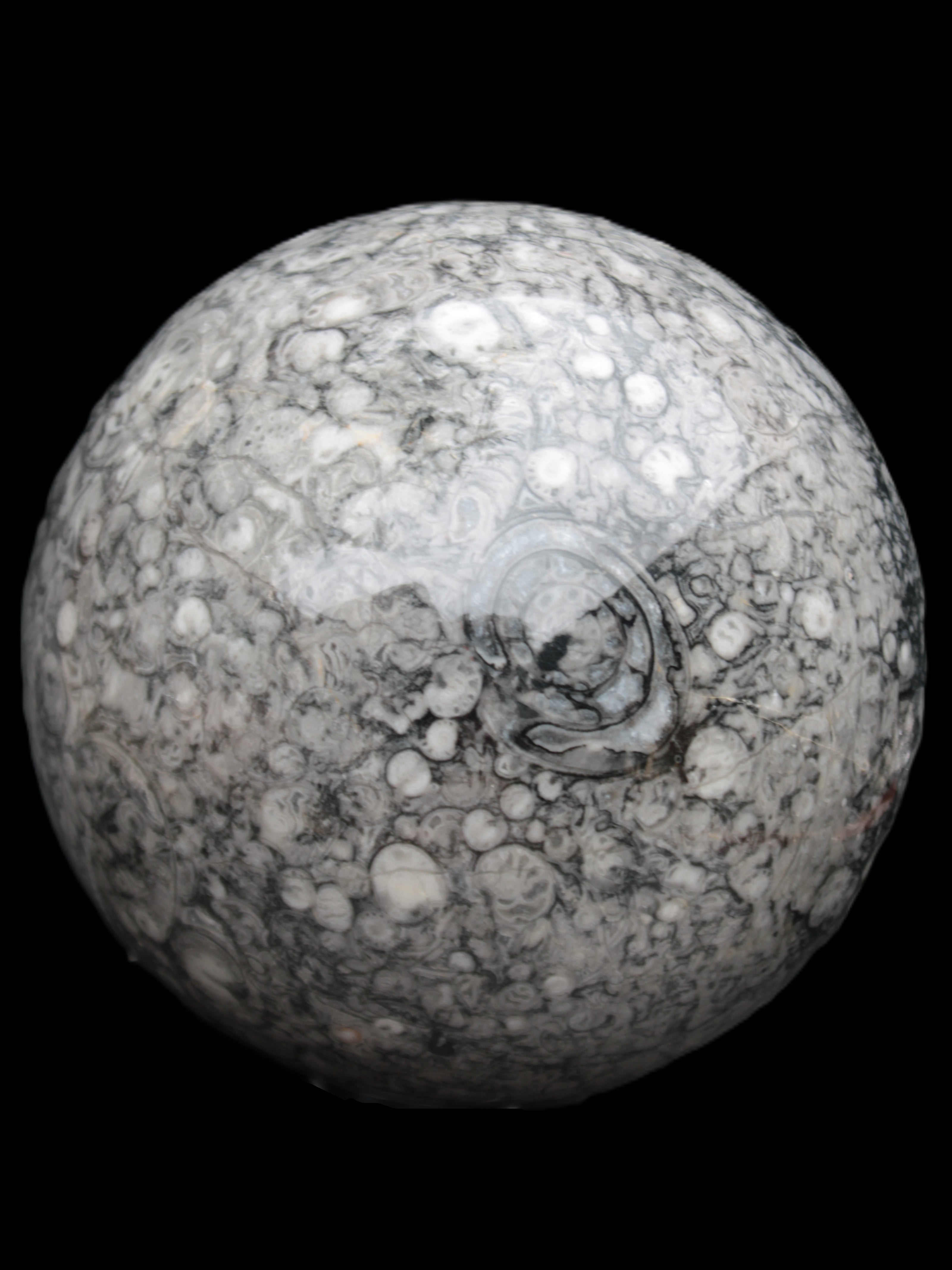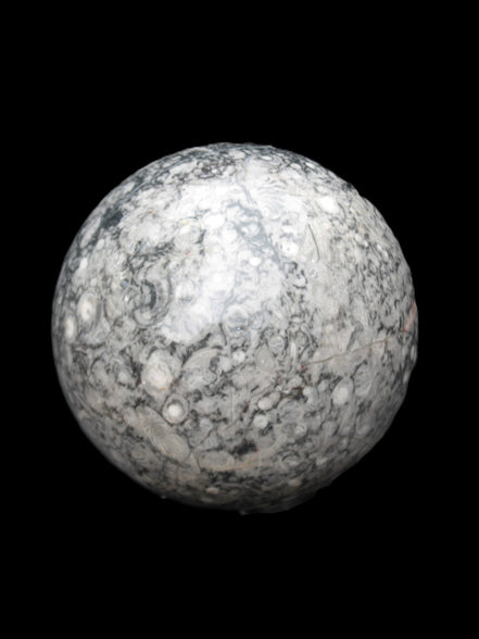 They are a long straight form of Ammonite fossil, mainly found and mined in Morocco. The fossil remains preserved in this stone originated there and were shaped into this sphere. Orthoceras fossils are among the earliest recognizable animals.