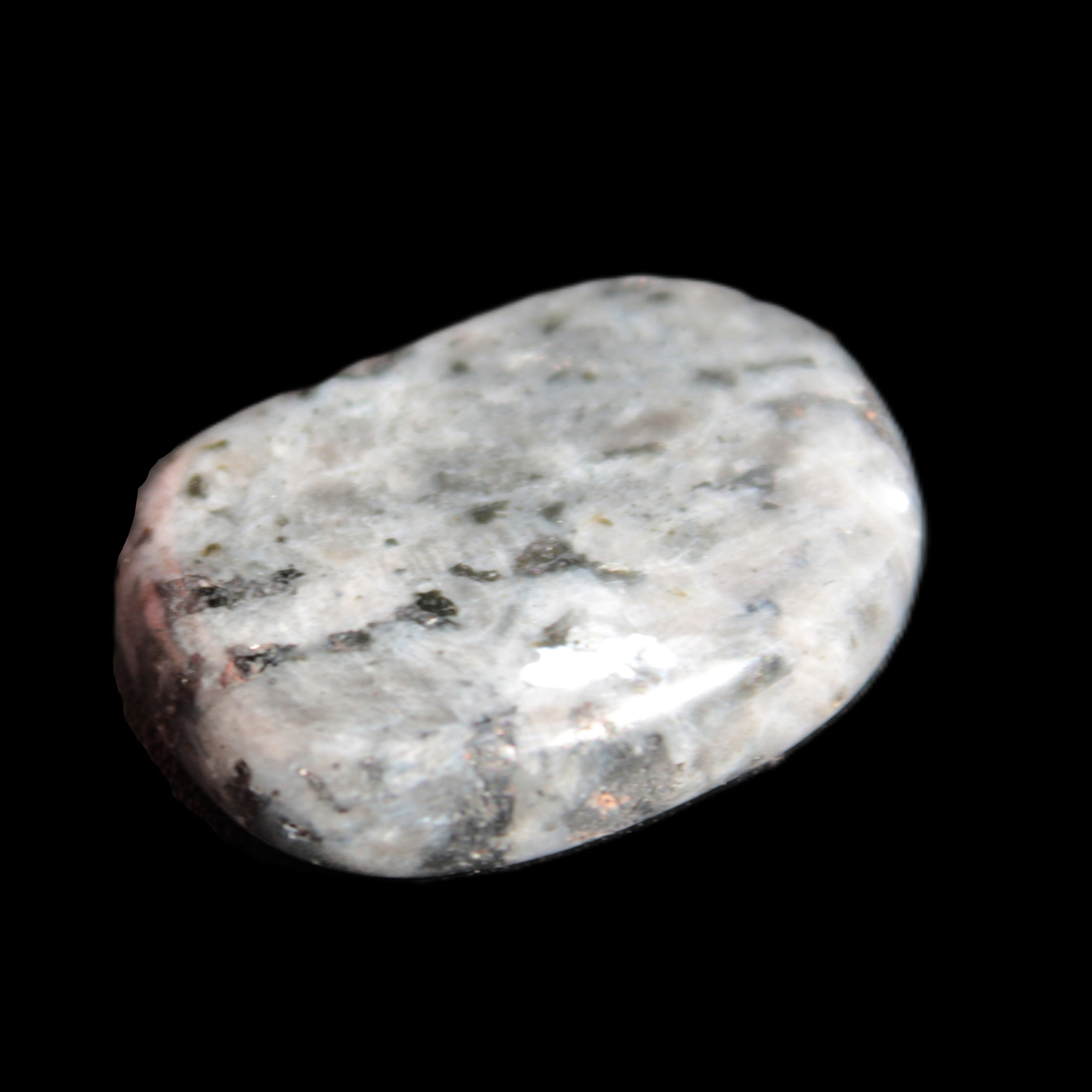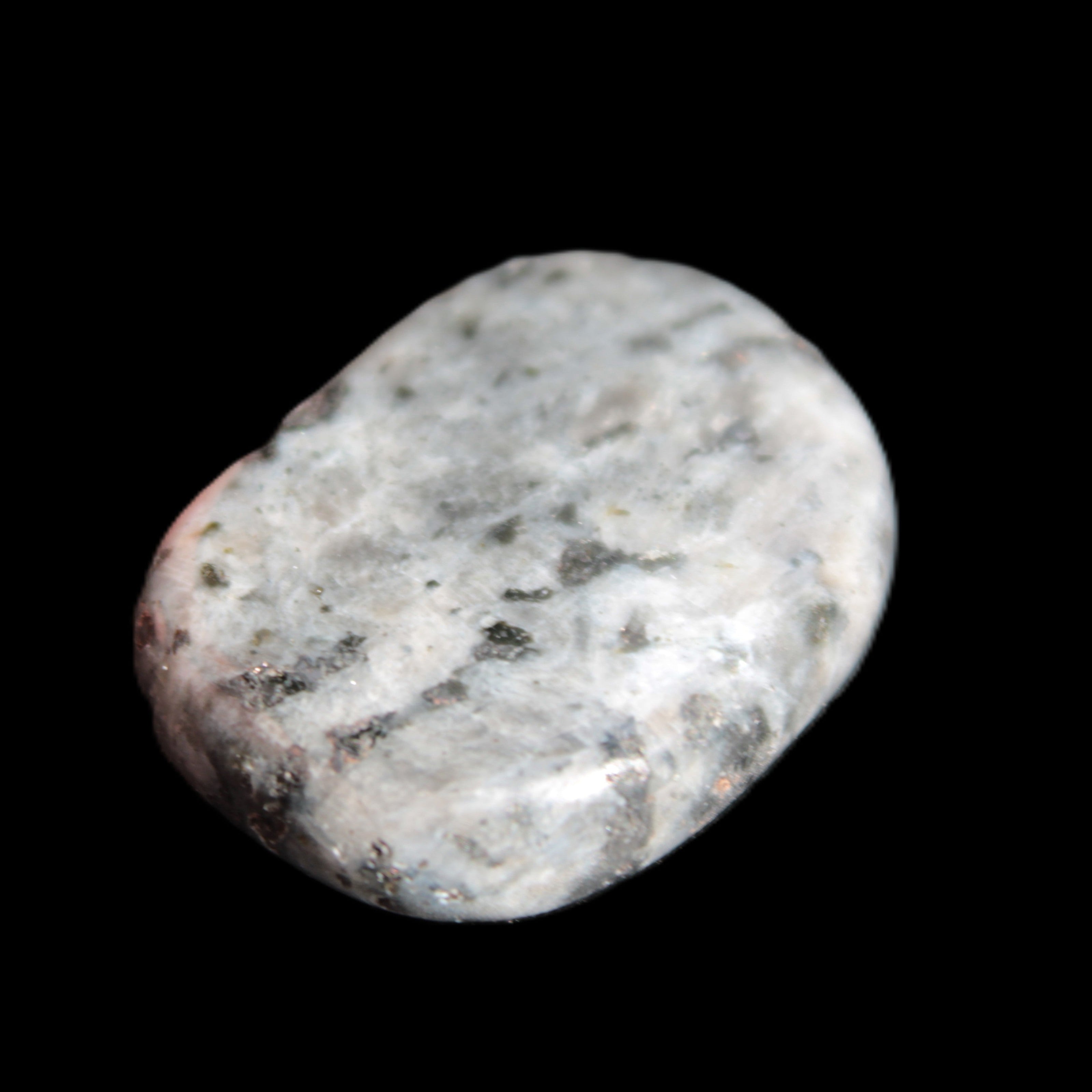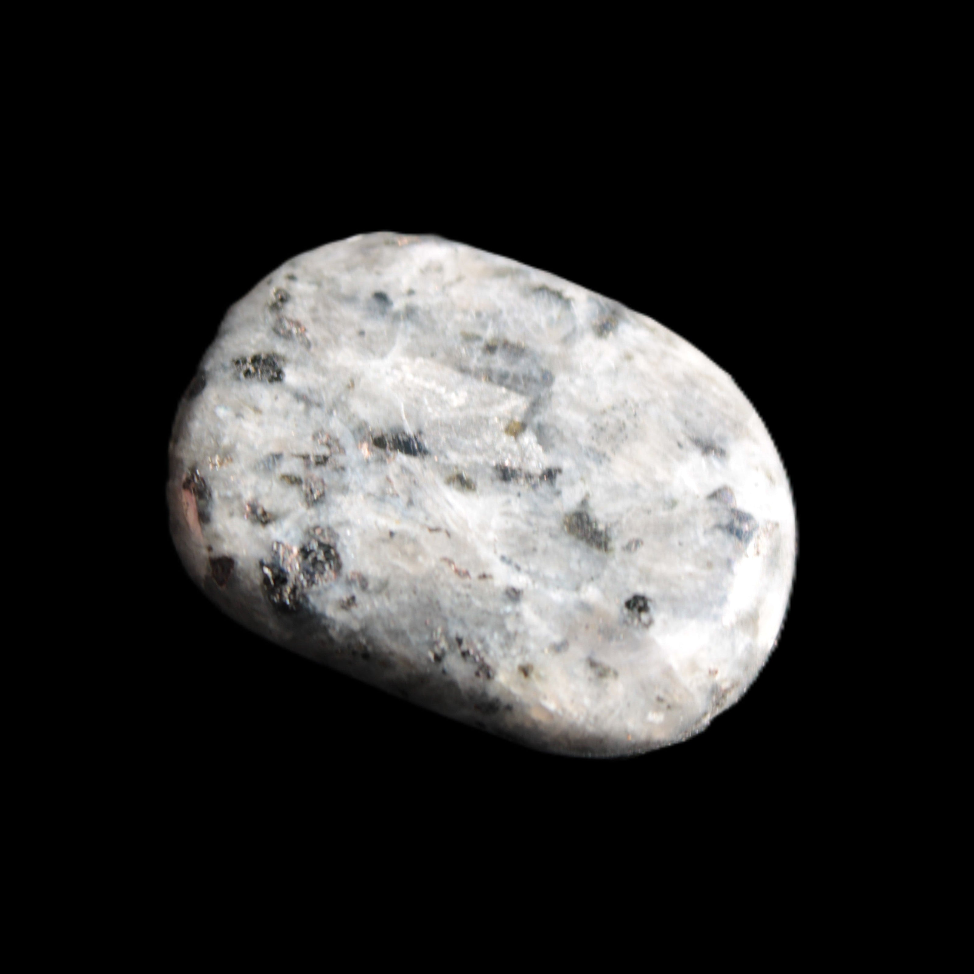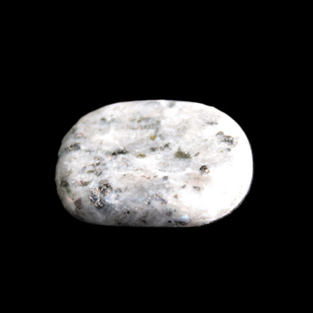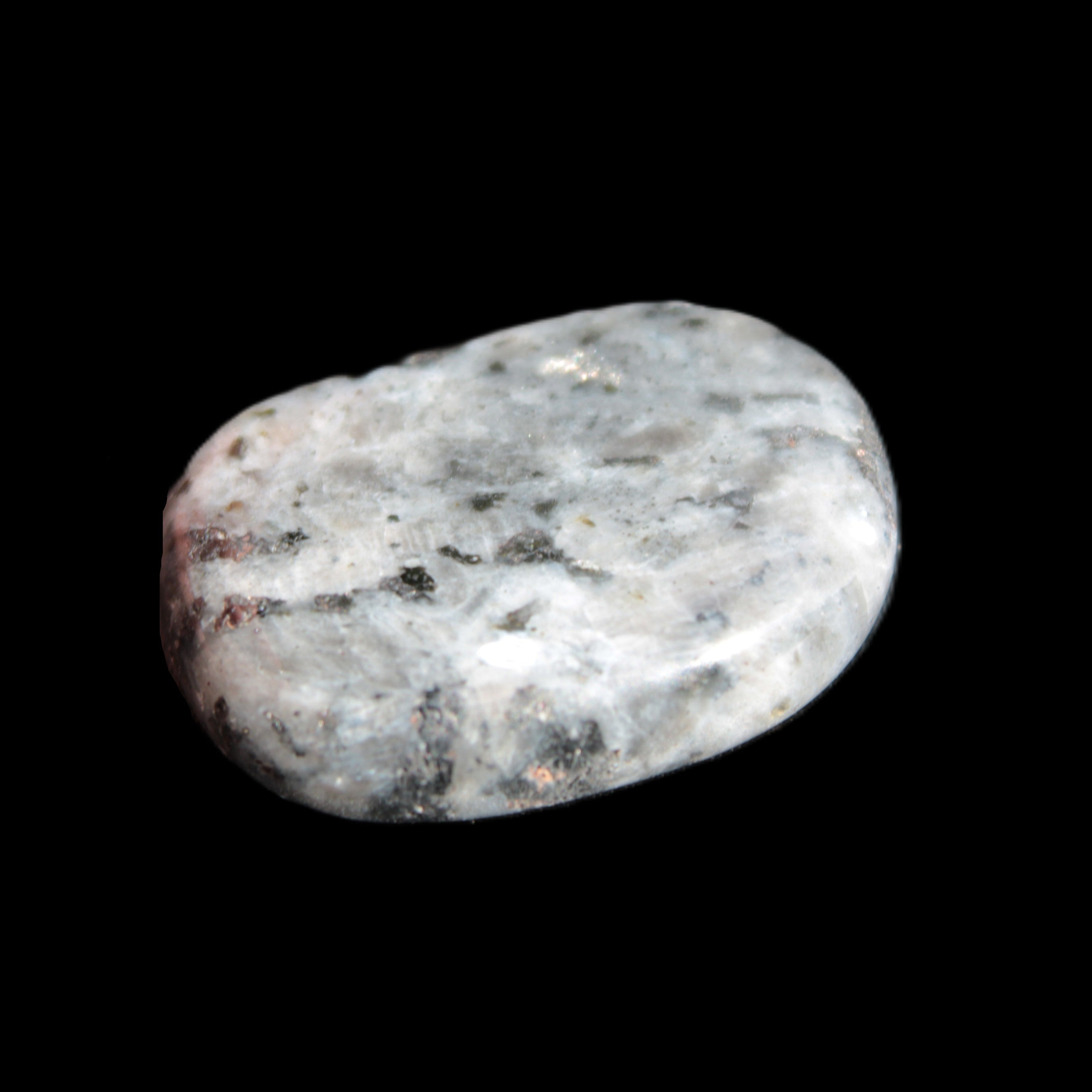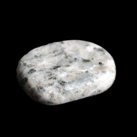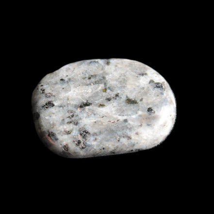 This item is a Larvikite thumbstone 20*30*6mm weighing 12g. It feels good in the palm. Larvikite is an igneous rock, specifically a variety of Monzonite, notable for the presence of thumbnail-sized crystals of feldspar. These ternary feldspars contain components of all three endmember feldspars.