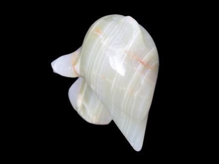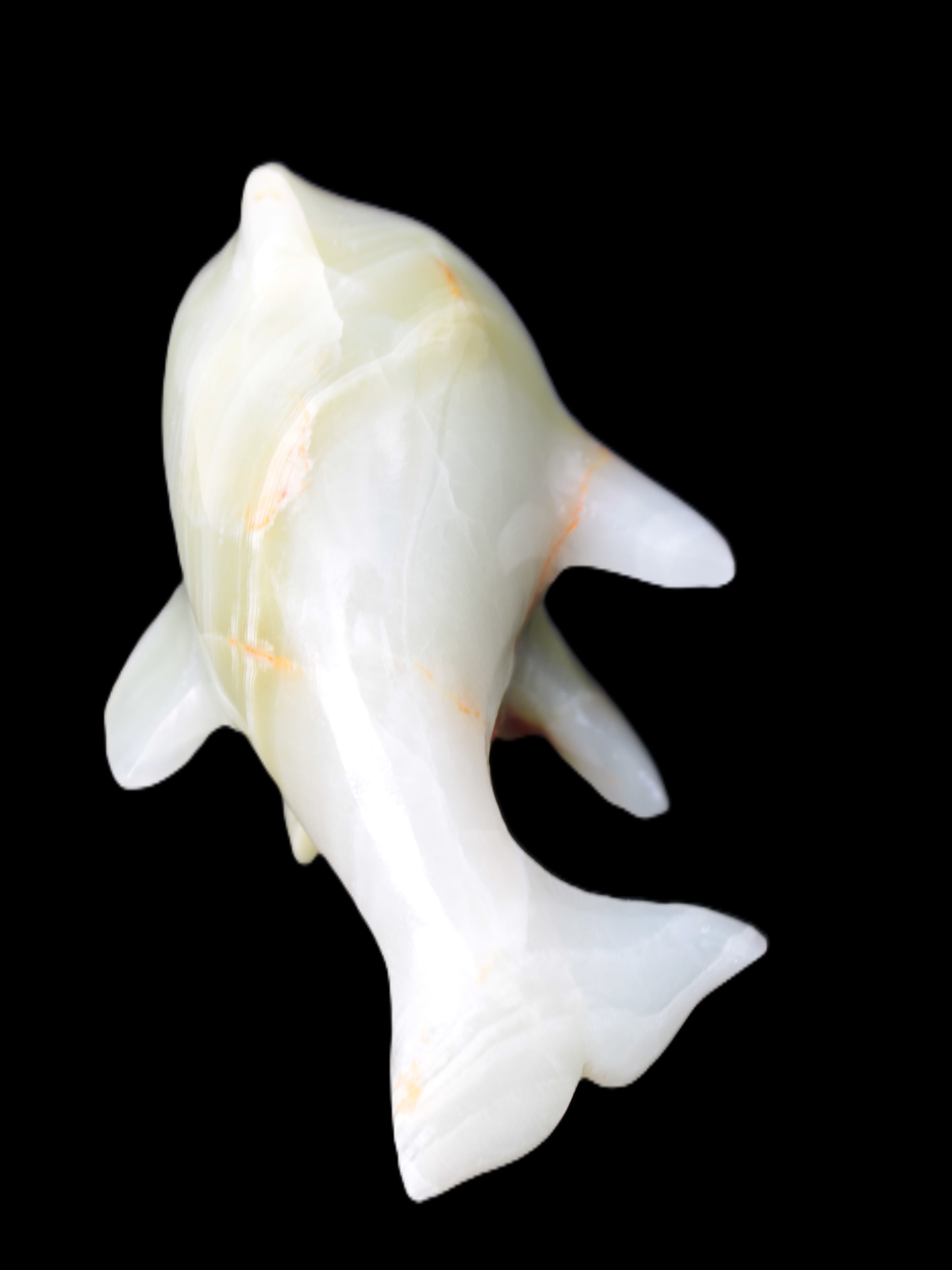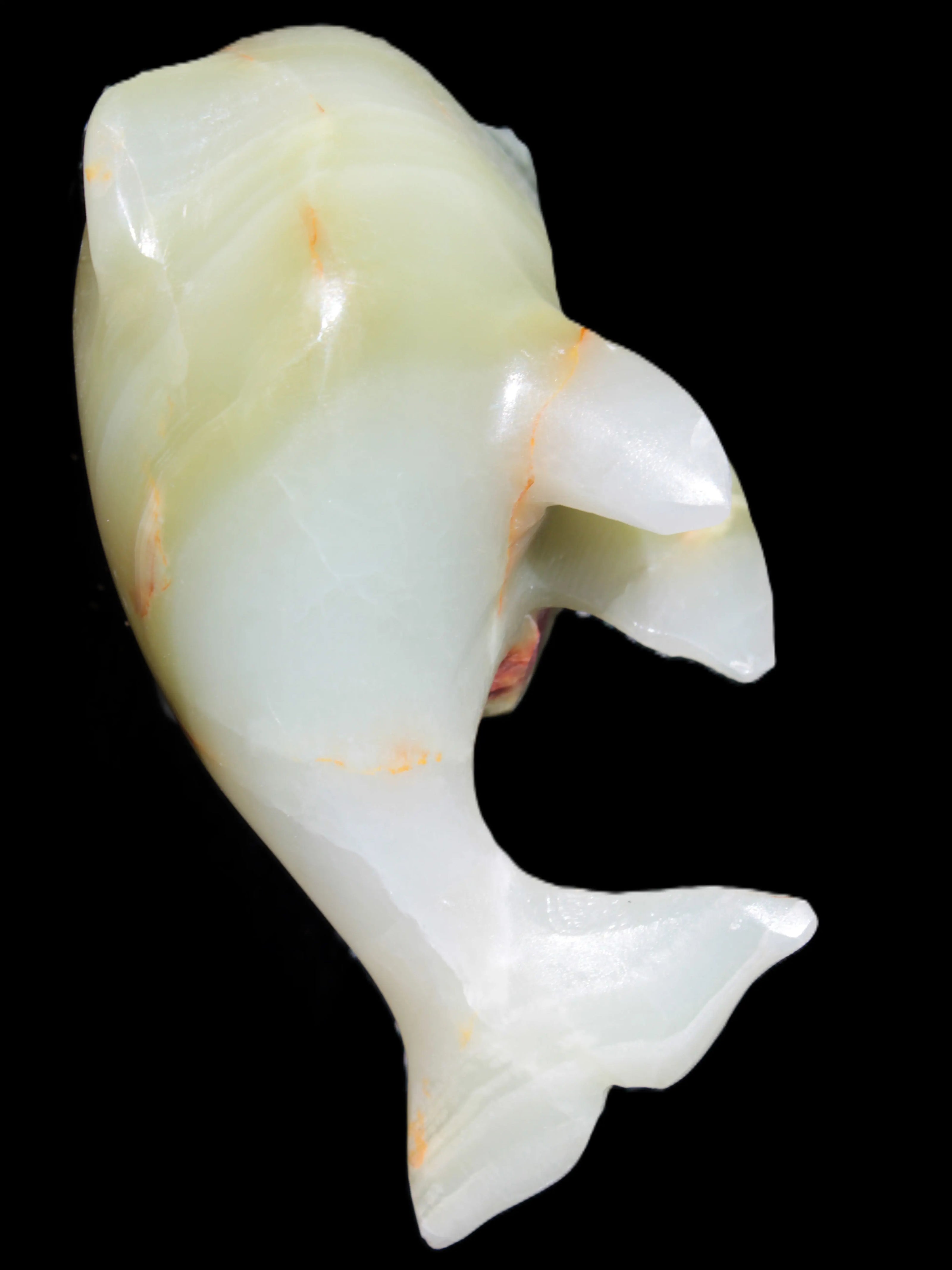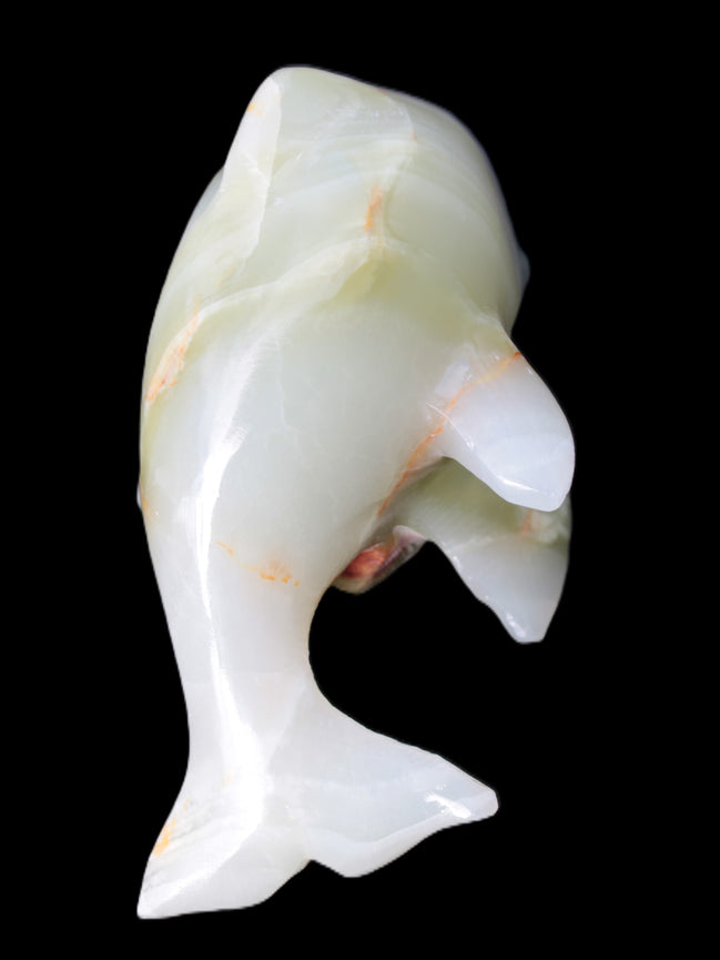 This Leaping Dolphin was hand-carved by Lawrence Handicrafts in delicate translucent Afghan Jade from Pakistan. This stone is a Serpentine variety. Serpentine provides powerful healing energy and is linked to our Kundalini energy. When dormant, Kundalini energy lies coiled at the base of the spine. Its release is transformative. The properties of this stone and the dolphin symbology of playfulness unite in this piece to encourage you to pursue a new more enjoyable phase in your life.