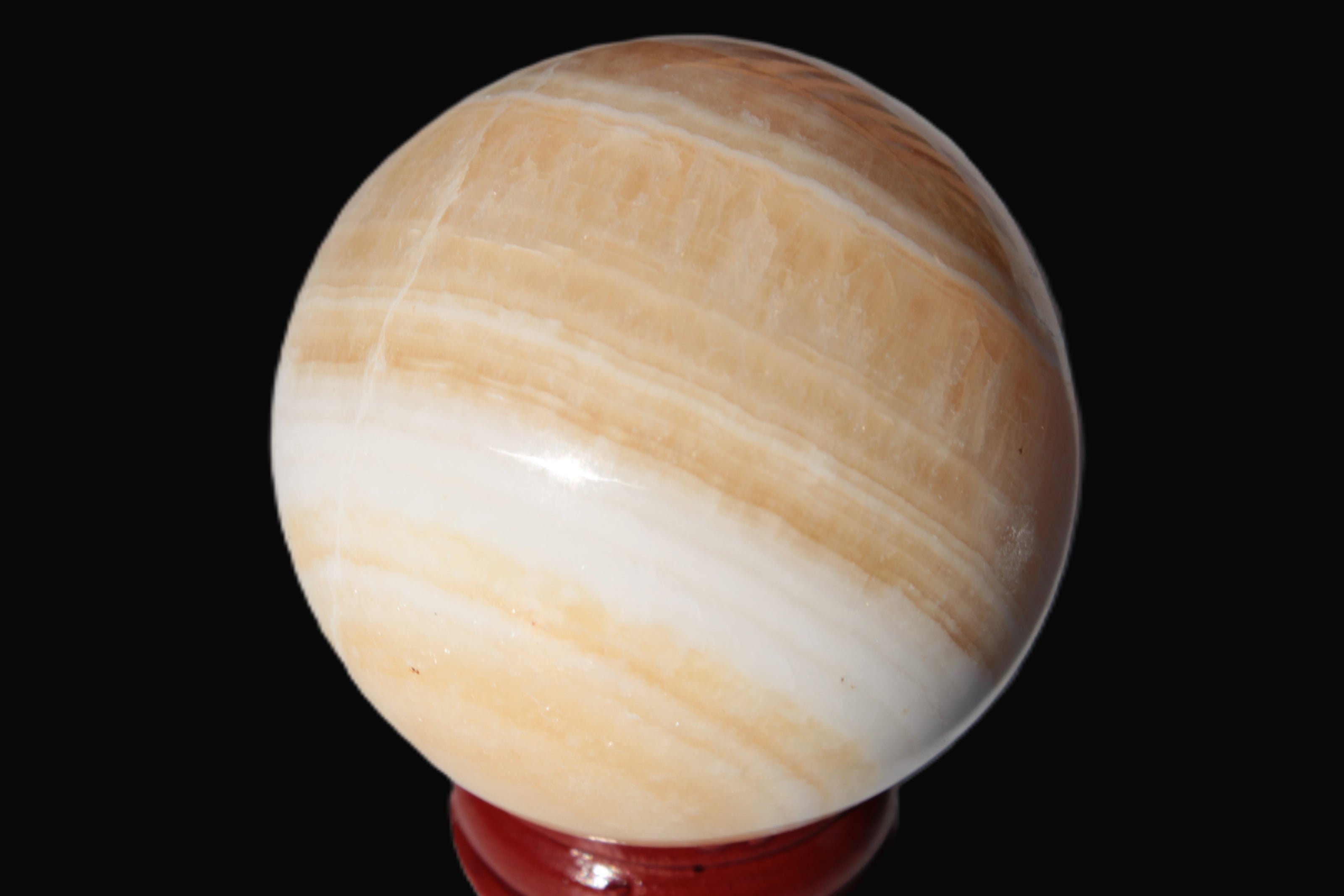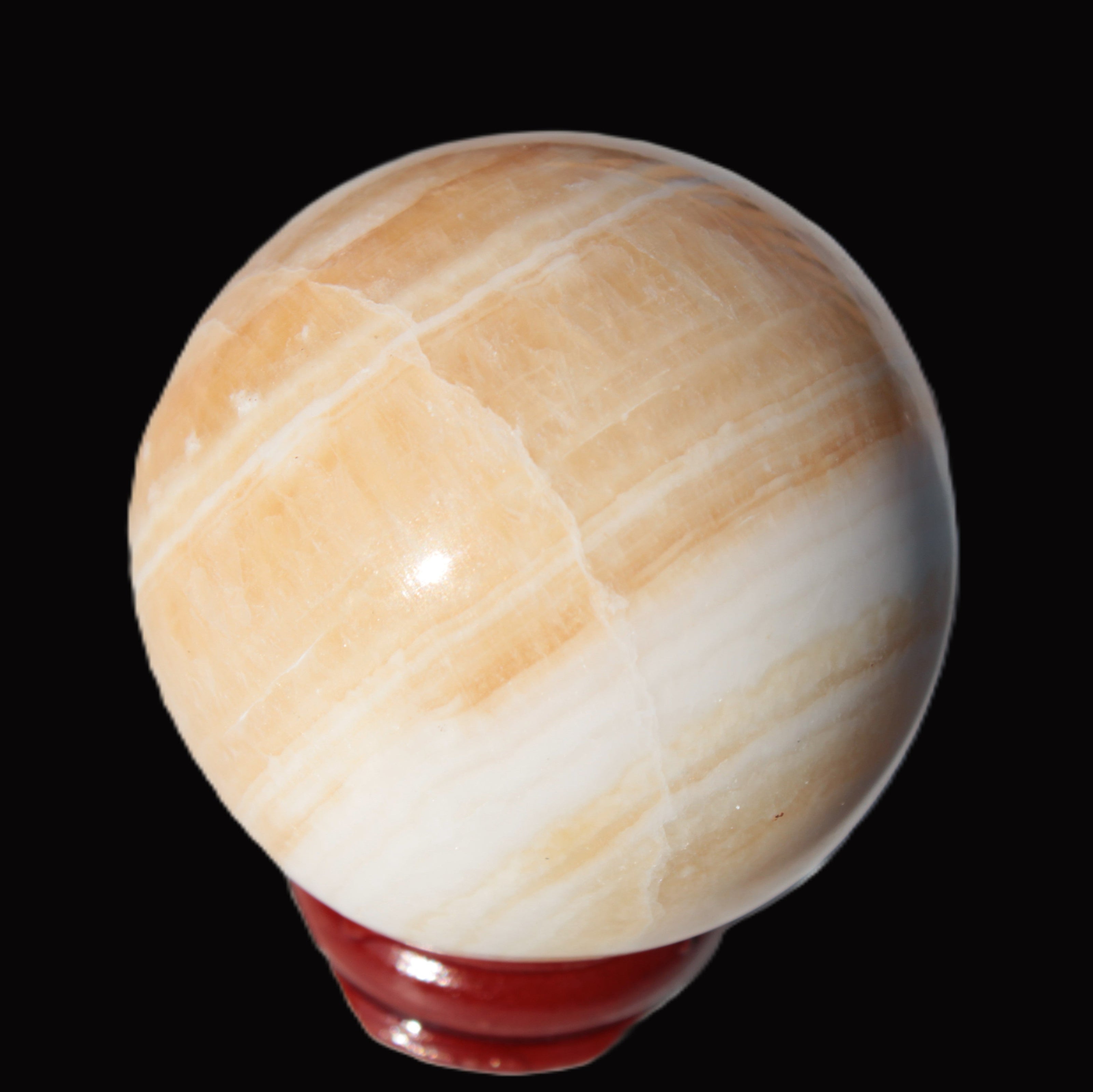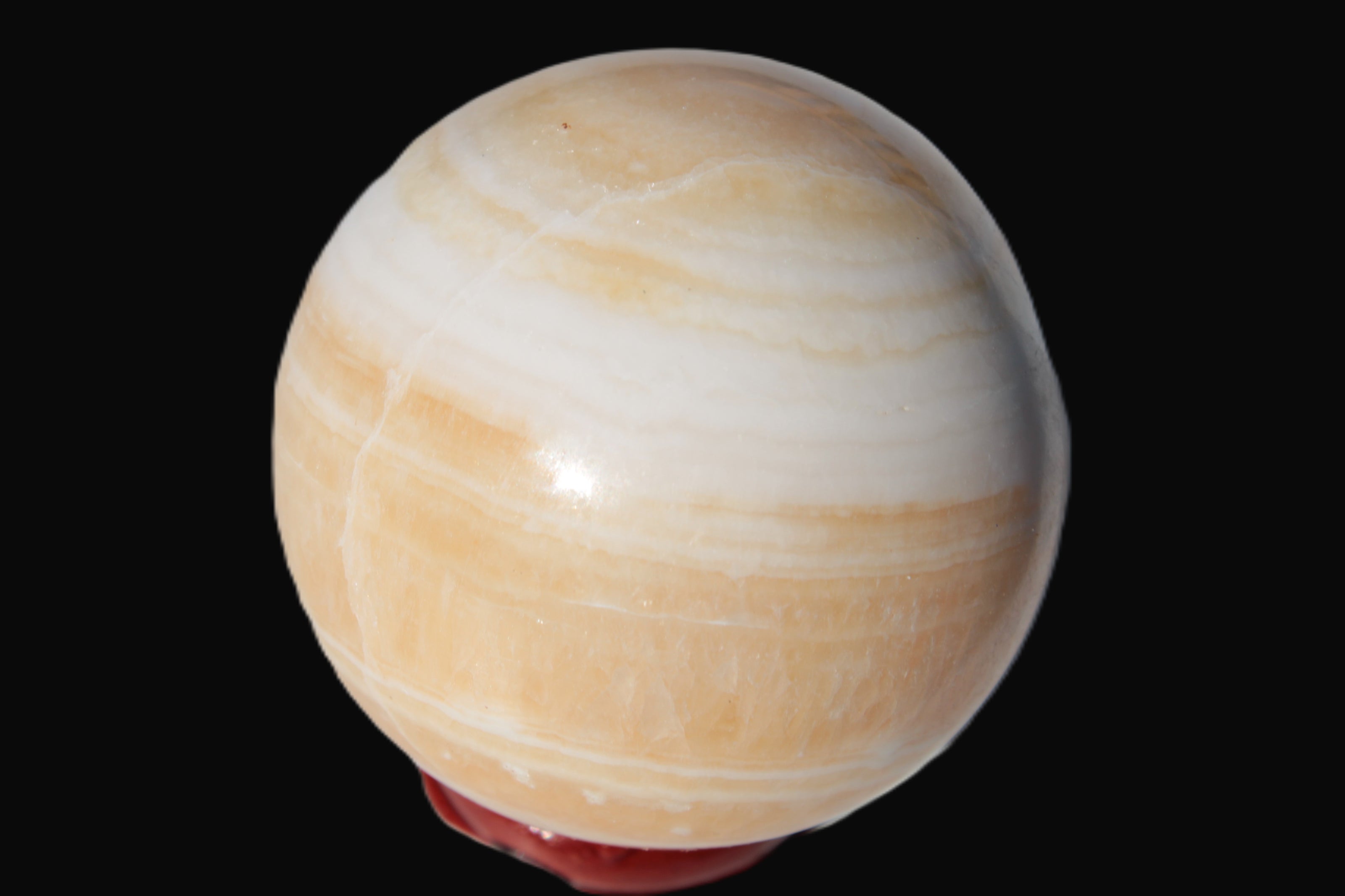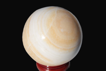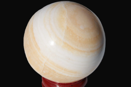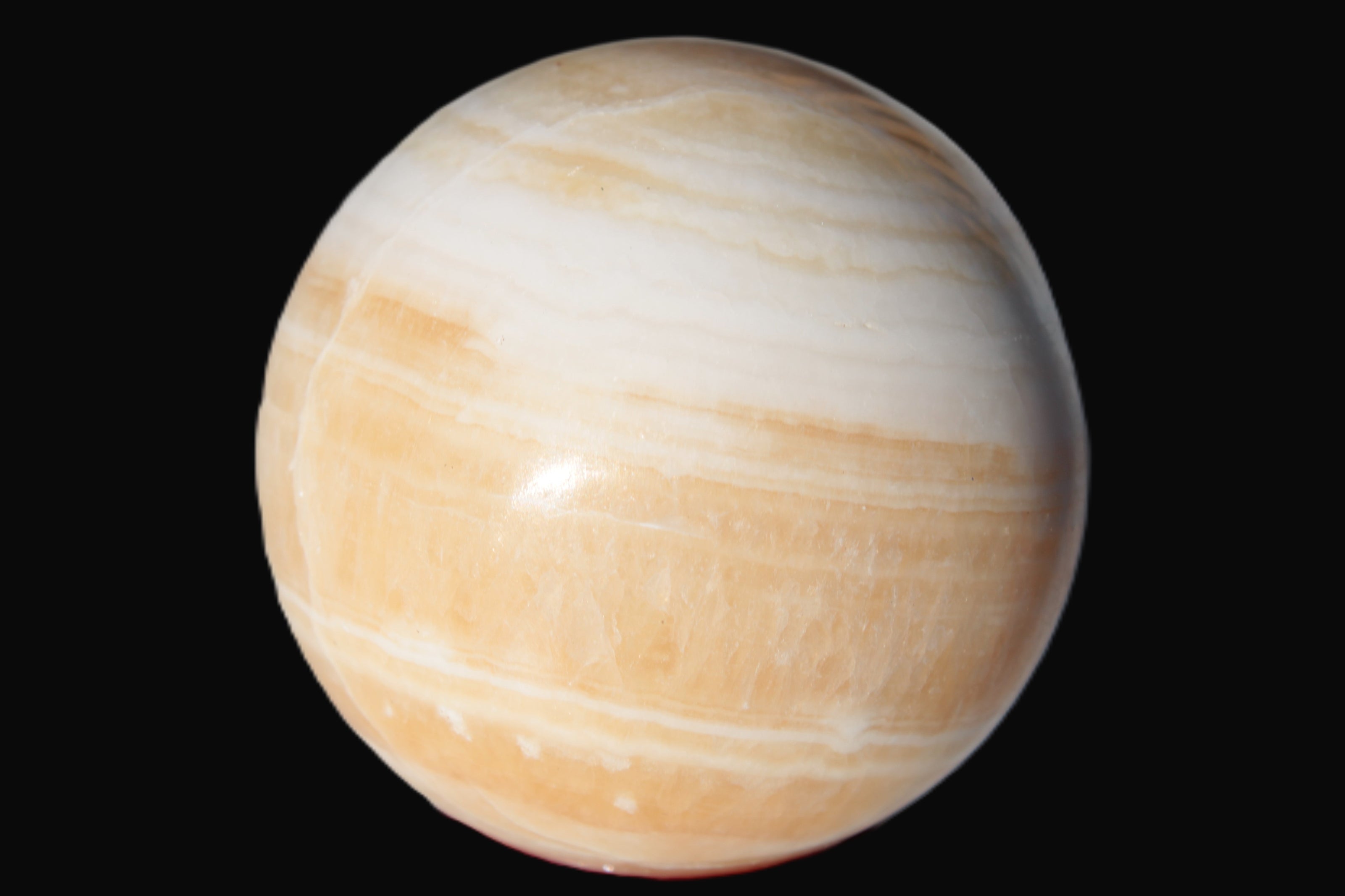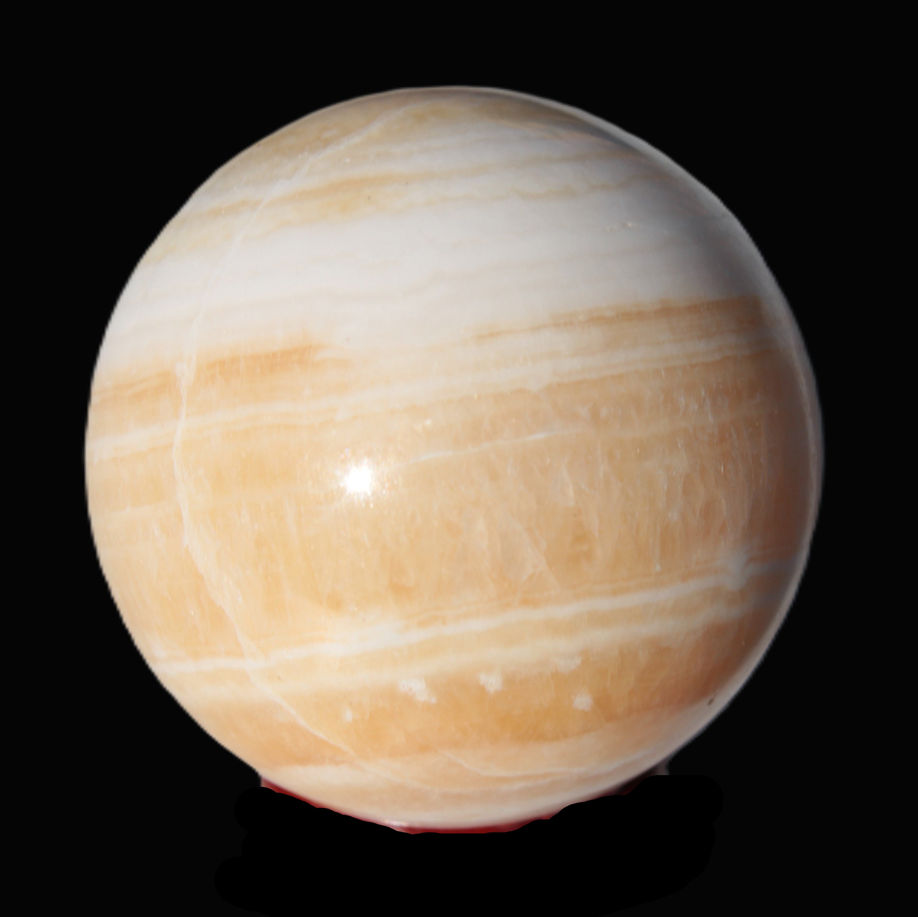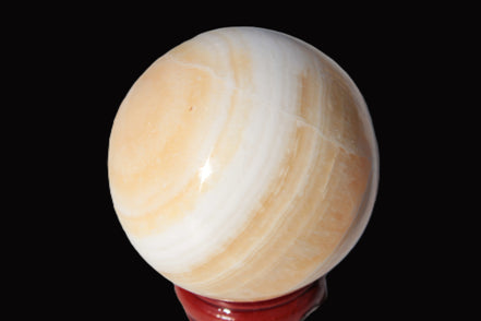 This Lemon Calcite sphere 48mm weighs 170g.  It has white and soft yellow banding. It makes me think of the planet Saturn, without its rings. It was obtained and crafted for Rocks and Things Store by Lawrence Handicrafts from stone found locally in Pakistan.