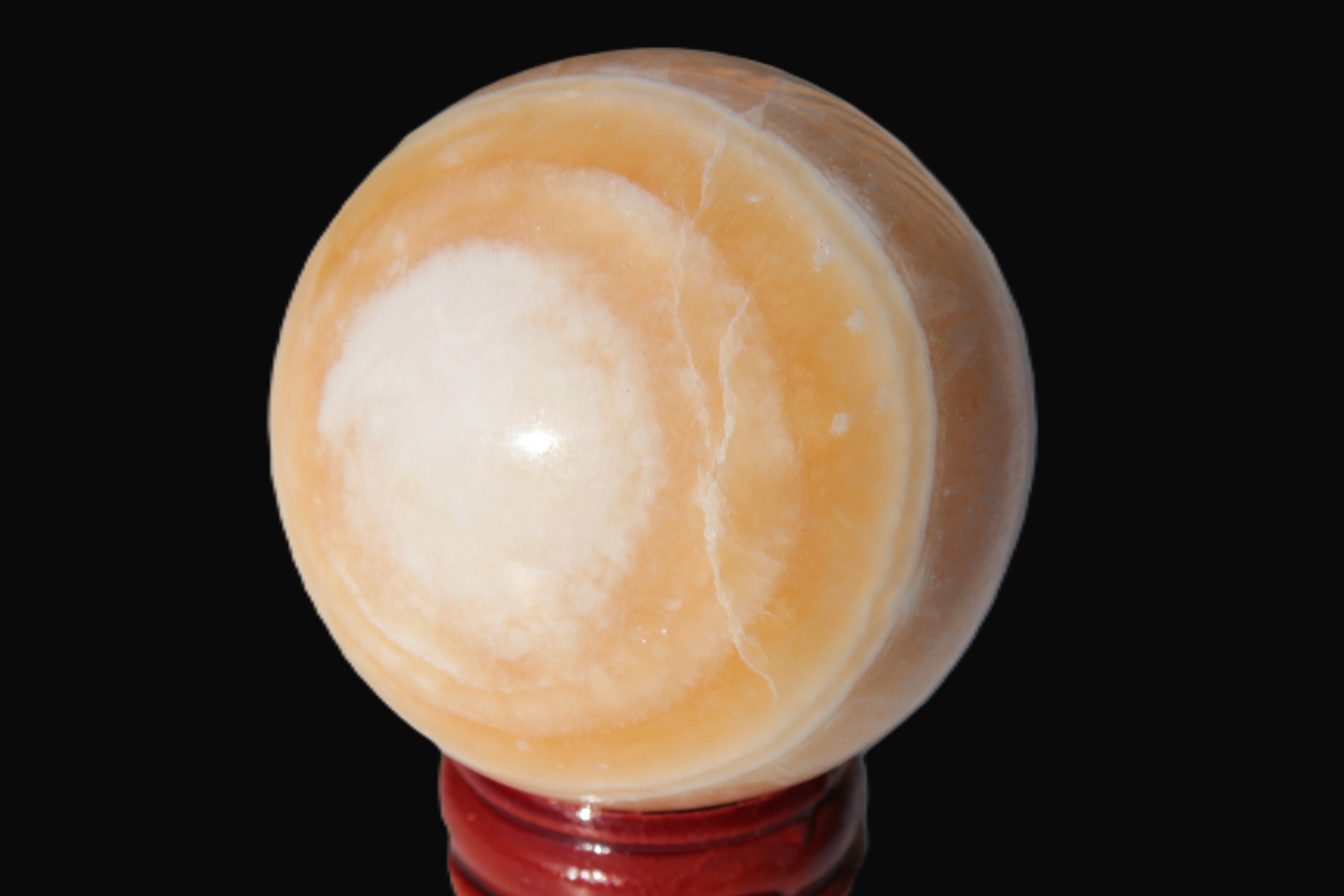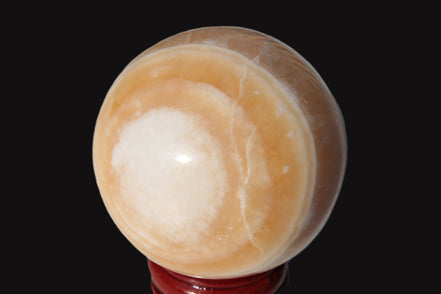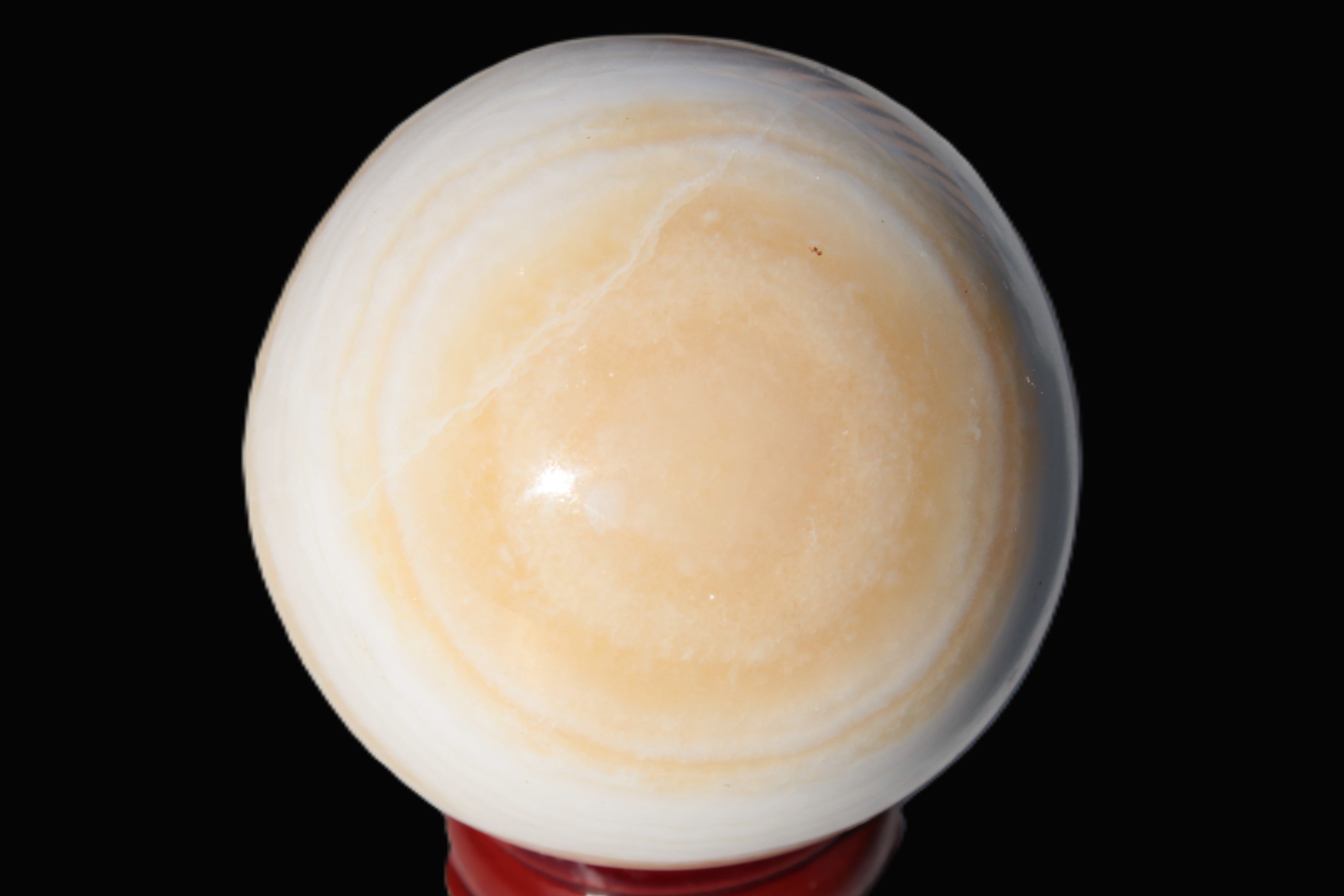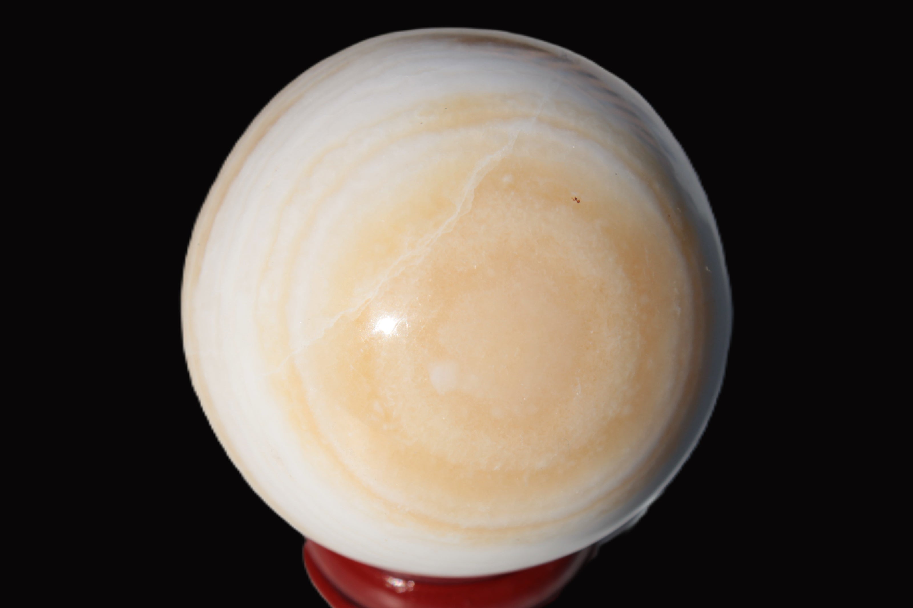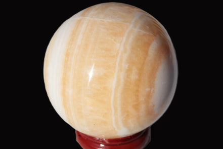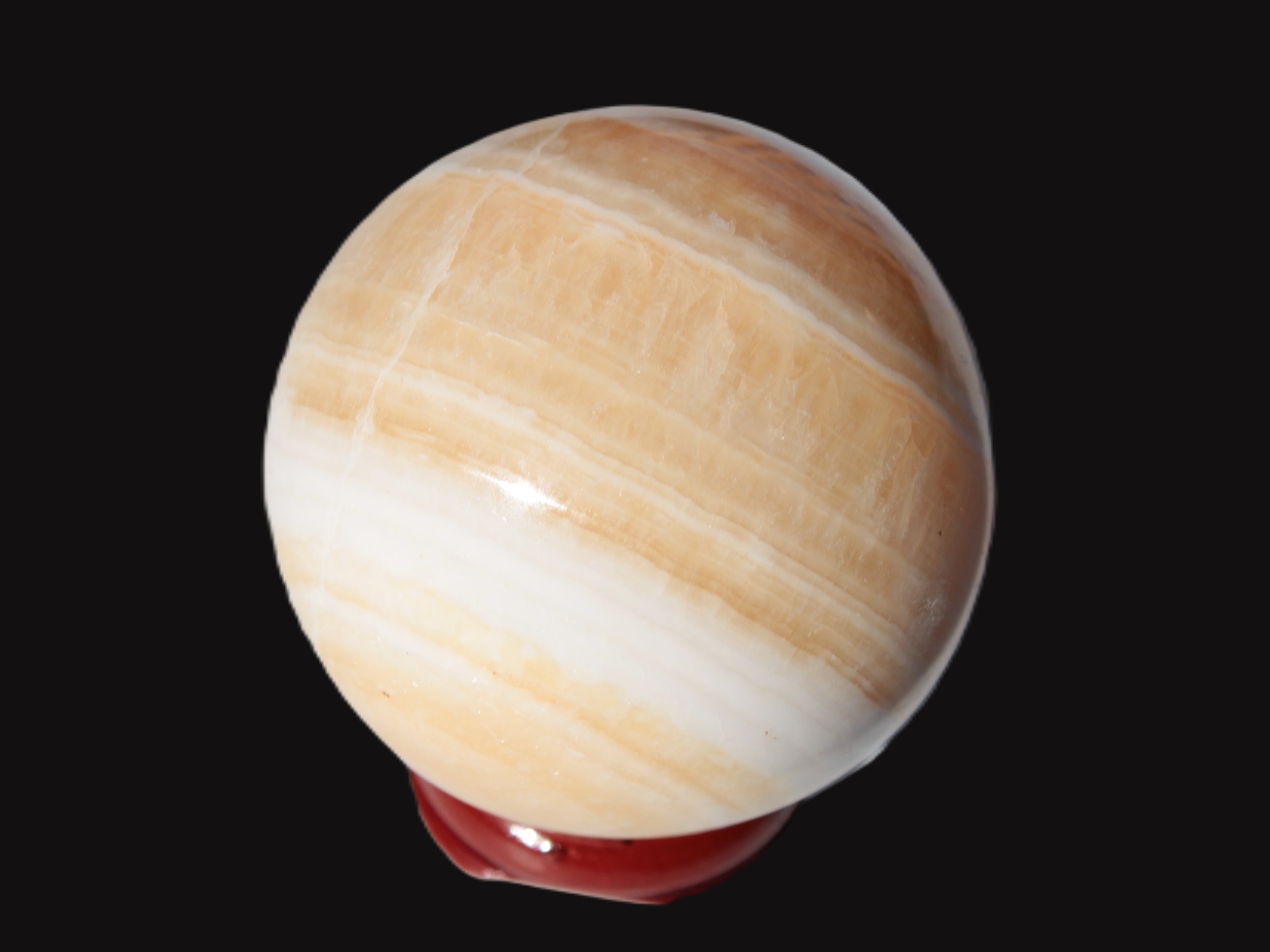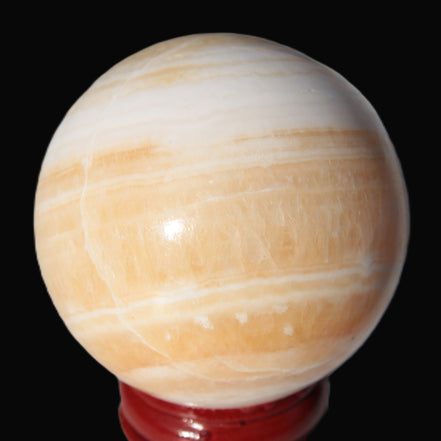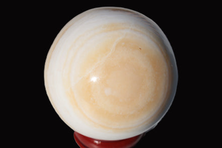 This Lemon Calcite sphere 48mm weighs 170g.  It has white and soft yellow banding. It makes me think of the planet Saturn, without its rings. It was obtained and crafted for Rocks and Things Store by Lawrence Handicrafts from stone found locally in Pakistan.