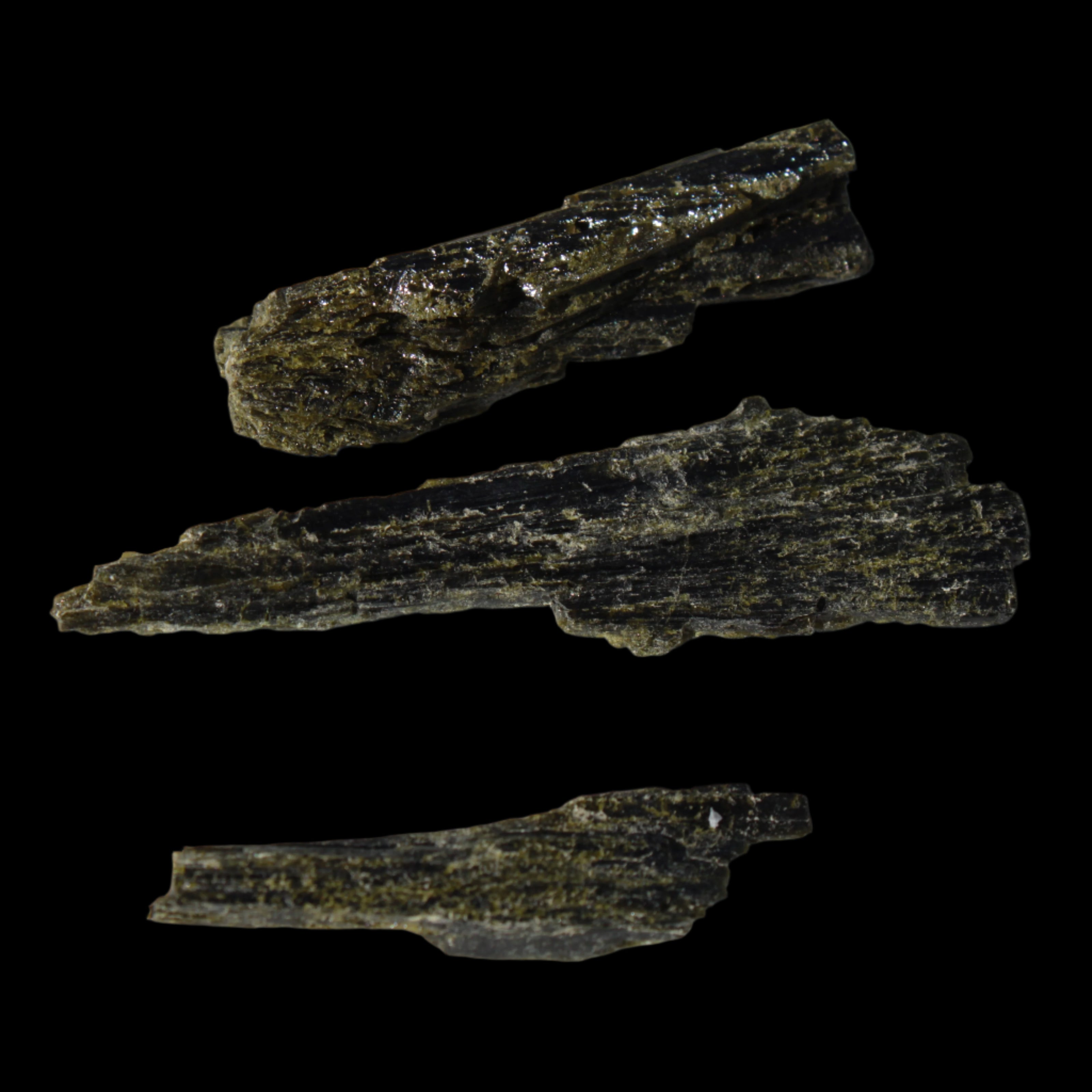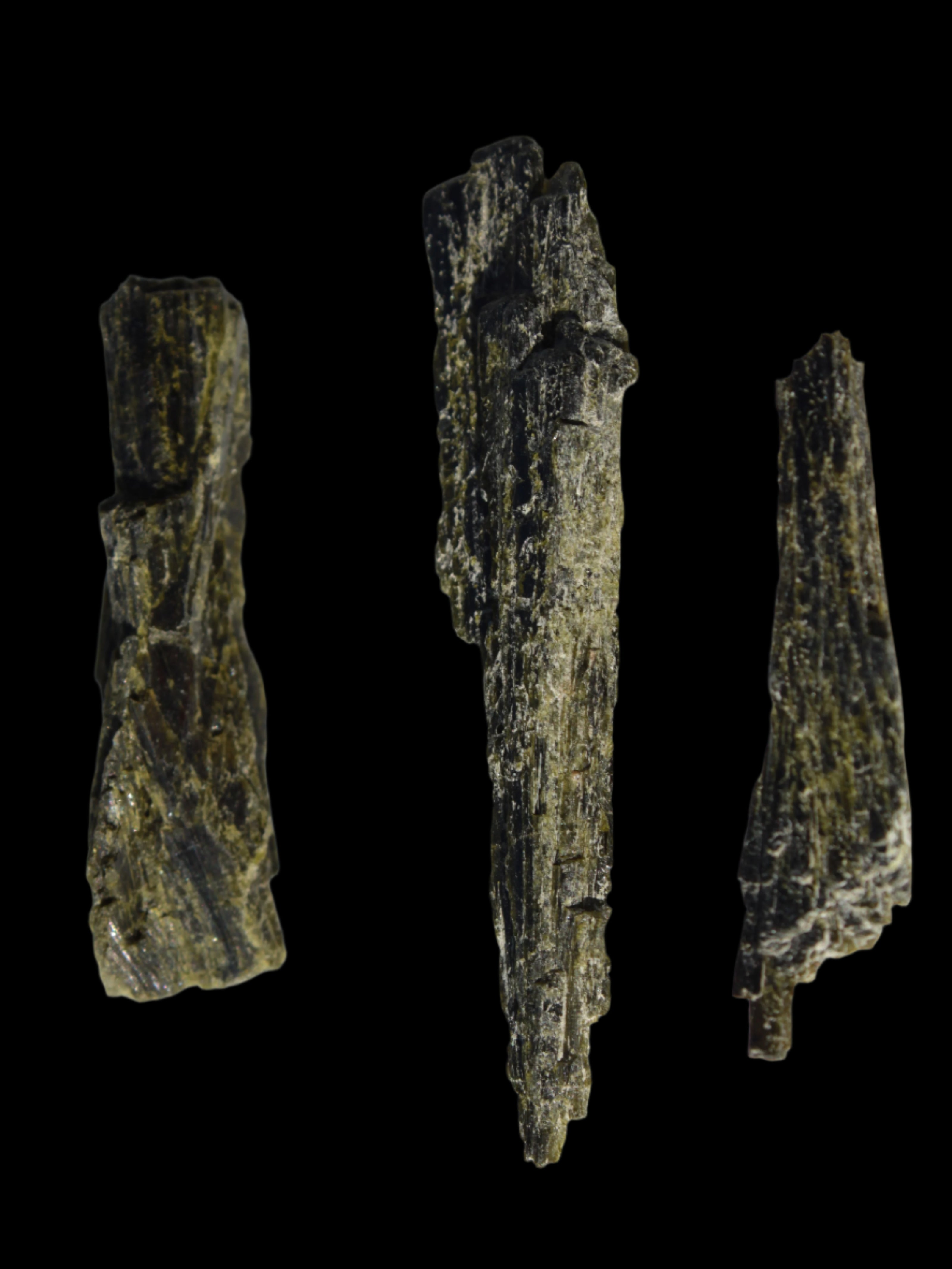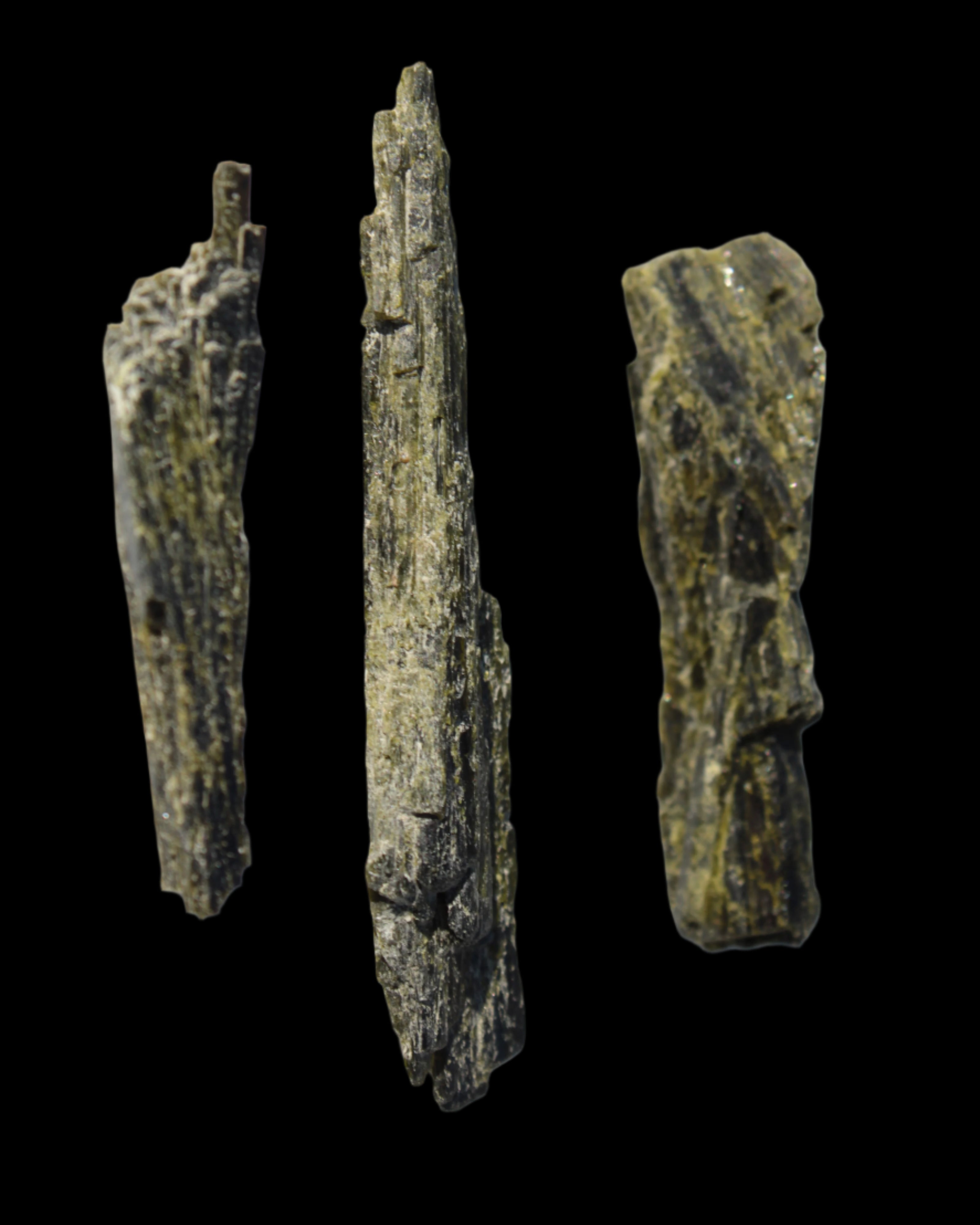 This selection of Long blade Epidote 3 crystals weigh 69.7ct or 13.9g. Epidote is a rarer mineral formed from aluminium and iron. These three long intricate Epidote crystals provide an attracting force. Epidote attracts, as if it were an energy magnet. Epidote attracts and enhances the energies in its immediate environment and within anything it touches. Care is needed in using and storing Epidote as this property of enhancement occurs regardless of whether the energies are good or bad.  You can program Epidote to attract what you desire in life. By itself, it will tend to attract abundance, prosperity, and creativity. You can also program it for assistance in love, relationships and other desires. Epidote is responsive to karma, and will attract what you have inside, not what you may only idealise about yourself.