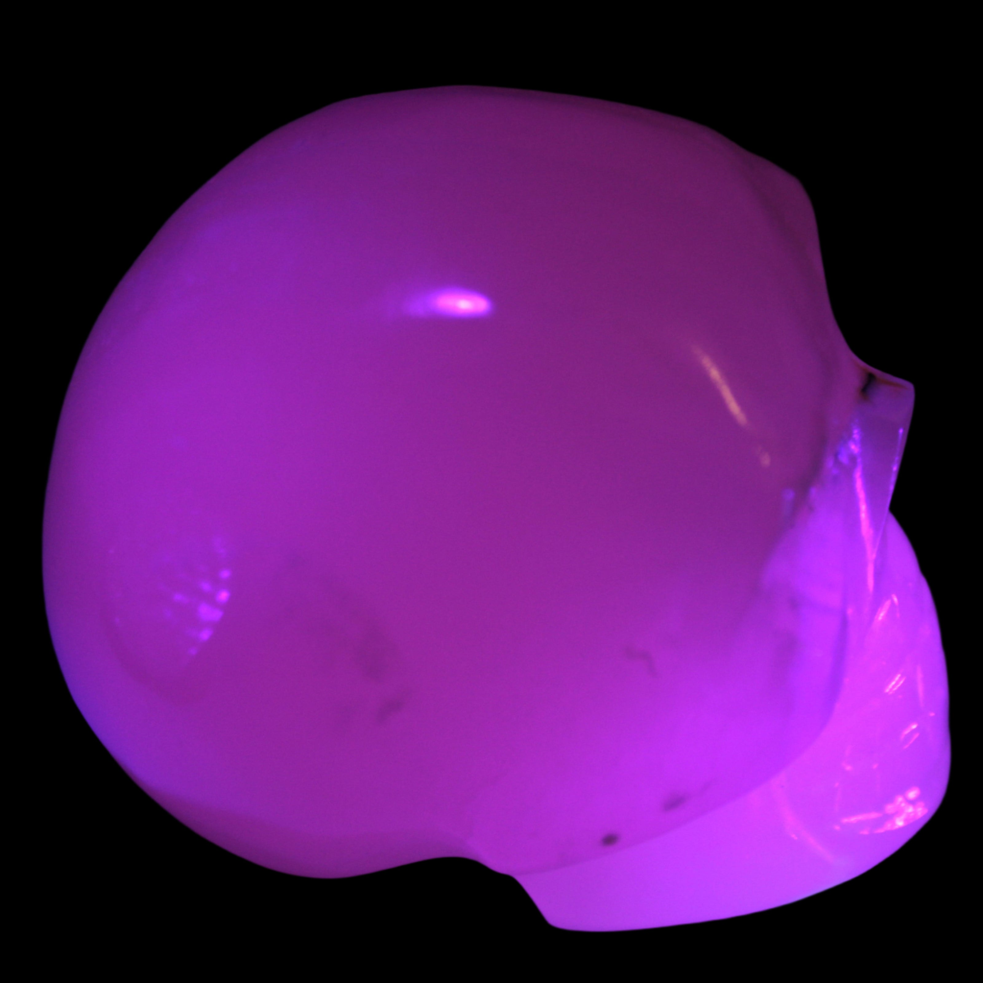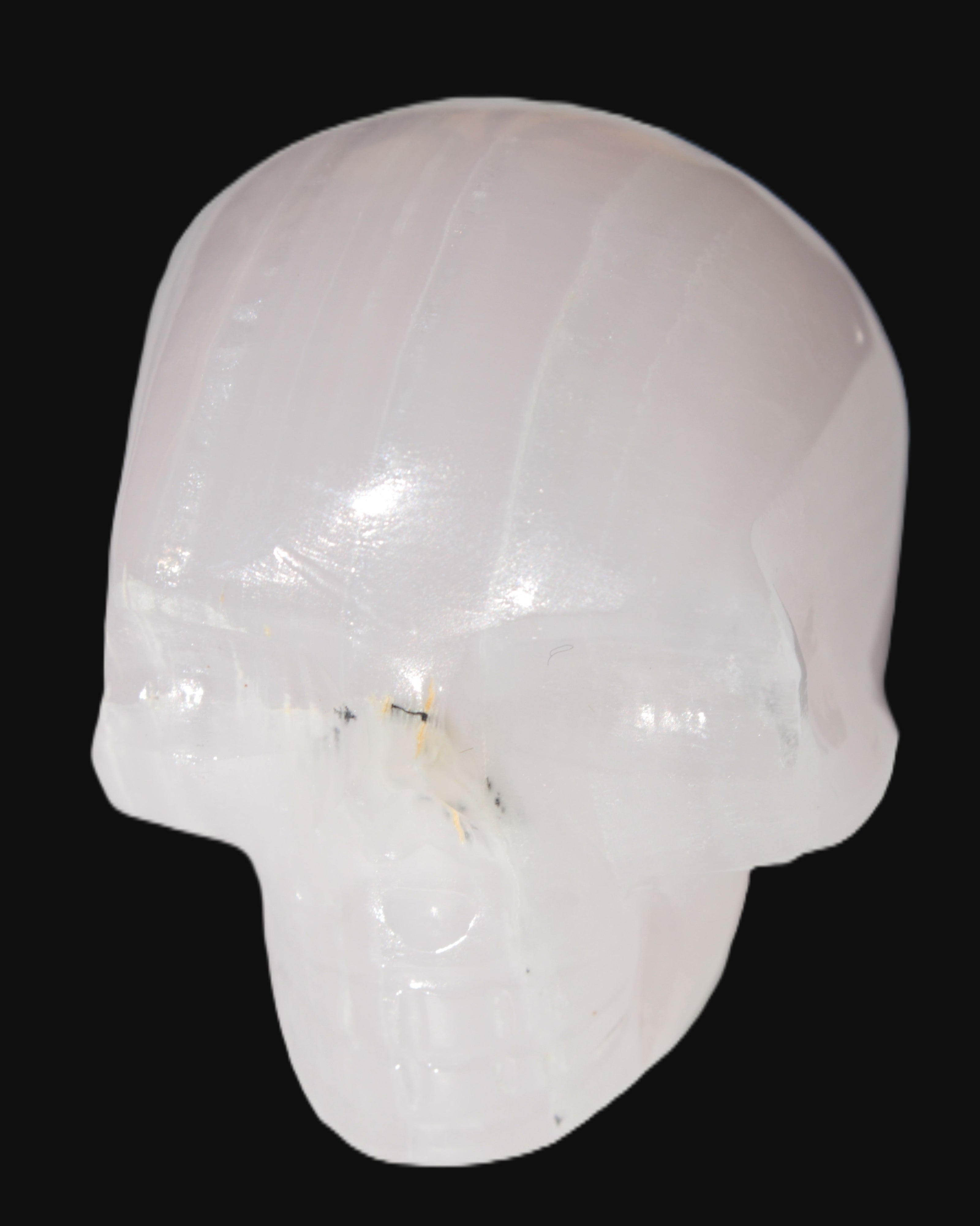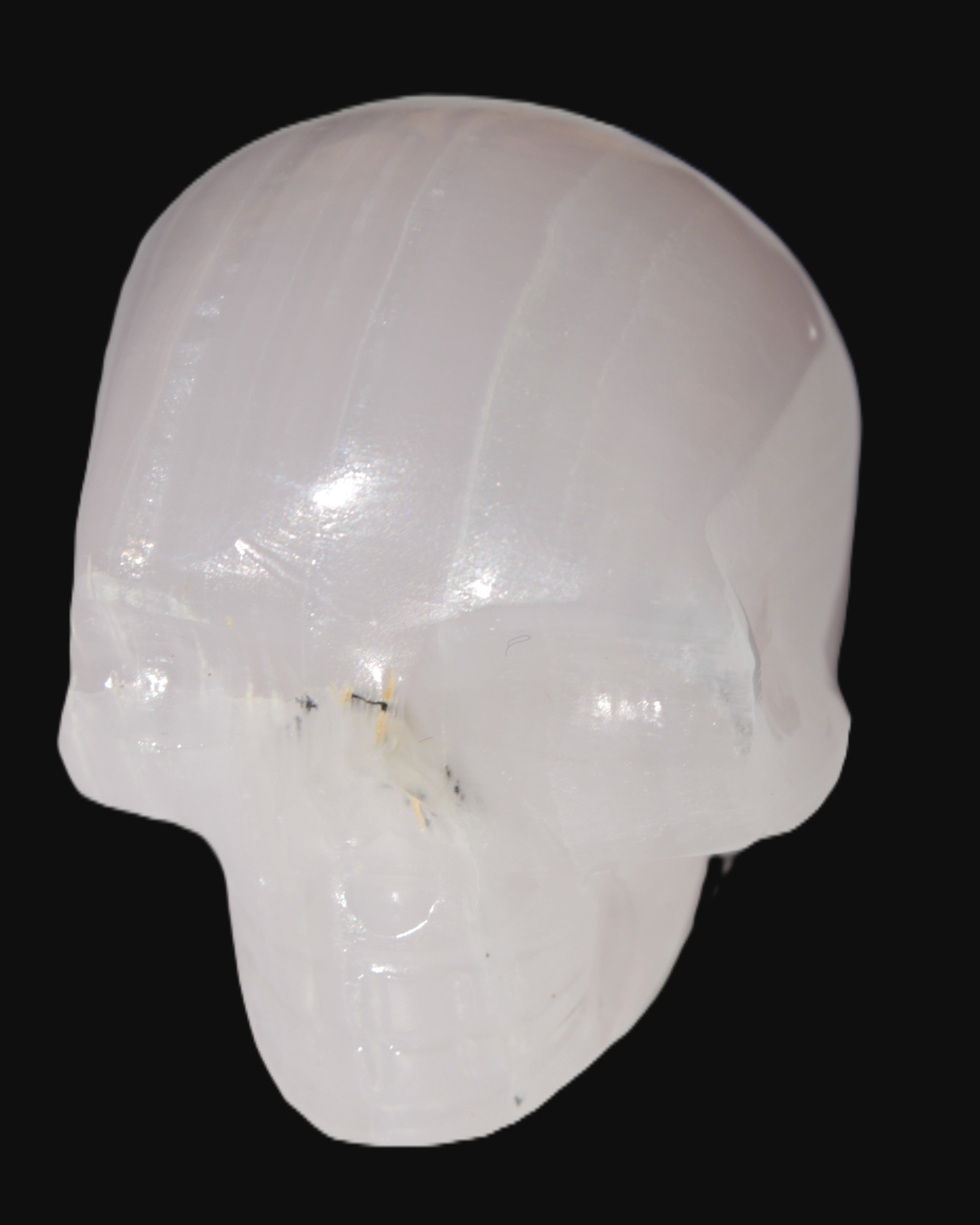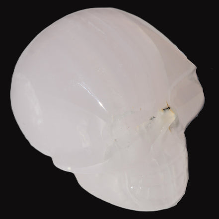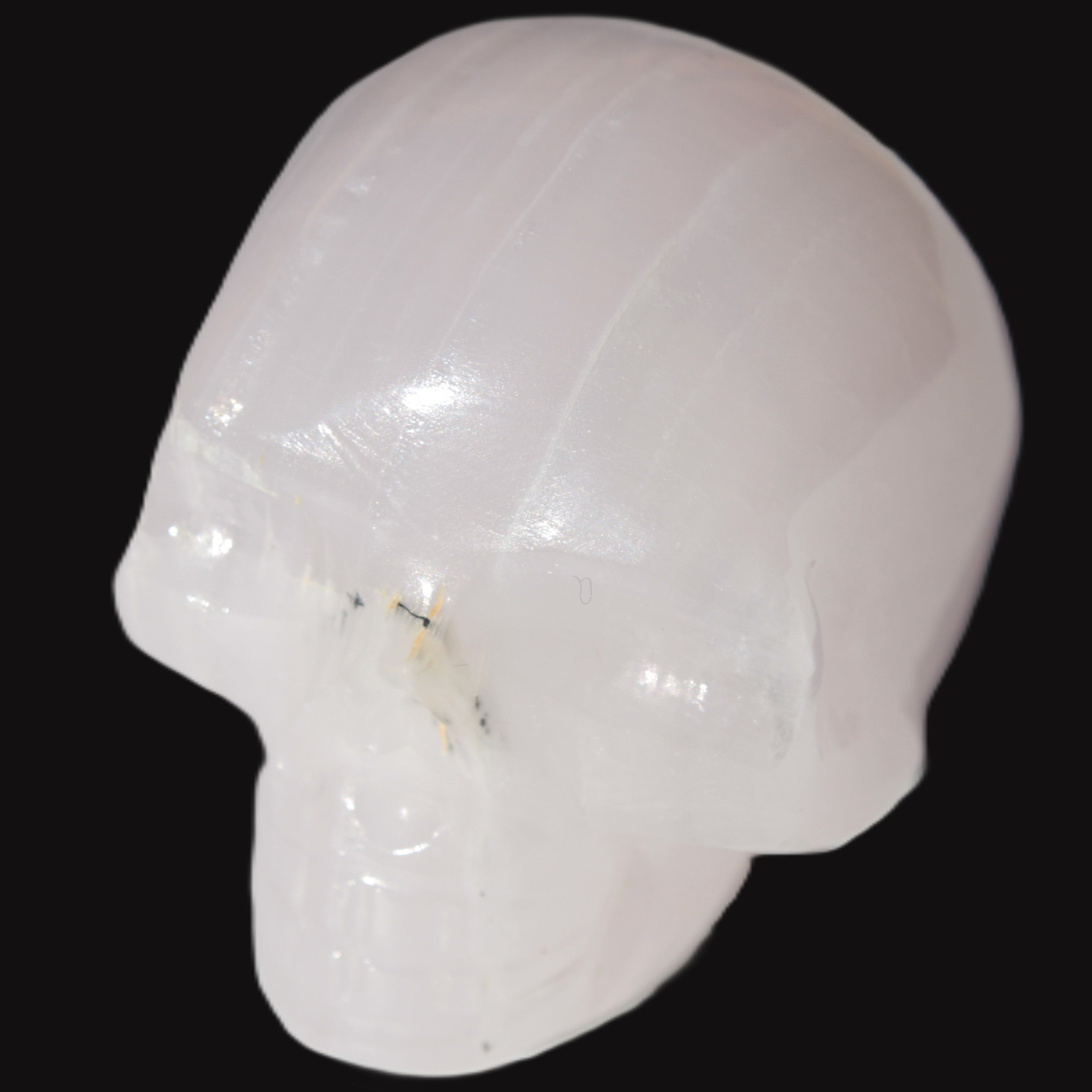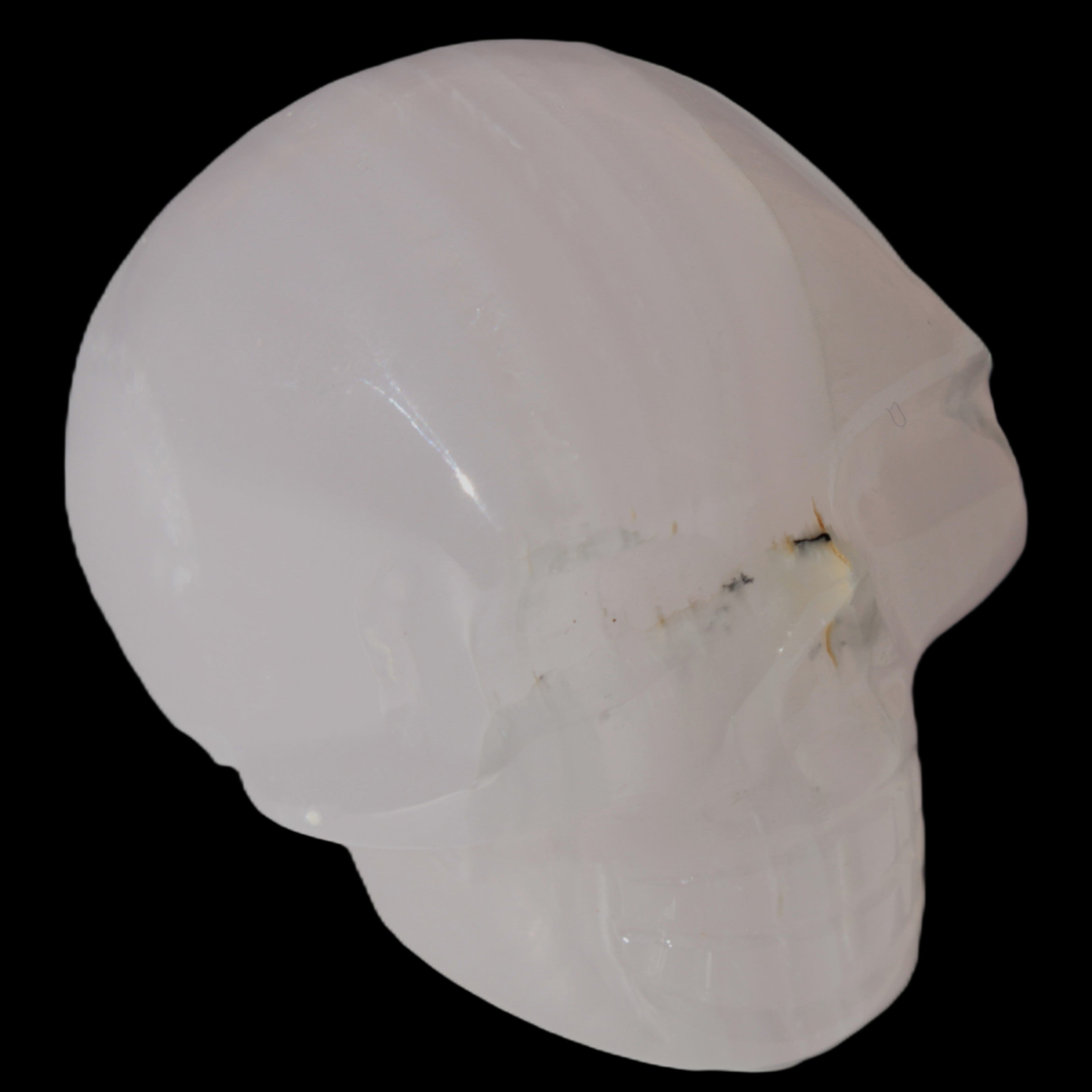This Mangano banded Calcite skull 43*44*48mm weighs 161.5g.  The skull was hand carved by Larence Riaz in Pakistan from locally sourced stone.