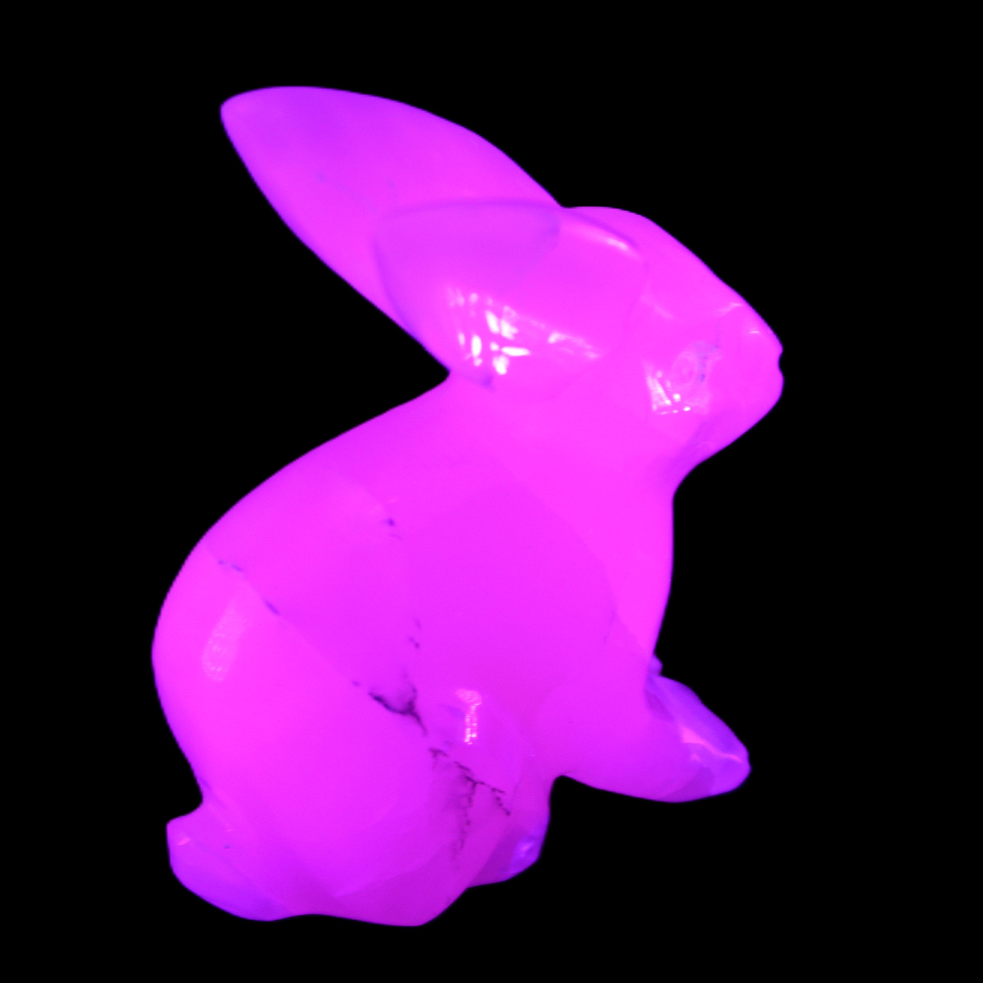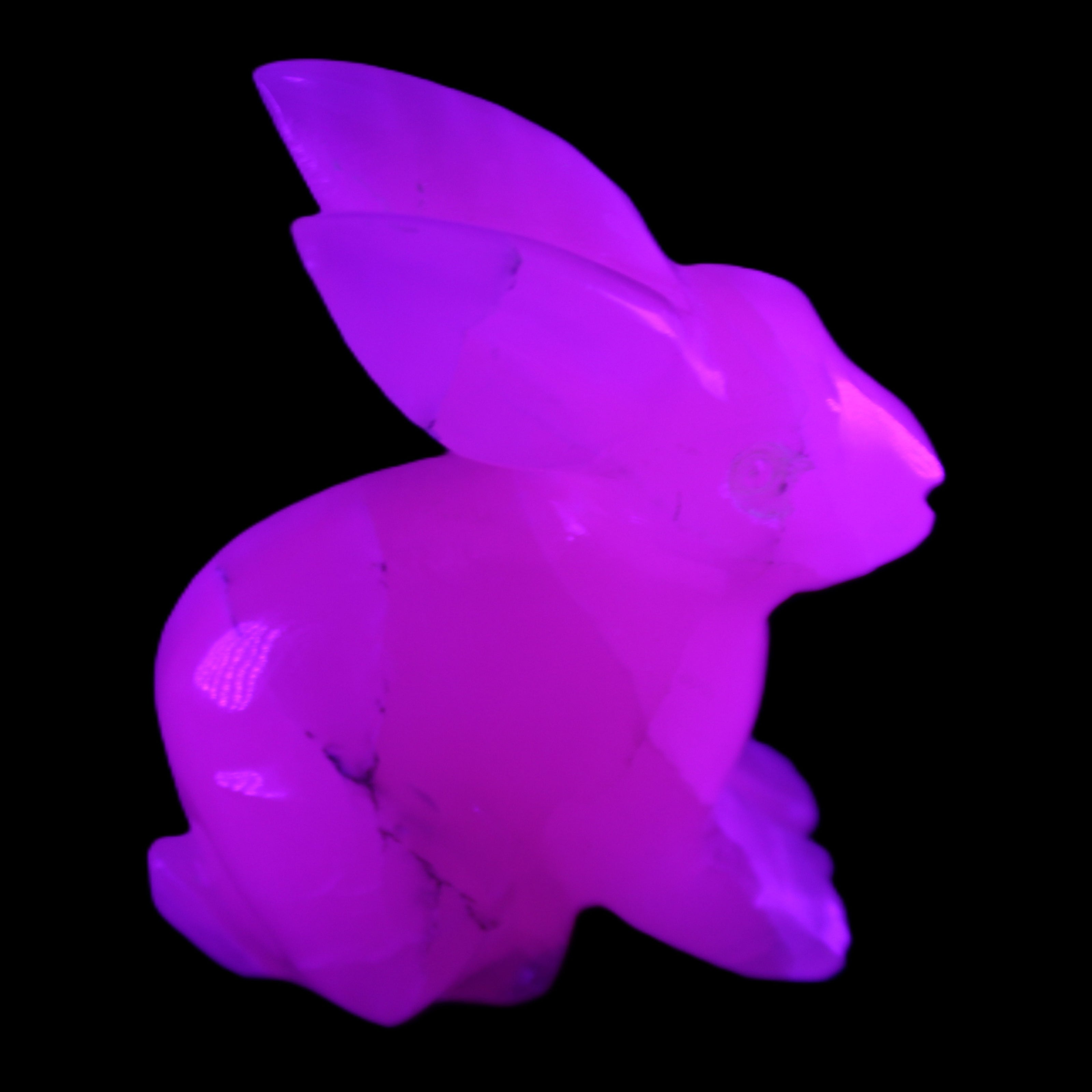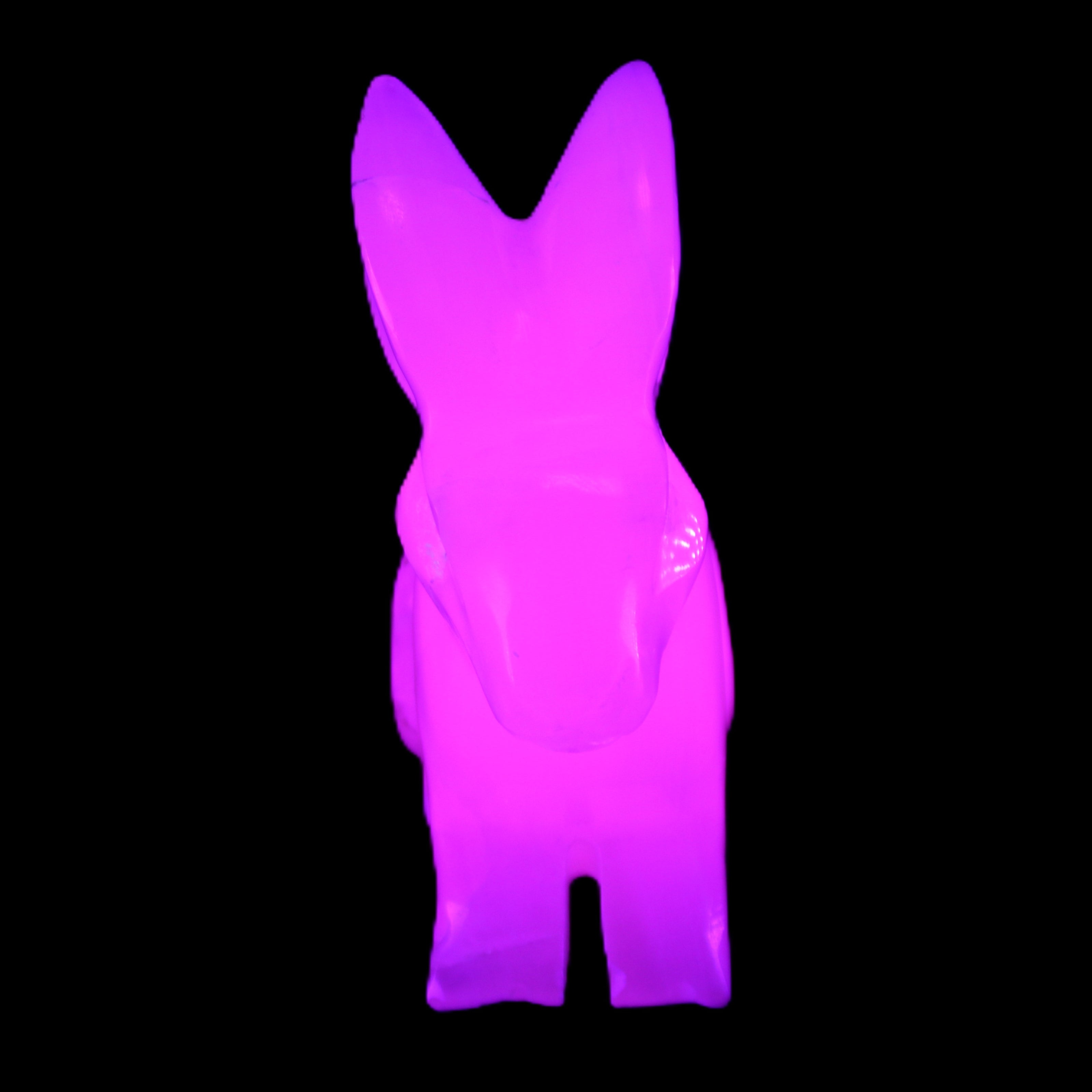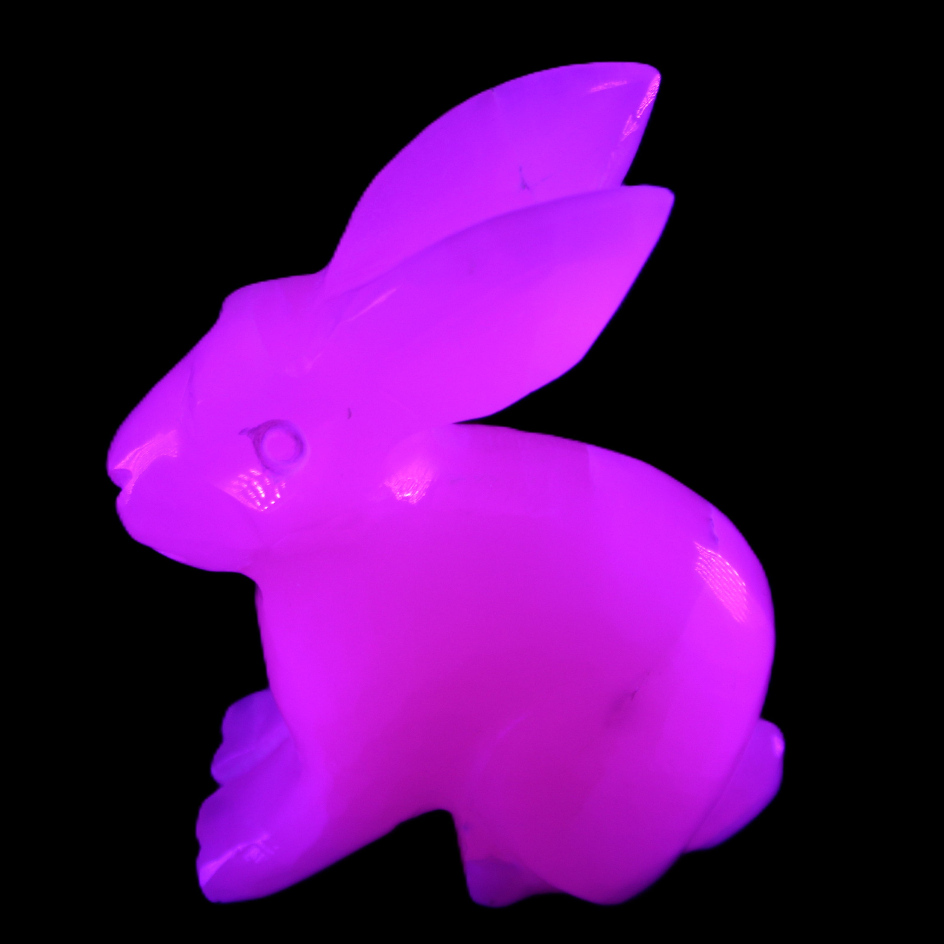 This Mangano Calcite bunny 76*36*100mm weighs 396g. This is no Wascally Wabbit. With time and personal growth, it can bring enlightenment and happiness, Mangano Calcite is a calcium carbonate mineral with a minimum of 30 per cent manganese carbonate present. The calcium and manganese carbonates can be banded. The presence of manganese makes Mangano Calcite react to ultraviolet light, giving it a bright hot-pink glow.