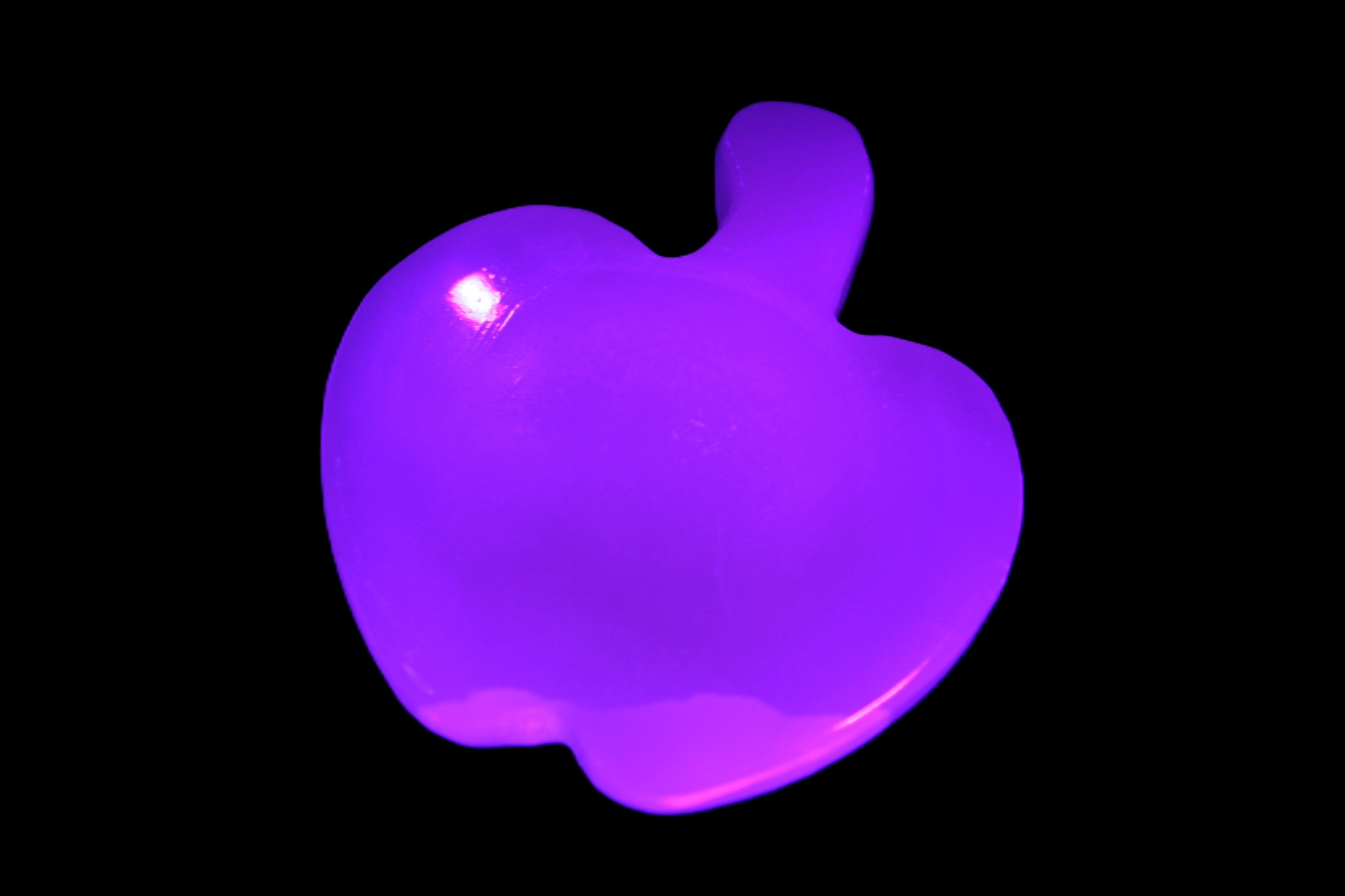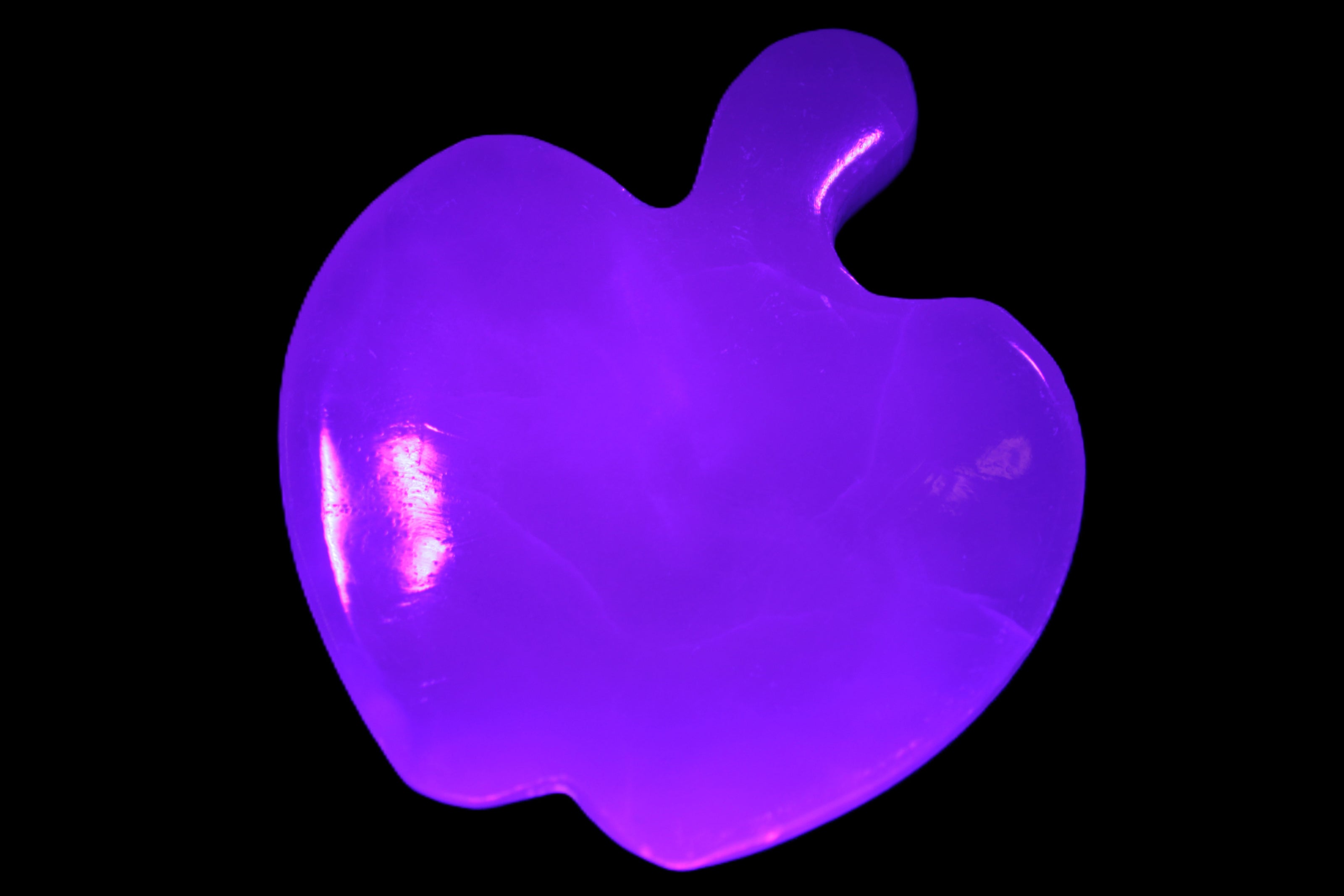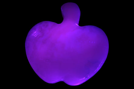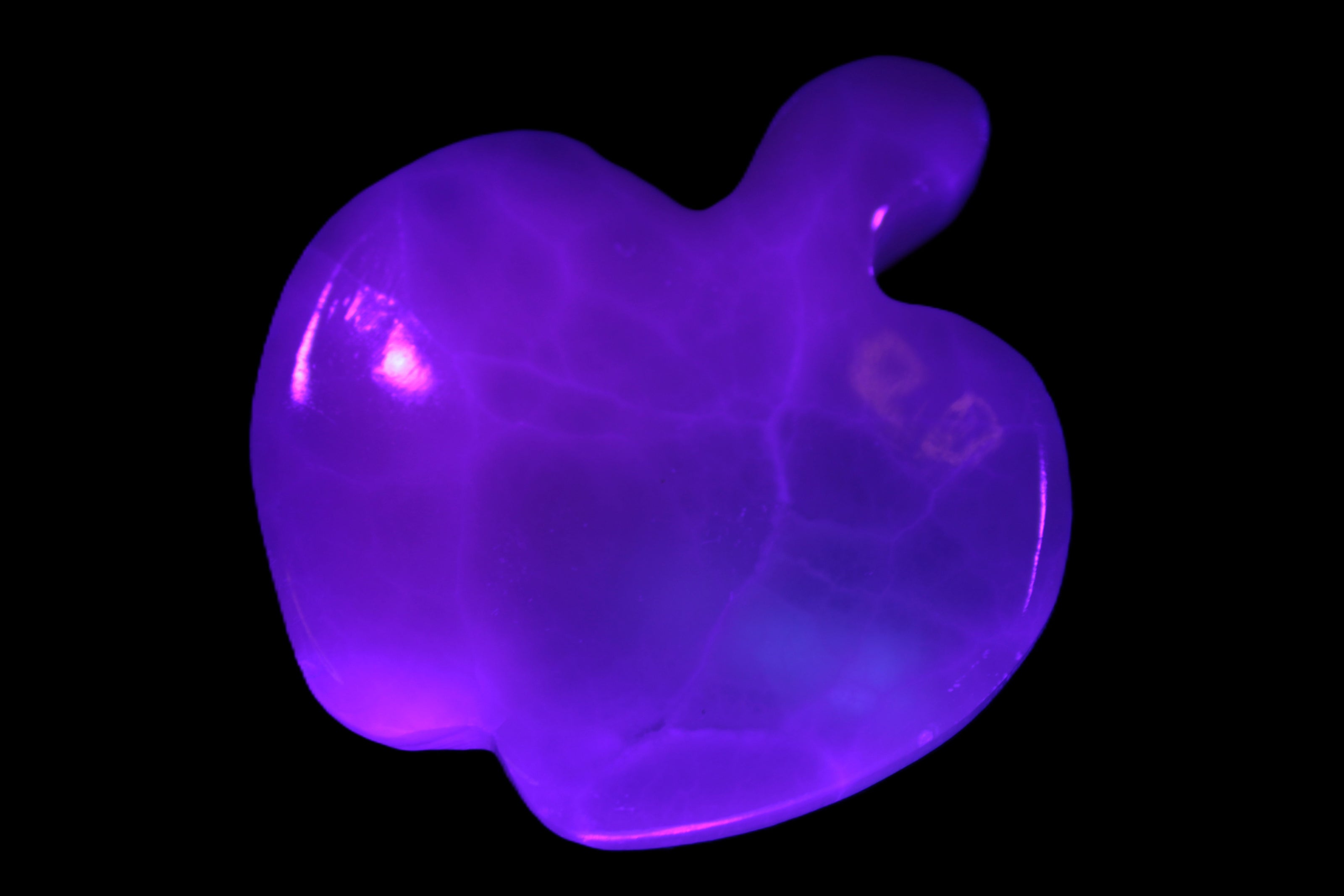 You can choose your Mangano Calcite hand-carved apple to bite into in this selection. The range 62-68g.  Mangano Calcite is a calcium carbonate mineral with a minimum of 30 per cent manganese carbonate present. The calcium and manganese carbonates can be banded. The presence of manganese makes Mangano Calcite react to ultraviolet light, giving it a bright hot-pink glow. Mangano can help reveal to you your true self. Mangano Calcite can help bring inner peace, through a process of self-discovery.