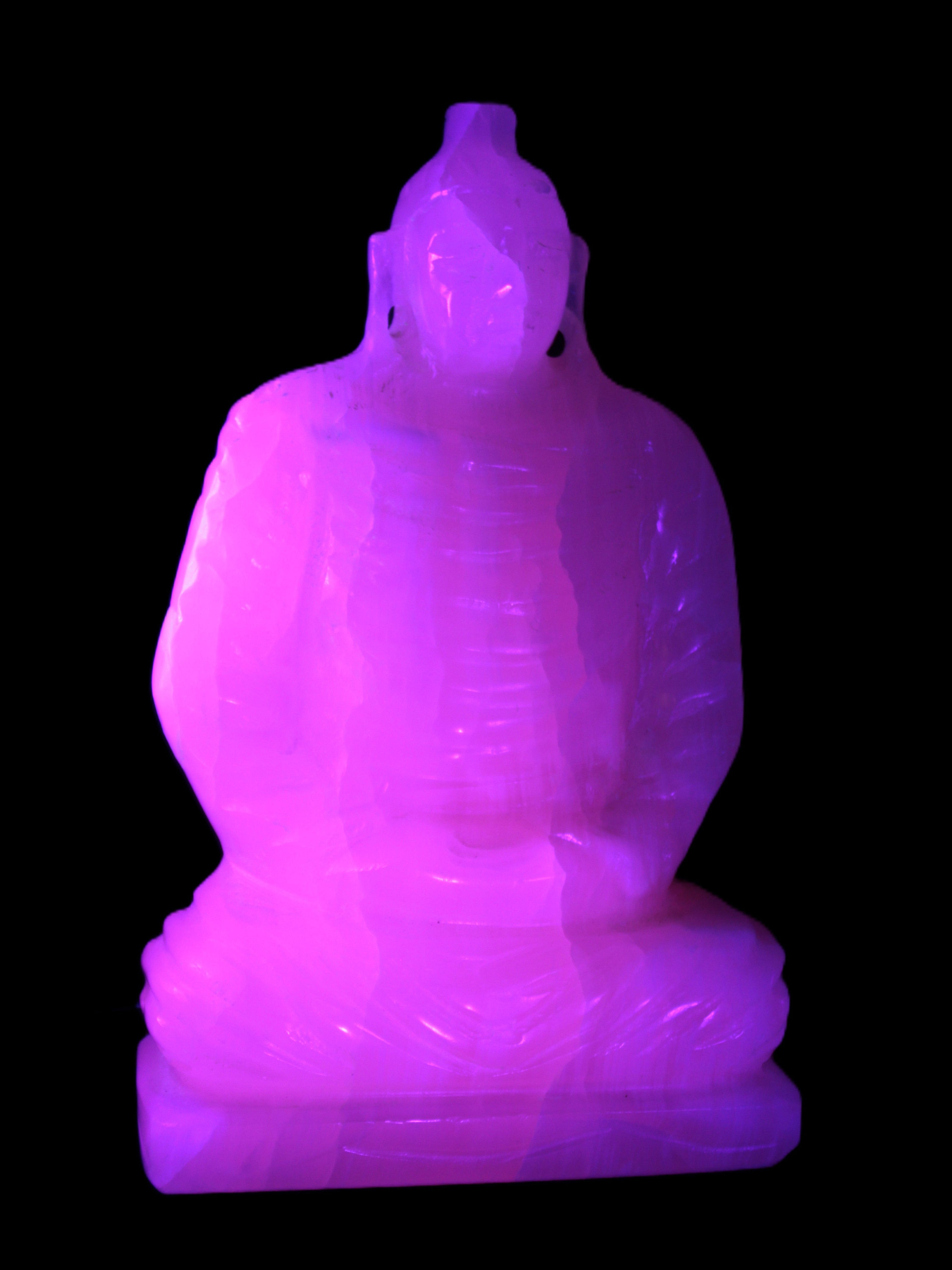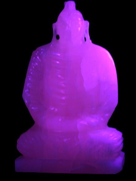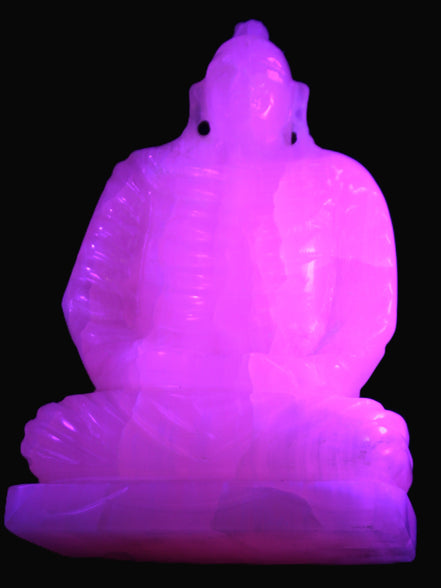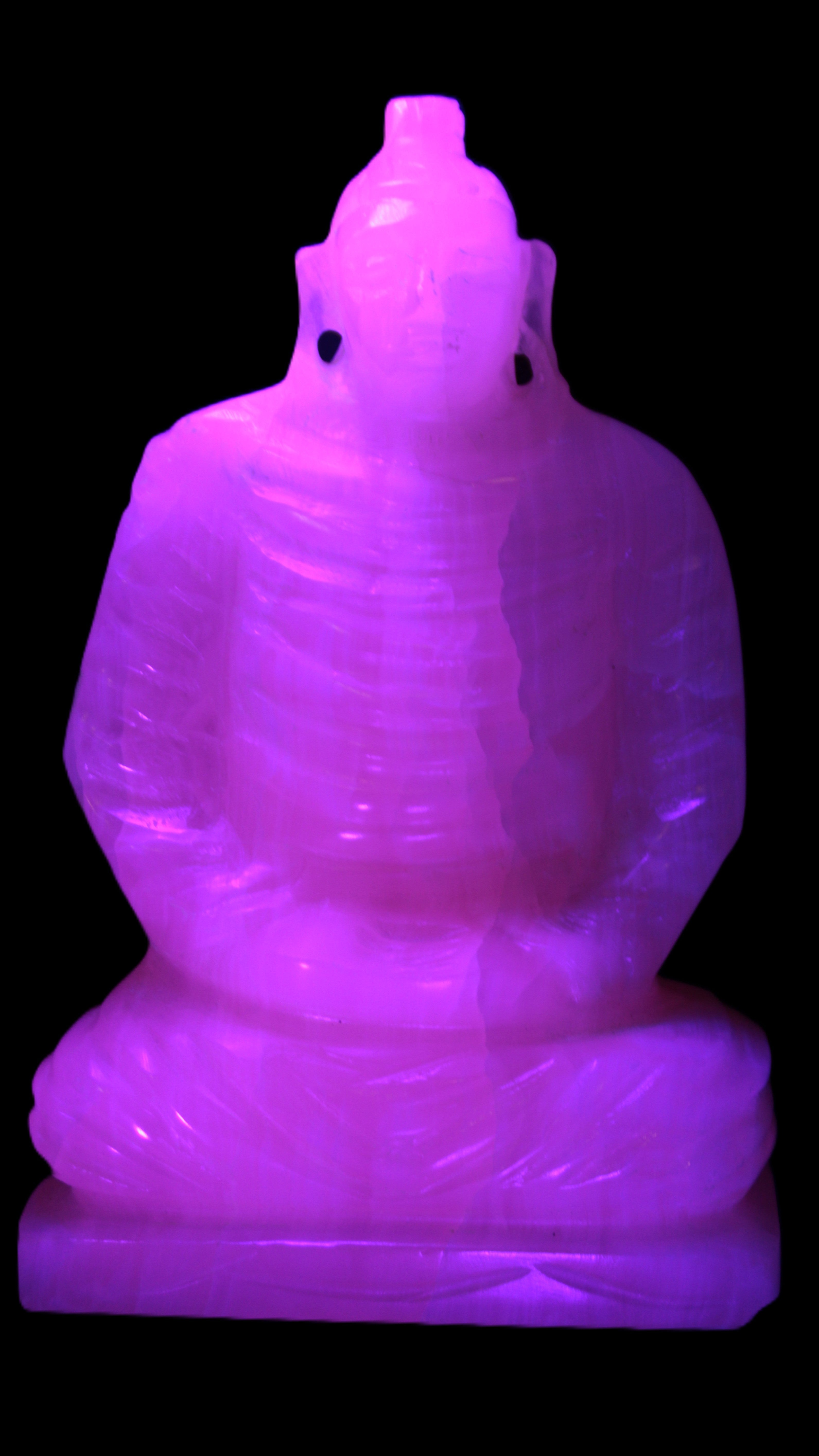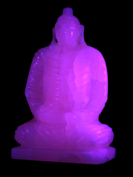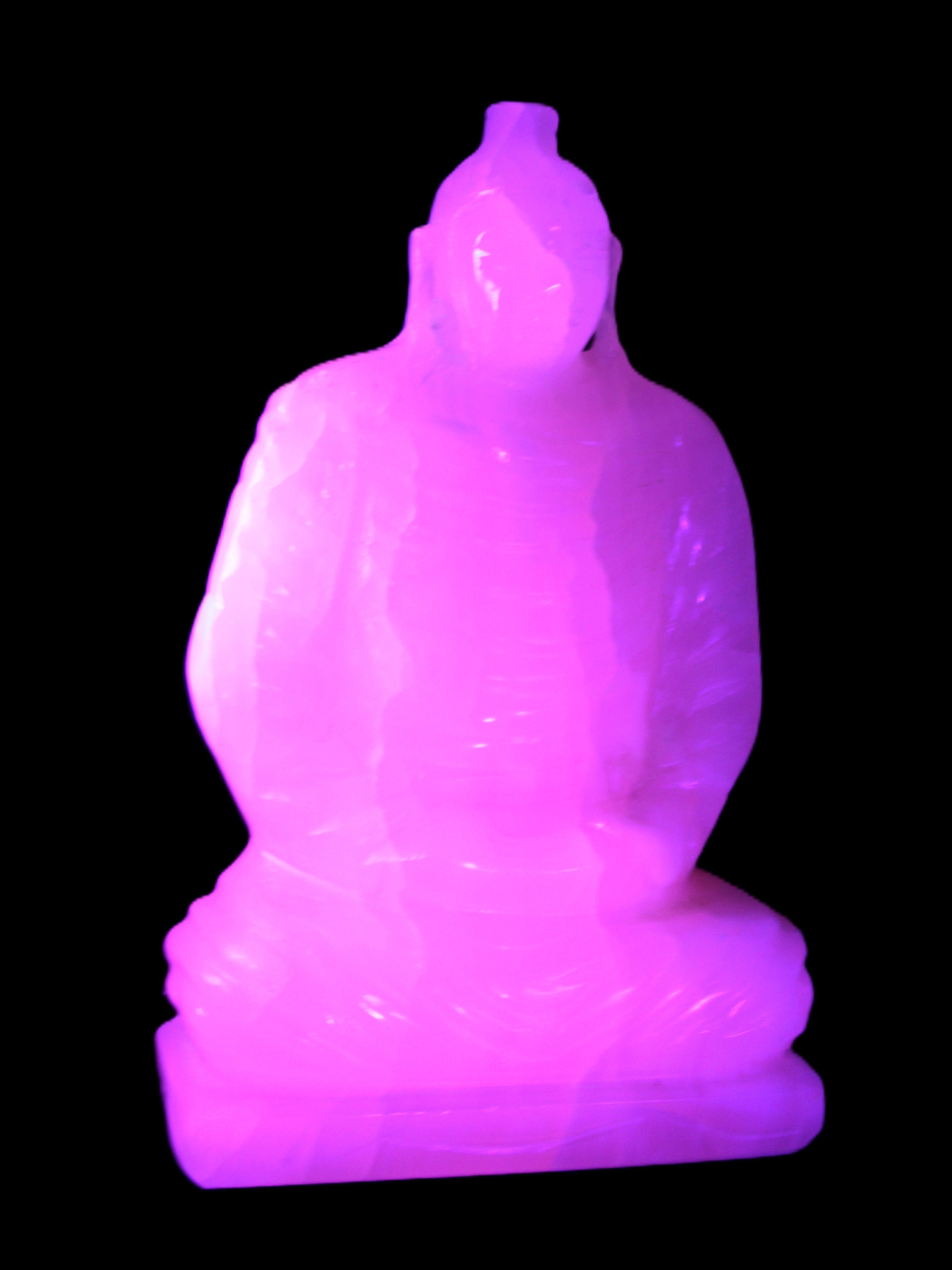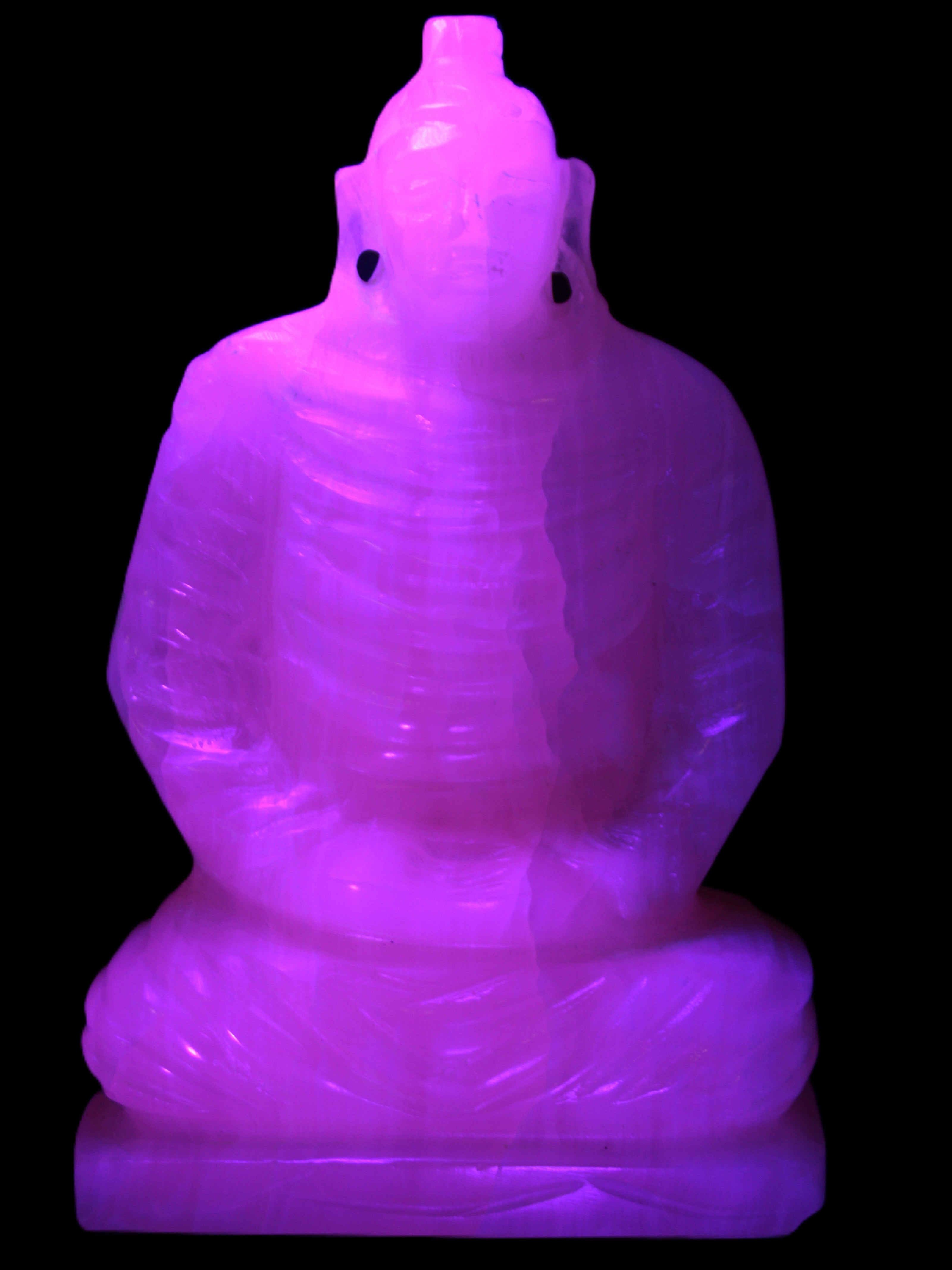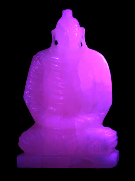 This Mangano Calcite hand-carved Buddha statue 52*79*241mm weighs 3285g. It was artfully crafted by Lawrence Riaz, from local stone he sourced in Pakistan. This statue stands 241mm tall and the base is 79mm wide and 52mm deep. This large statement piece glows hot pink in UV light.