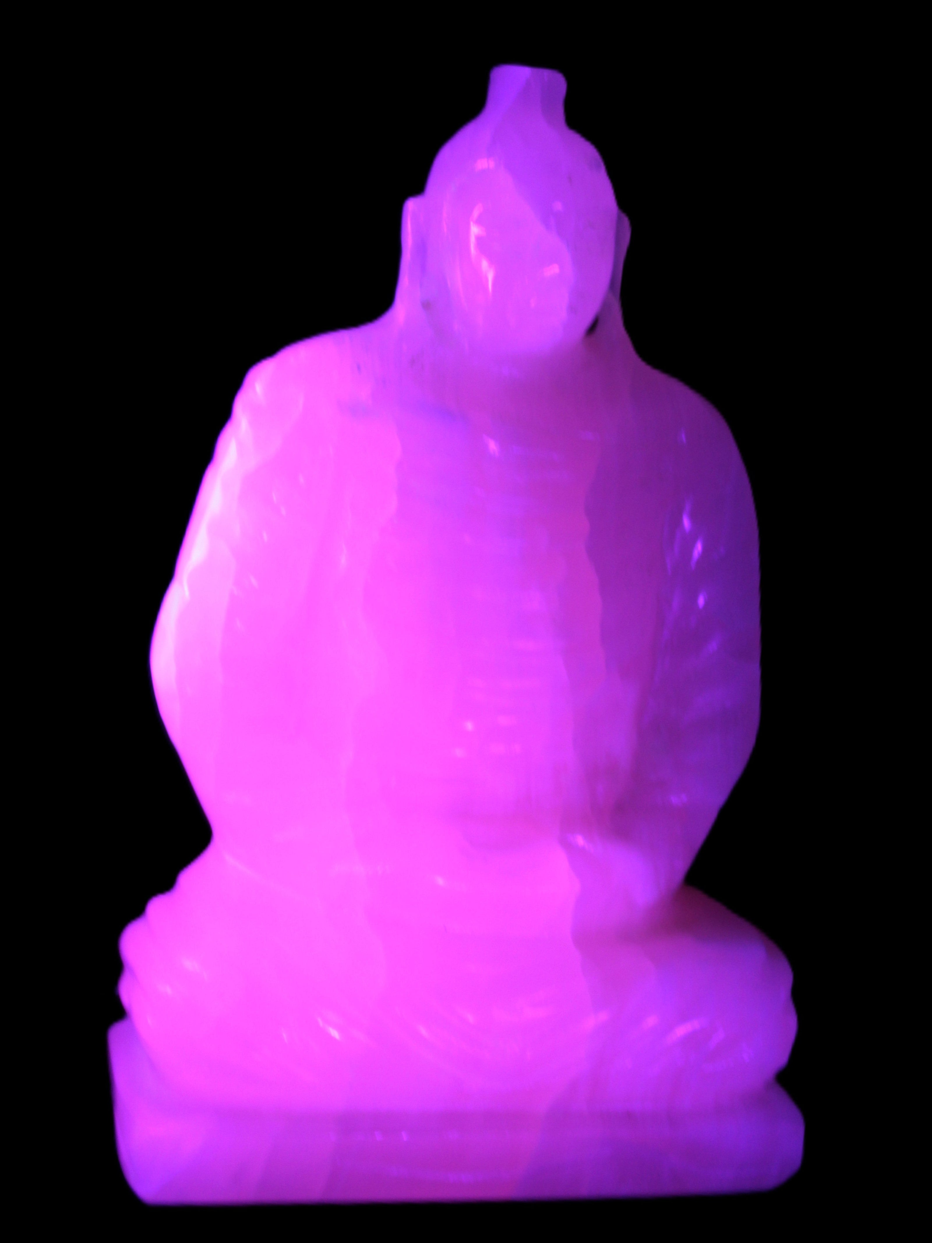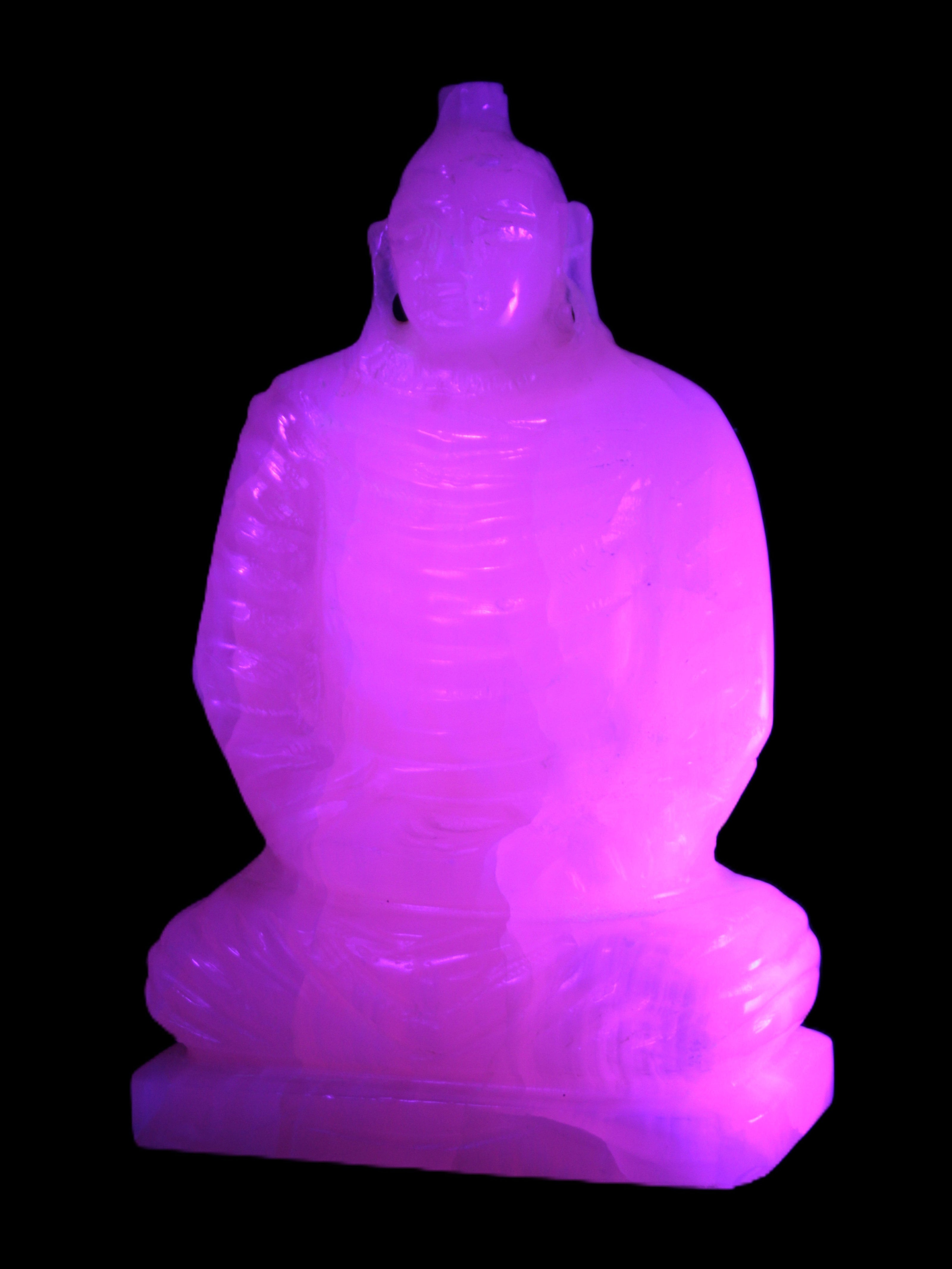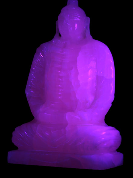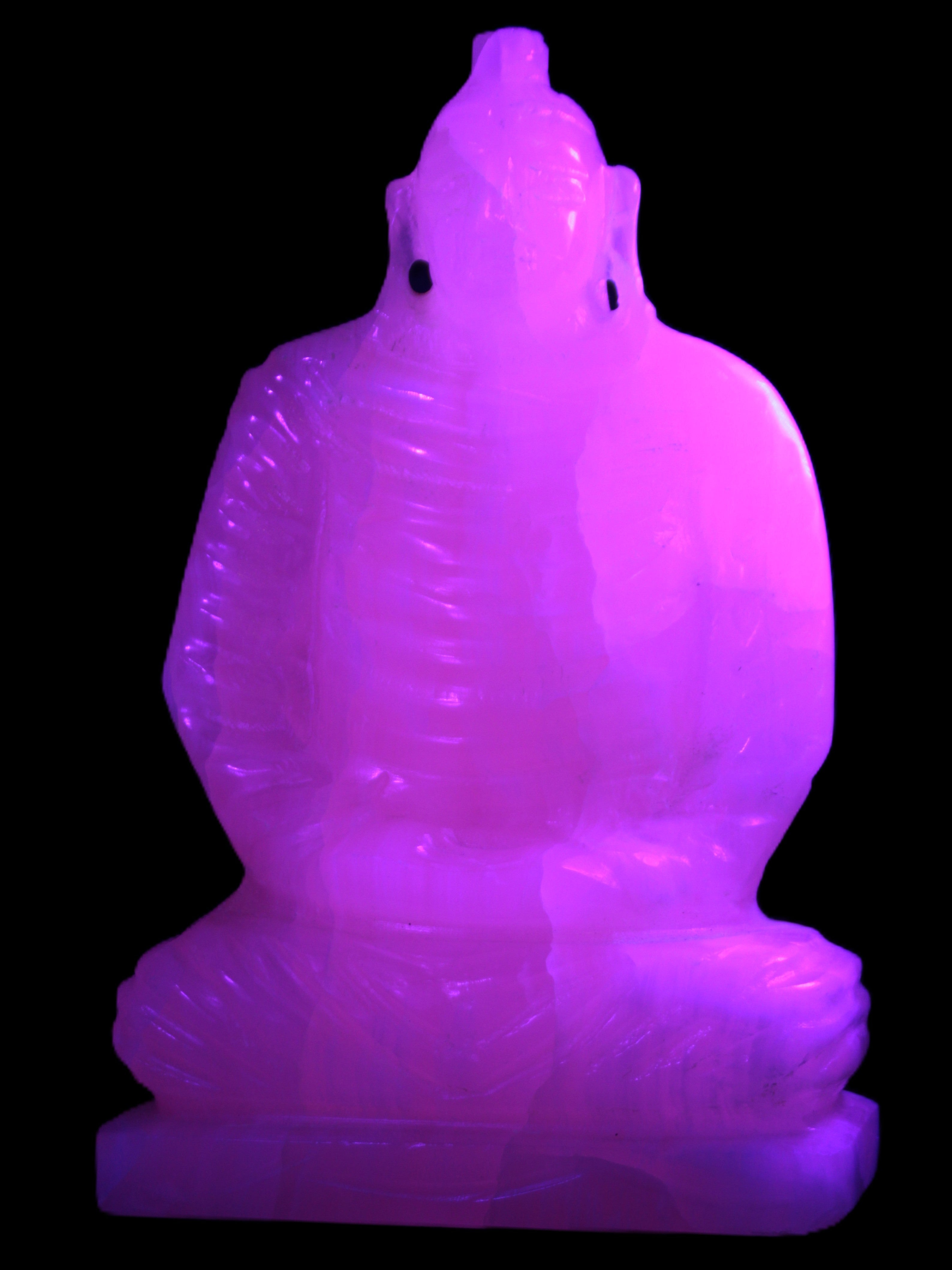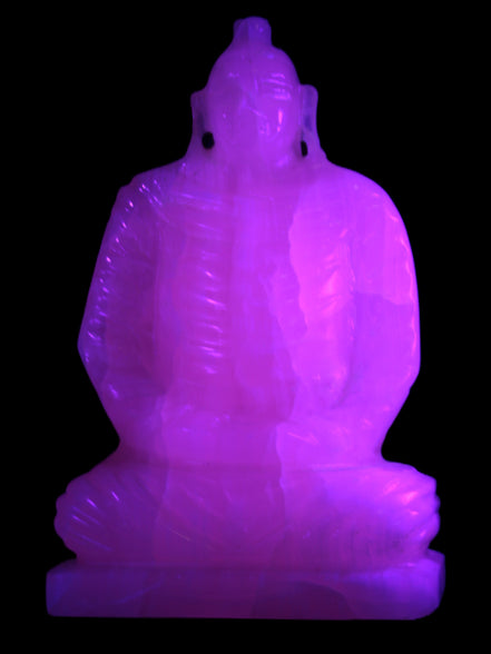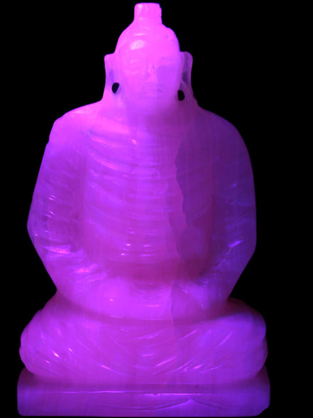 This Mangano Calcite hand-carved Buddha statue 52*79*241mm weighs 3285g. It was artfully crafted by Lawrence Riaz, from local stone he sourced in Pakistan. This statue stands 241mm tall and the base is 79mm wide and 52mm deep. This large statement piece glows hot pink in UV light.