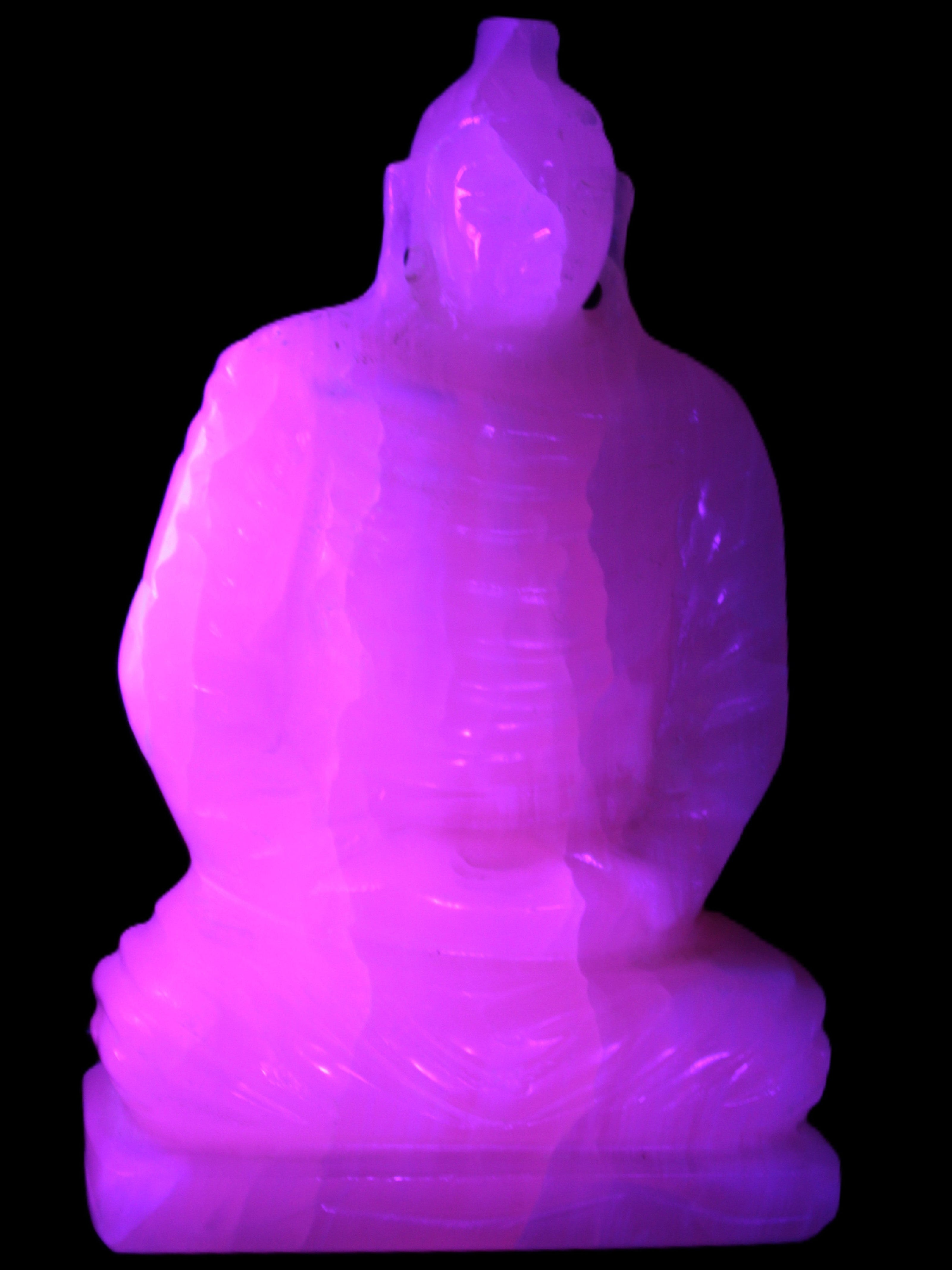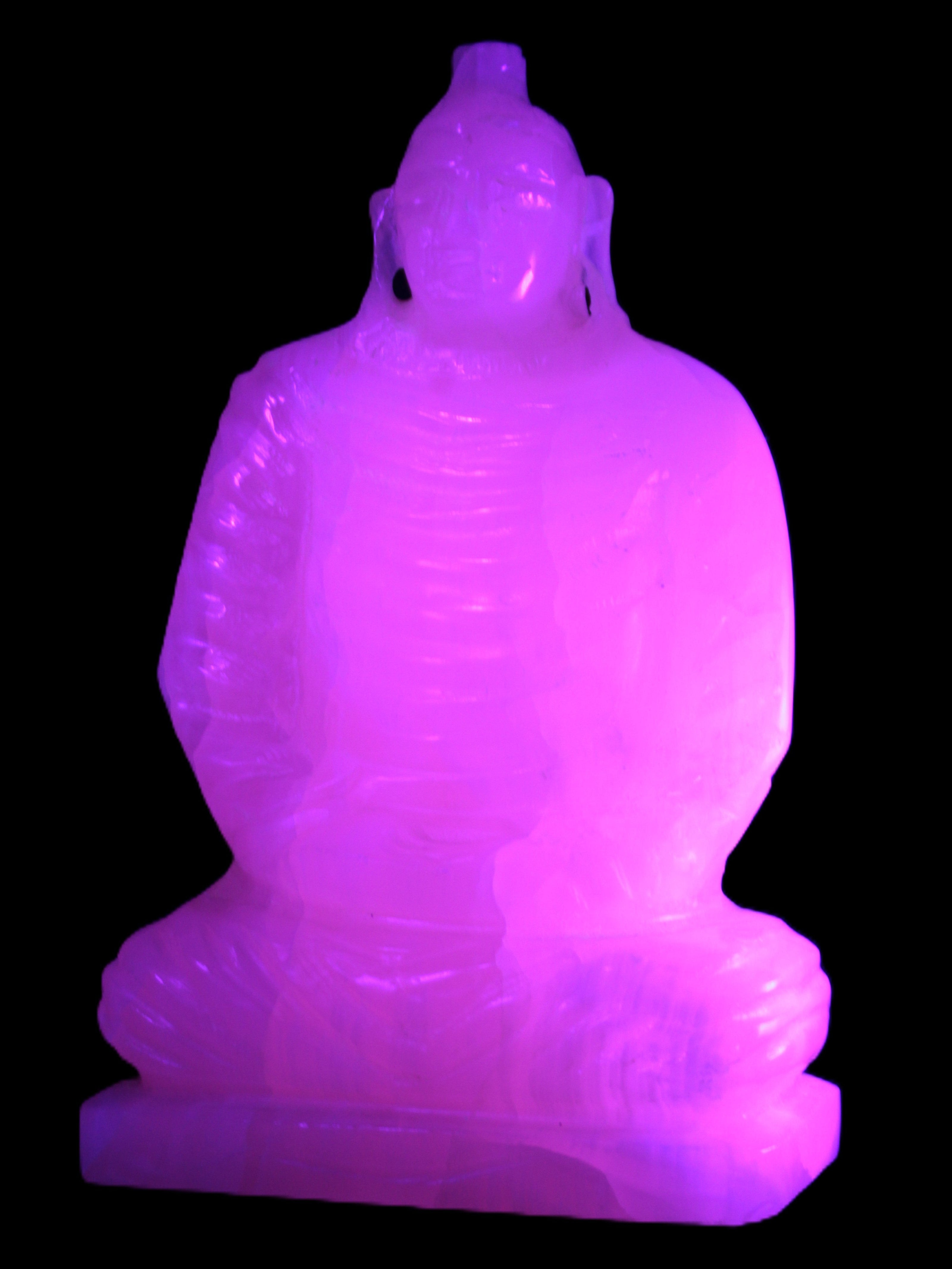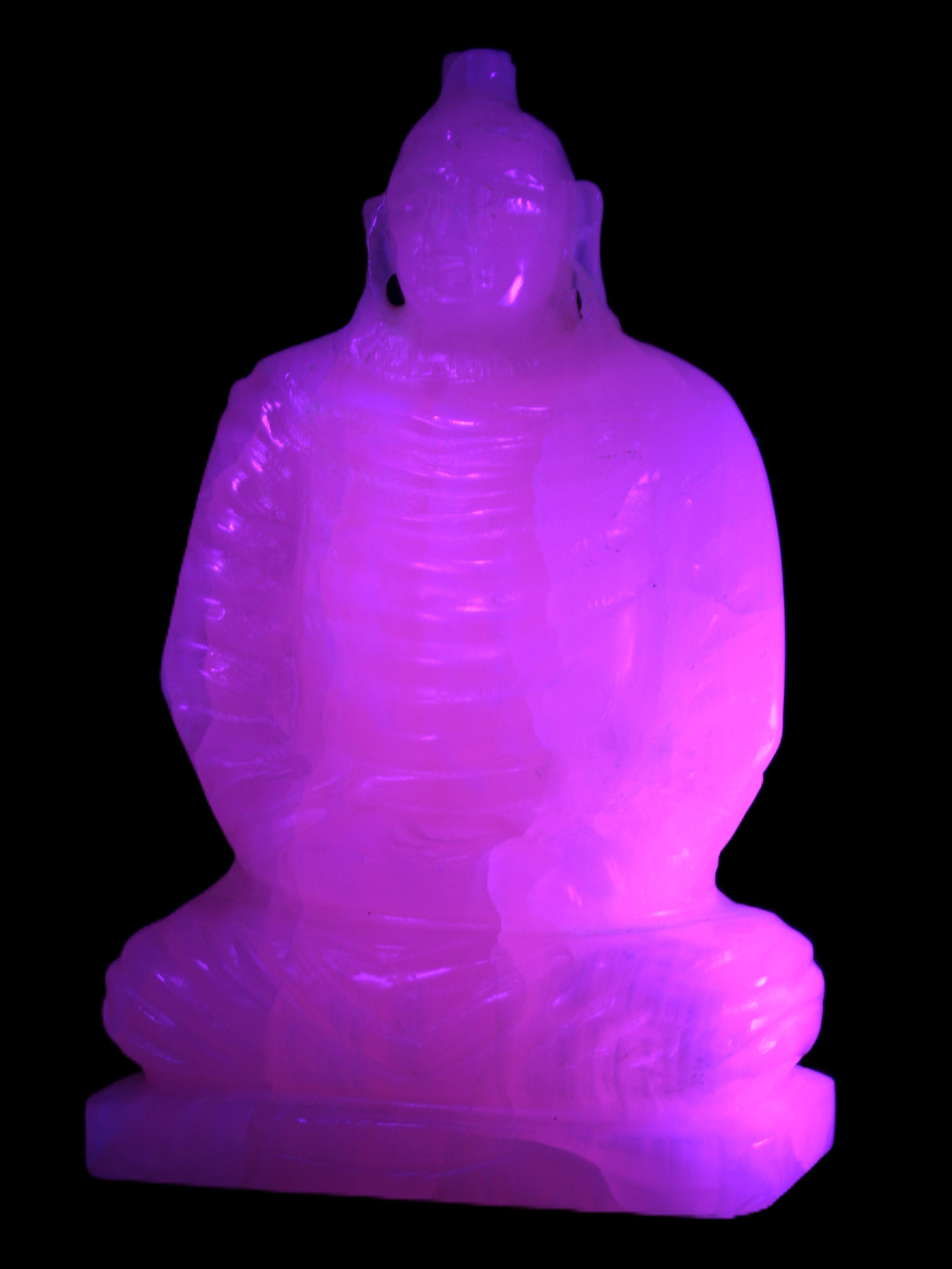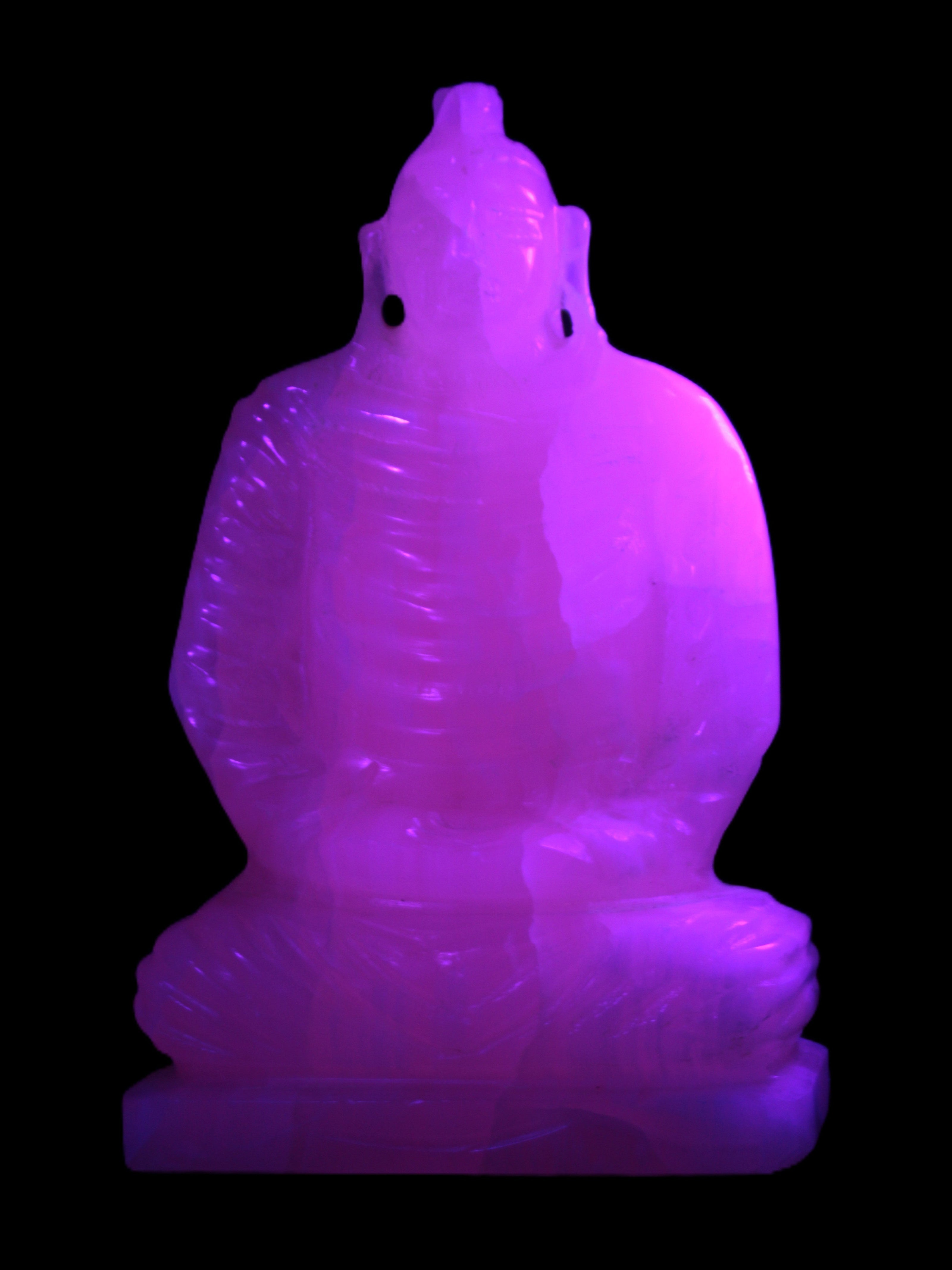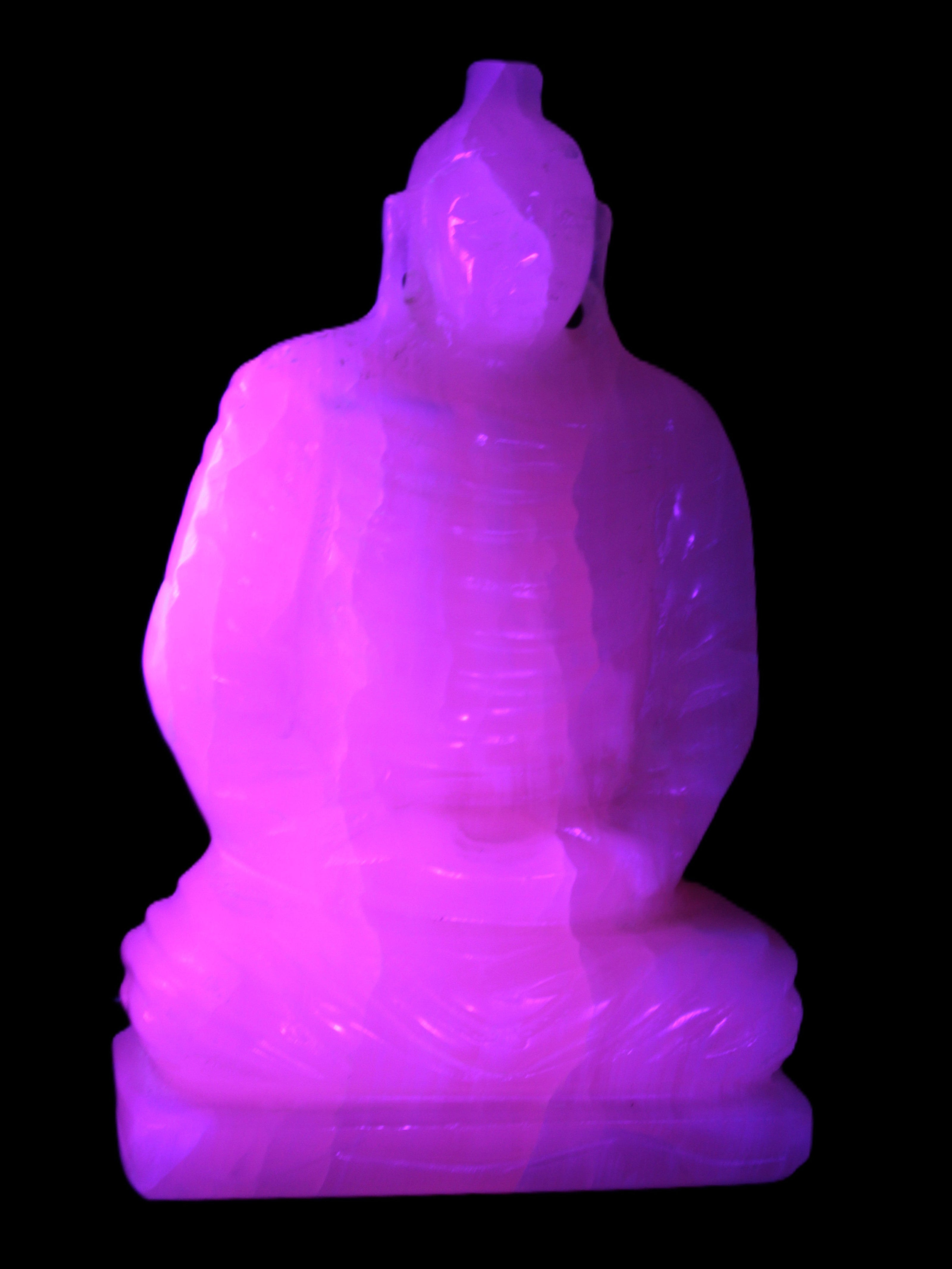 This Mangano Calcite hand-carved Buddha statue 52*79*241mm weighs 3285g. It was artfully crafted by Lawrence Riaz, from local stone he sourced in Pakistan. This statue stands 241mm tall and the base is 79mm wide and 52mm deep. This large statement piece glows hot pink in UV light.