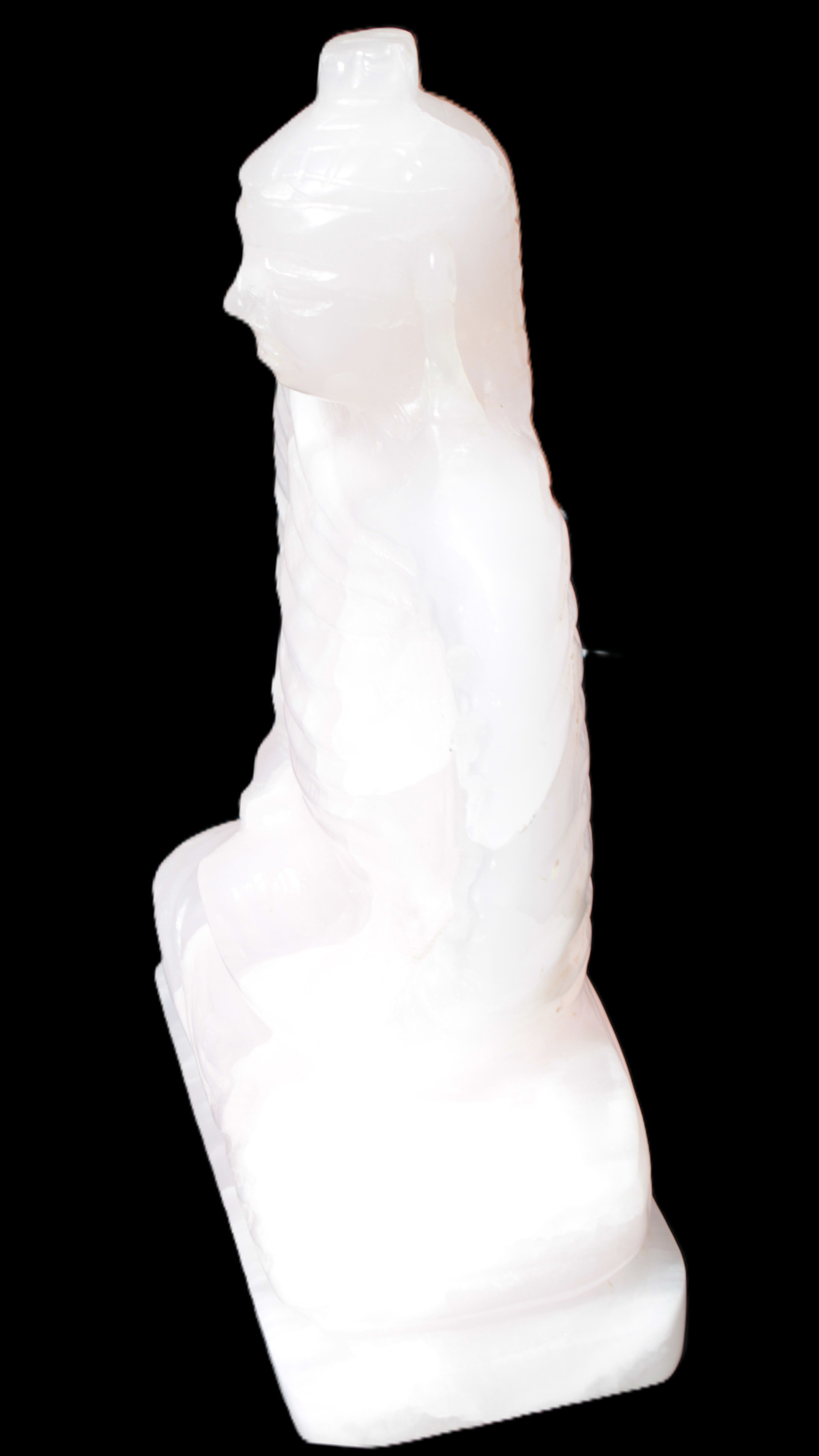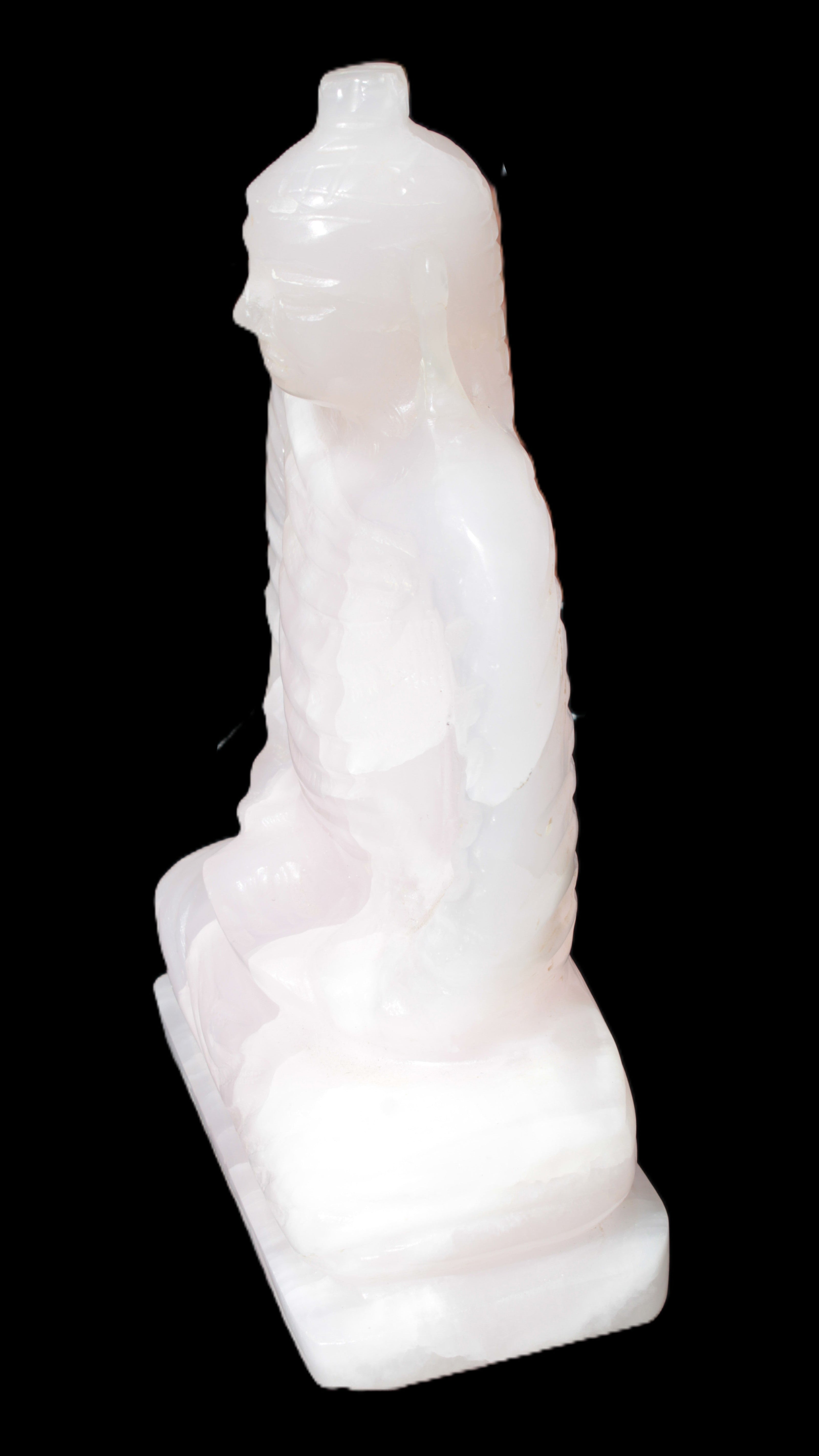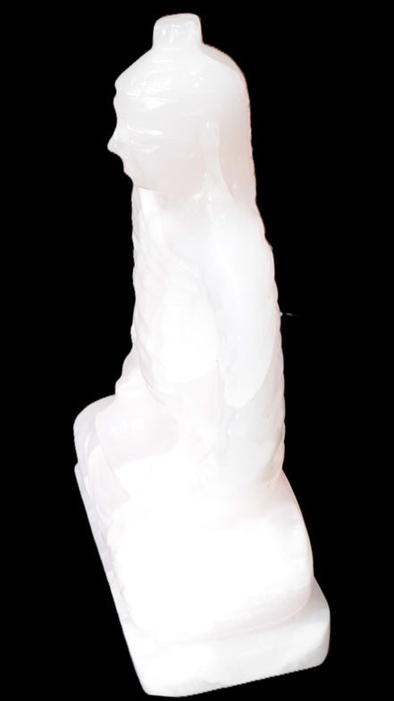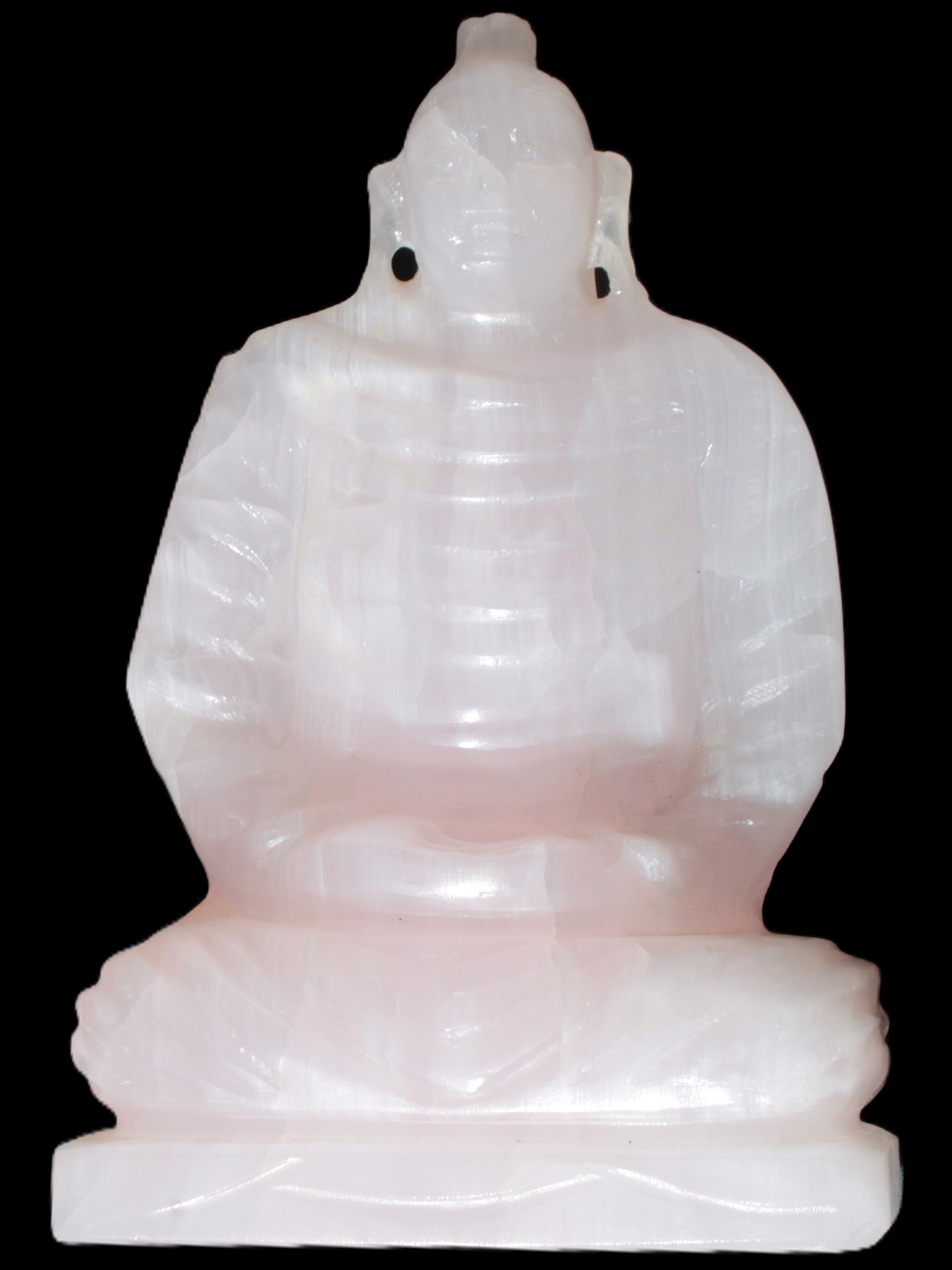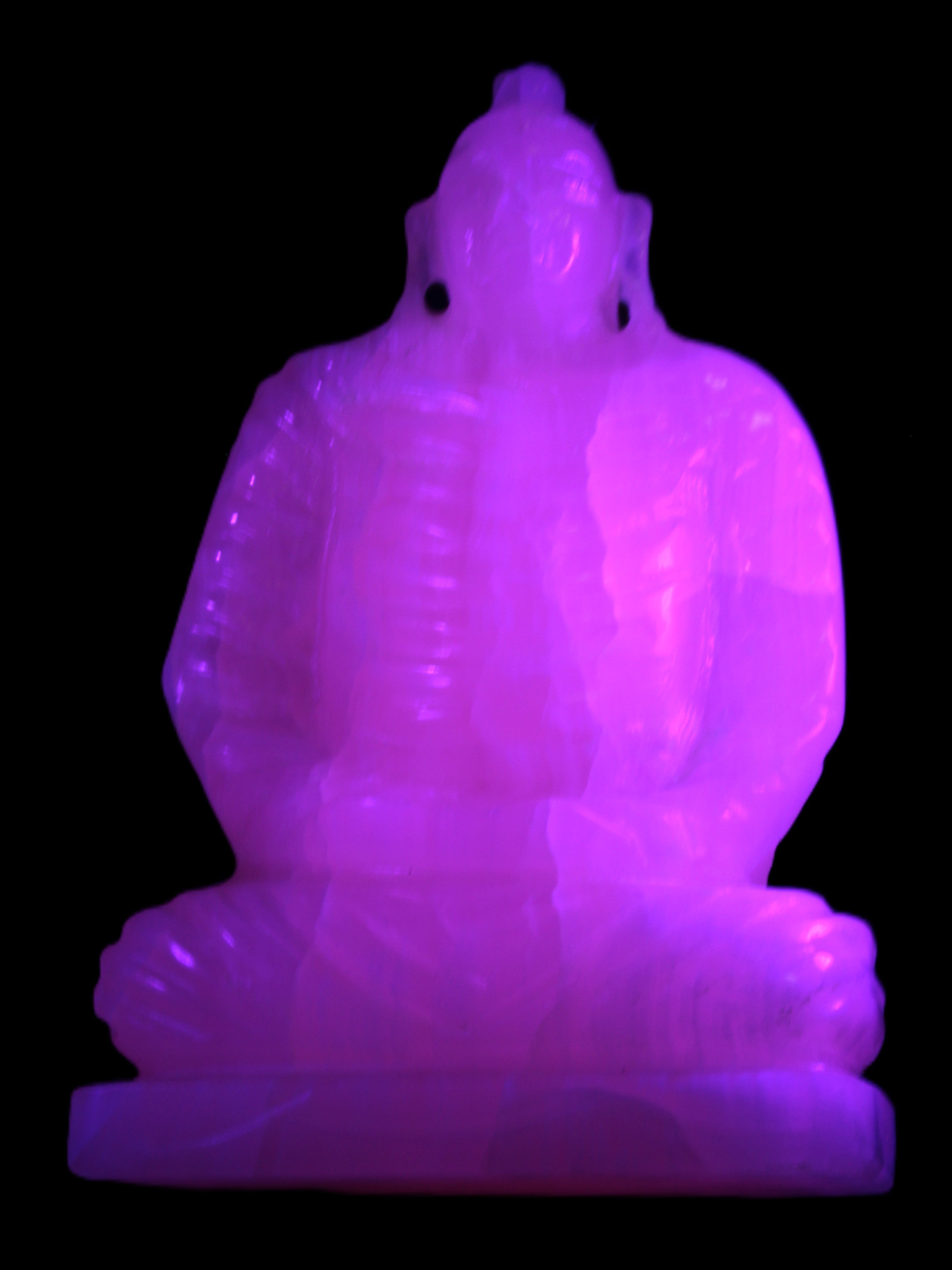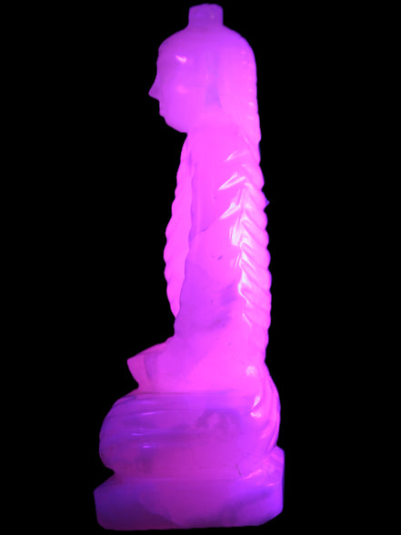 This Mangano Calcite hand-carved Buddha statue 52*79*241mm weighs 3285g. It was artfully crafted by Lawrence Riaz, from local stone he sourced in Pakistan. This statue stands 241mm tall and the base is 79mm wide and 52mm deep. This large statement piece glows hot pink in UV light.