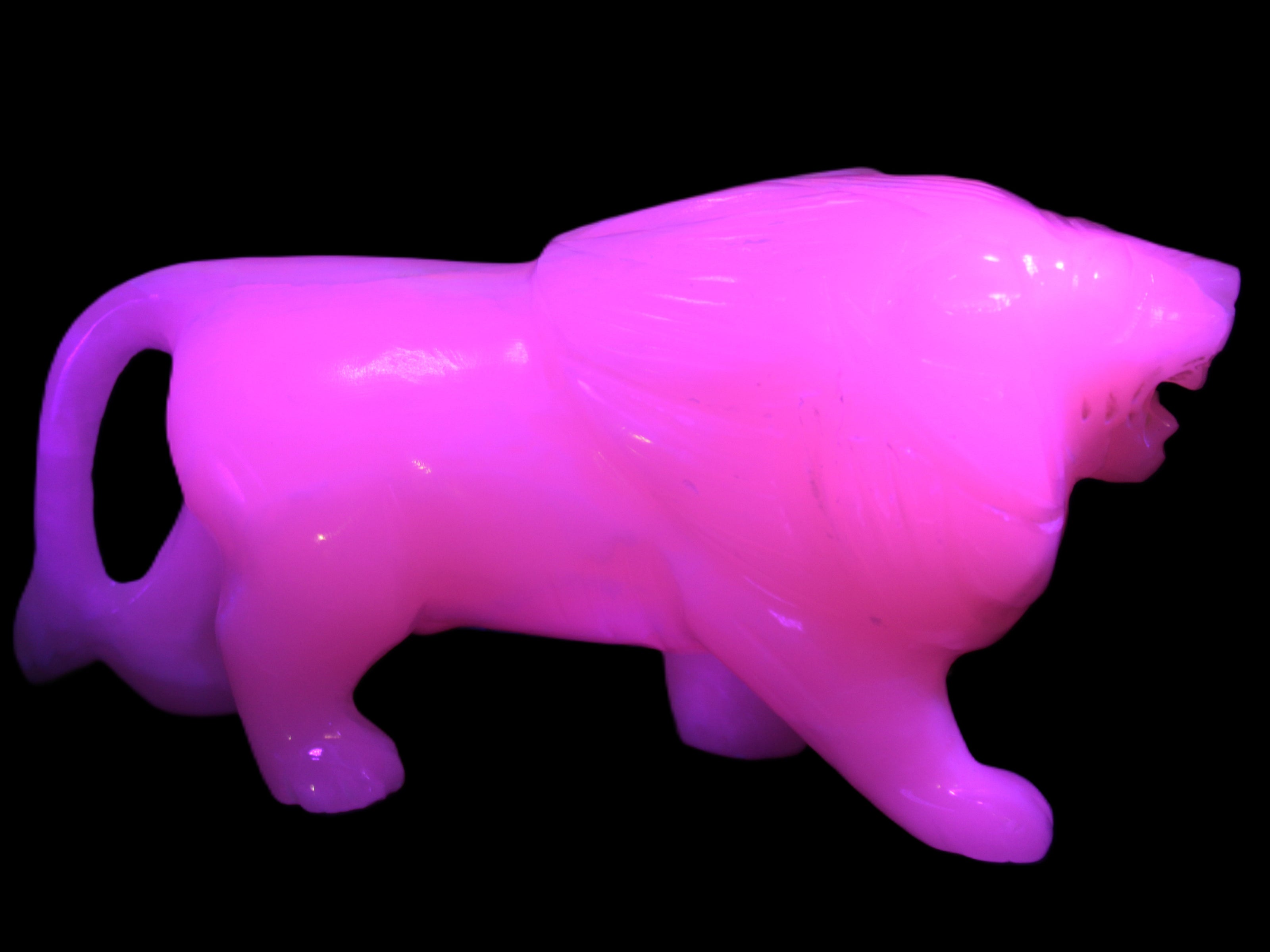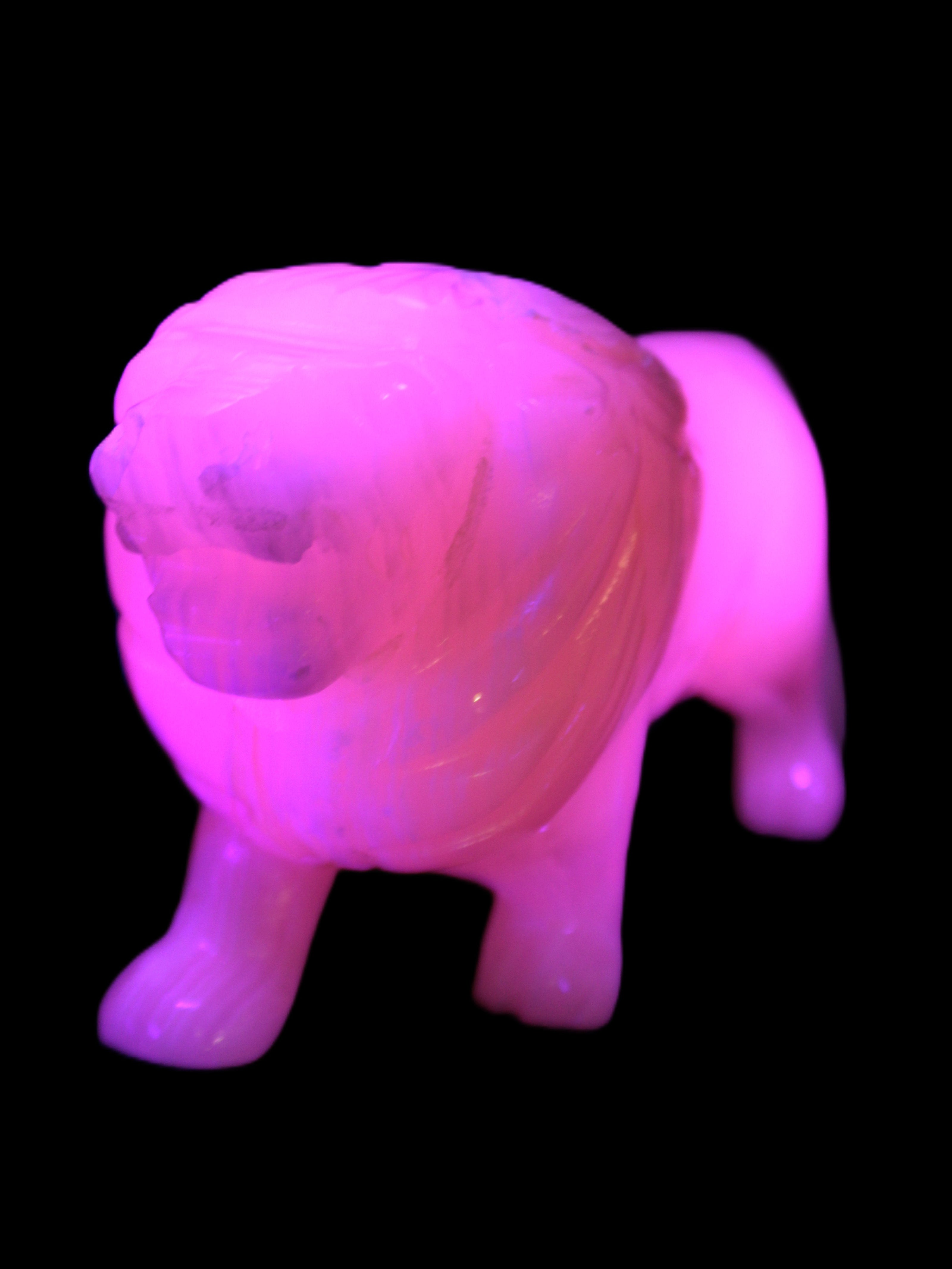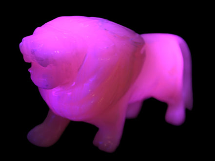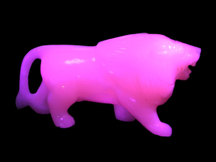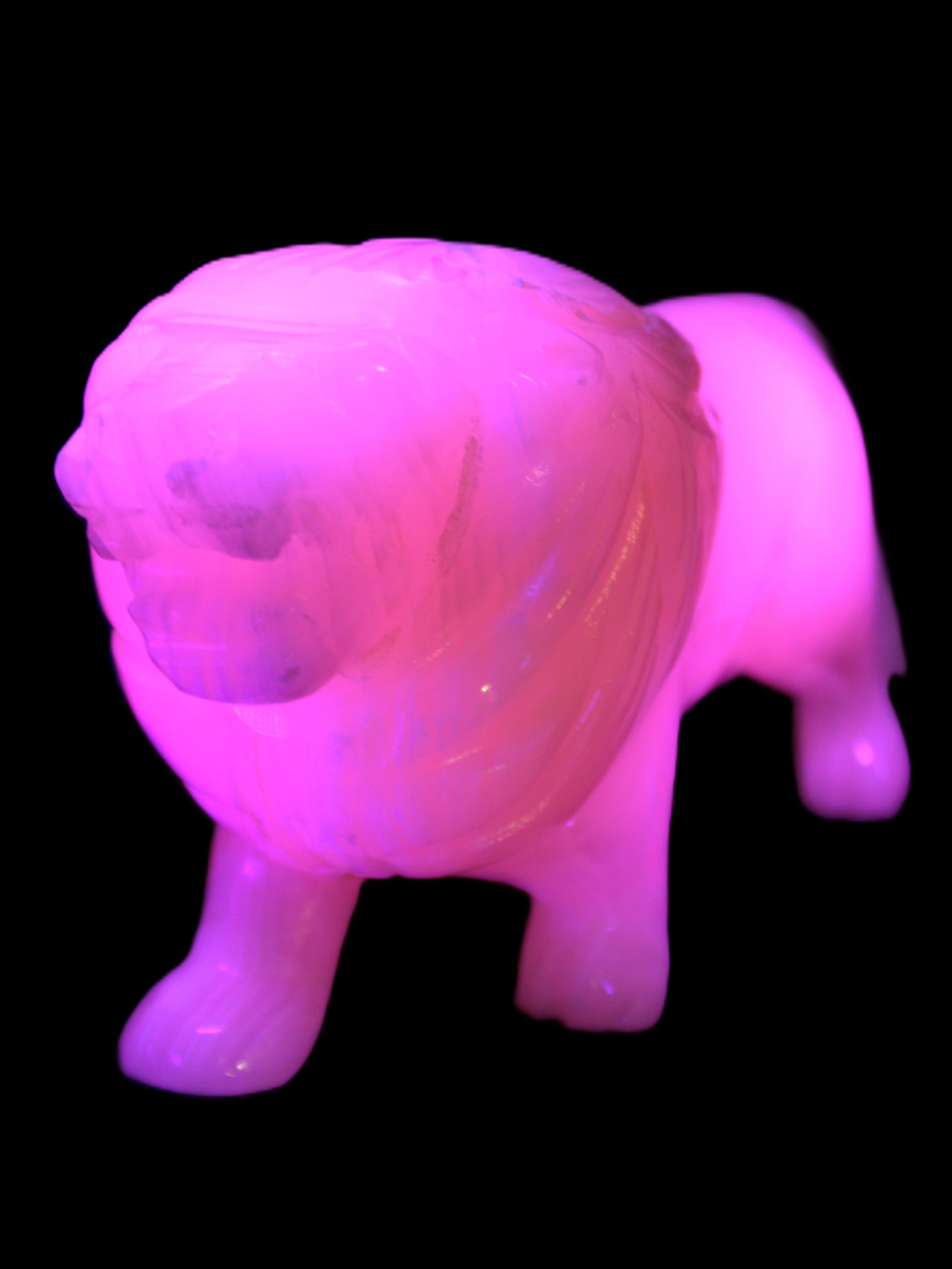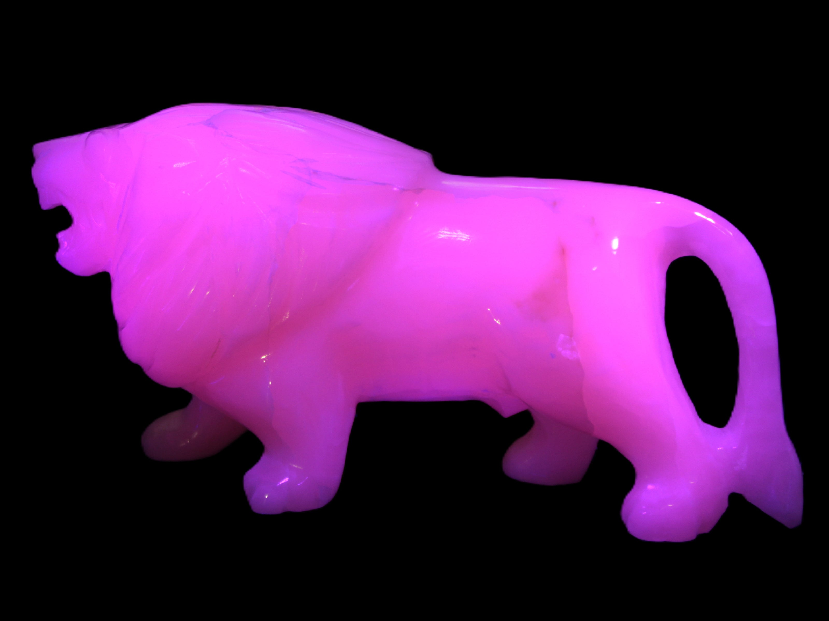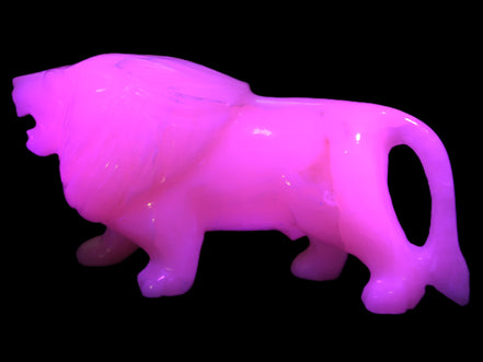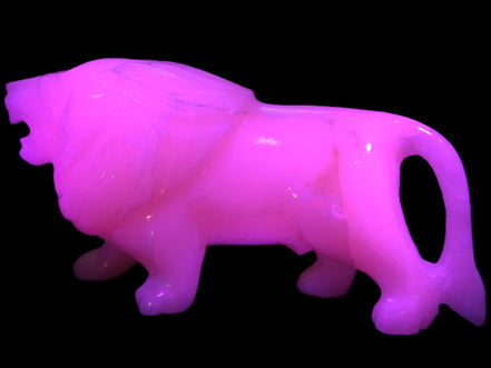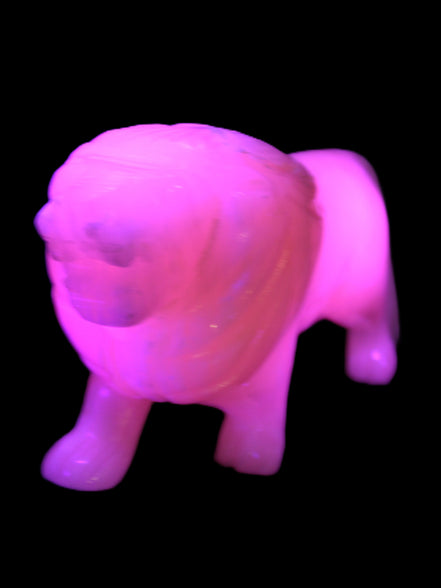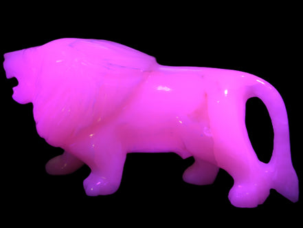 This proud Mangano Calcite hand-carved lion was artfully crafted by Lawrence Riaz., from local stone he sourced in Pakistan. It weighs 1189. He stands 90mm tall at his shoulders and is 60 mm broad there. He is 185 mm long. This is a large statement piece that glows hot pink in UV light.