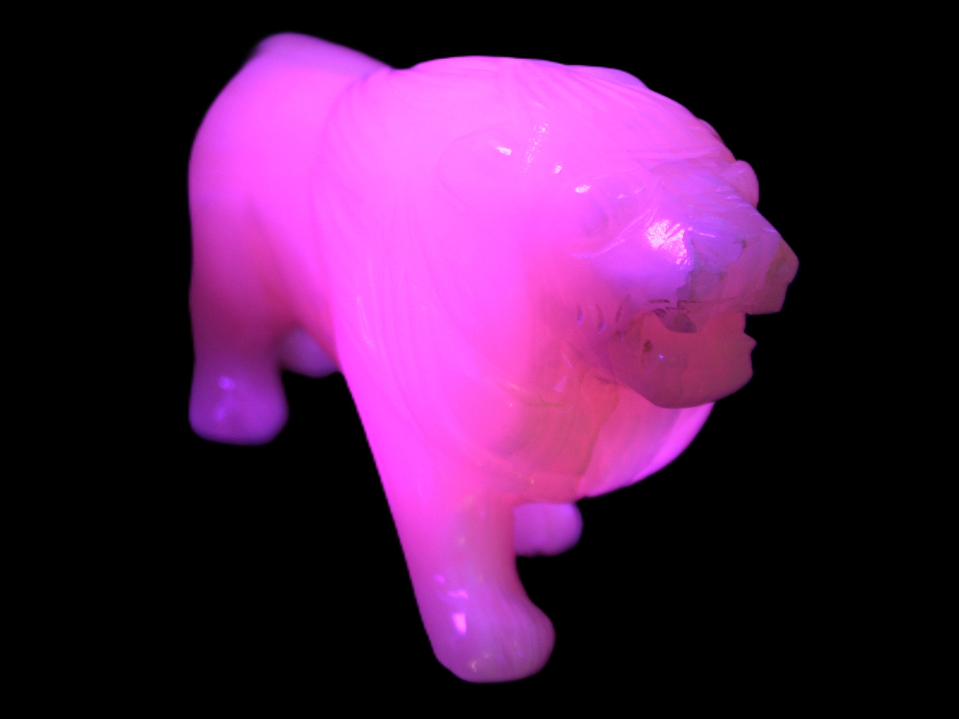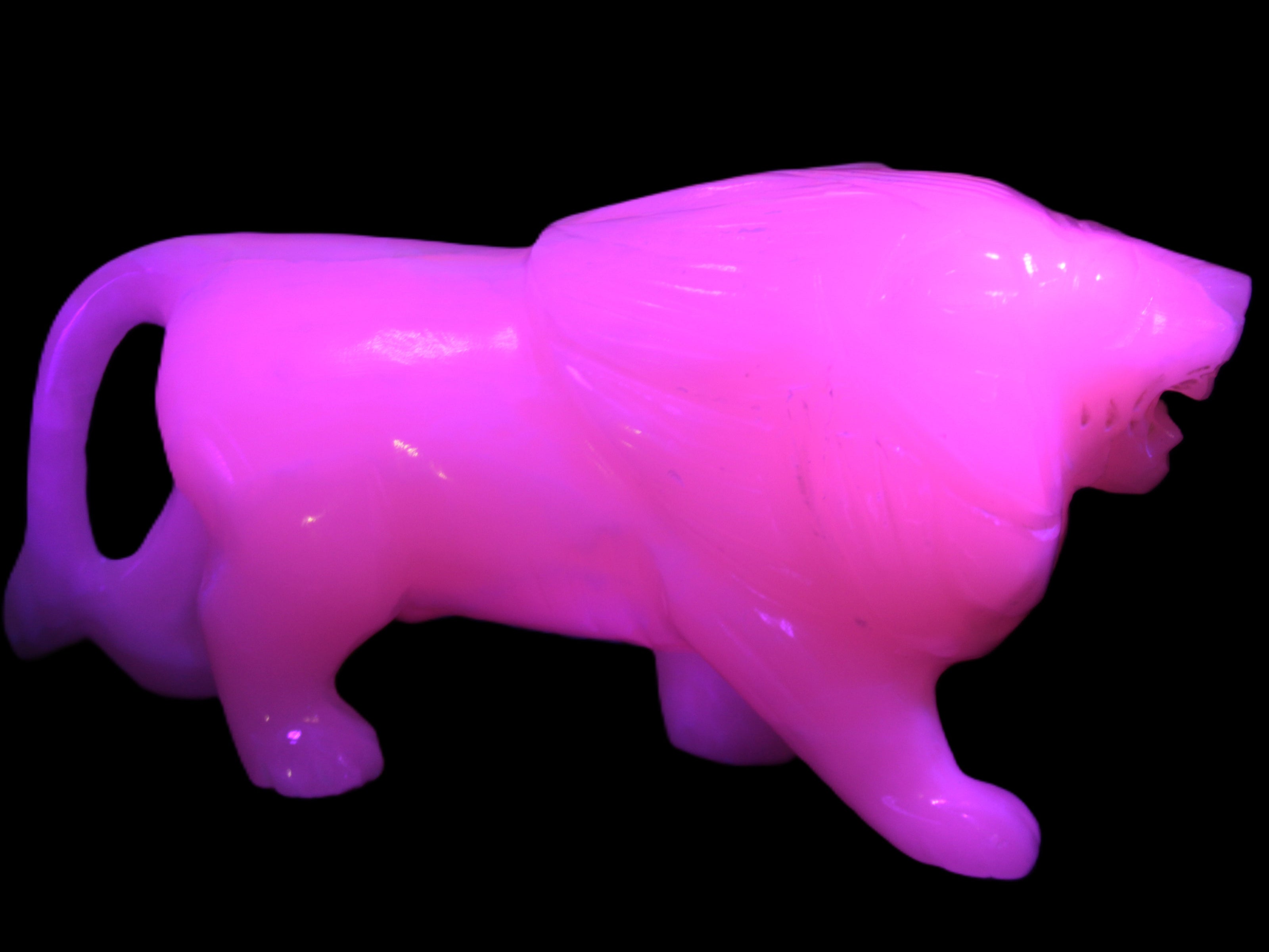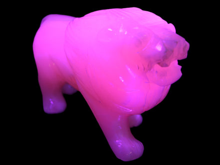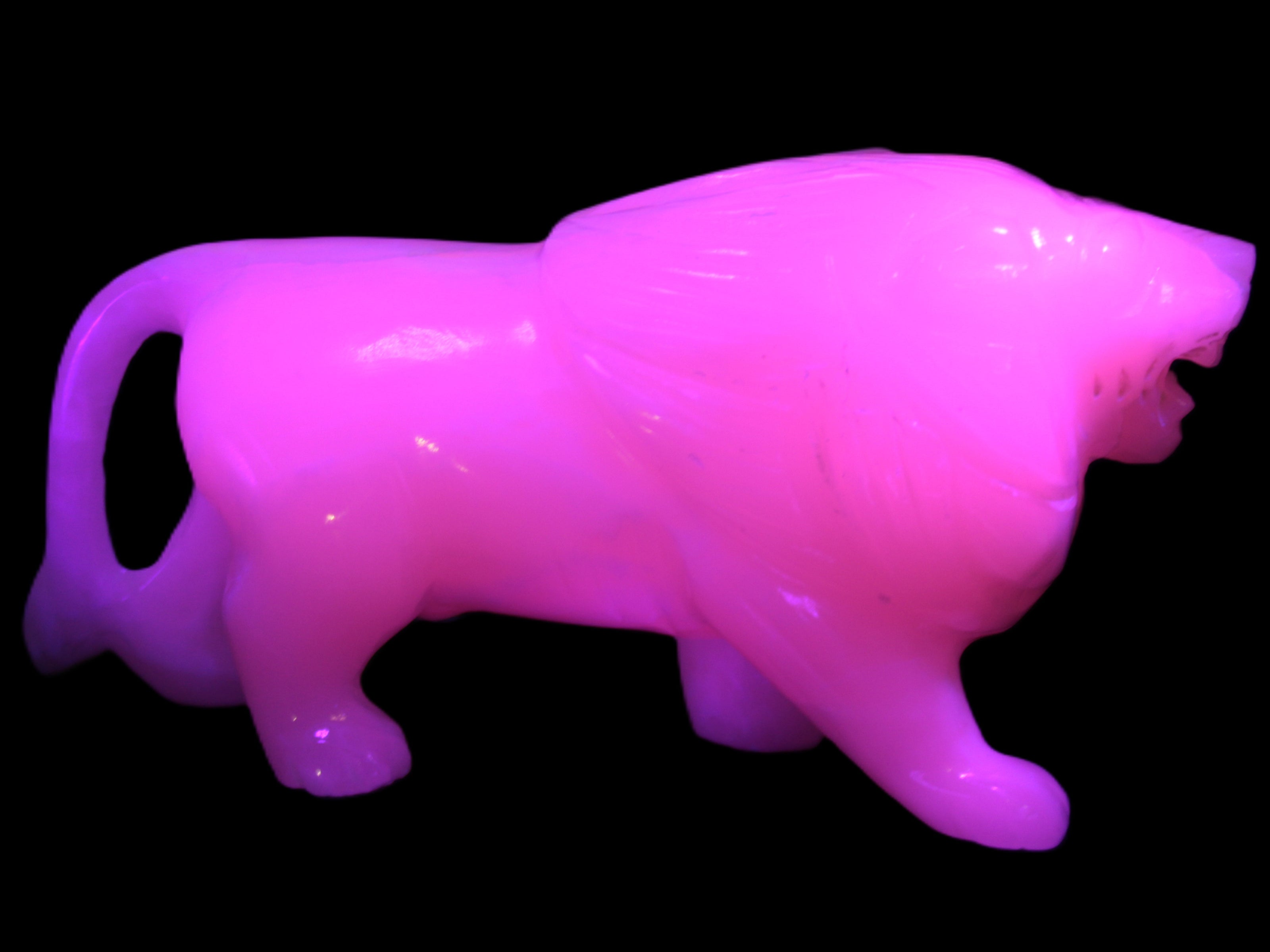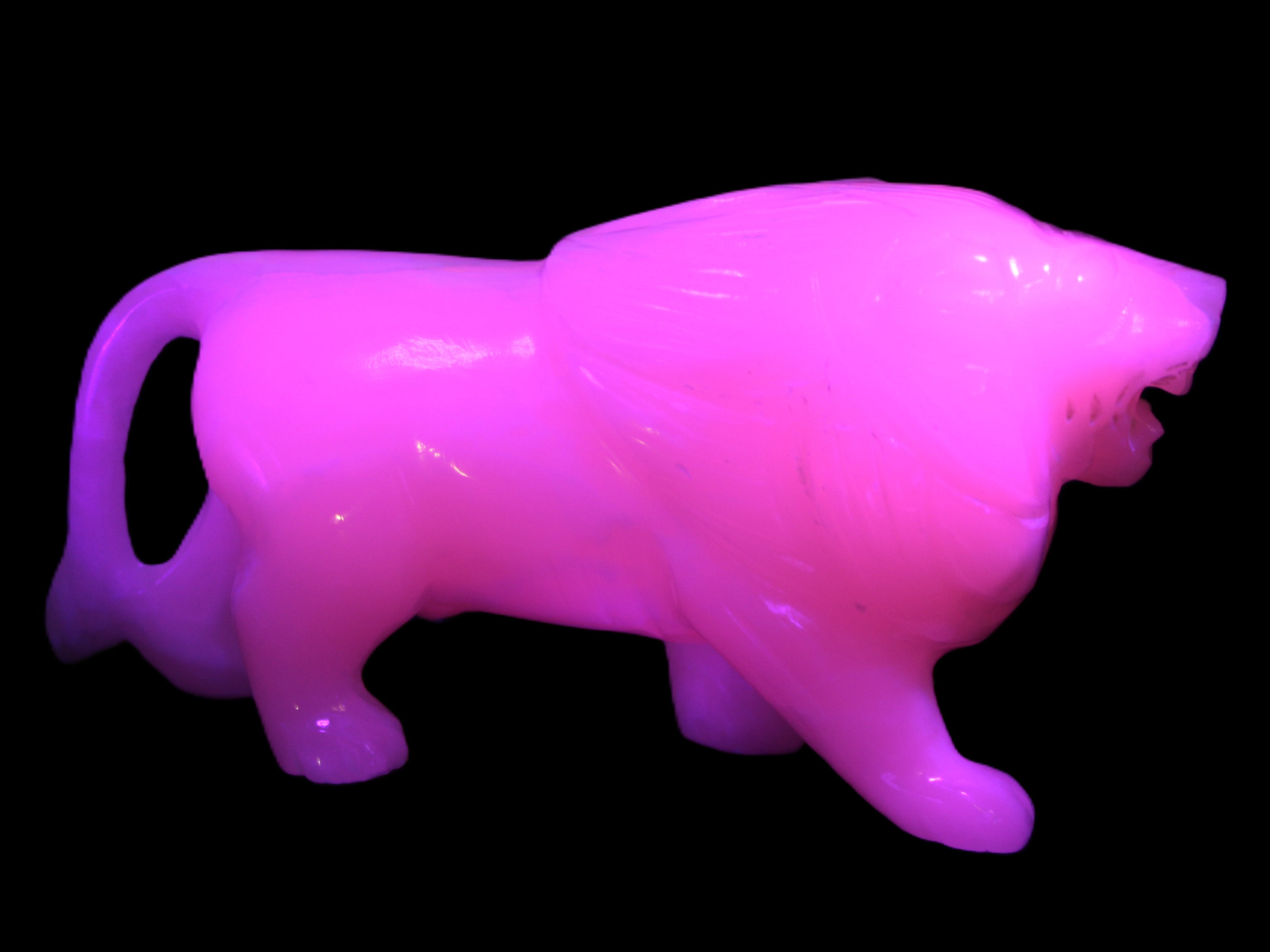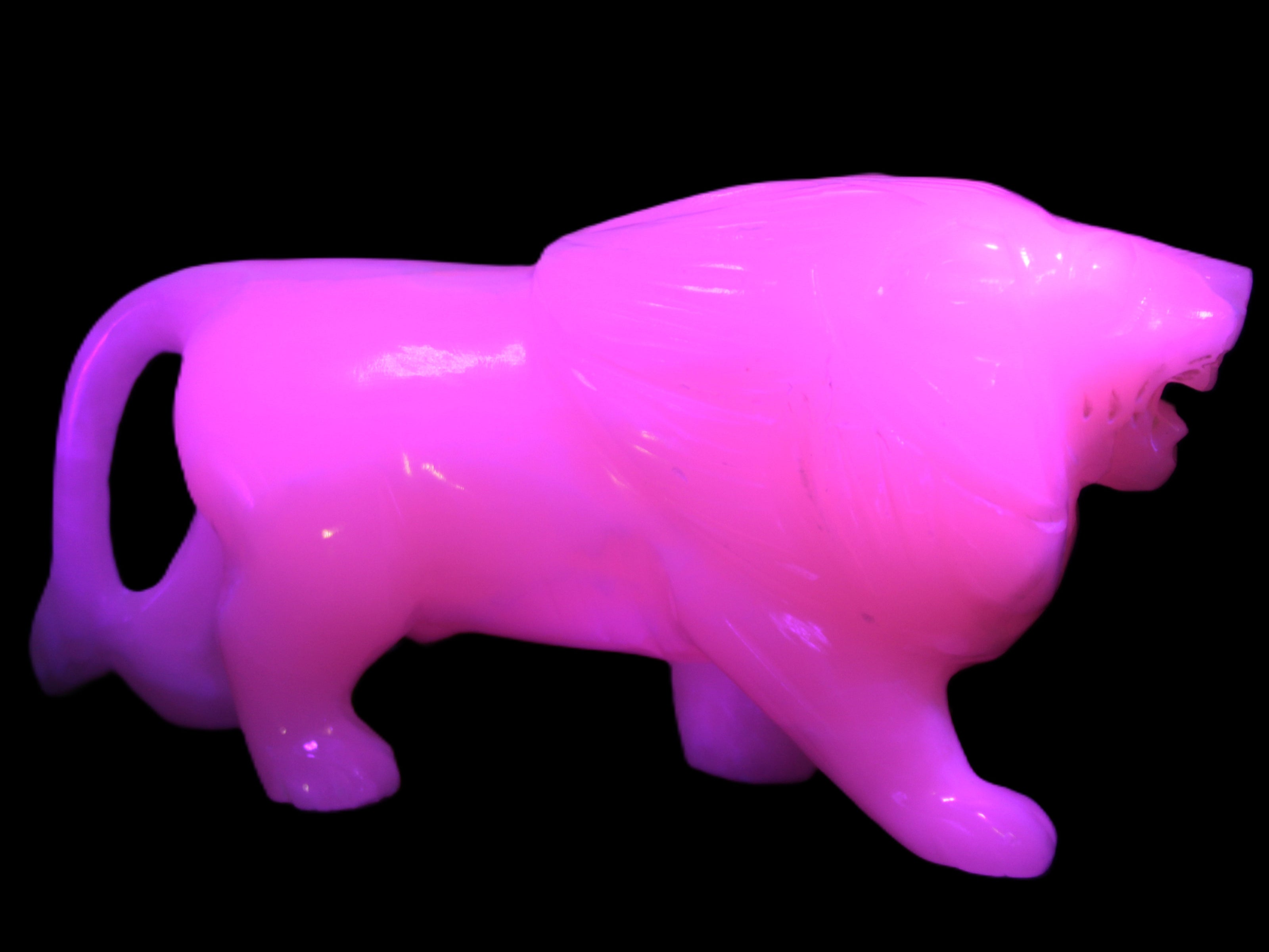 This proud Mangano Calcite hand-carved lion was artfully crafted by Lawrence Riaz., from local stone he sourced in Pakistan. It weighs 1189. He stands 90mm tall at his shoulders and is 60 mm broad there. He is 185 mm long. This is a large statement piece that glows hot pink in UV light.