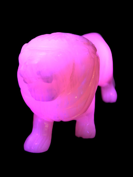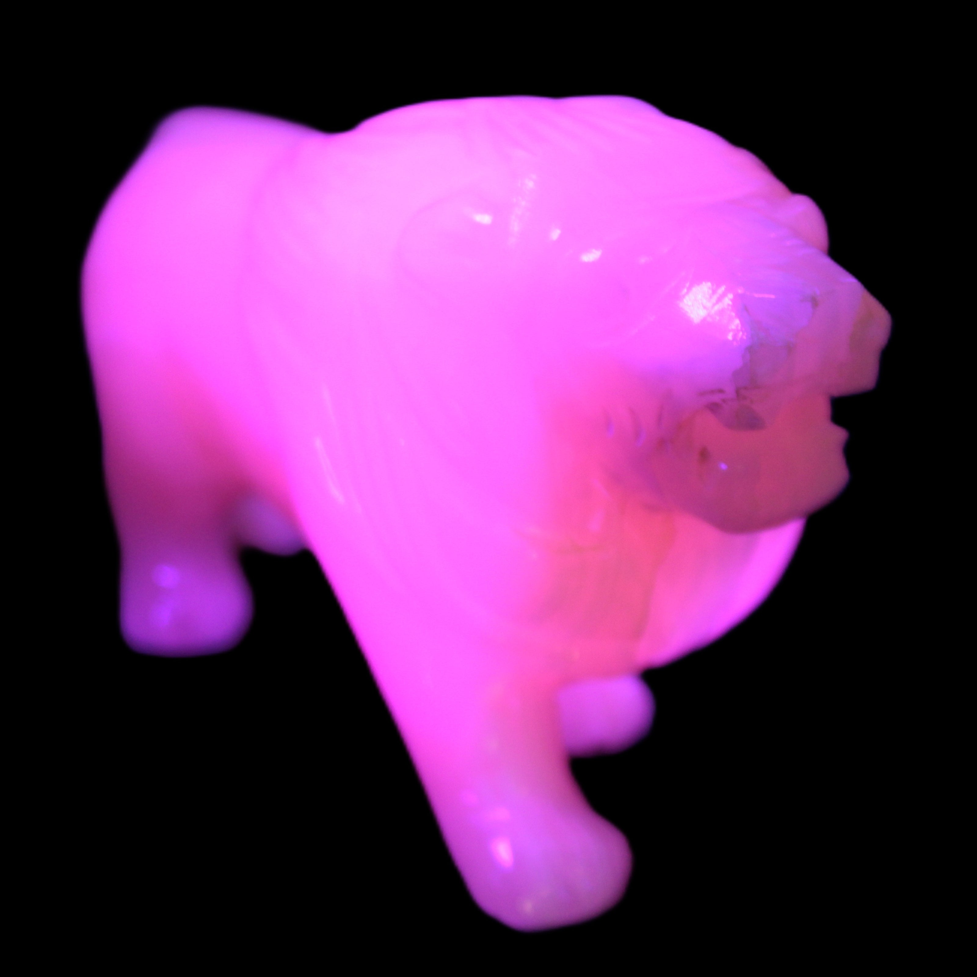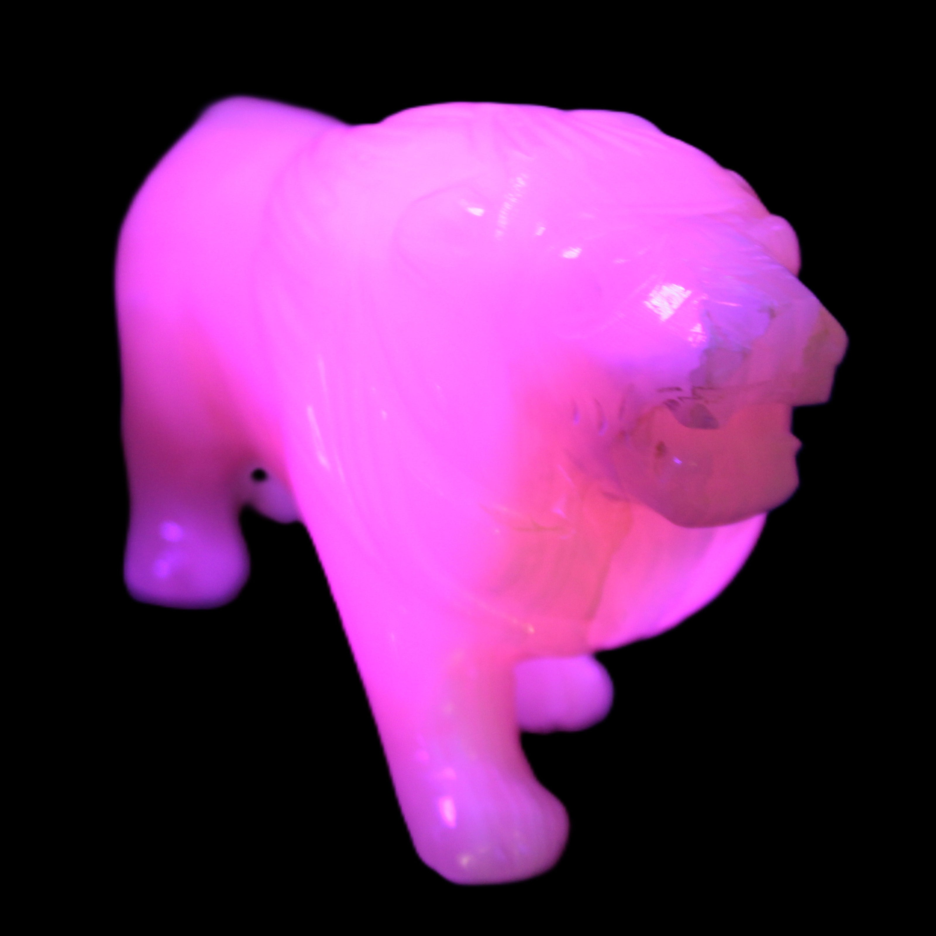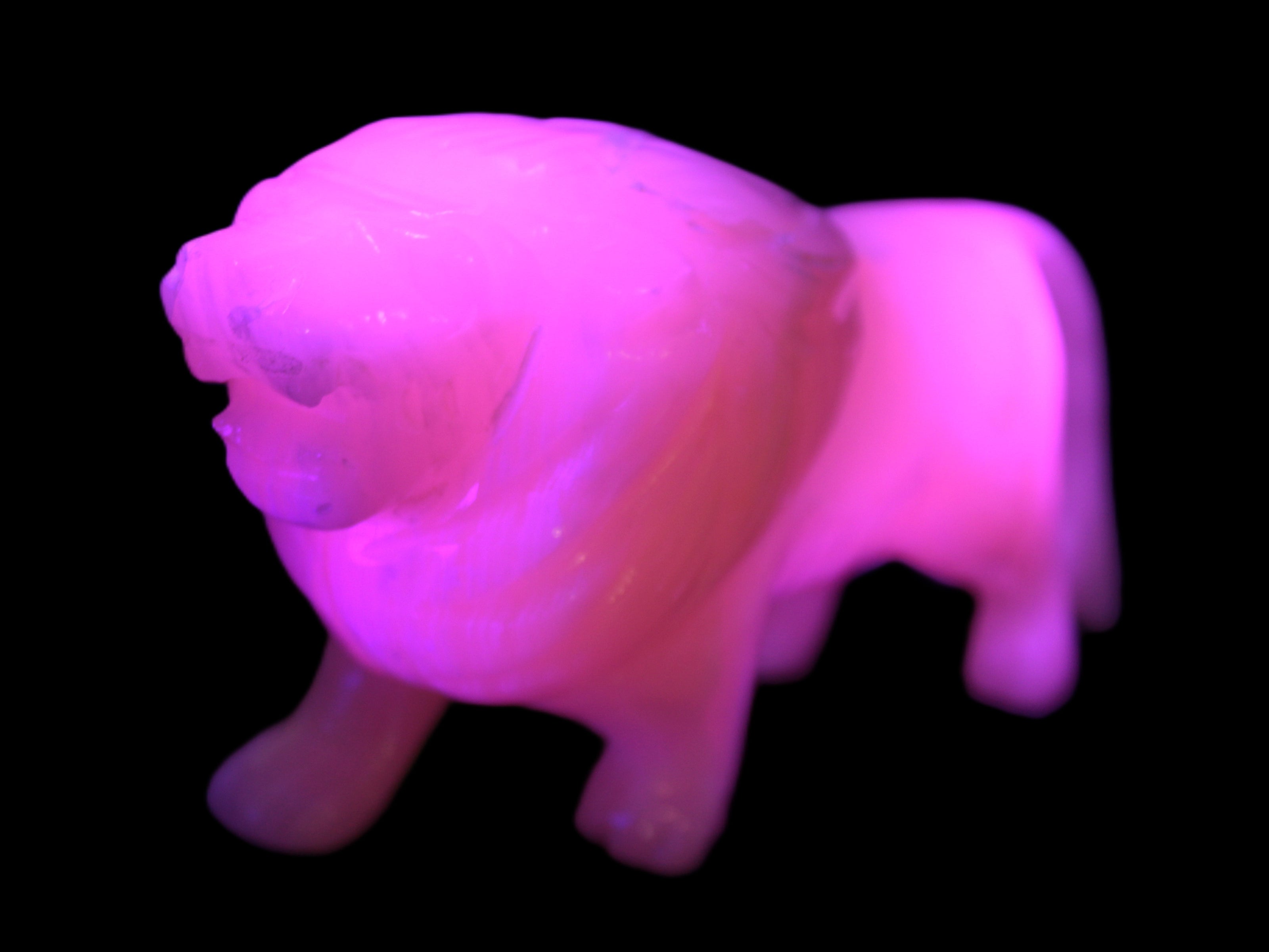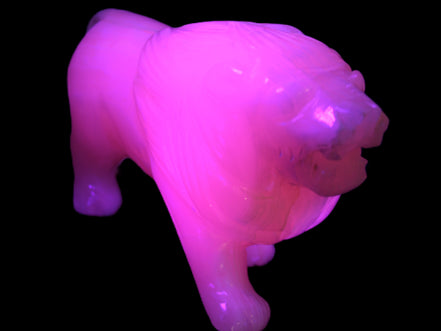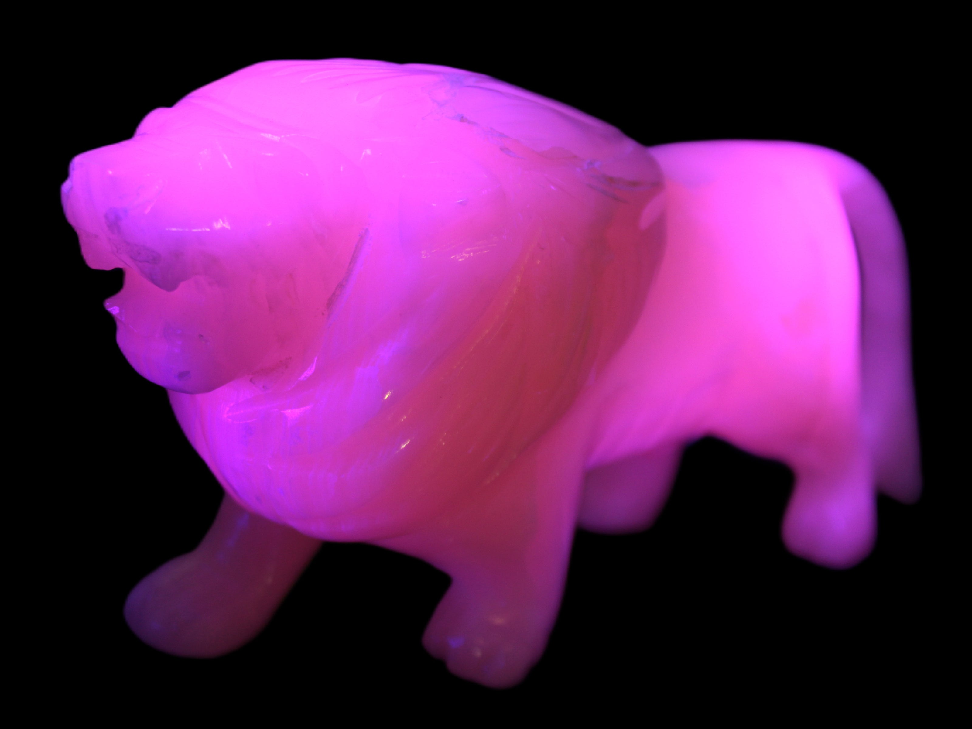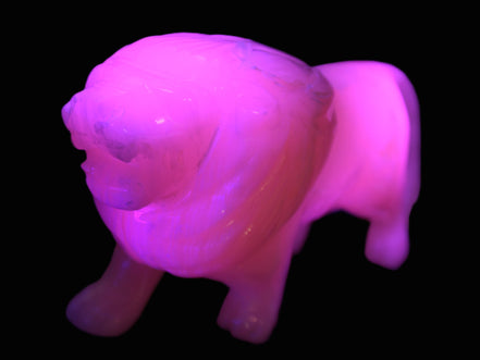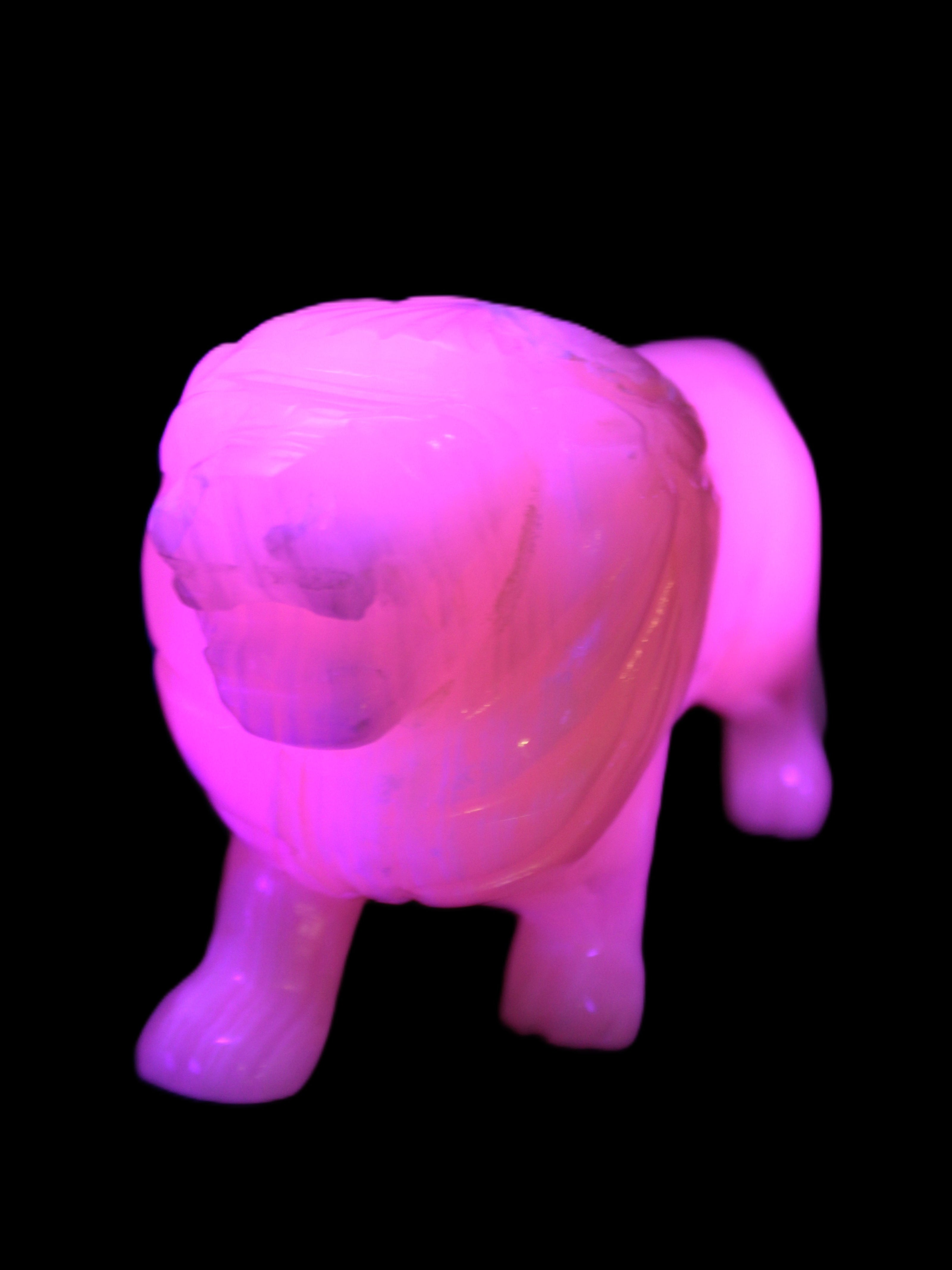 This proud Mangano Calcite hand-carved lion was artfully crafted by Lawrence Riaz., from local stone he sourced in Pakistan. It weighs 1189. He stands 90mm tall at his shoulders and is 60 mm broad there. He is 185 mm long. This is a large statement piece that glows hot pink in UV light.
