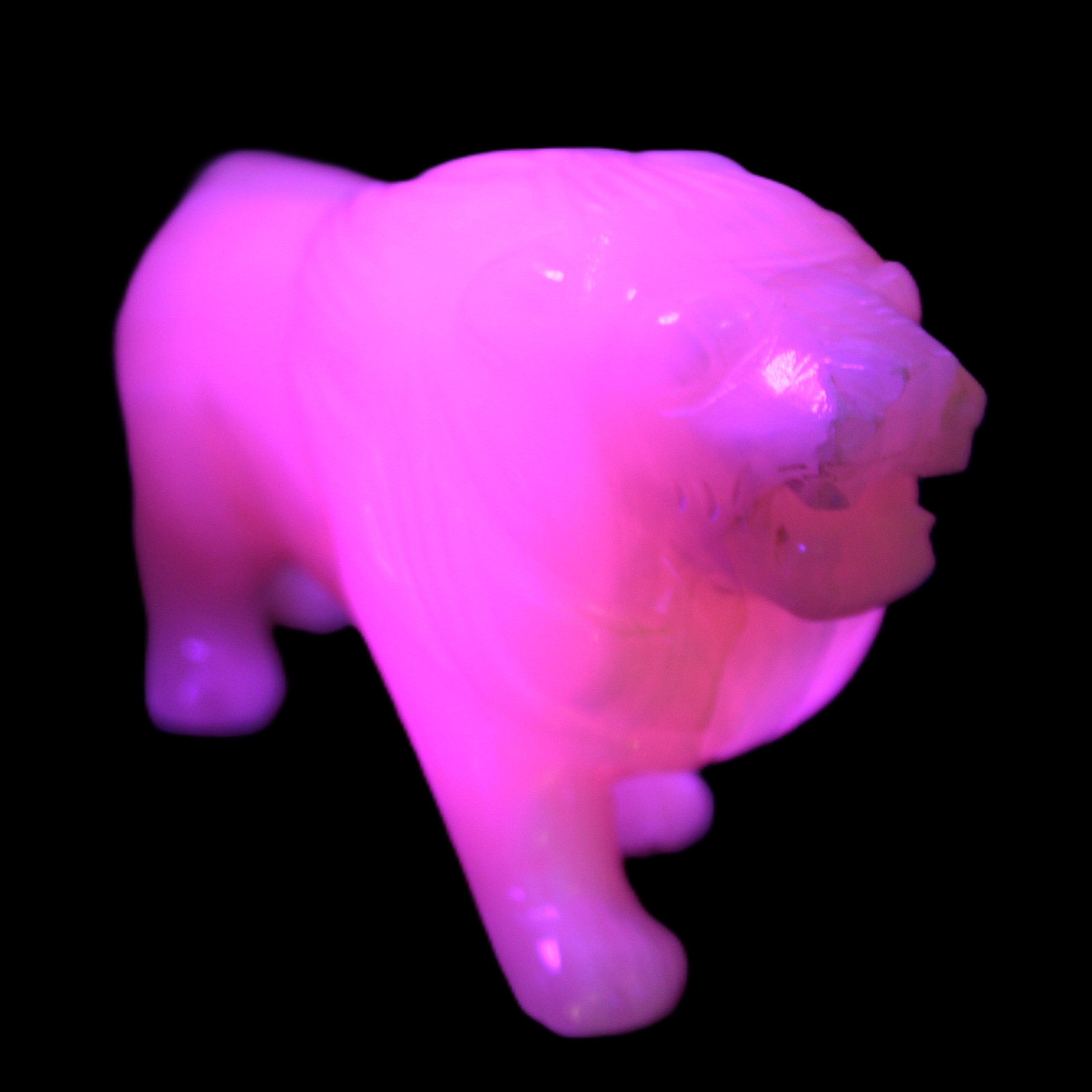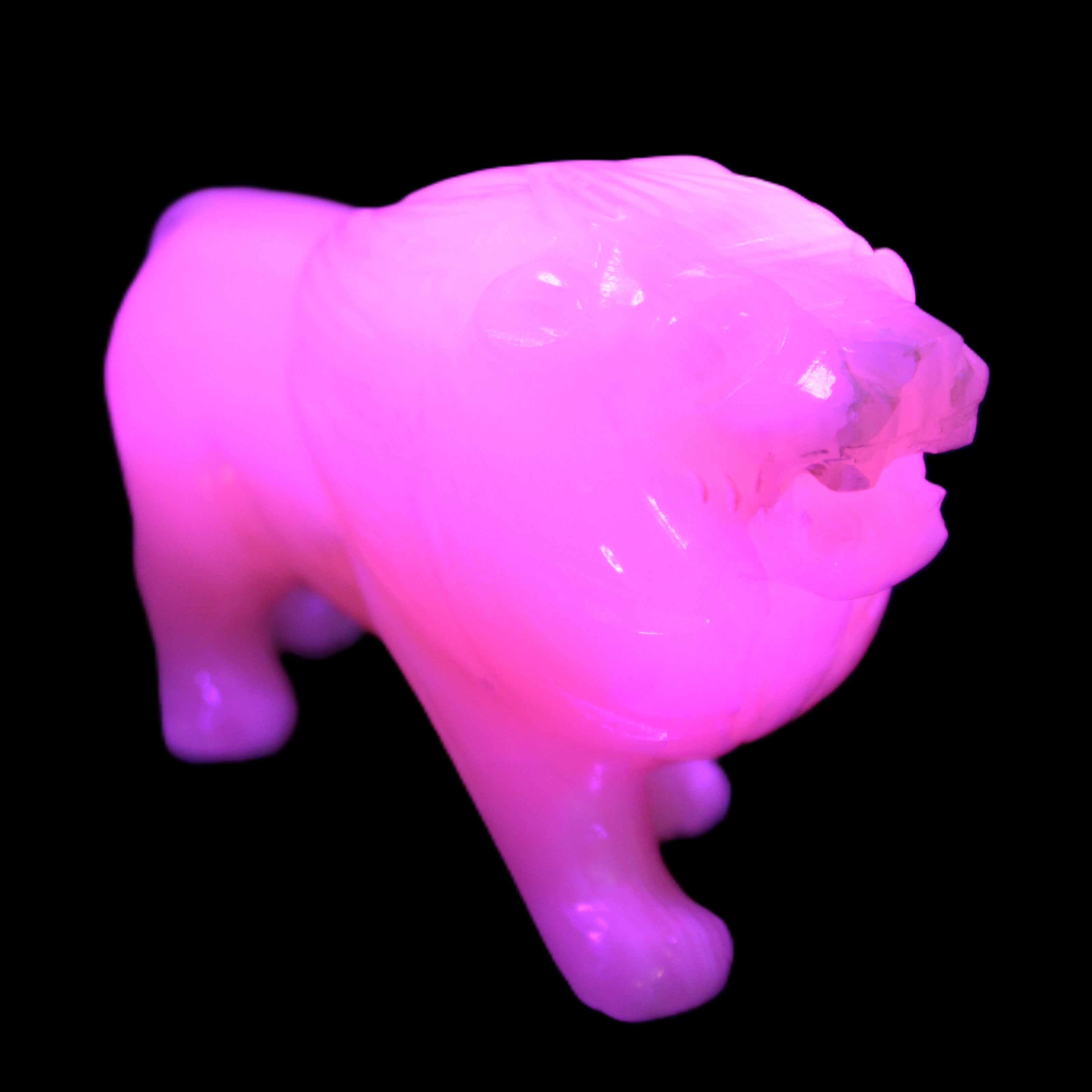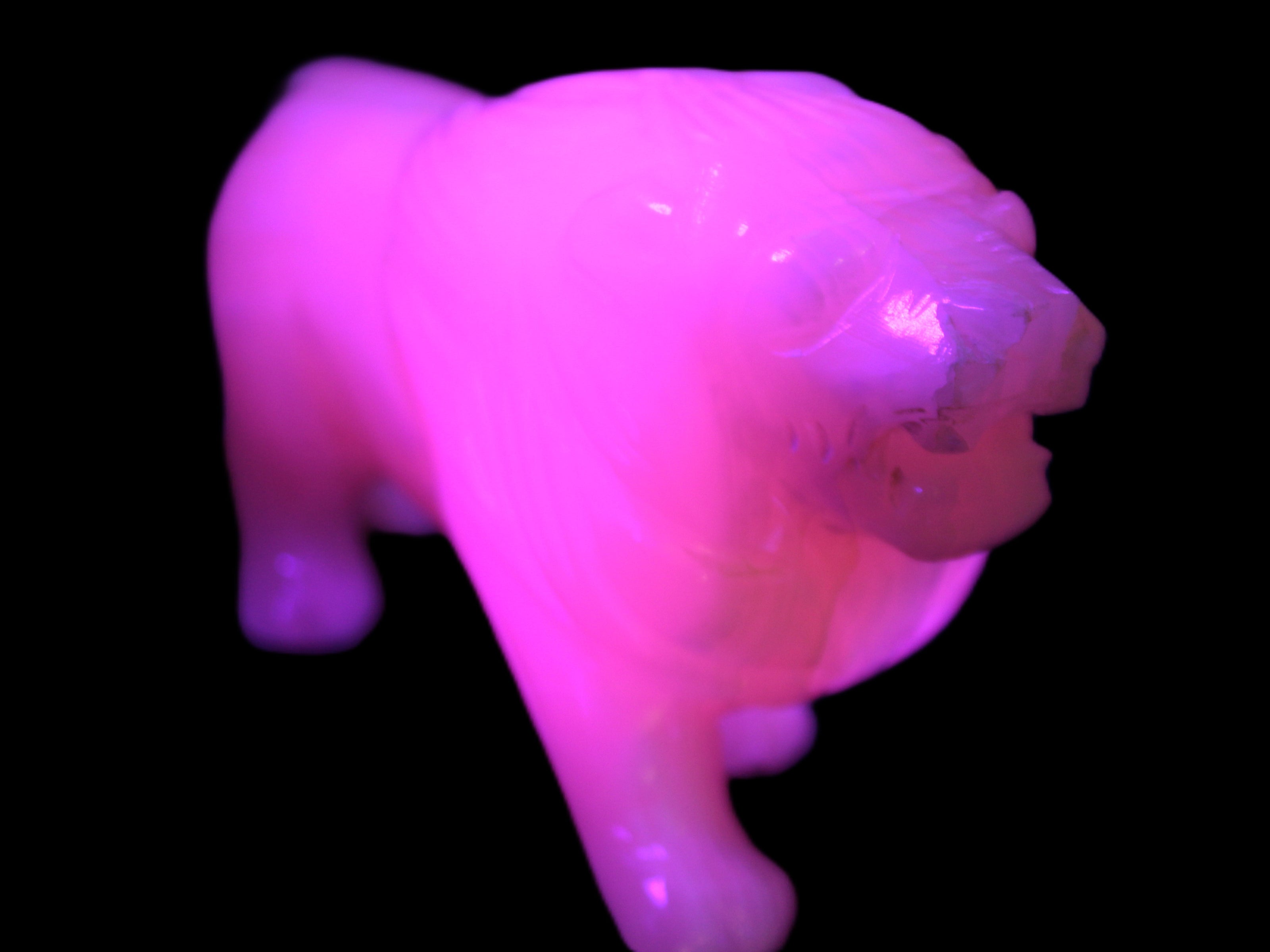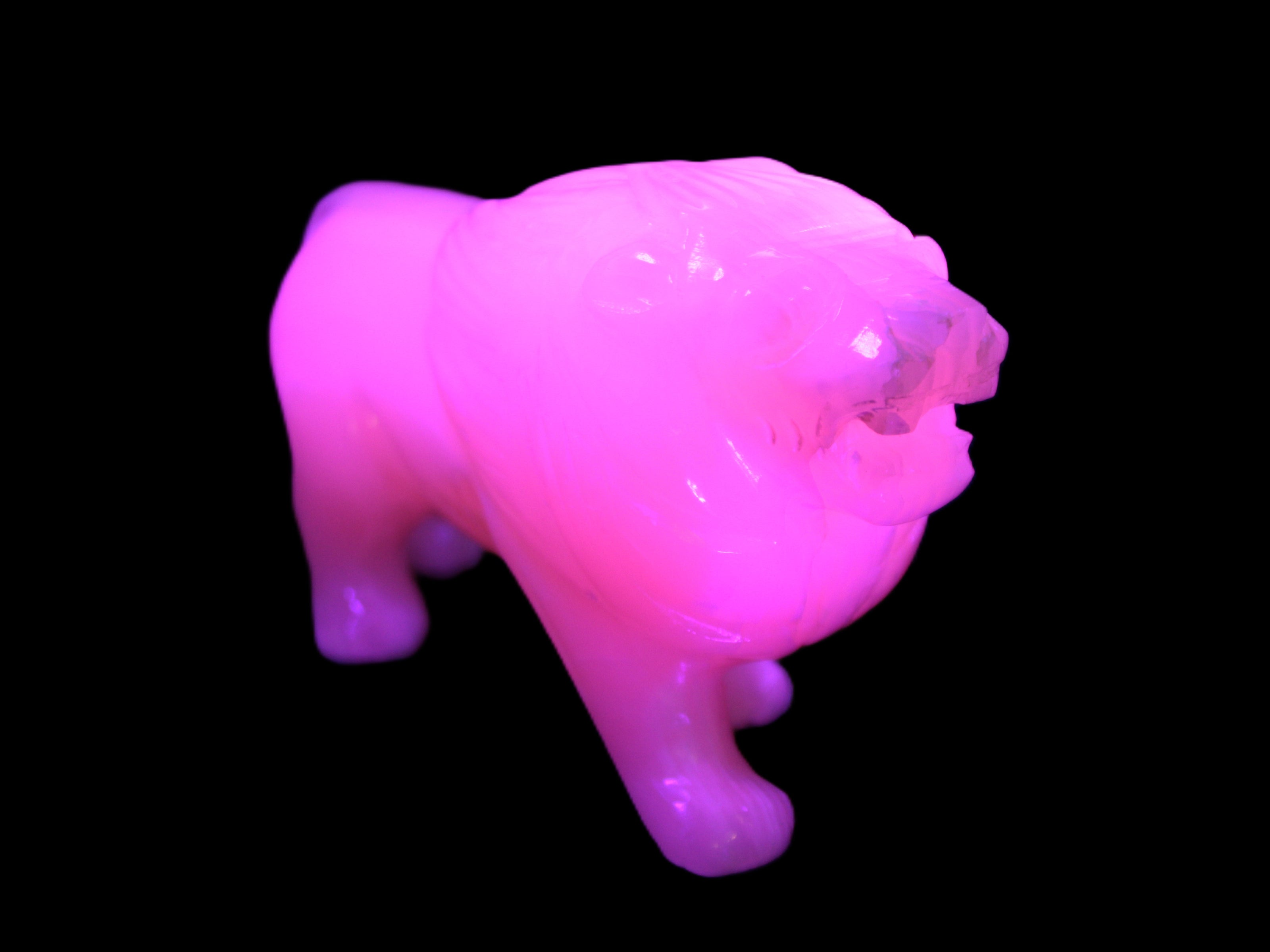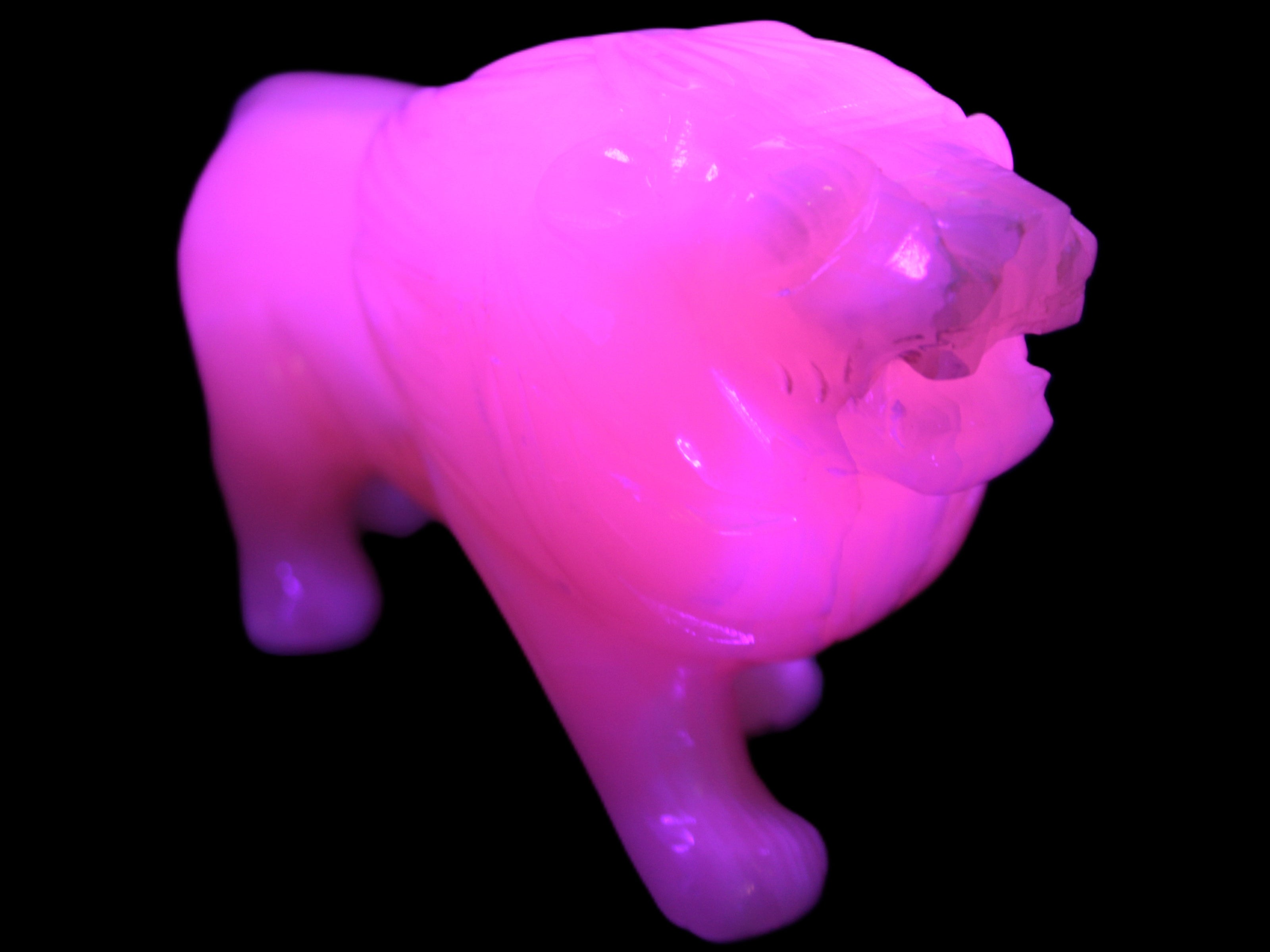 This proud Mangano Calcite hand-carved lion was artfully crafted by Lawrence Riaz., from local stone he sourced in Pakistan. It weighs 1189. He stands 90mm tall at his shoulders and is 60 mm broad there. He is 185 mm long. This is a large statement piece that glows hot pink in UV light.
