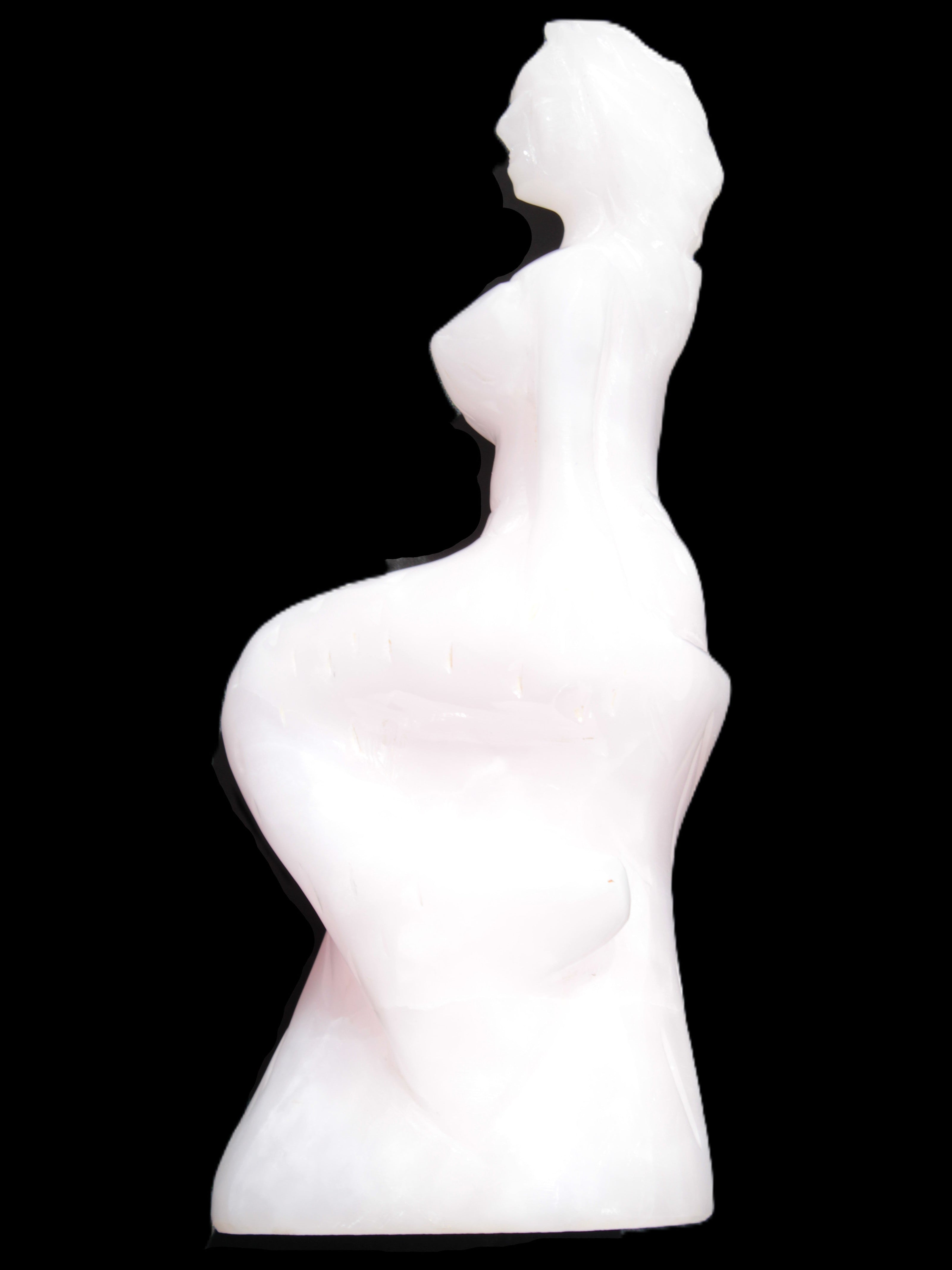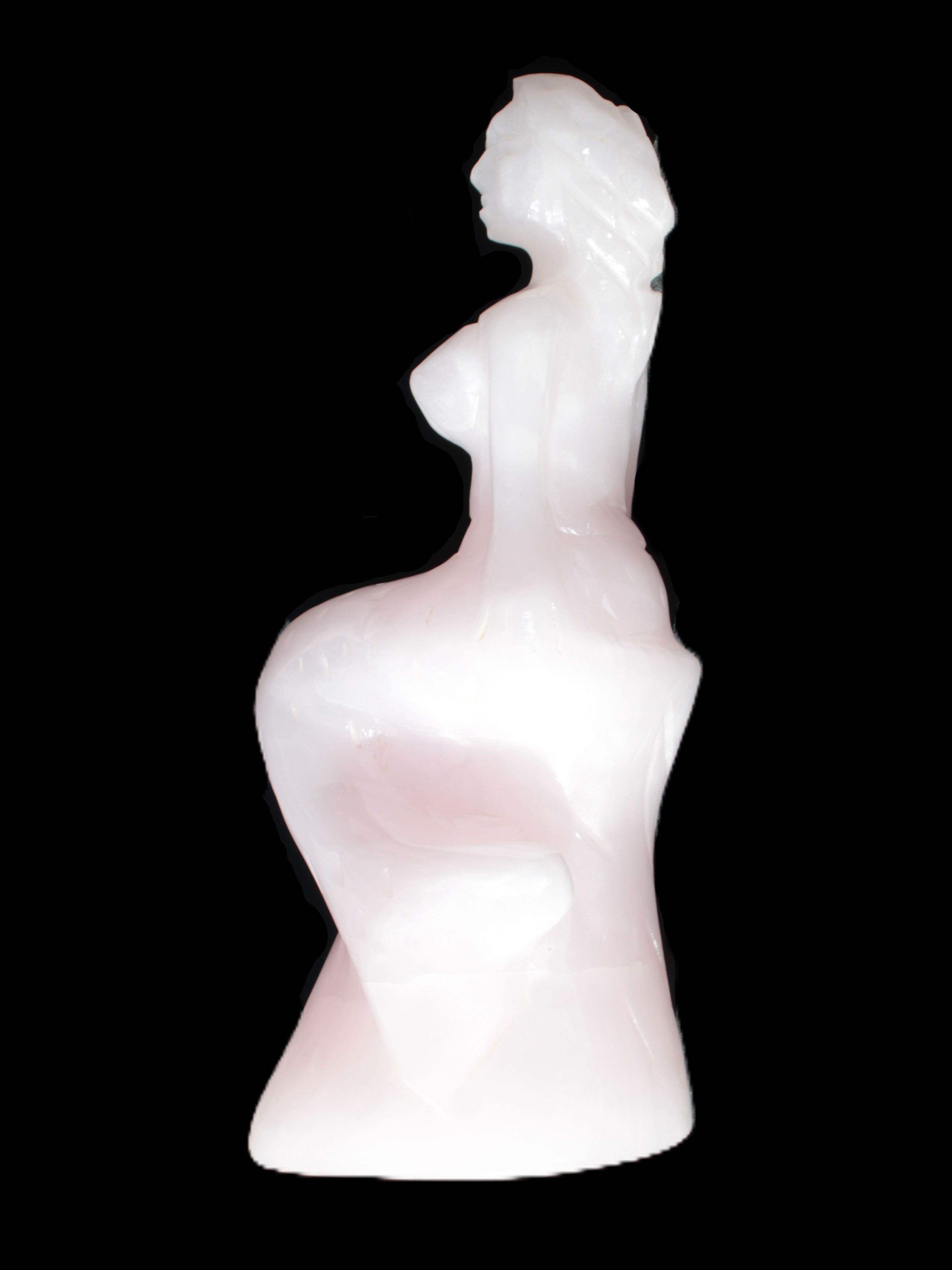 This beautiful Mangano Calcite hand-carved mermaid 213*75*86mm 1585g. This mermaid statue was sculpted by Lawrence Riaz. He used local stone he sourced in Pakistan. This statue stands a full 213mm tall on a stable base 86mm wide and 75mm deep. This awesome statement piece glows hot pink in UV light.
