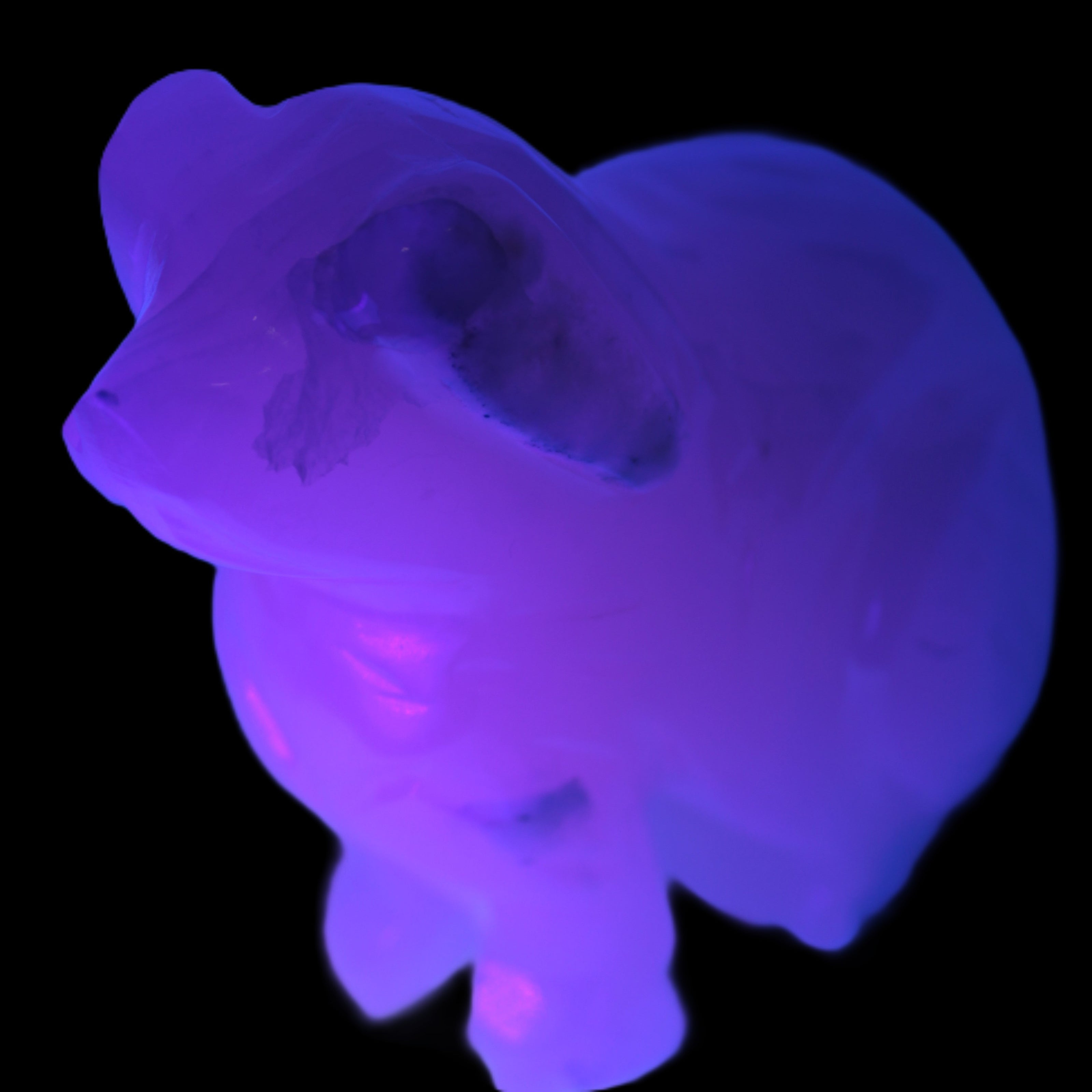 Mangano is a calcium carbonate mineral containing a minimum of 30 per cent manganese carbonate. The calcium and manganese carbonates can be banded. The presence of manganese makes Mangano Calcite react to ultraviolet light, giving it a bright hot-pink glow.