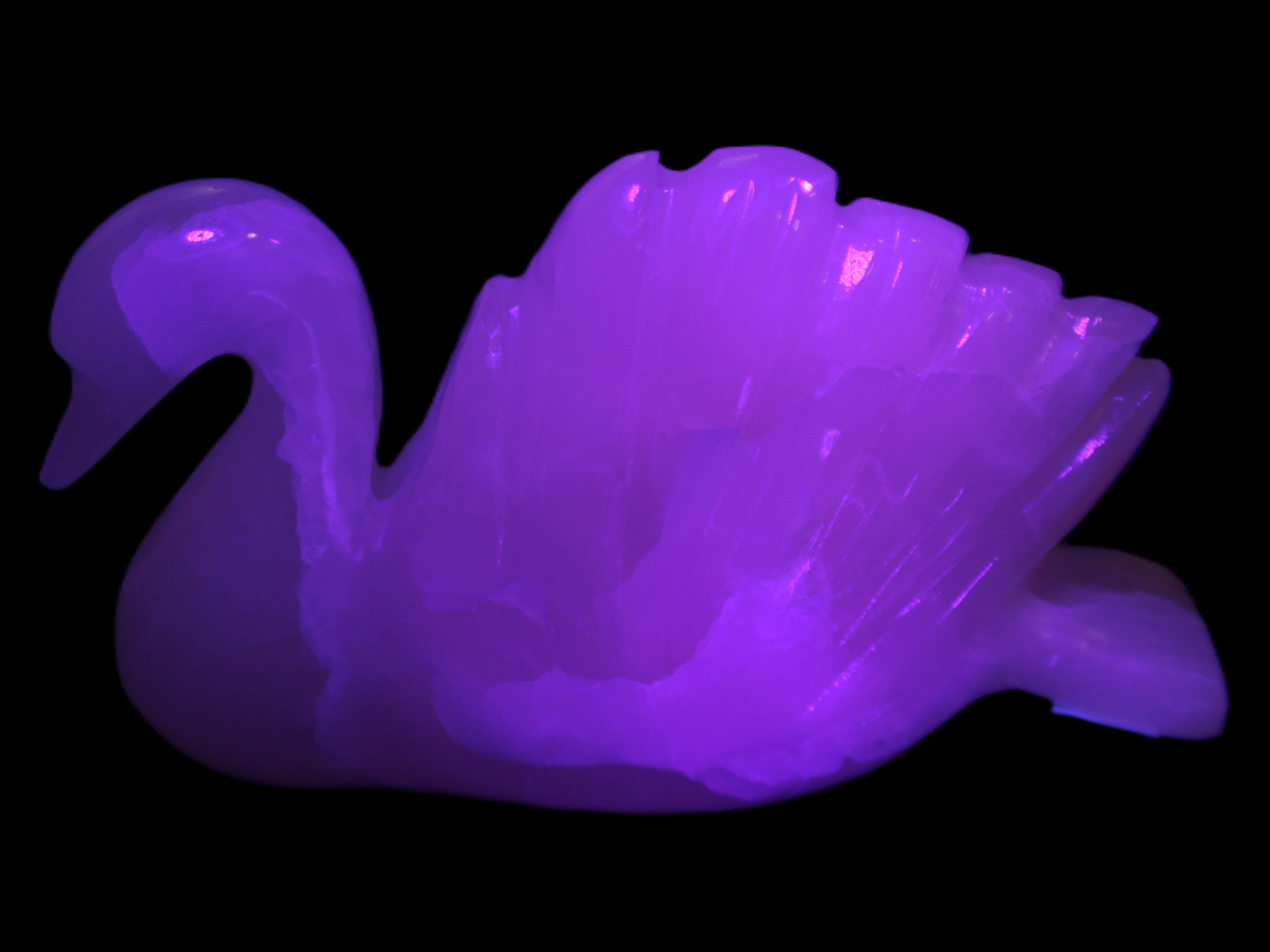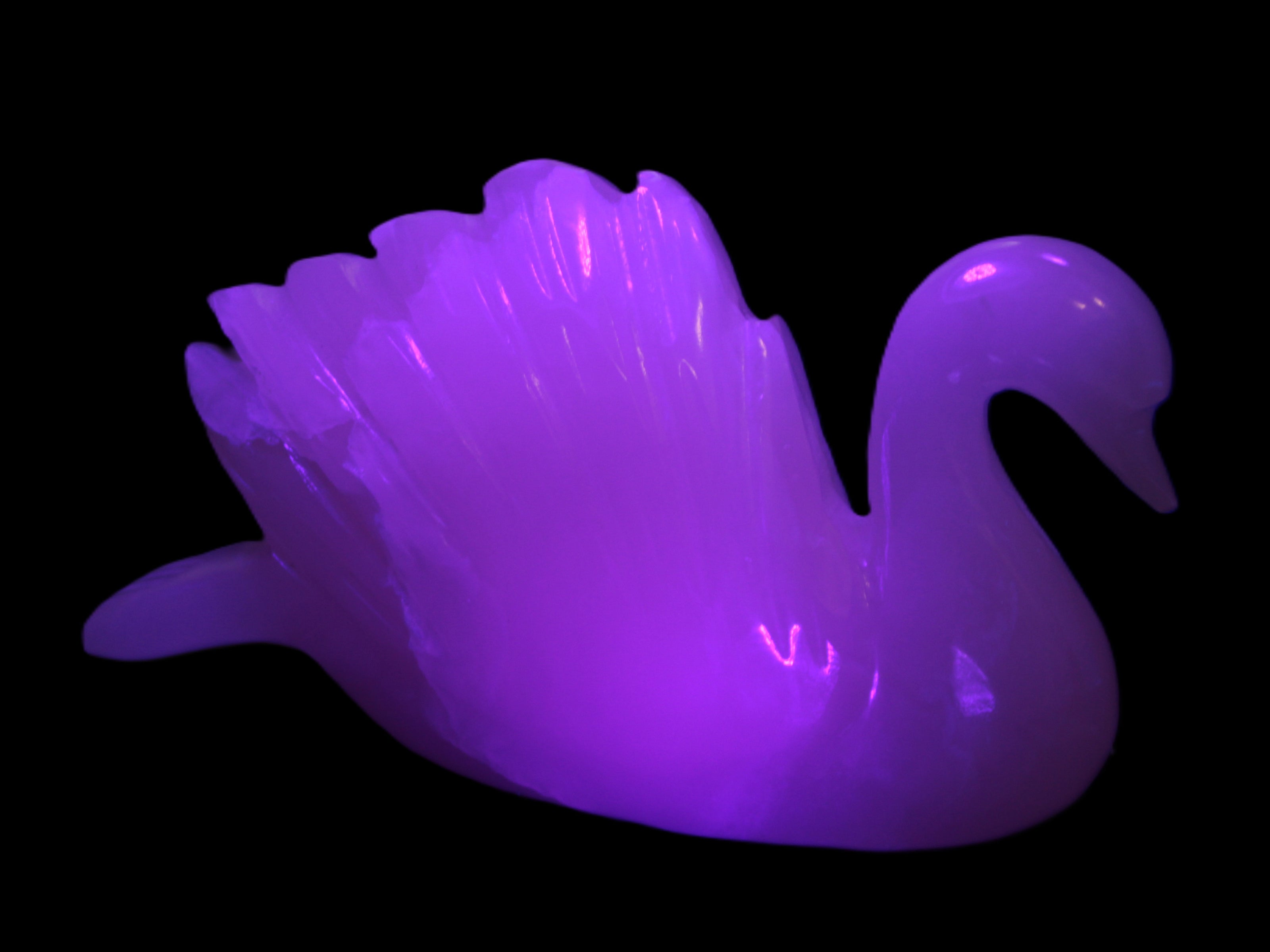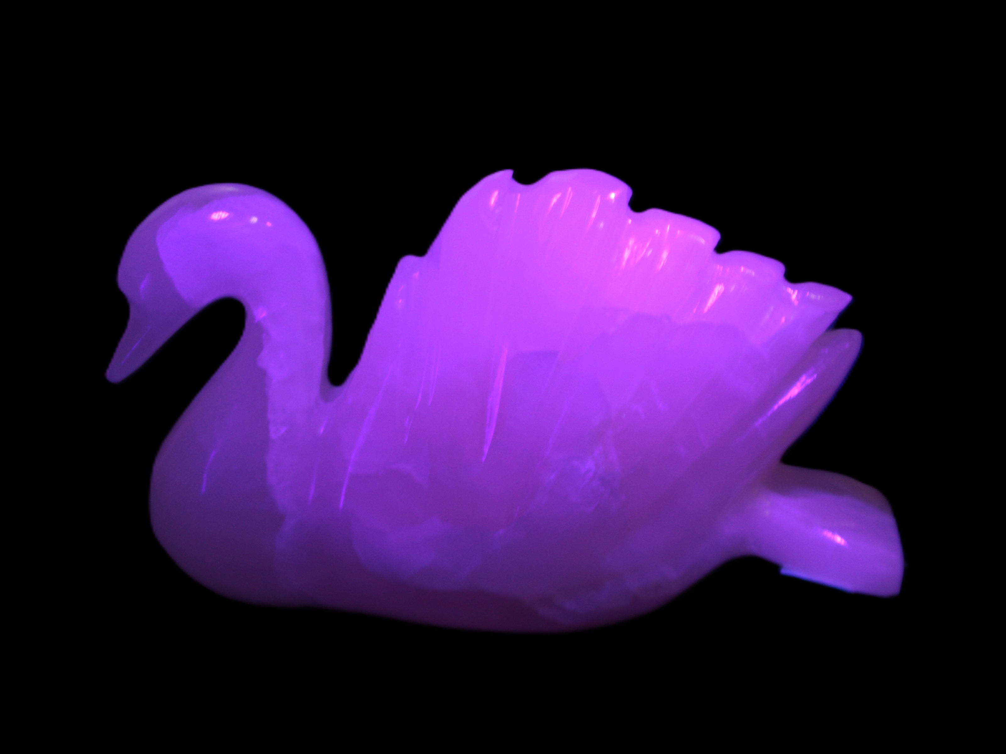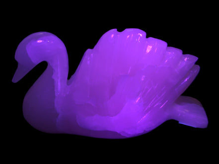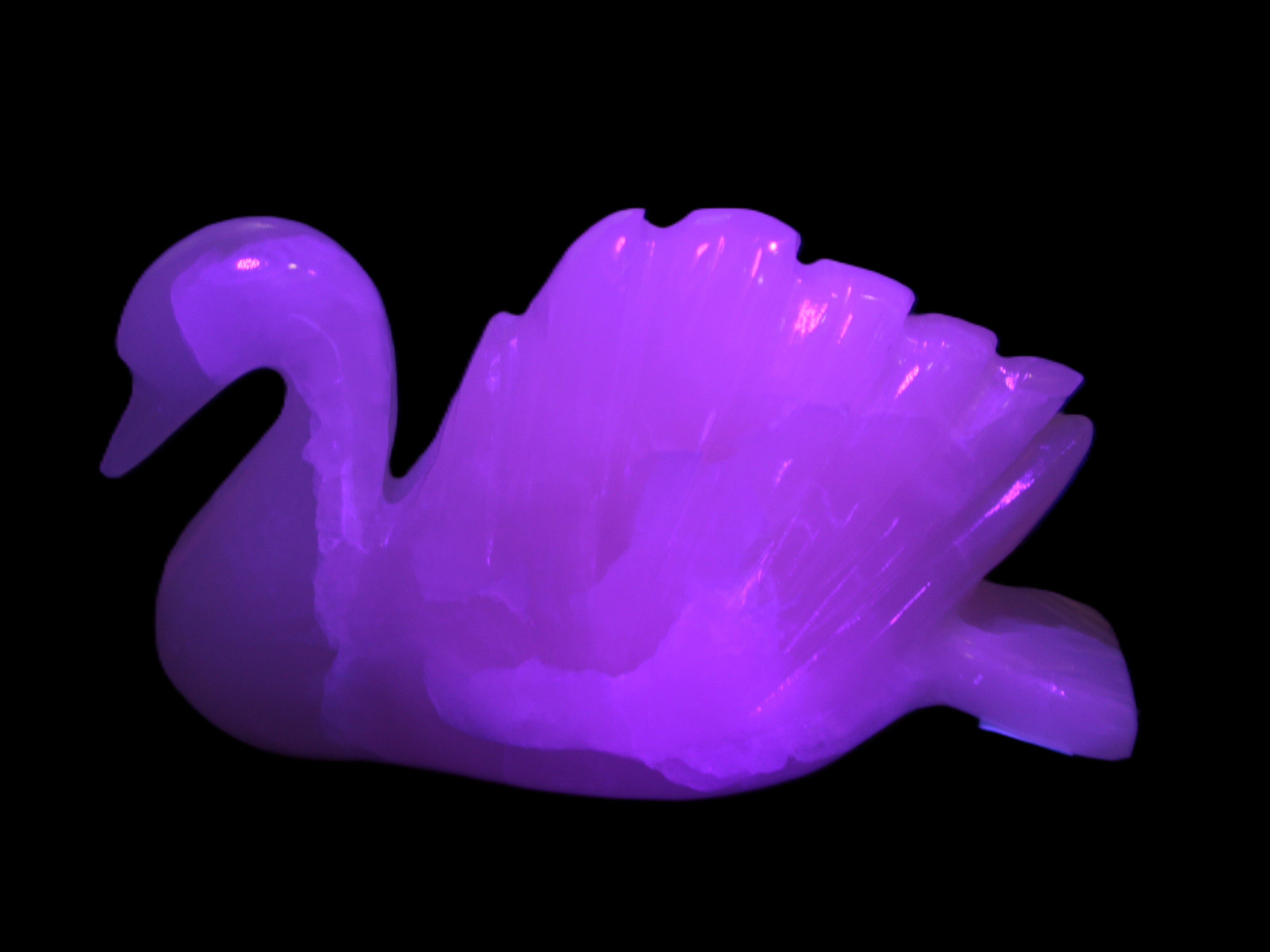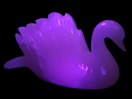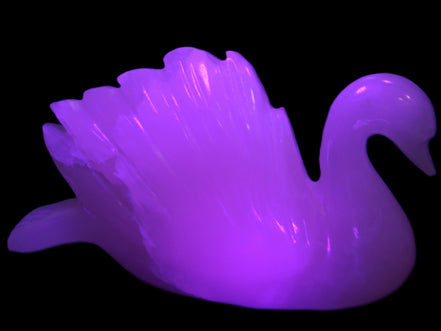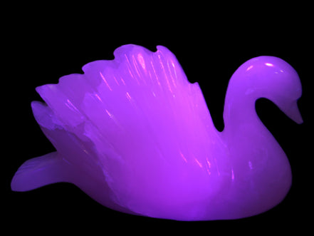 This graceful Mangano Calcite hand-carved Swan measures 140*82*32mm and weighs 511g. This hand-carving was fashioned from local Mangano Calcite by Lawrence Handicrafts in Pakistan. It is a large and elegant piece. It glows a soft lilac-pink in ultra-violet light.