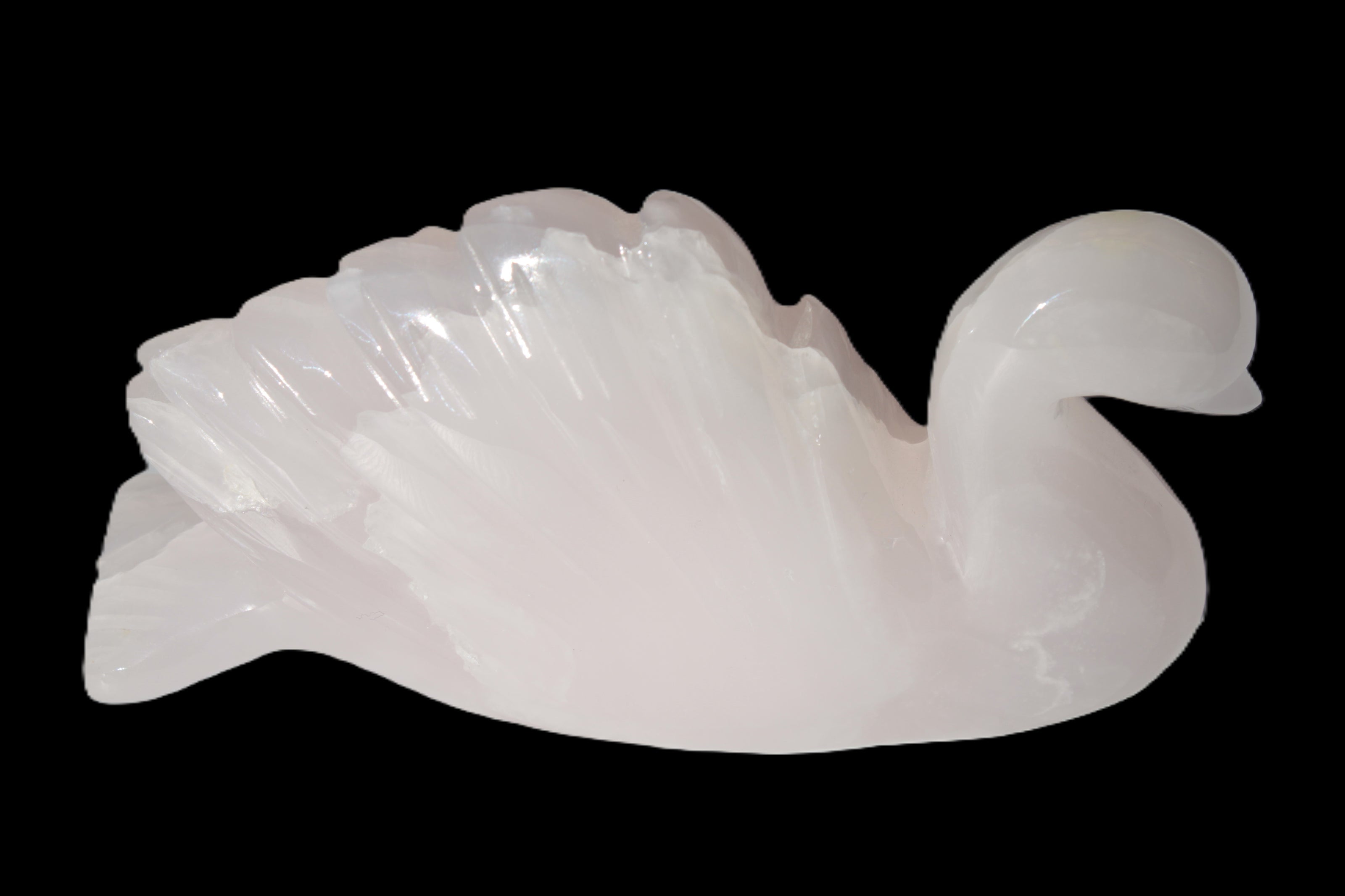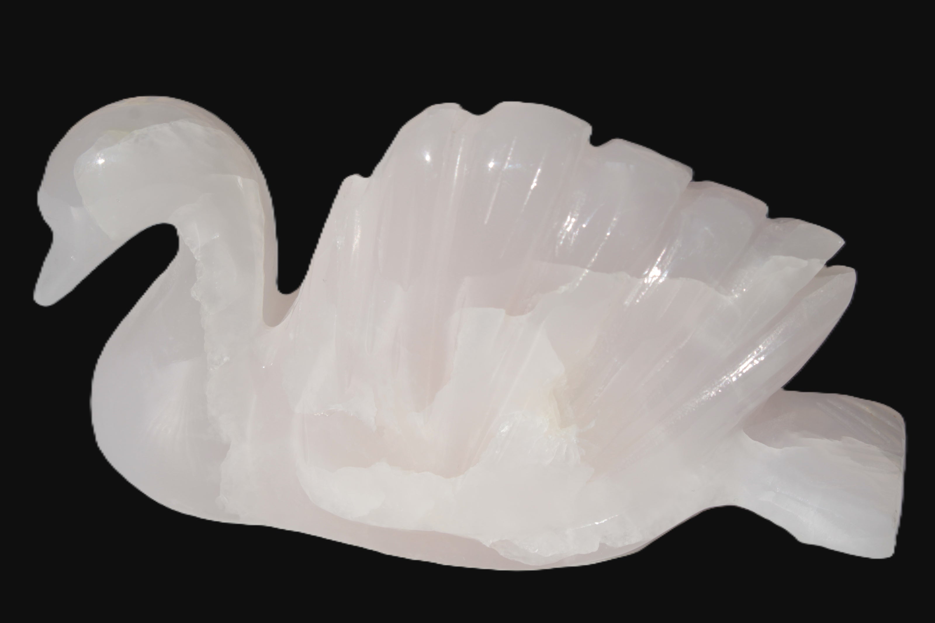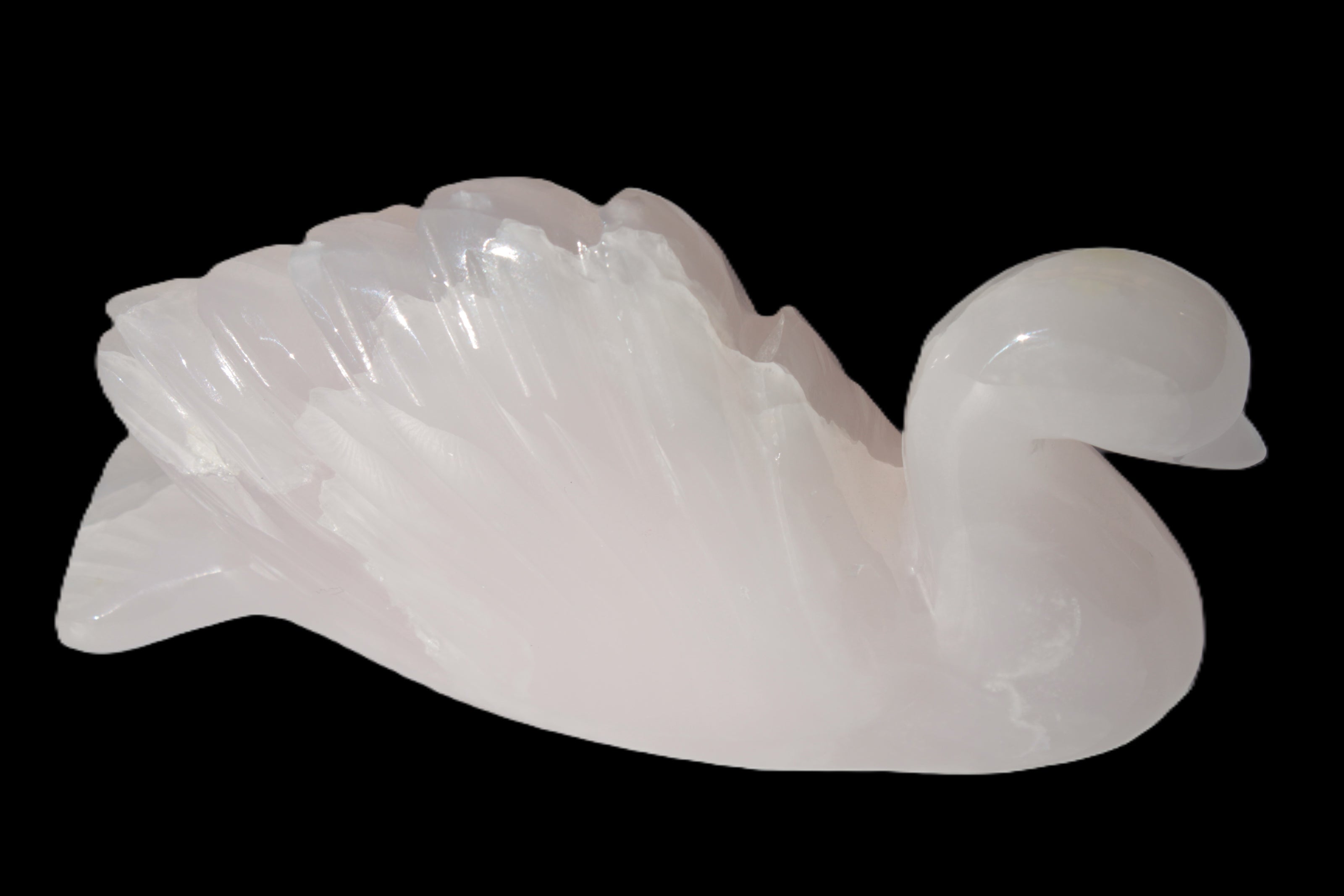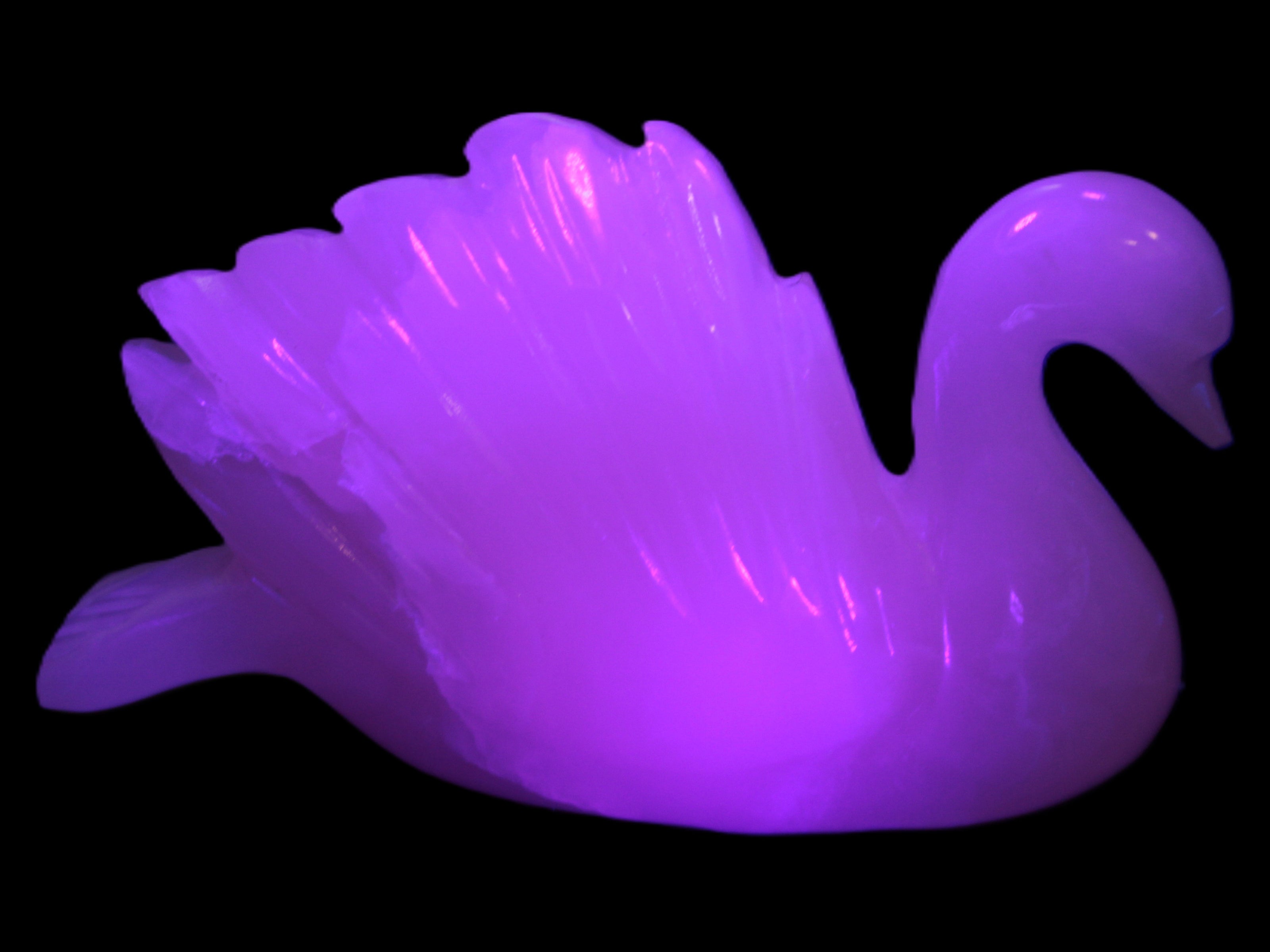 This graceful Mangano Calcite hand-carved Swan measures 140*82*32mm and weighs 511g. This hand-carving was fashioned from local Mangano Calcite by Lawrence Handicrafts in Pakistan. It is a large and elegant piece. It glows a soft lilac-pink in ultra-violet light.