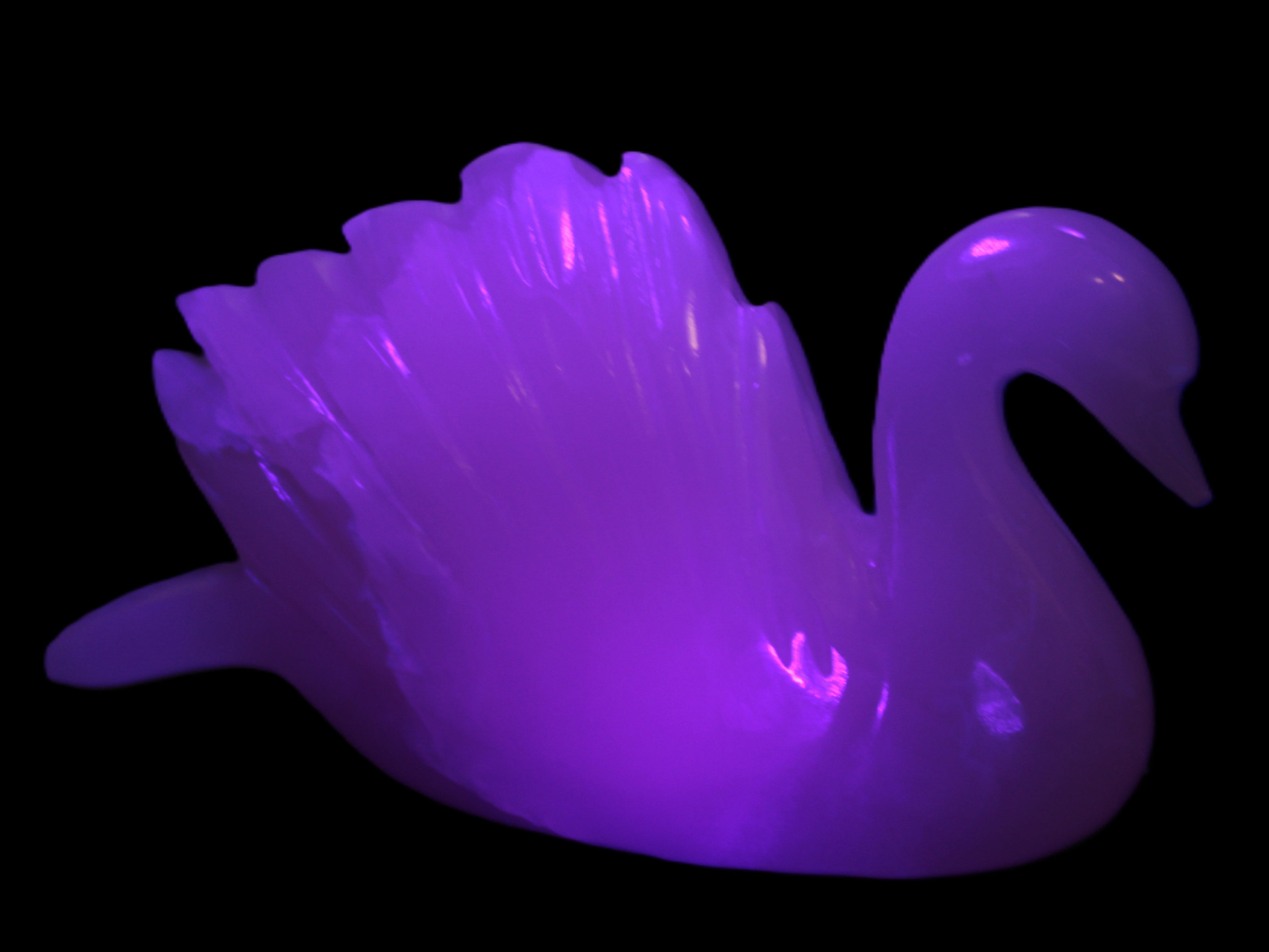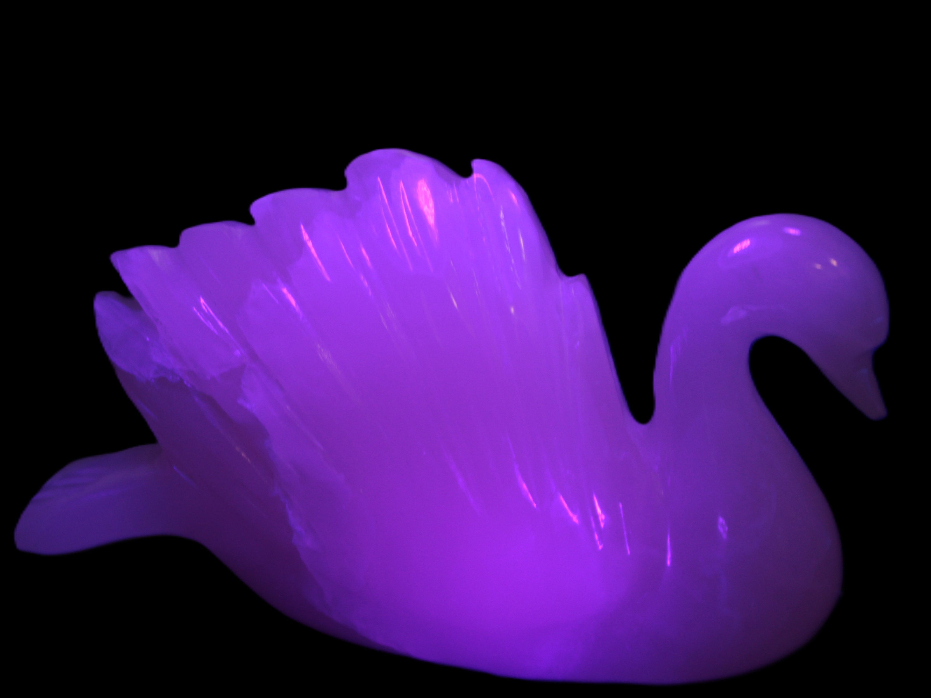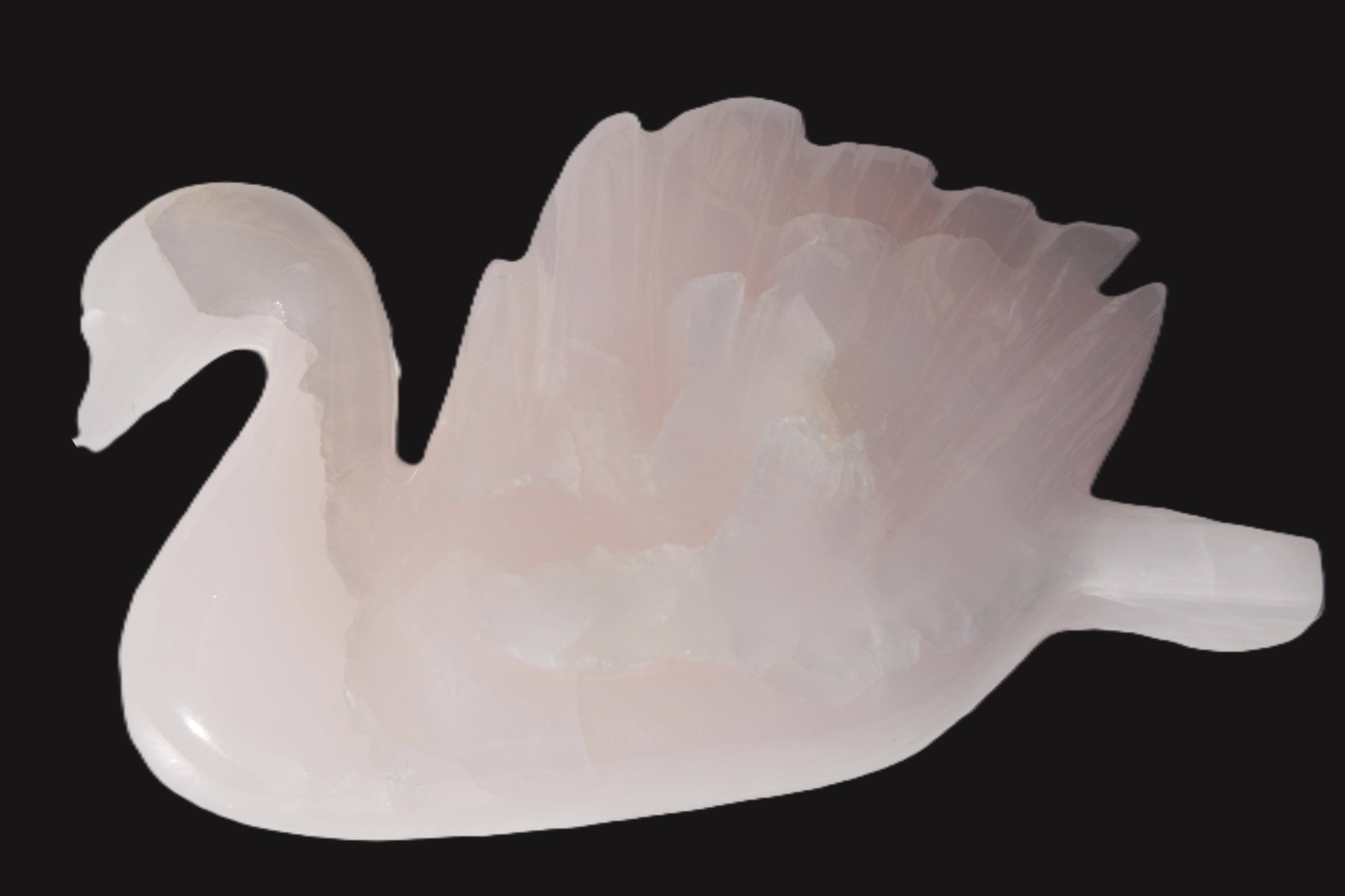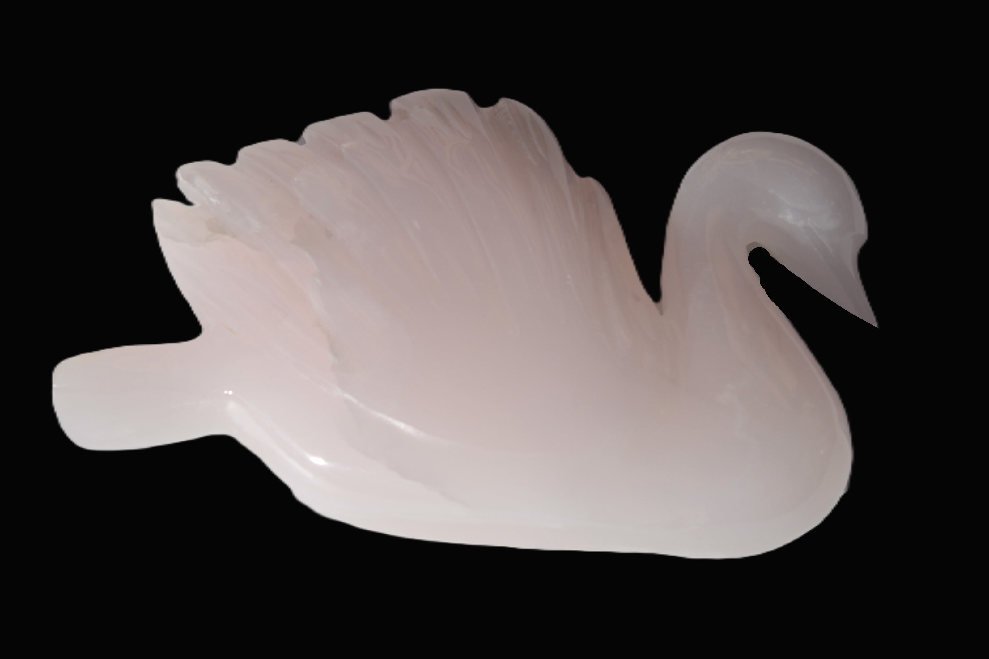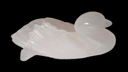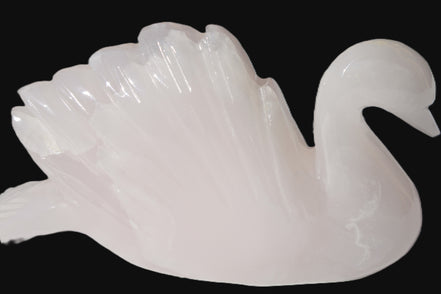 This graceful Mangano Calcite hand-carved Swan measures 140*82*32mm and weighs 511g. This hand-carving was fashioned from local Mangano Calcite by Lawrence Handicrafts in Pakistan. It is a large and elegant piece. It glows a soft lilac-pink in ultra-violet light.