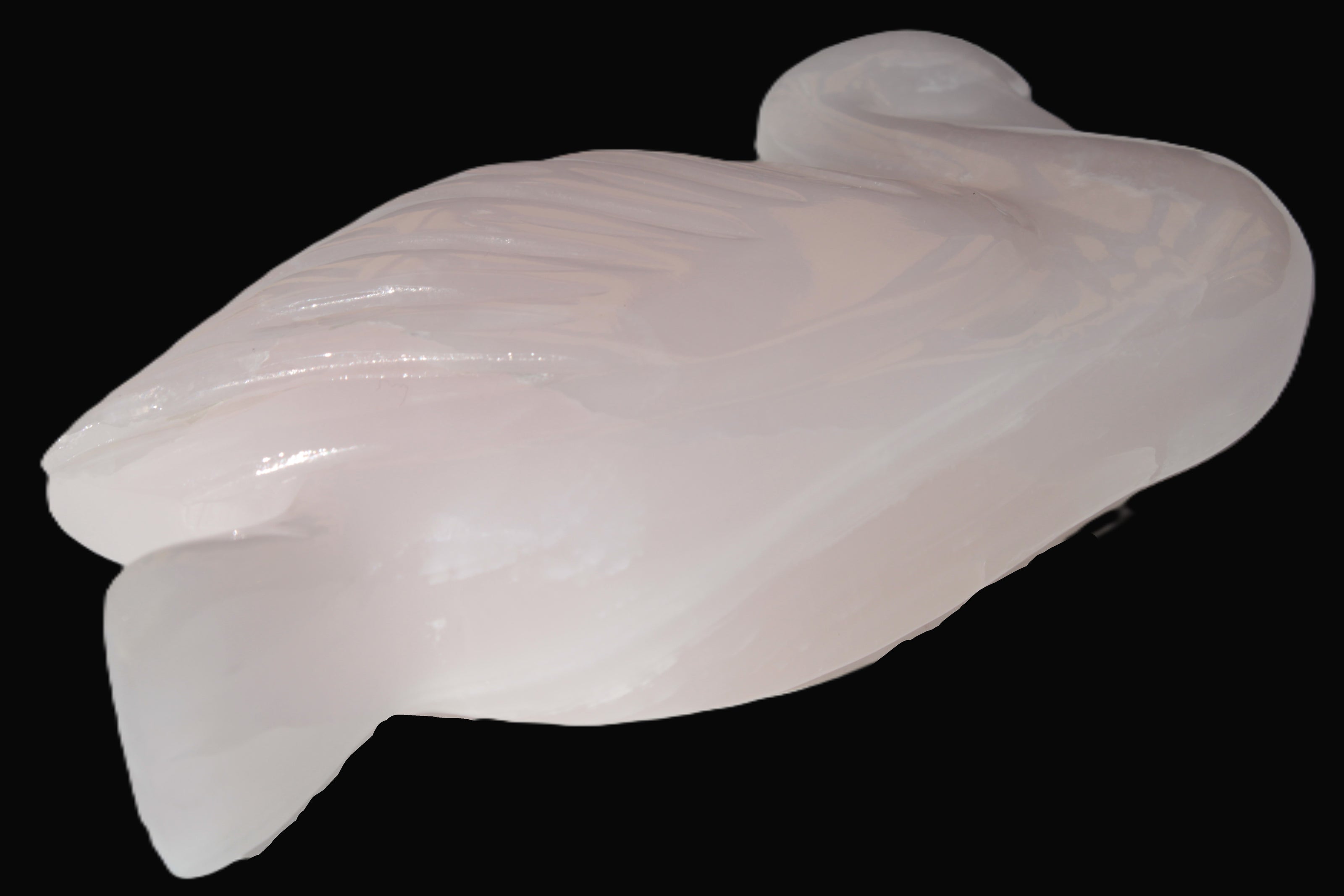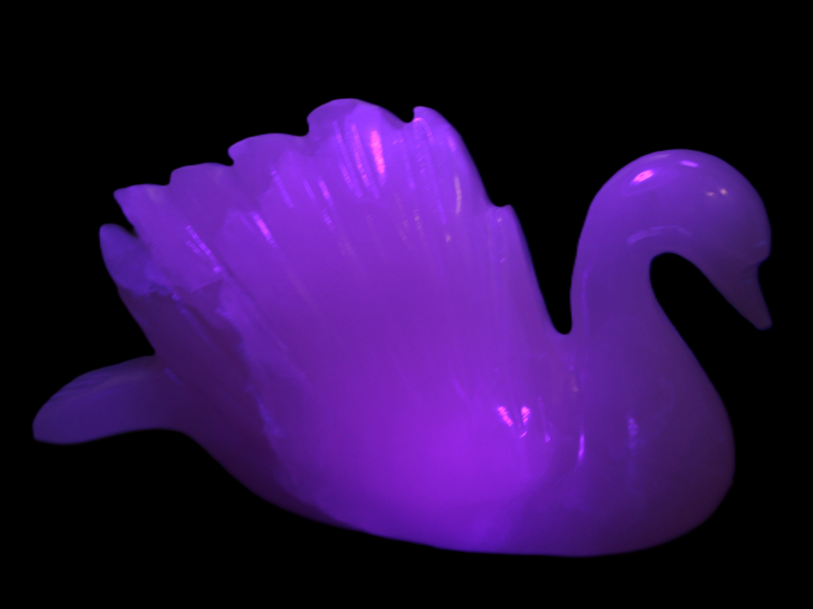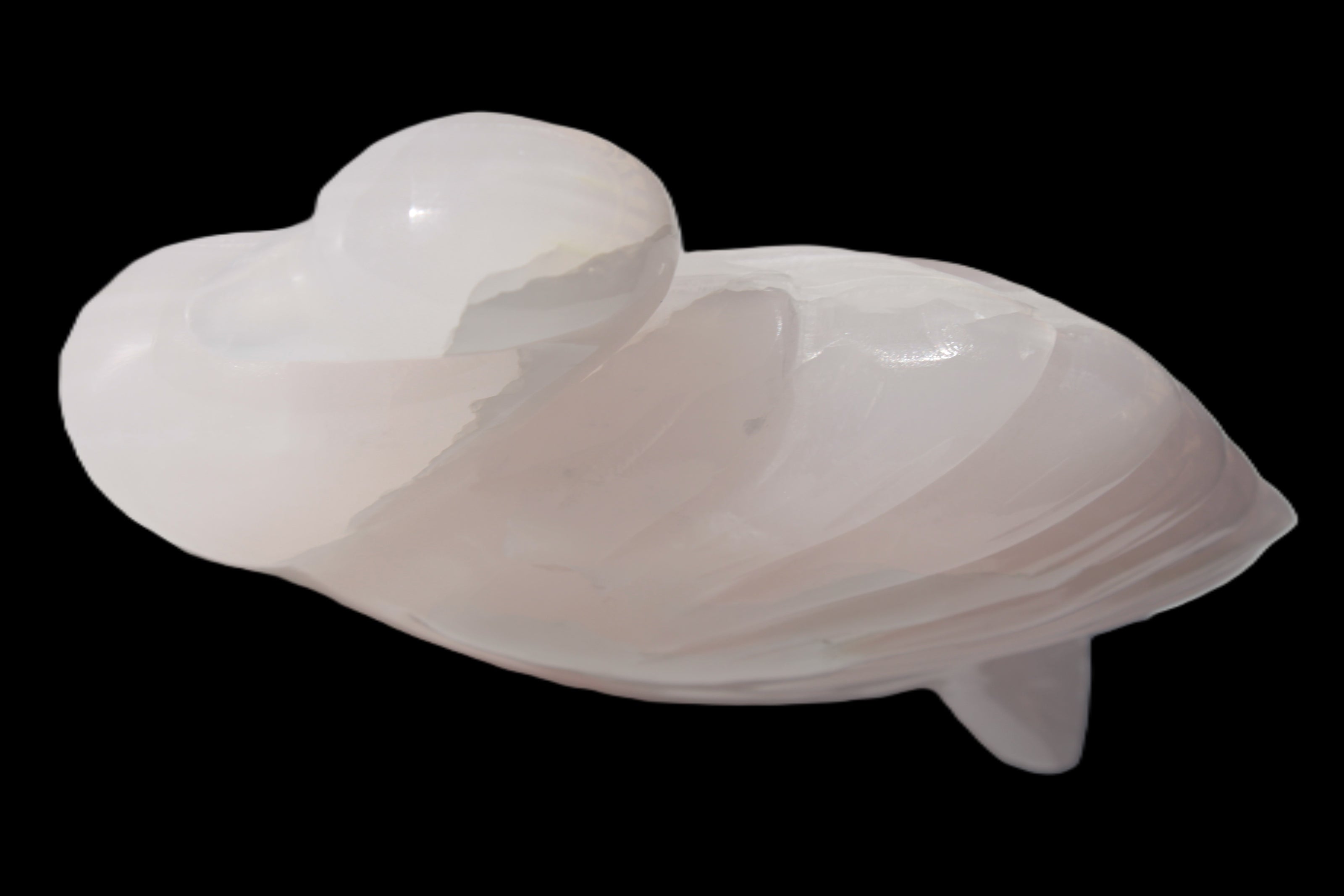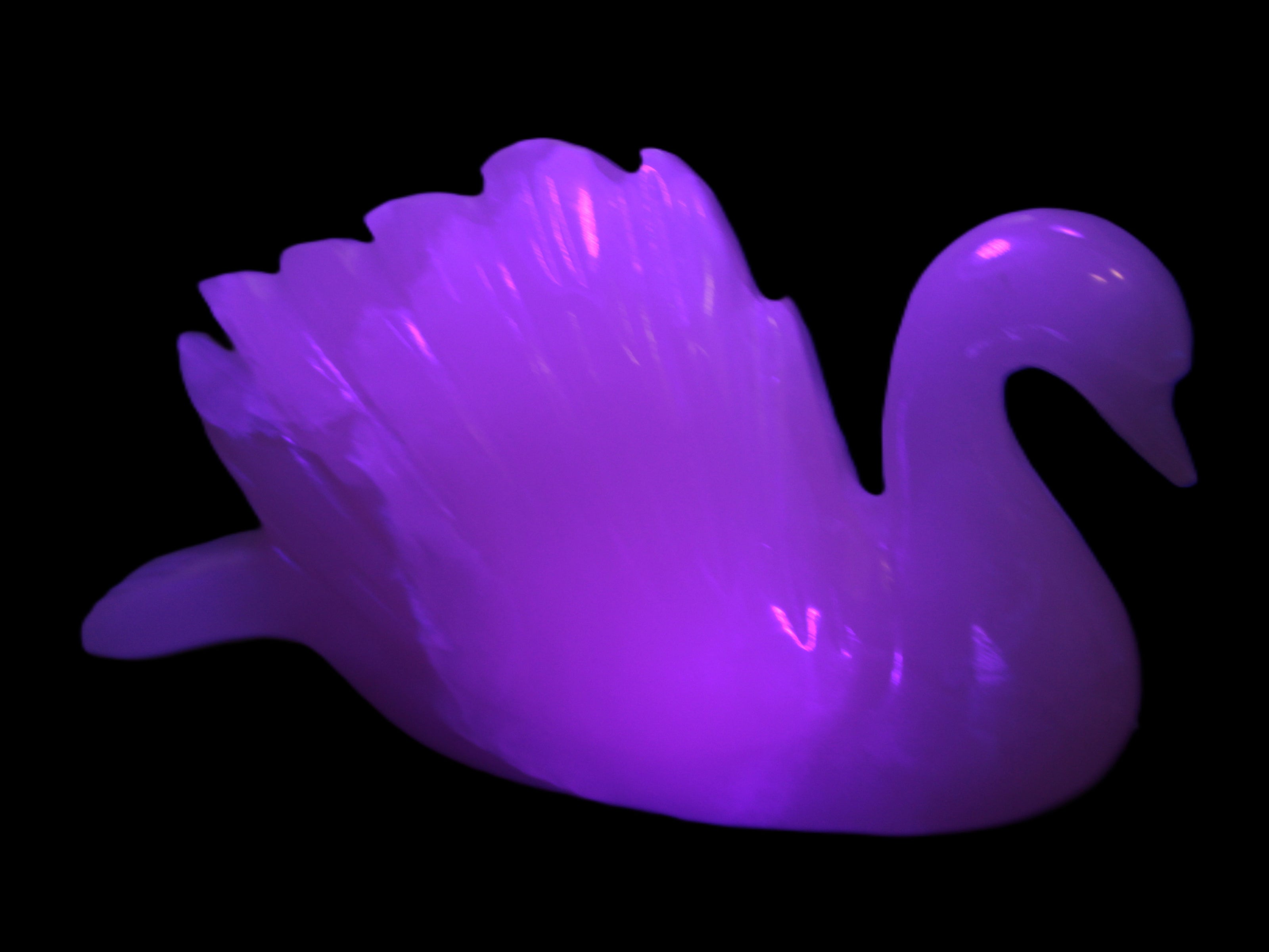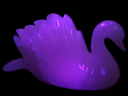 This graceful Mangano Calcite hand-carved Swan measures 140*82*32mm and weighs 511g. This hand-carving was fashioned from local Mangano Calcite by Lawrence Handicrafts in Pakistan. It is a large and elegant piece. It glows a soft lilac-pink in ultra-violet light.