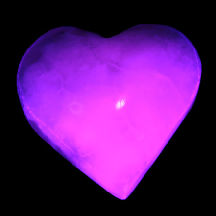 This Mangano Calcite heart 47-49mm 58-66g selection were crafted in Pakistan. They were sourced and shaped for Rocks and Things by our partner, Lawrence Handicrafts in Karachi. Mangano Calcite is a calcium carbonate mineral with a minimum of 30 per cent manganese carbonate present. In these hearts, you can see the Manganese and other elements as darker traces in the stone. Mangano Calcite glows hot pink under UV light due to the presence of manganese. The calcium and manganese carbonates can be banded. Mangano helps reveal your true self. Mangano Calcite can help bring inner peace, through a process of self-discovery. The heart is approximately 42mm wide.