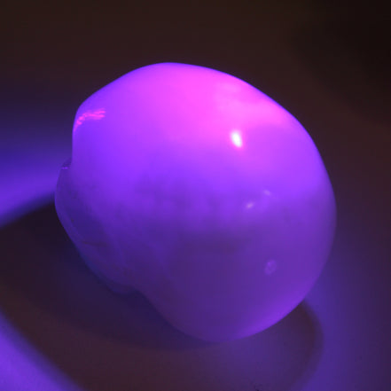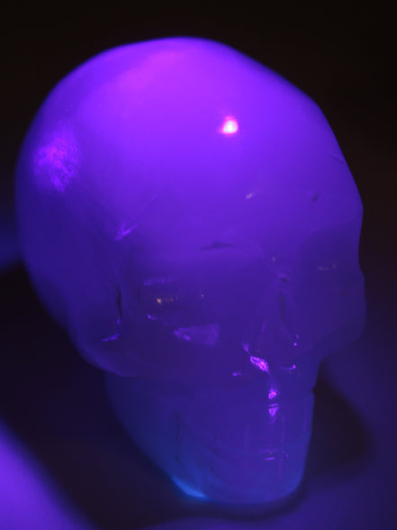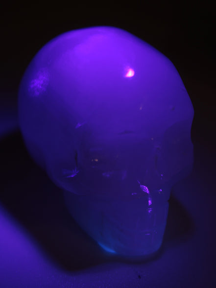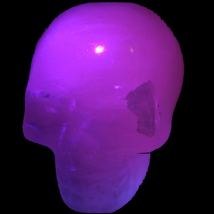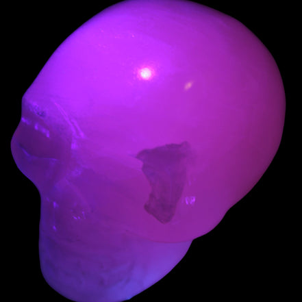 This Mangano Calcite skull 40*55*45mm approx. selection weighs 160/161g. Mangano Calcite has been expertly hand-carved by Larence Riaz from locally sourced stone in Pakistan. Mangano is a calcium carbonate mineral with a minimum of 30 per cent manganese carbonate present. The calcium and manganese carbonates can be banded. The presence of manganese makes Mangano Calcite react to ultraviolet light, giving it a bright hot-pink glow.