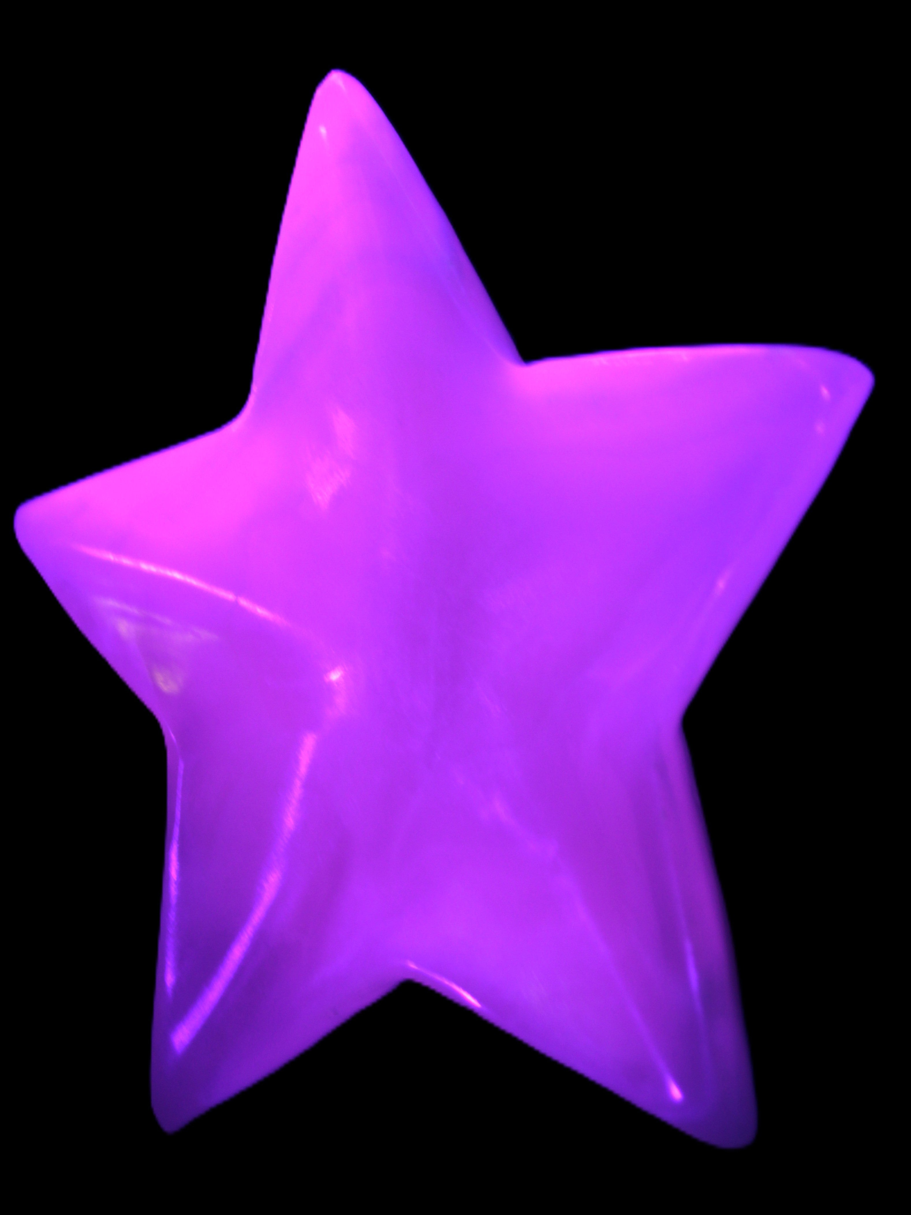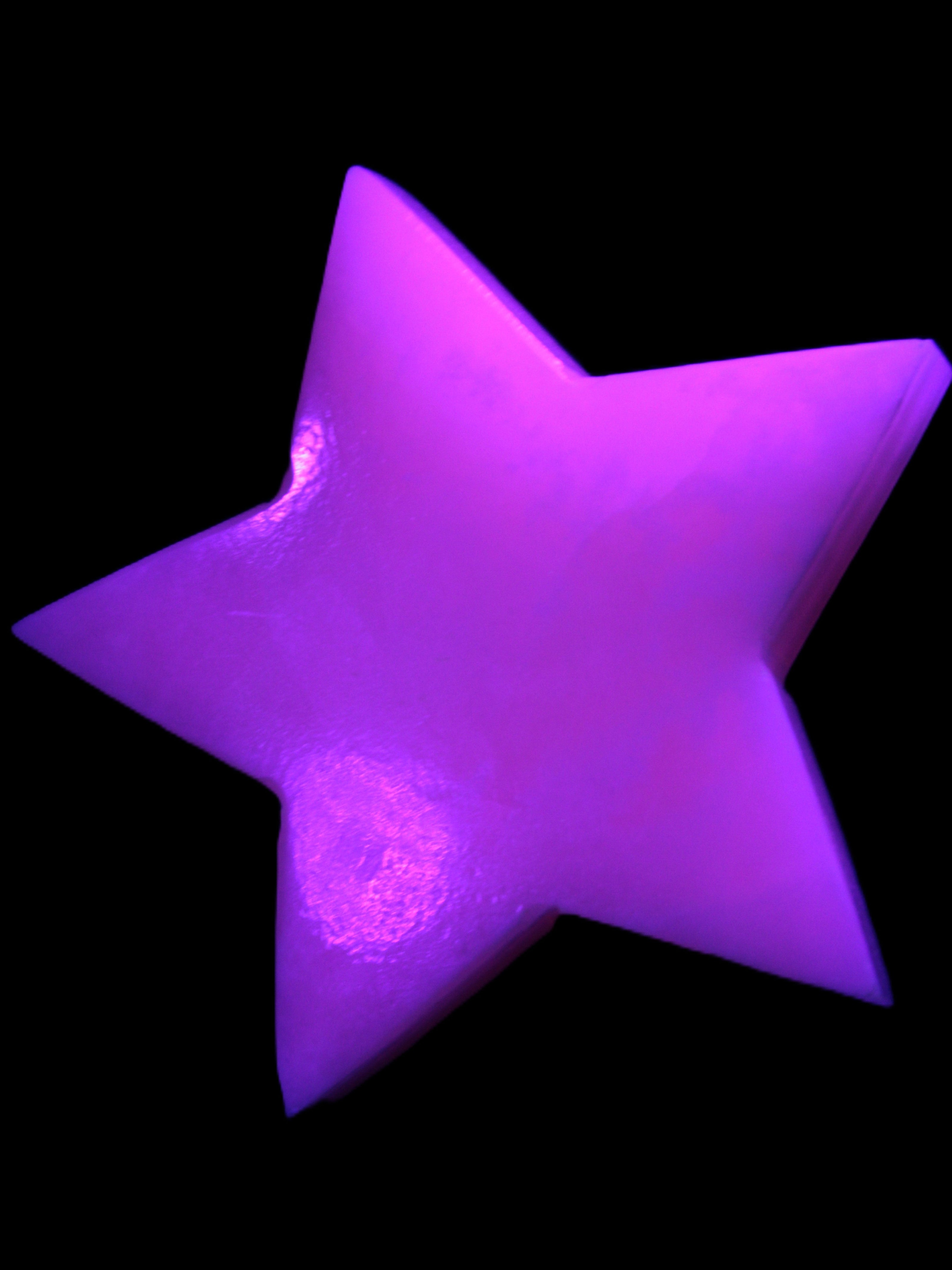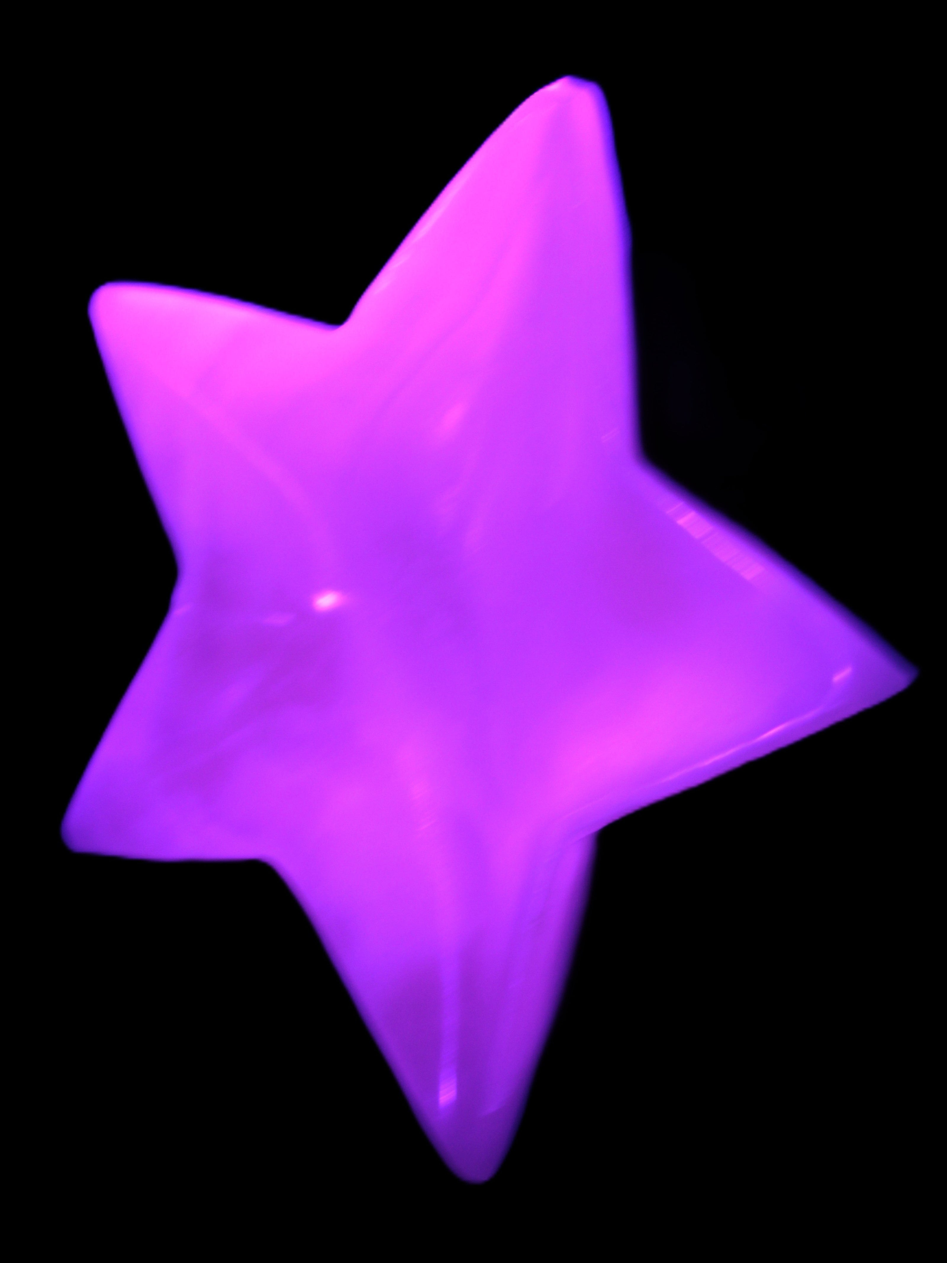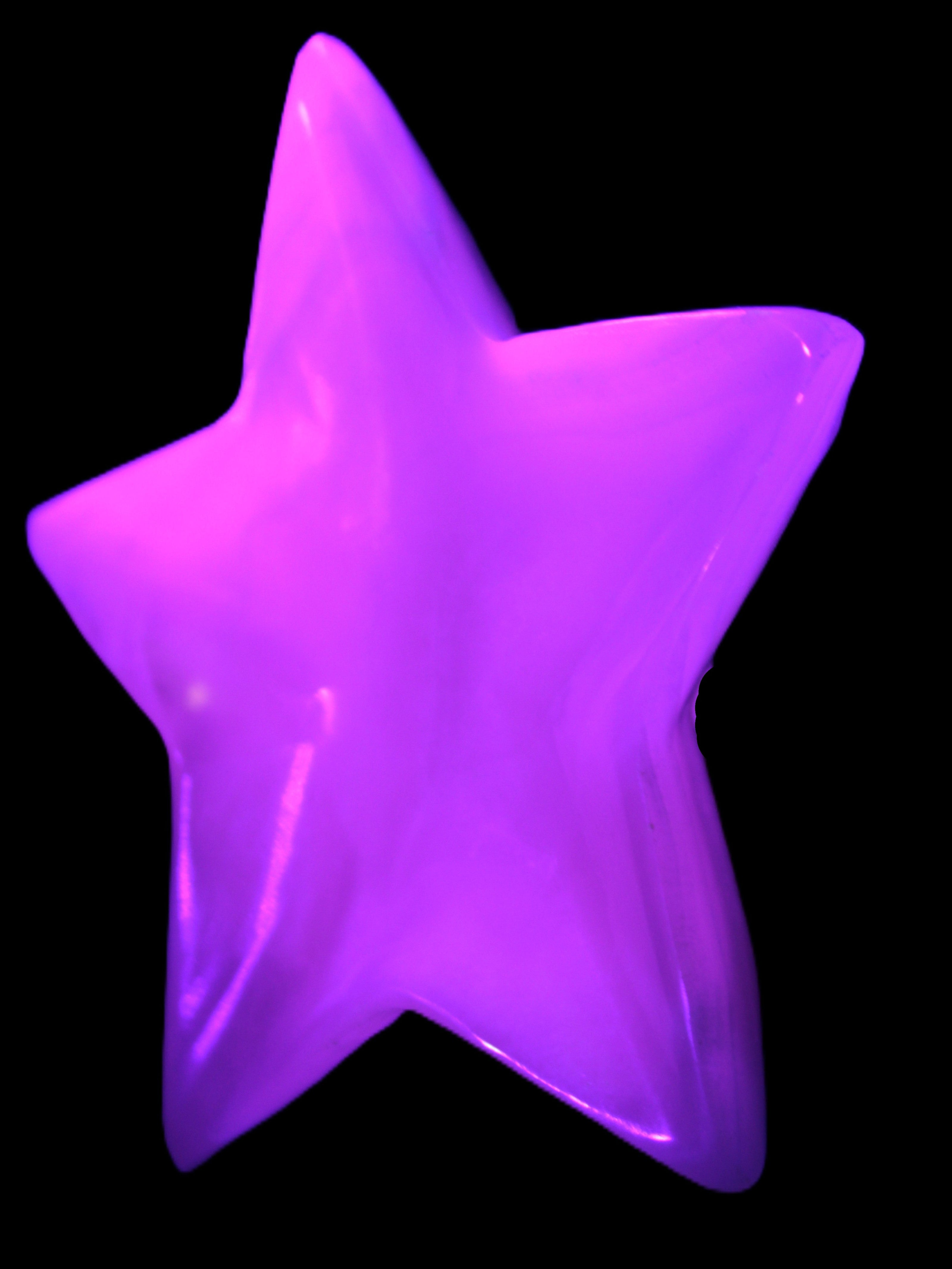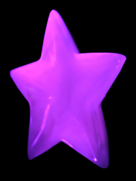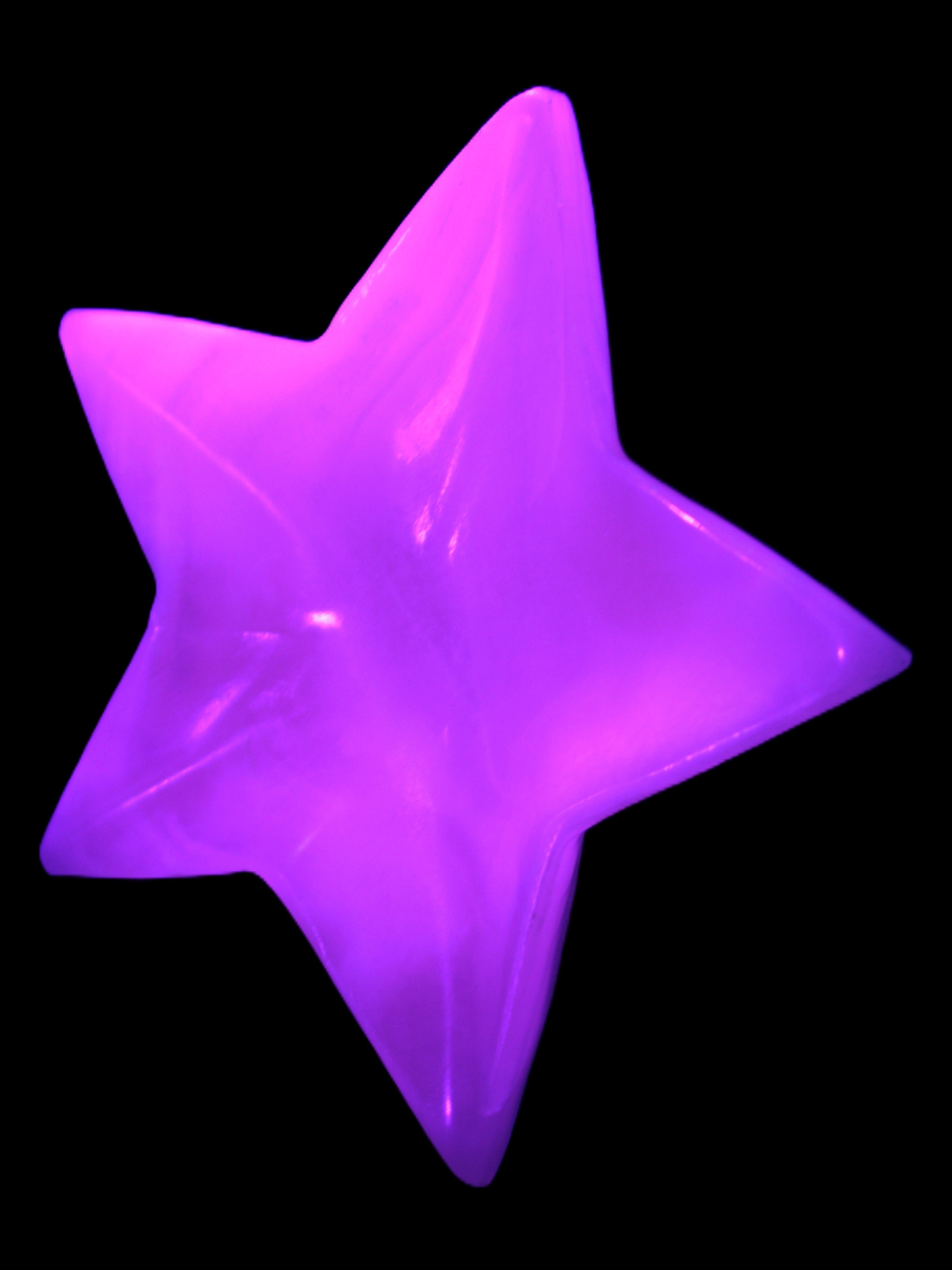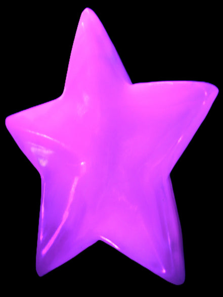 This Mangano Calcite star 108*18mm weighs 162.8g. It is indented, so it can be used as a small dish or stand. Mangano Calcite is a calcium carbonate mineral with a minimum of 30 per cent manganese carbonate present. The calcium and manganese carbonates can be banded. The presence of manganese makes Mangano Calcite react to ultraviolet light, giving it a bright hot-pink glow.
