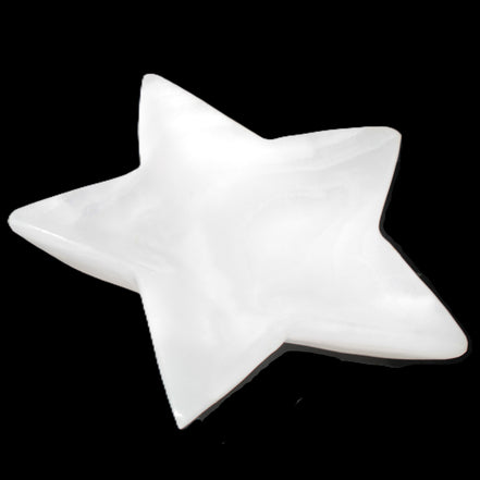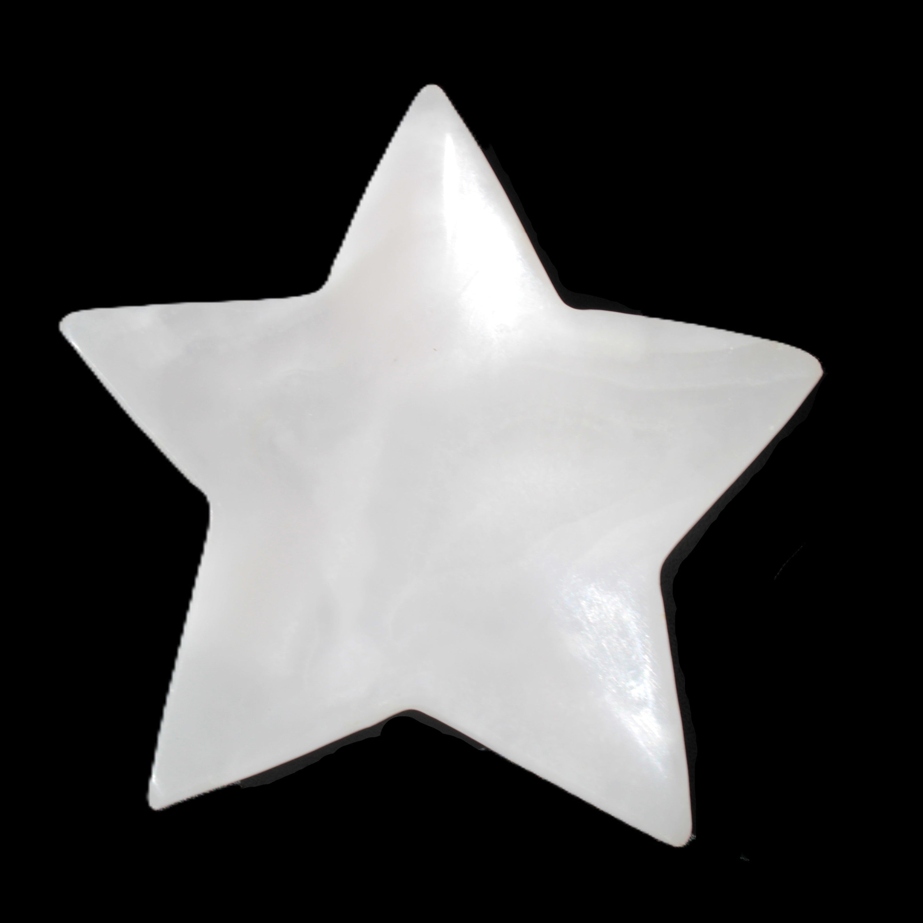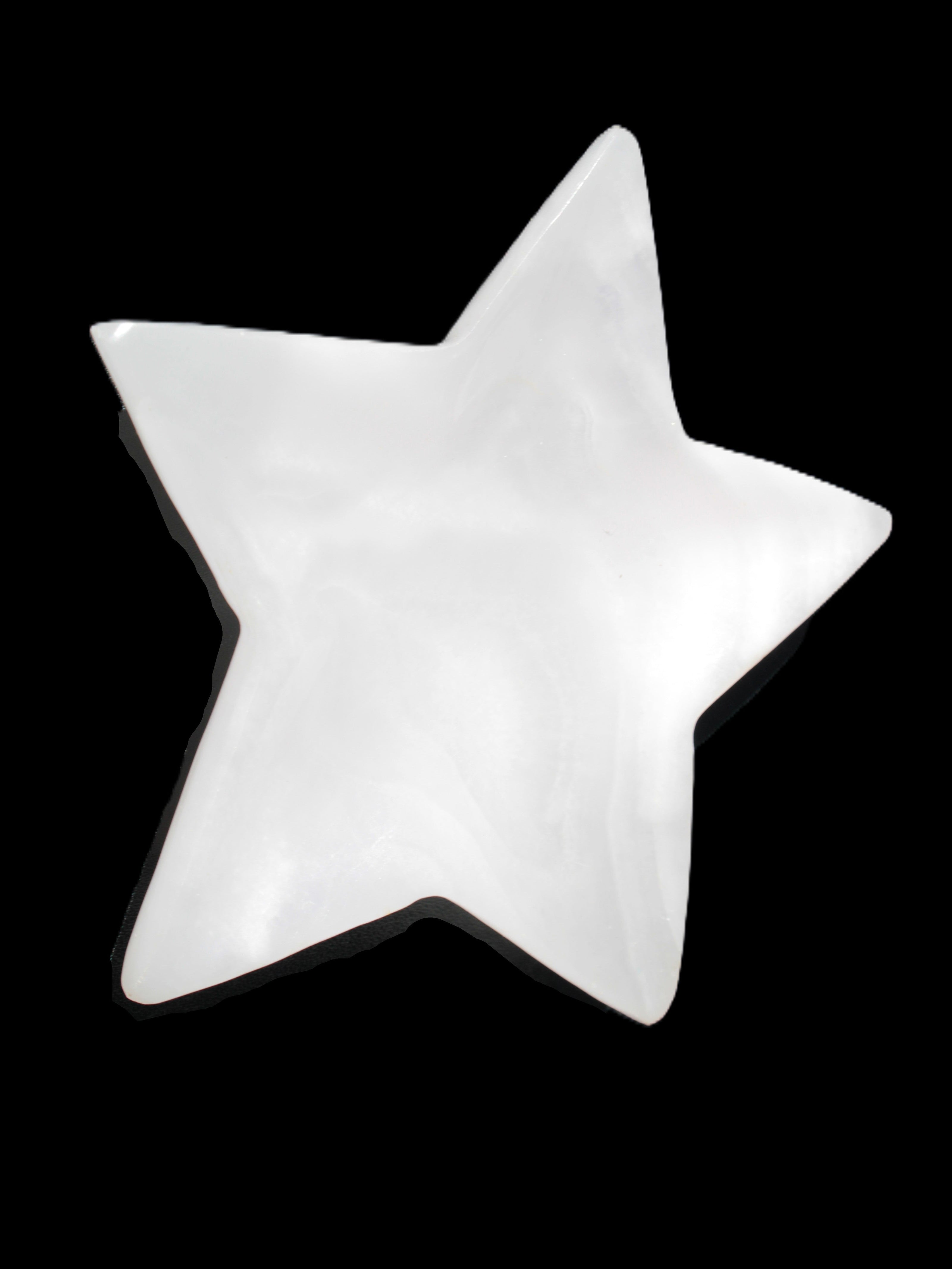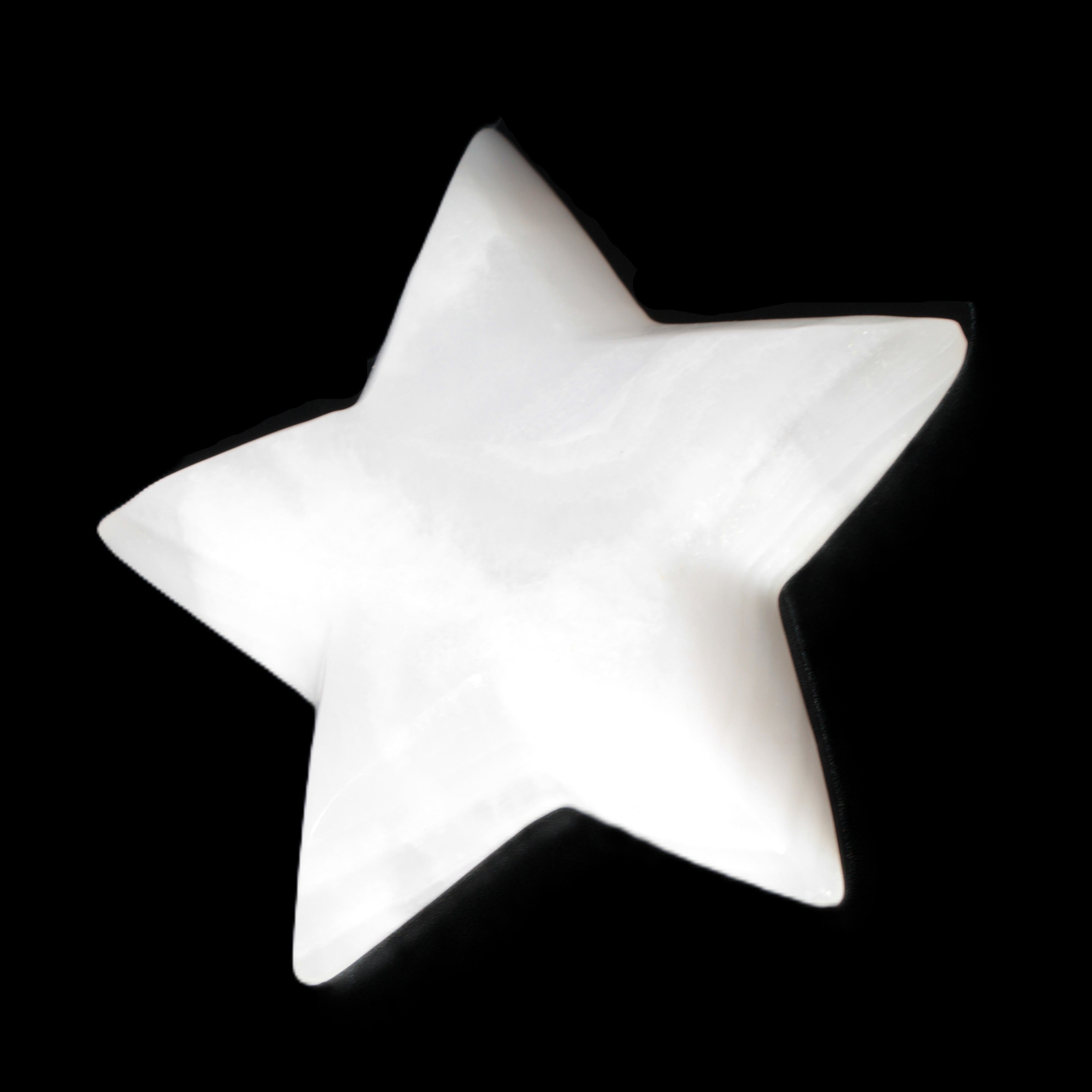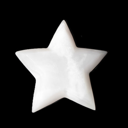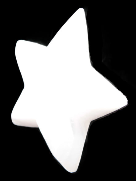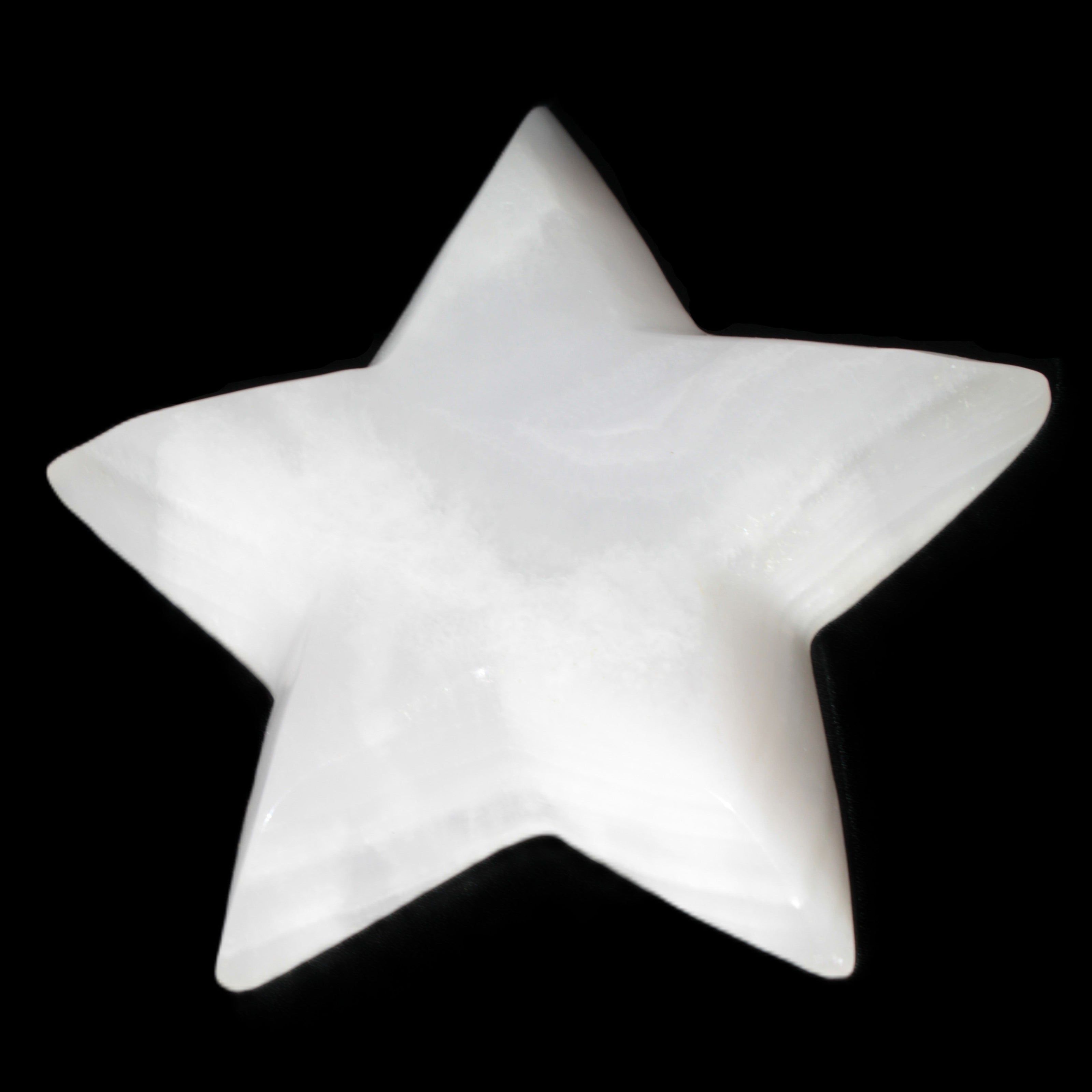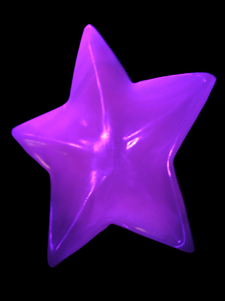 This Mangano Calcite star 108*18mm weighs 162.8g. It is indented, so it can be used as a small dish or stand. Mangano Calcite is a calcium carbonate mineral with a minimum of 30 per cent manganese carbonate present. The calcium and manganese carbonates can be banded. The presence of manganese makes Mangano Calcite react to ultraviolet light, giving it a bright hot-pink glow.