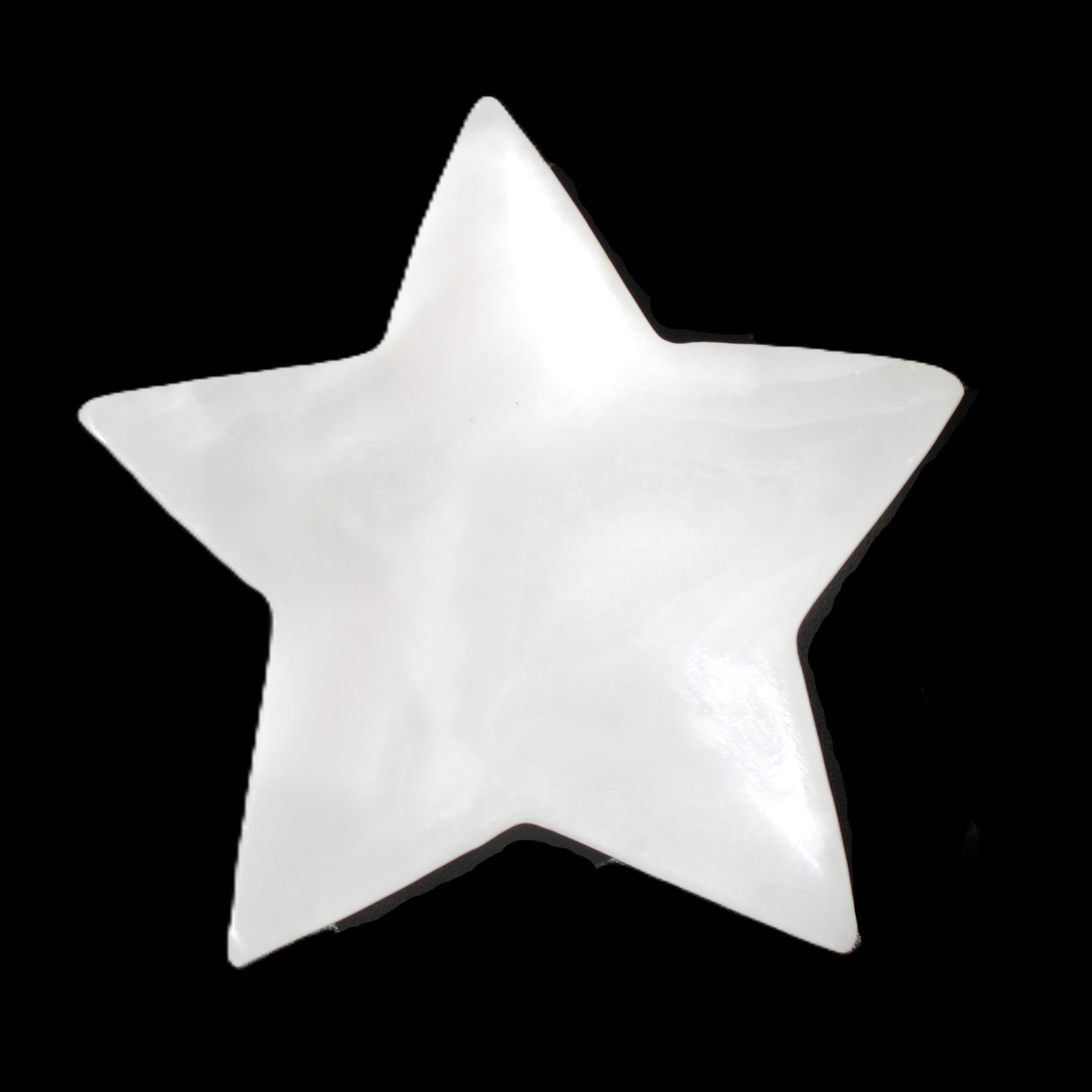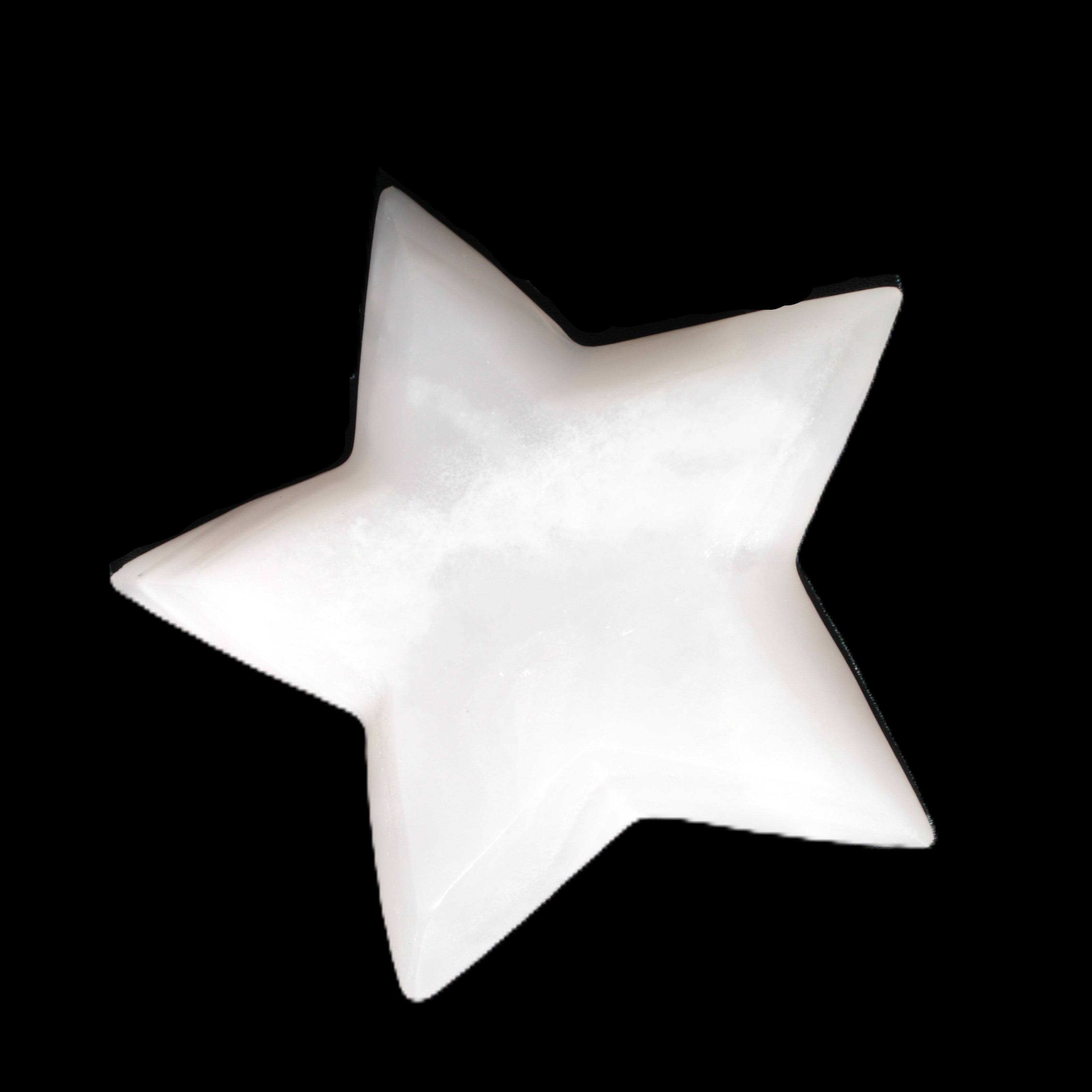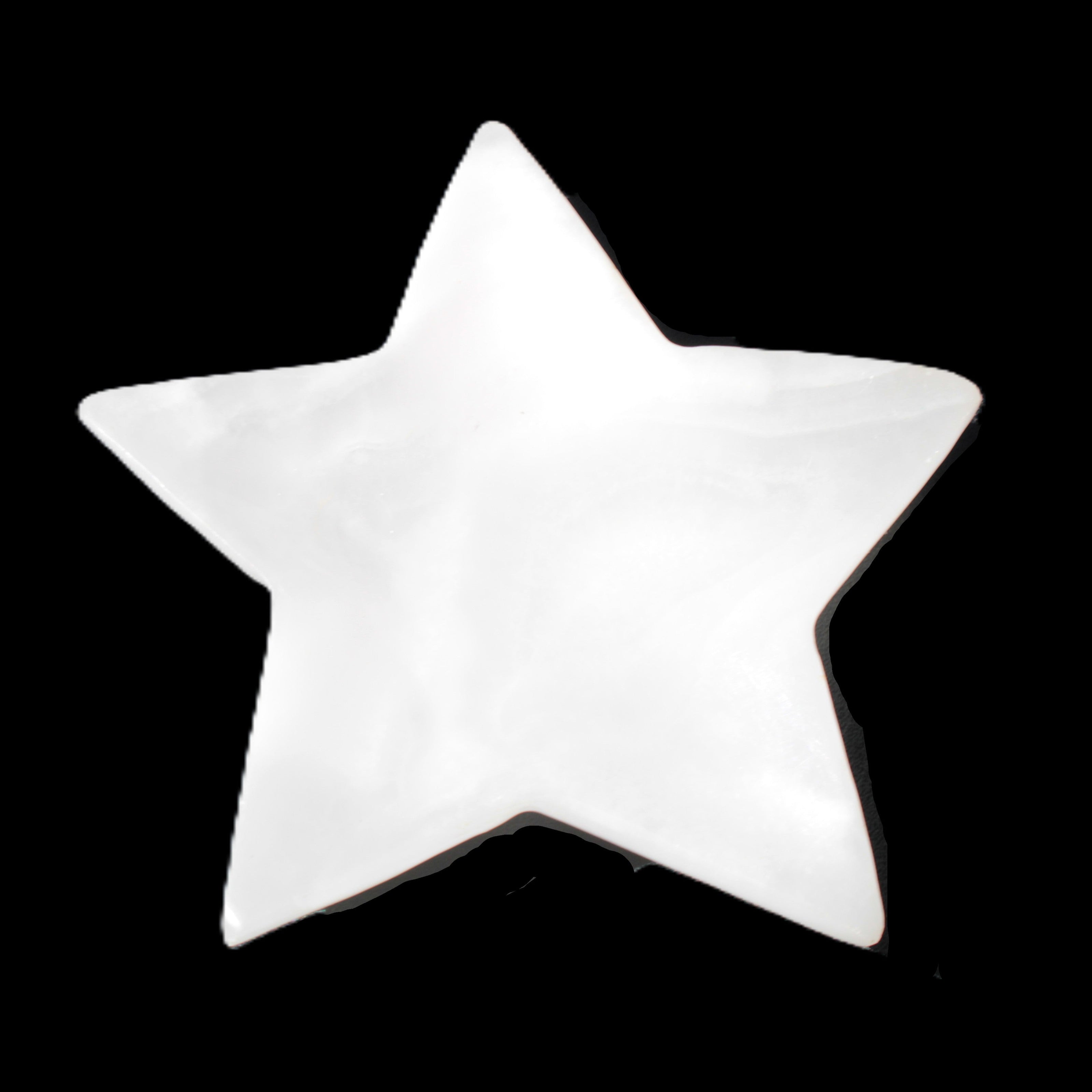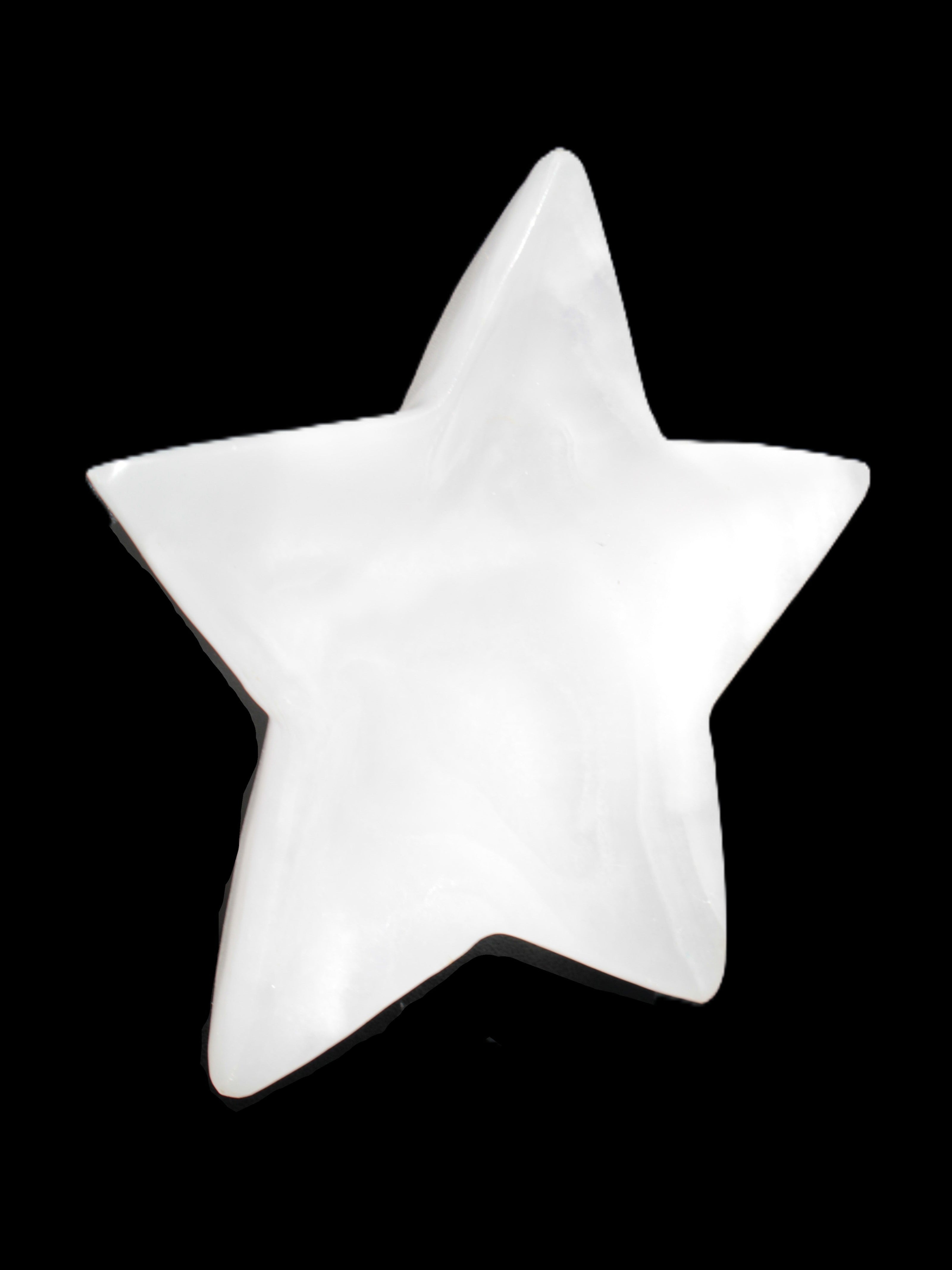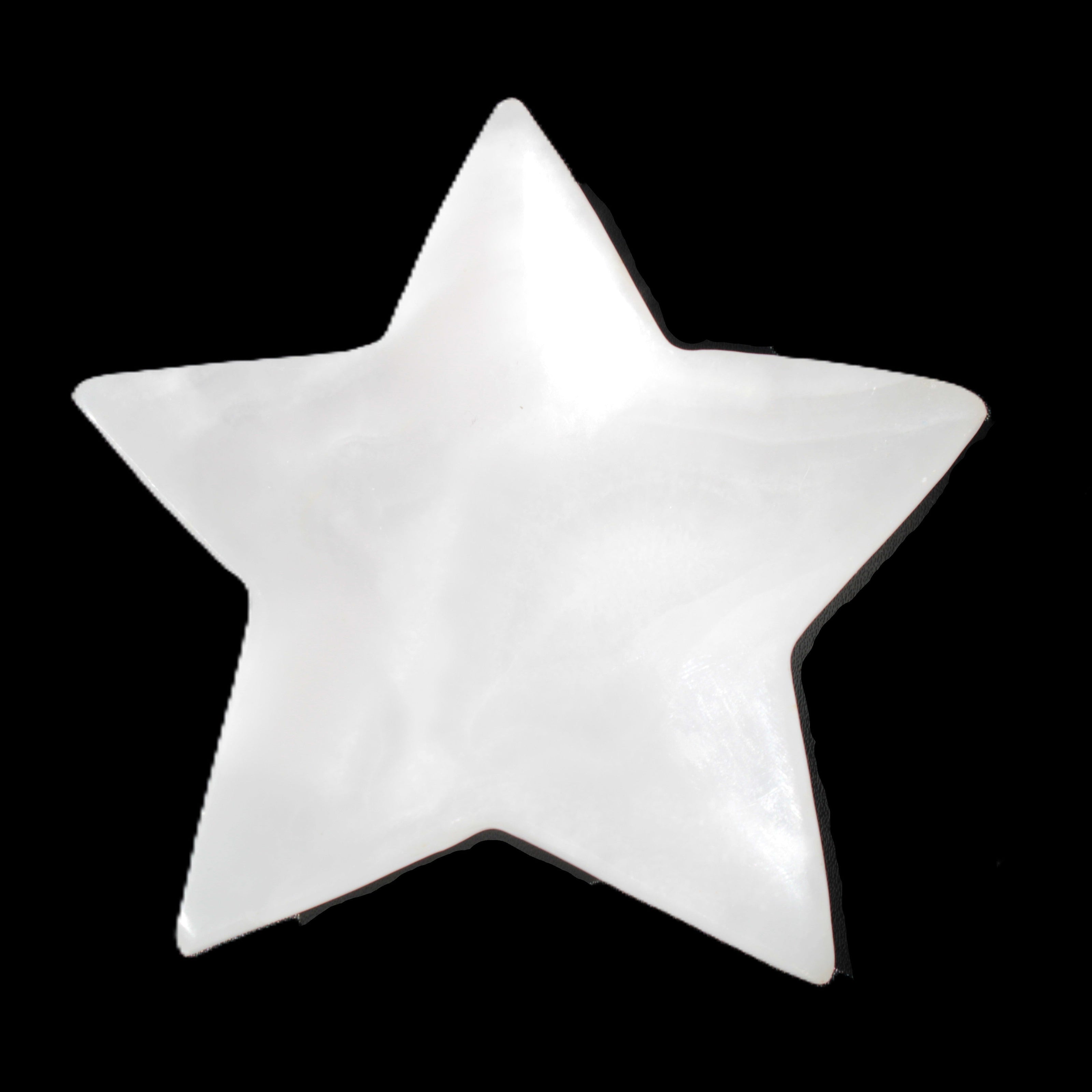 This Mangano Calcite star 108*18mm weighs 162.8g. It is indented, so it can be used as a small dish or stand. Mangano Calcite is a calcium carbonate mineral with a minimum of 30 per cent manganese carbonate present. The calcium and manganese carbonates can be banded. The presence of manganese makes Mangano Calcite react to ultraviolet light, giving it a bright hot-pink glow.