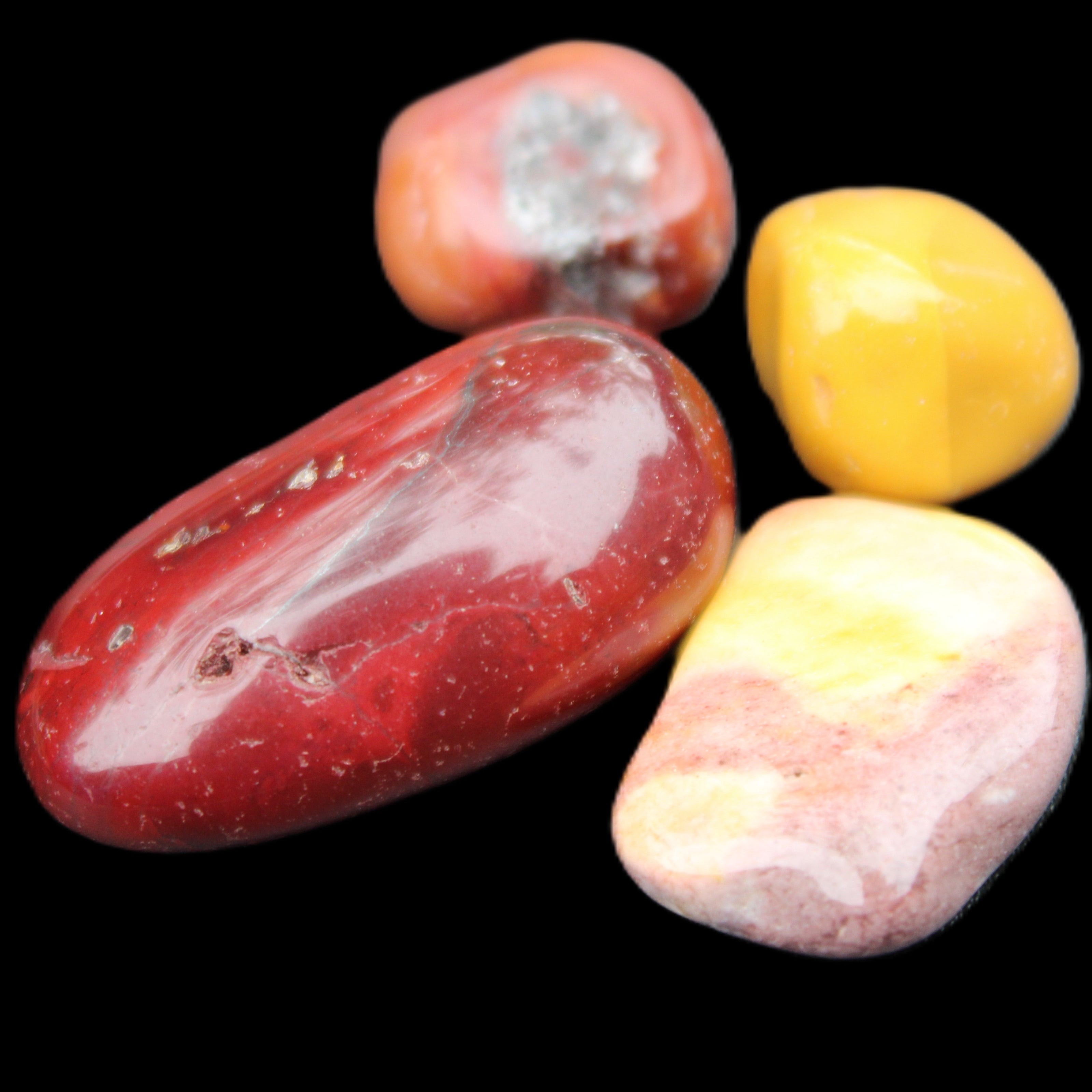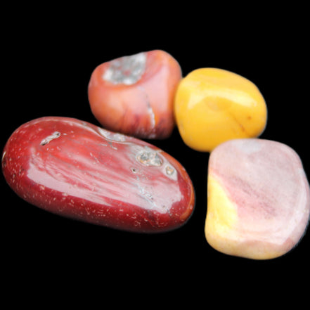 These Mookaite 4 tumble polished stones selections weigh 24g. They show a range of the distinctive earthy soft tones of this beautiful Australian stone. Mookaite formed under the Mooka Creek, which flows through a deposit of fossilized microplankton from the Cretaceous Period, which ended 66 million-years ago. The water percolating down through this ancient seabed of tiny fossils created a stunning rock with bright reds, yellows, purples and other deep colours of nature. Every stone is different with a variable composition of Chert and Chalcedony.