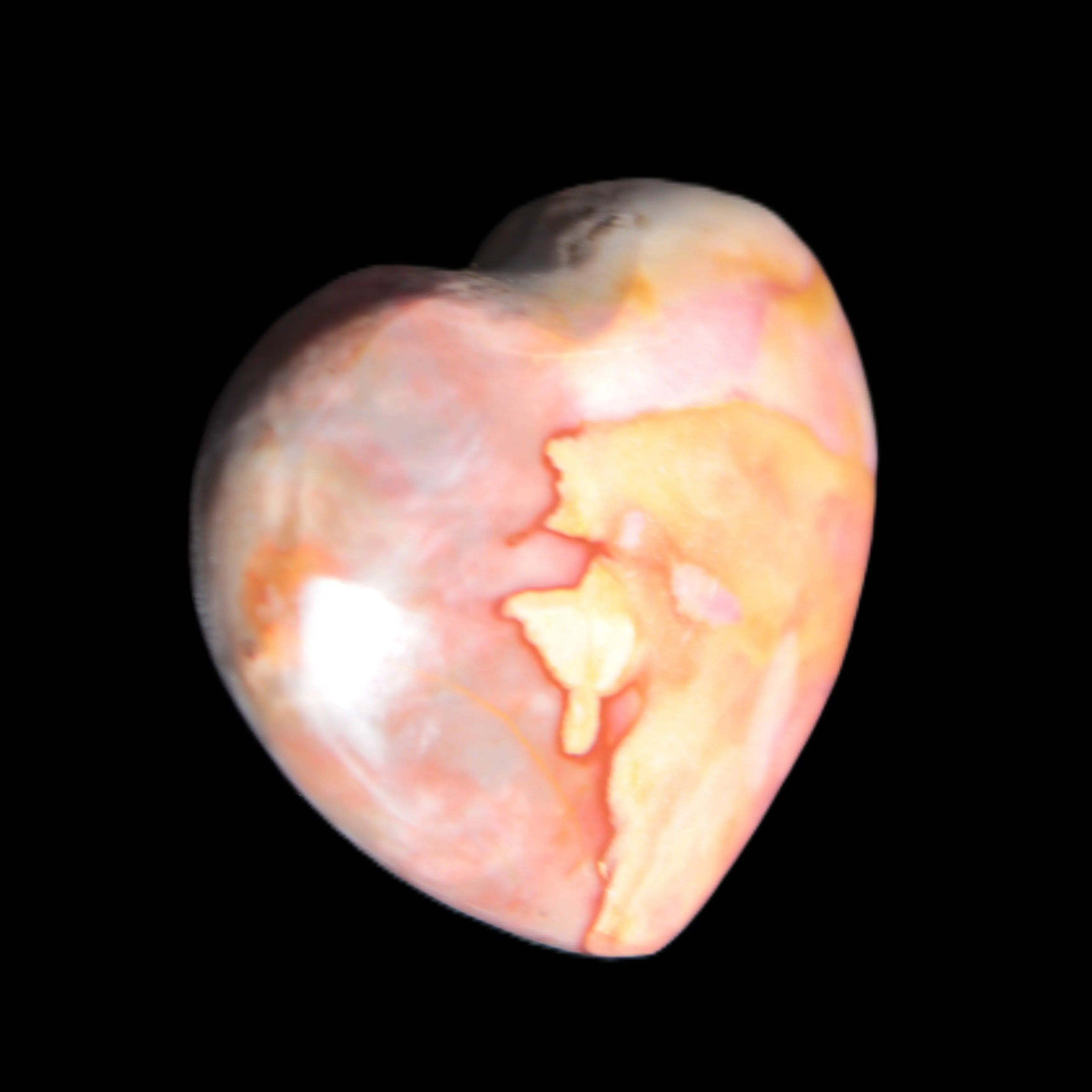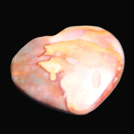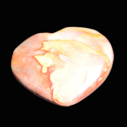 This Mookaite heart is 335mm in width and weighs 18g. It features a range of soft Mookaite tones. Mookaite formed under the Mooka Creek in Western Australia. This creek flows through a deposit of fossilized microplankton from the Cretaceous Period, which ended 66 million-years ago. The water percolating down through this ancient seabed of tiny fossils created a stunning rock with bright reds, yellows, purples and other deep colours of nature. Every stone is different with a variable composition of Chert and Chalcedony.