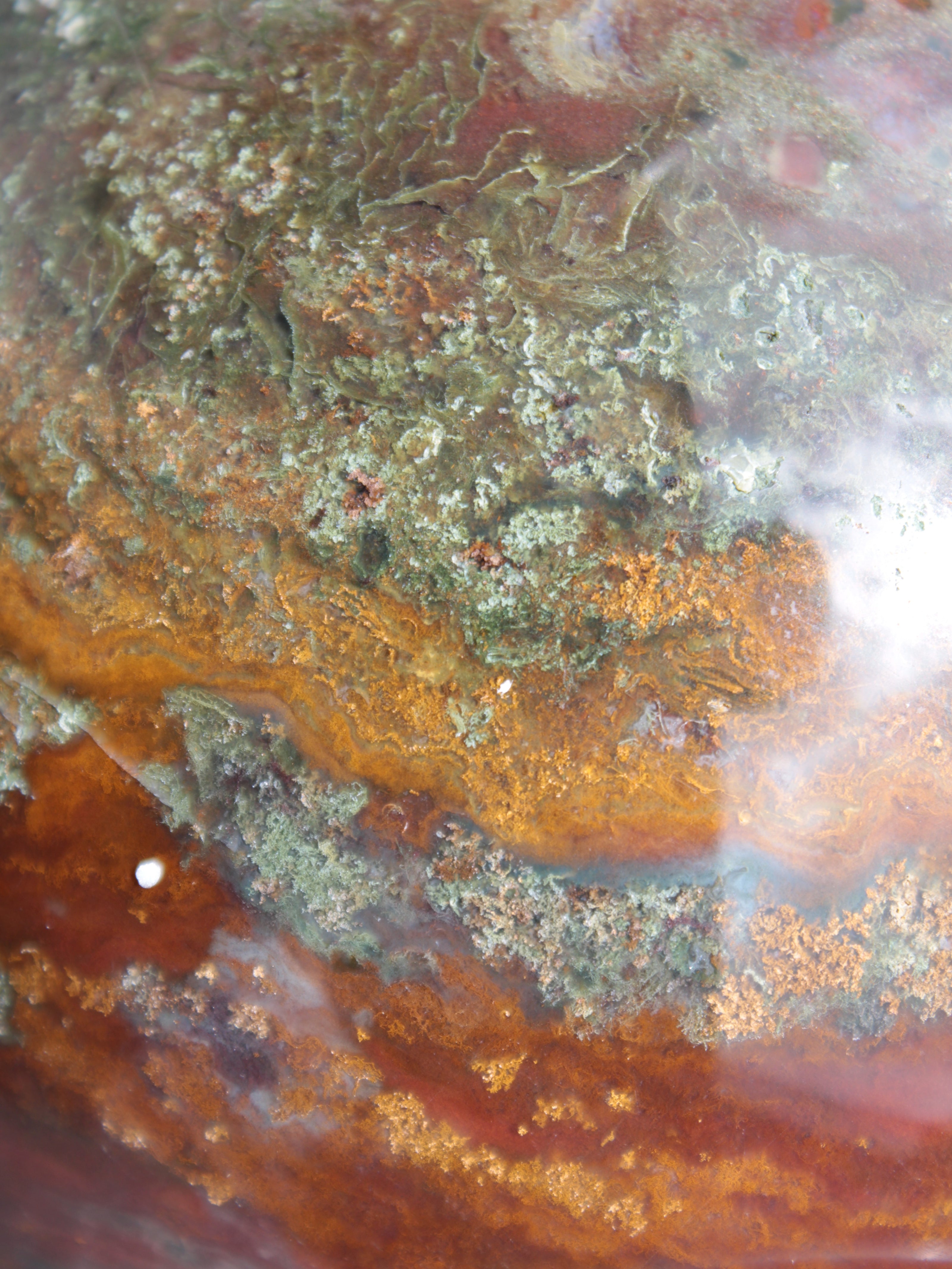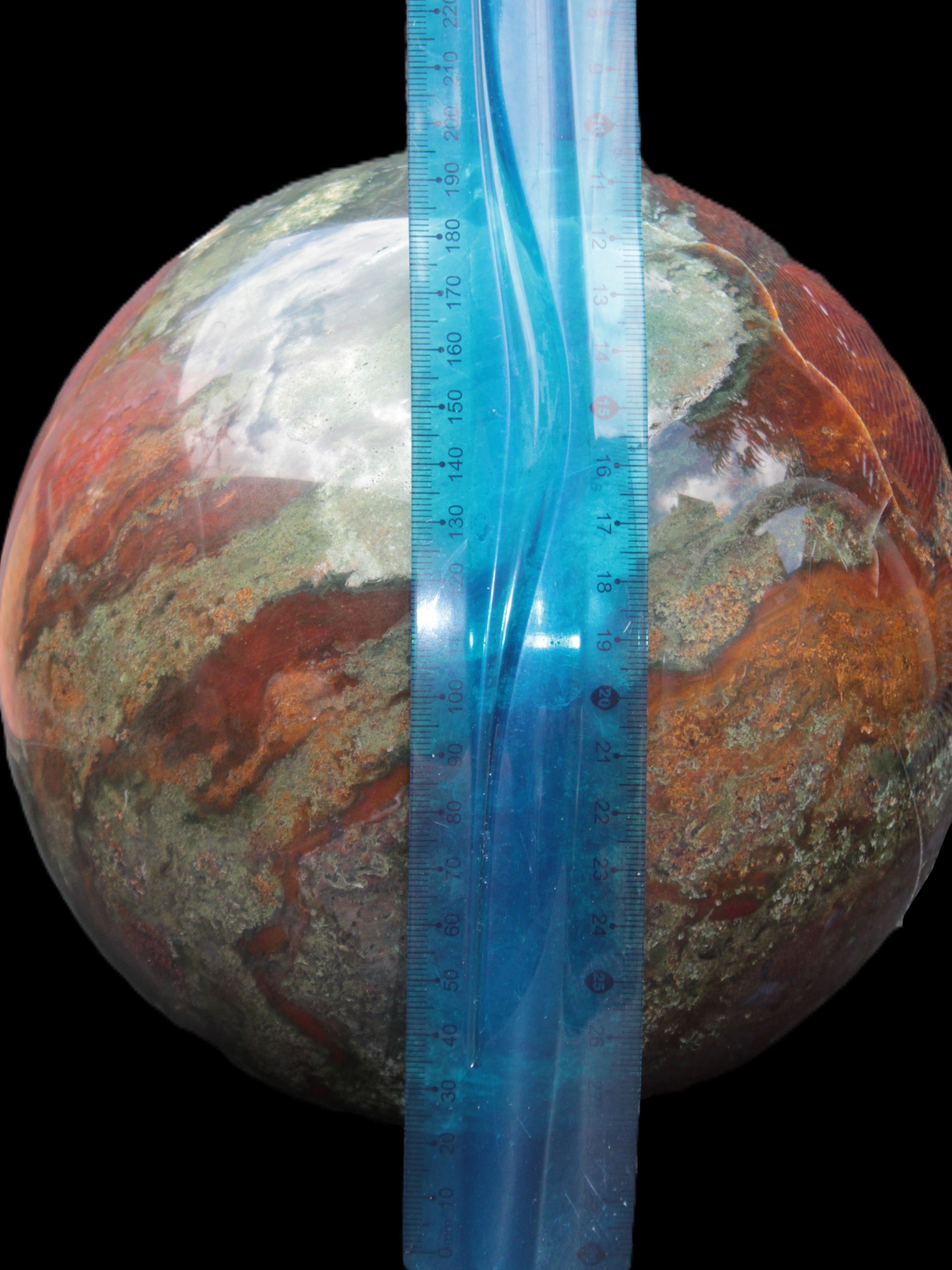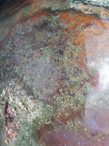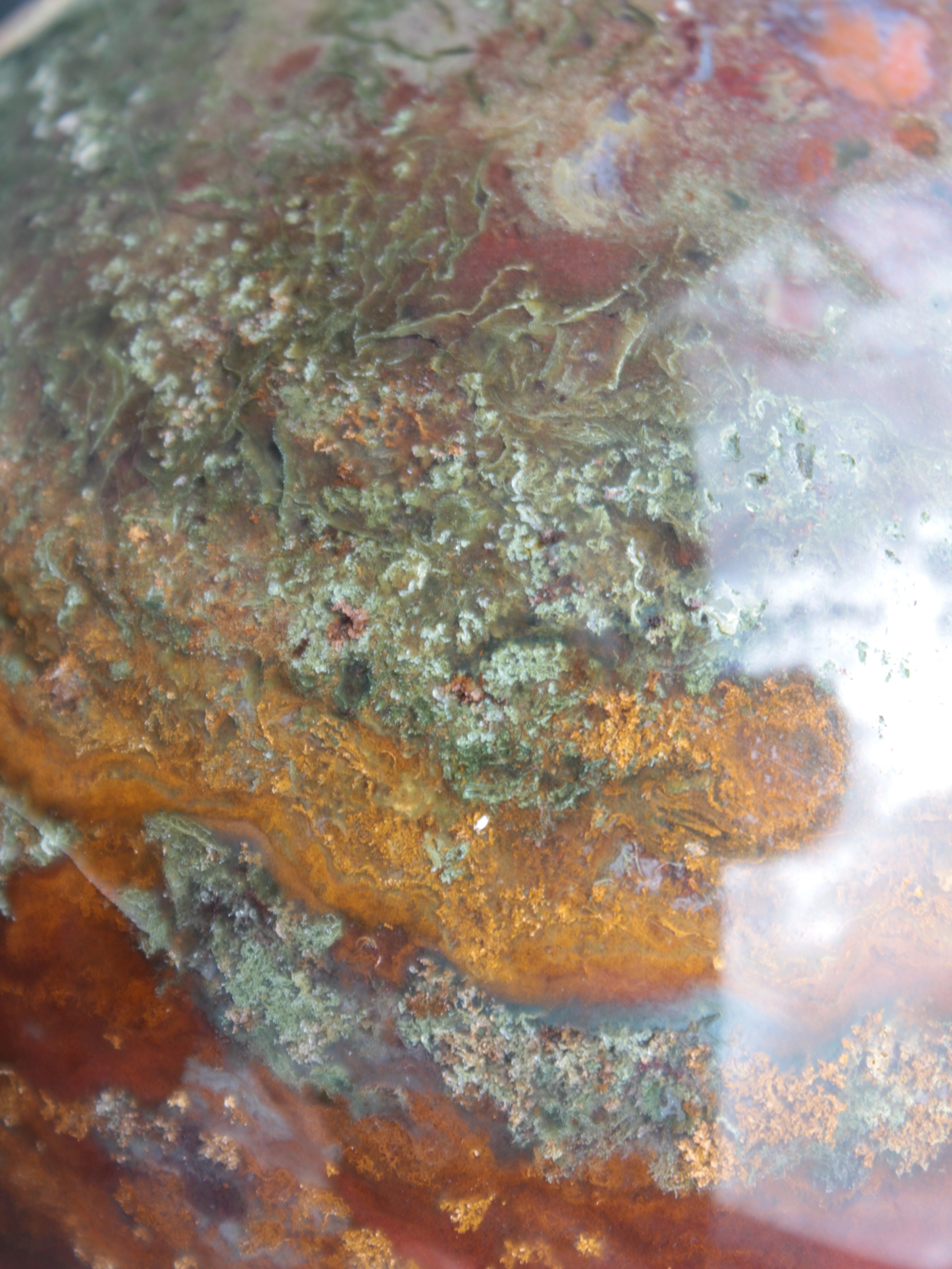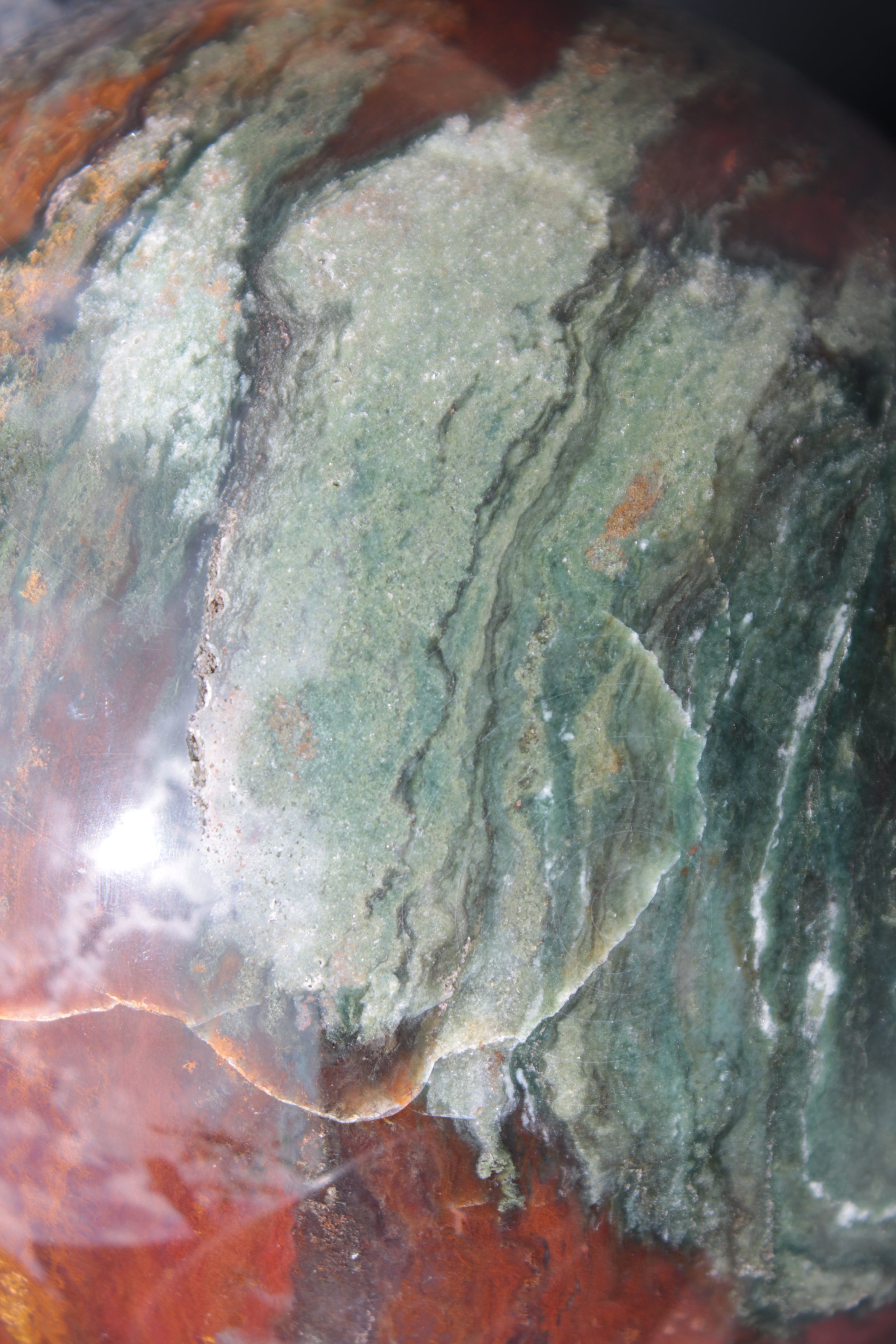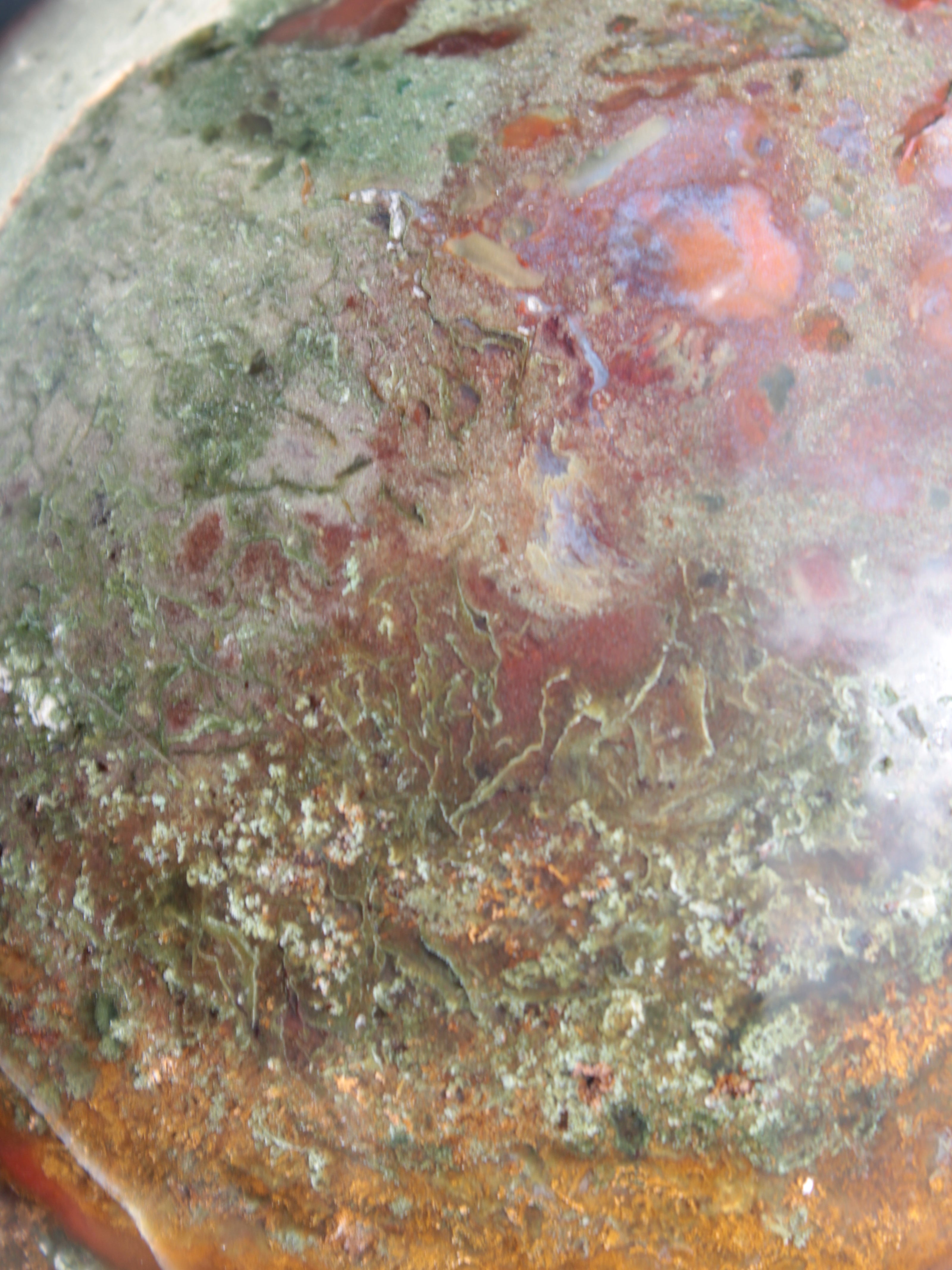 This Moss Agate Ocean Jasper sphere weighs 9480g. Its diameter is a big 191mm. Apart from its huge size, it also gives a stunning combination of Ocean Jasper and Ocean Moss Agate. This combination and its spectrum of colours mean that this sphere is one of those stones that connects with all of the chakras