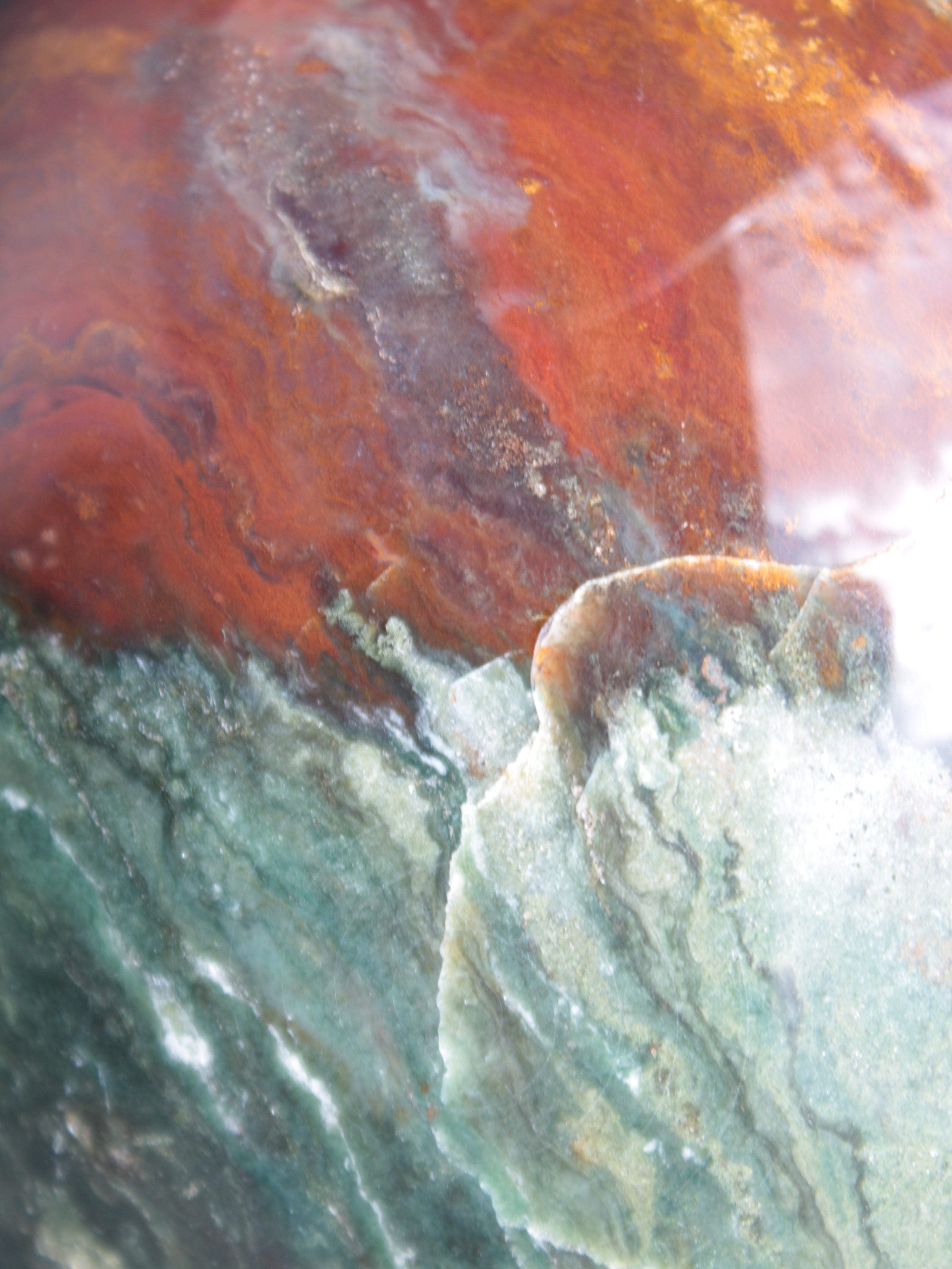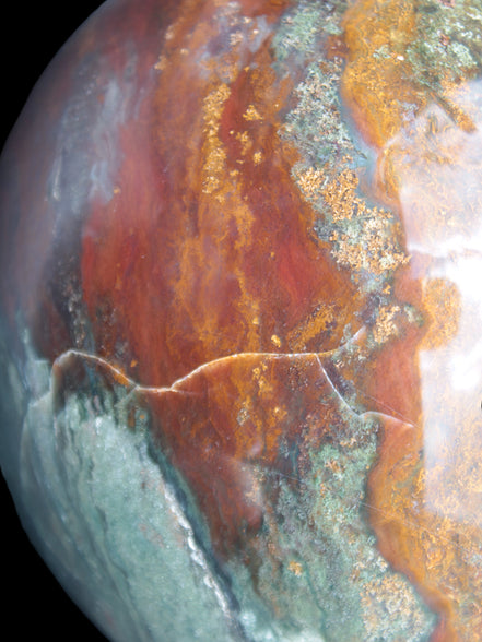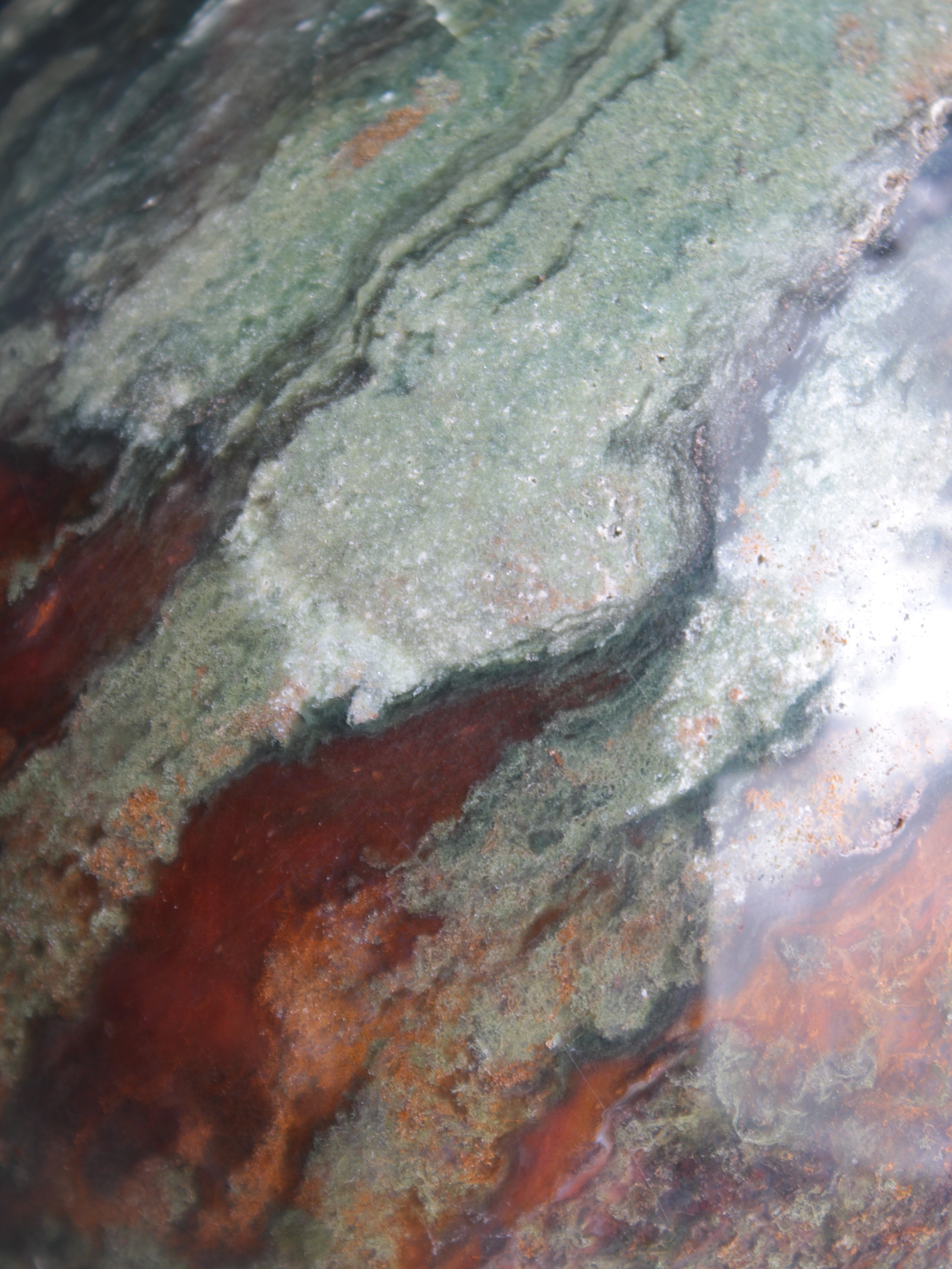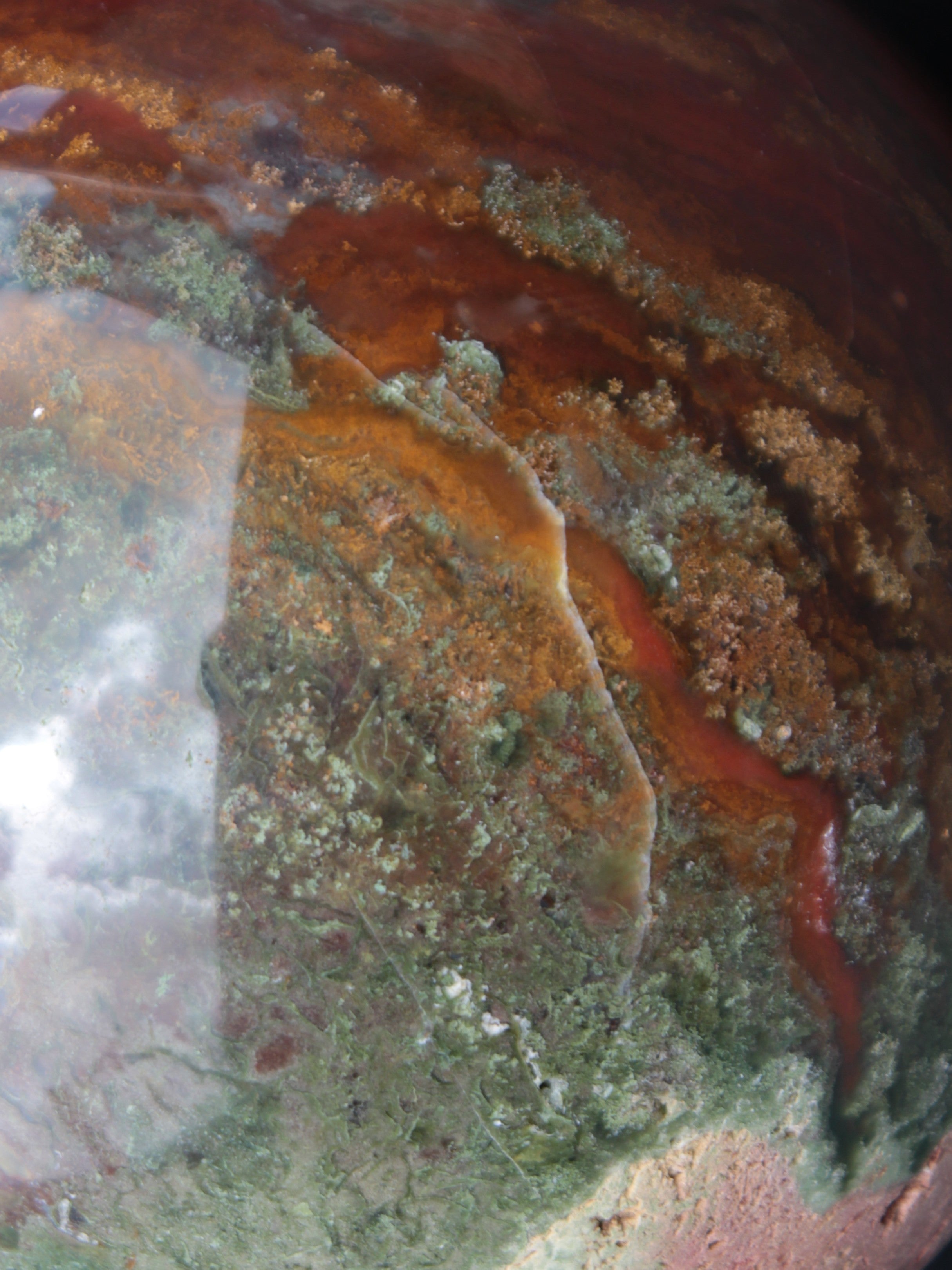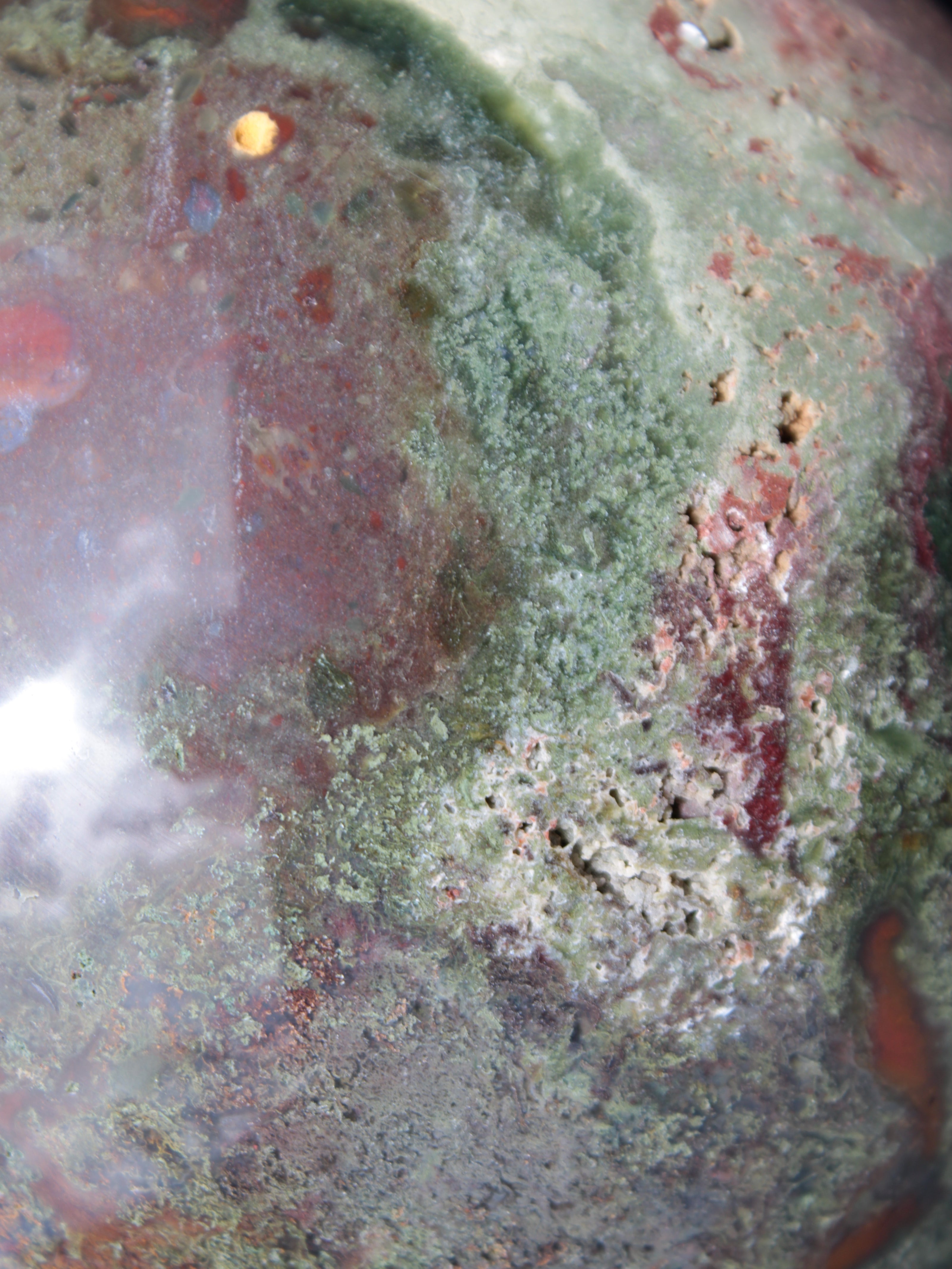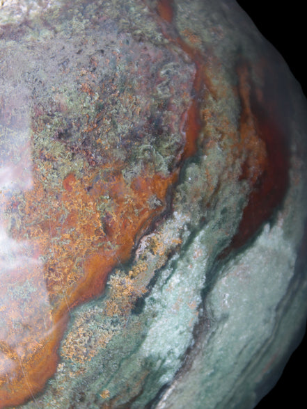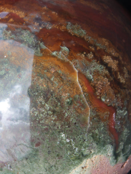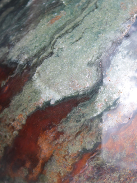 This Moss Agate Ocean Jasper sphere weighs 9480g. Its diameter is a big 191mm. Apart from its huge size, it also gives a stunning combination of Ocean Jasper and Ocean Moss Agate. This combination and its spectrum of colours mean that this sphere is one of those stones that connects with all of the chakras