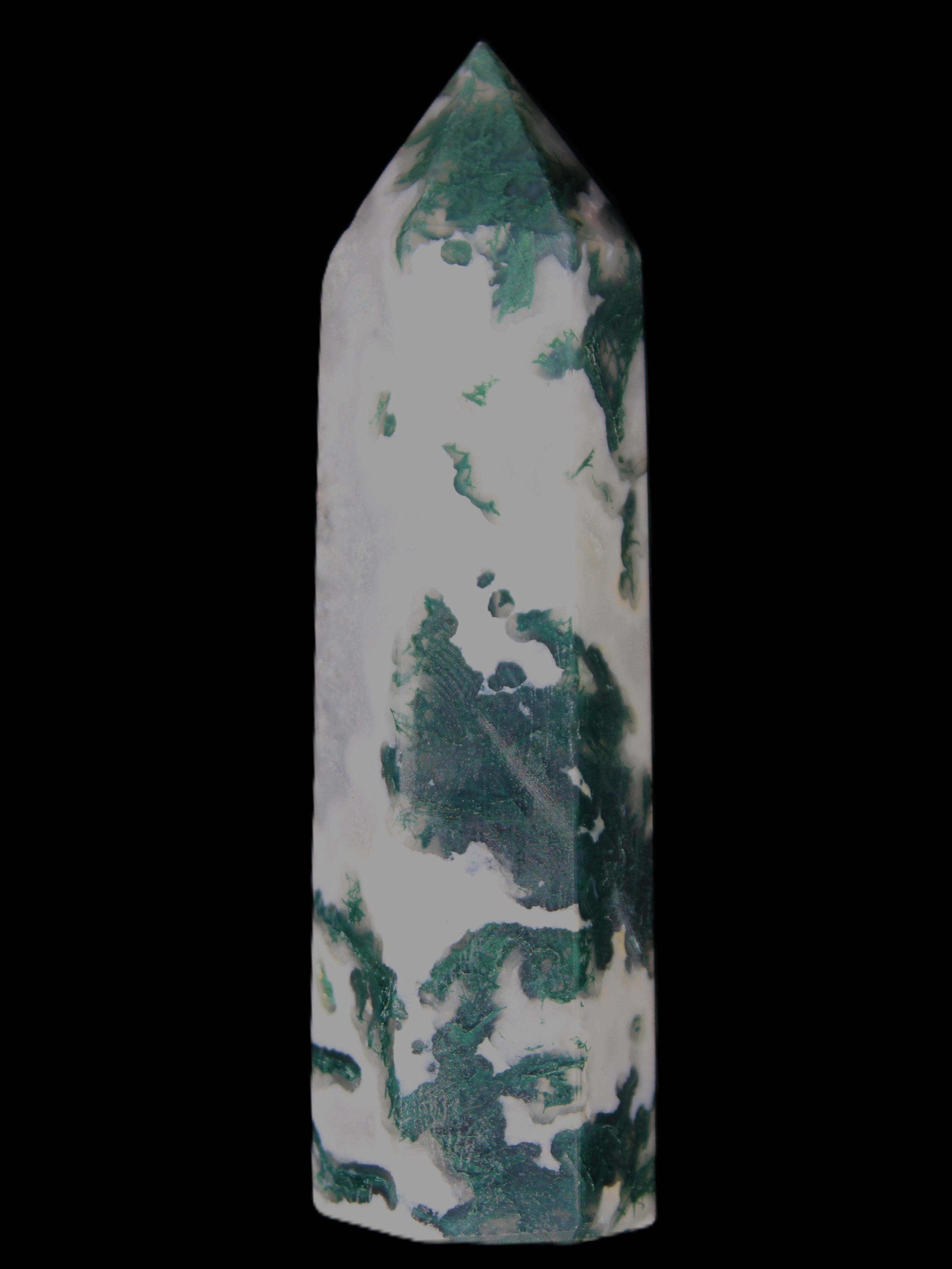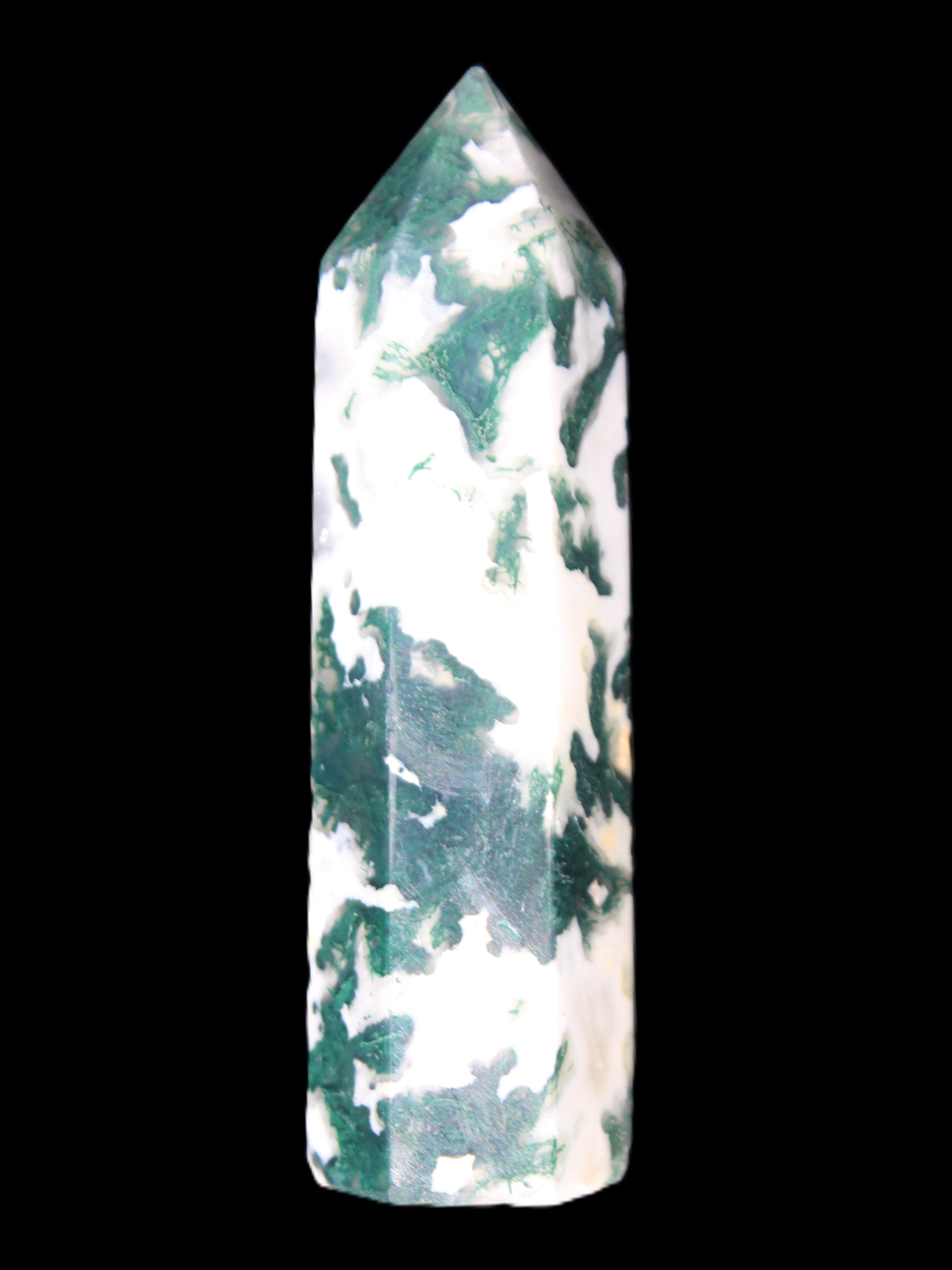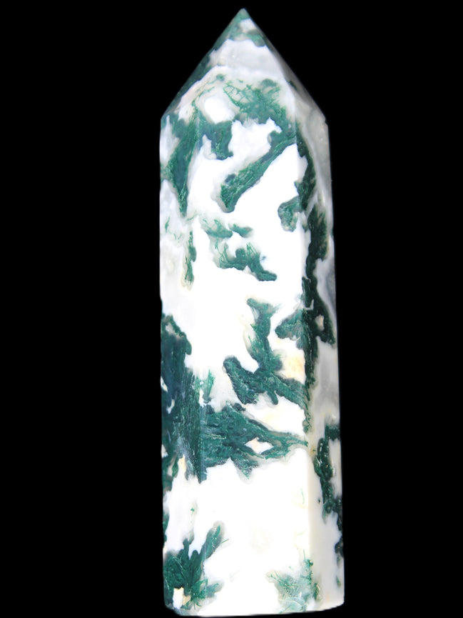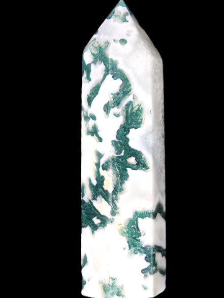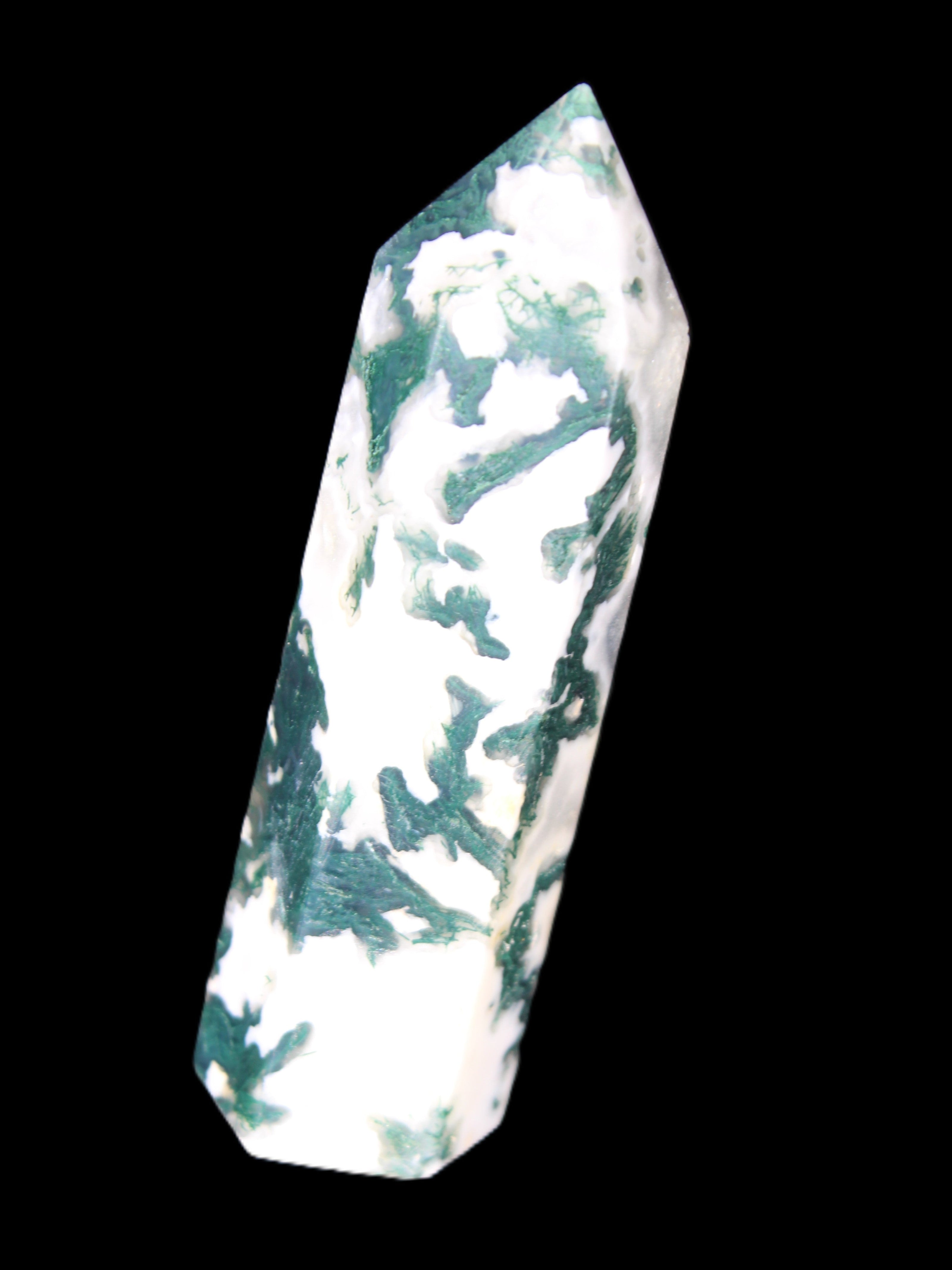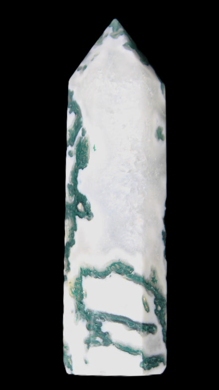 Moss Agate is a form of Chalcedony with embedded green minerals formed from oxidised Iron, Manganese and other elements. These green strands in the stone have the appearance of moss-like tendrils. It is not a true agate as it lacks agate banding.