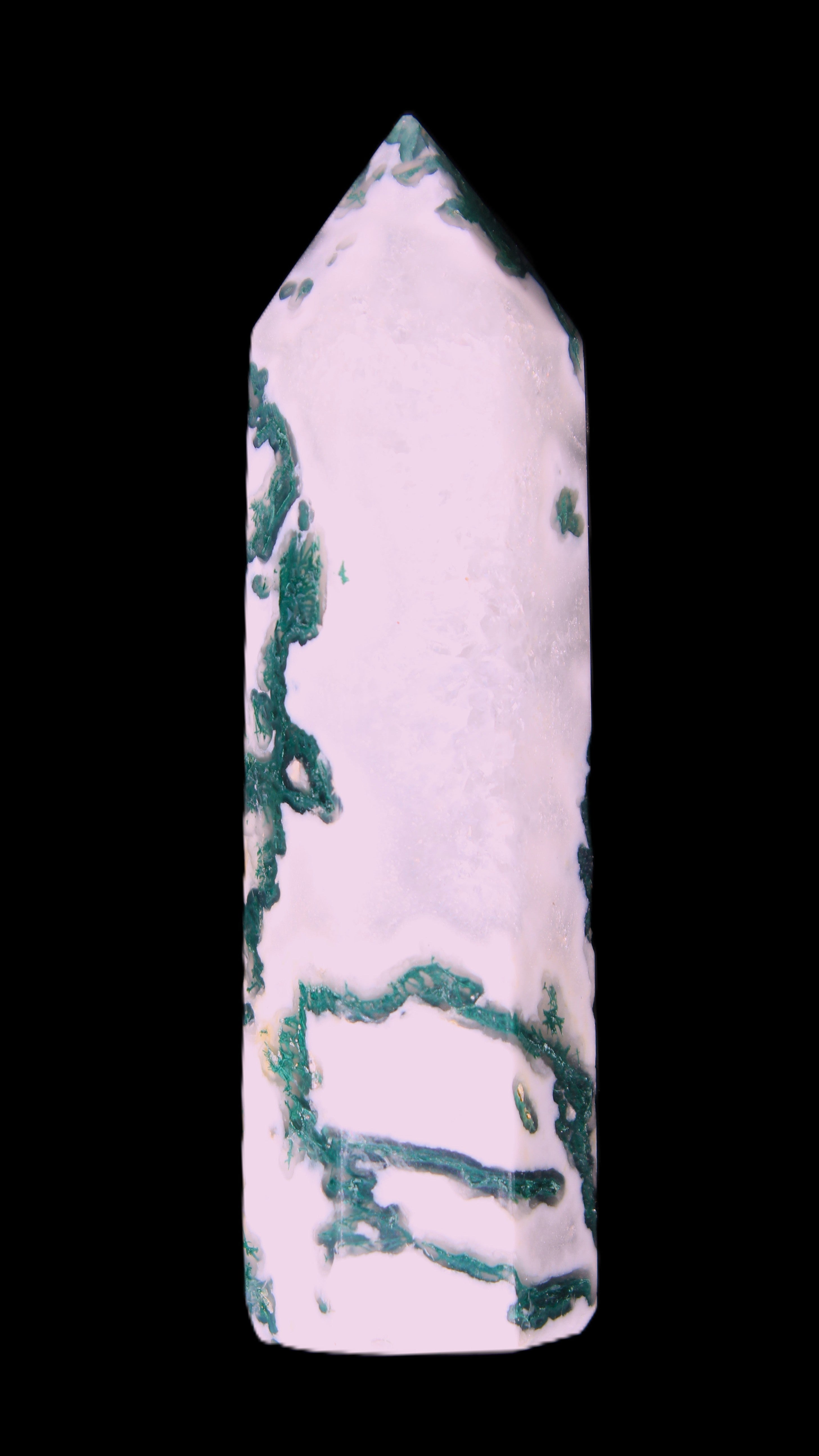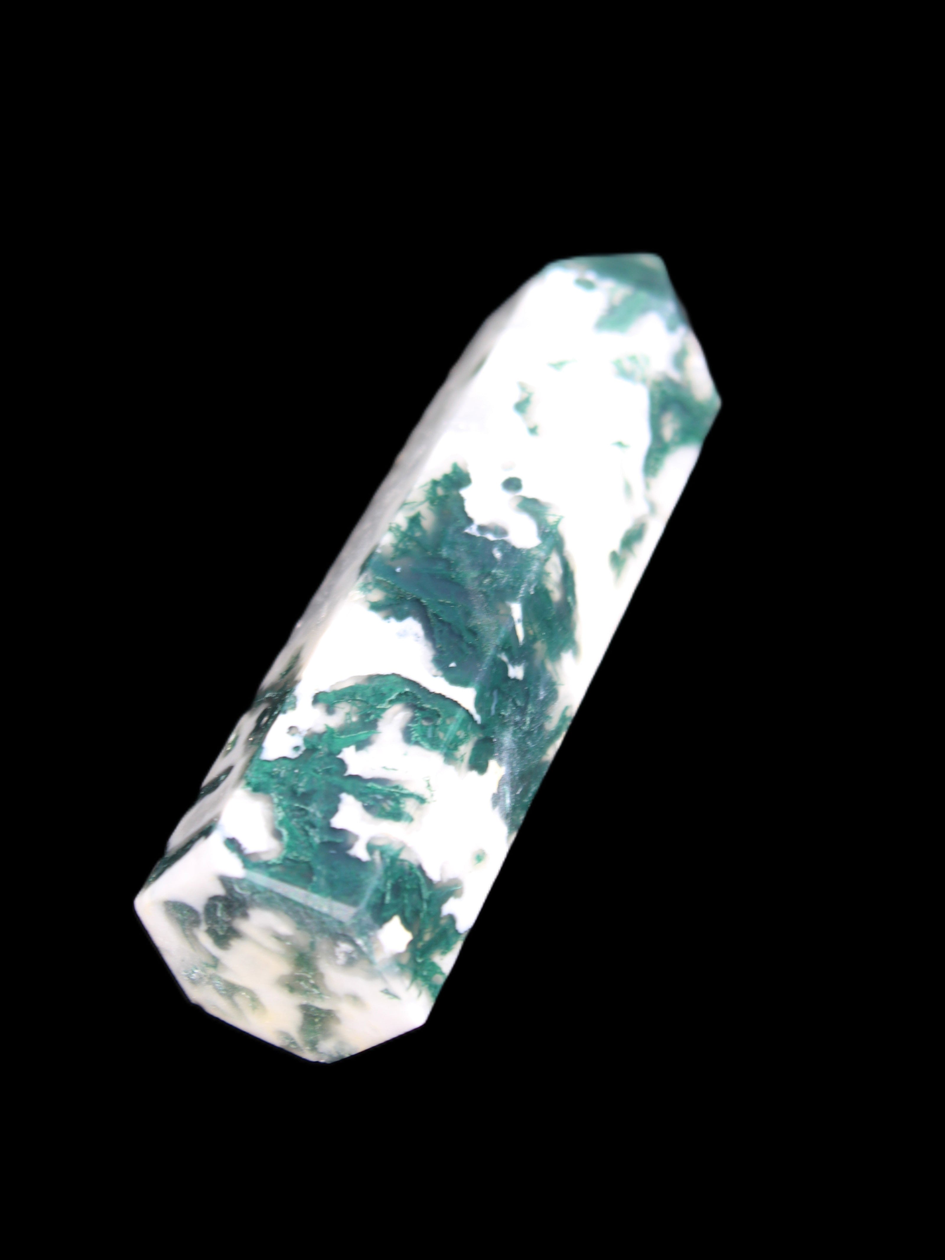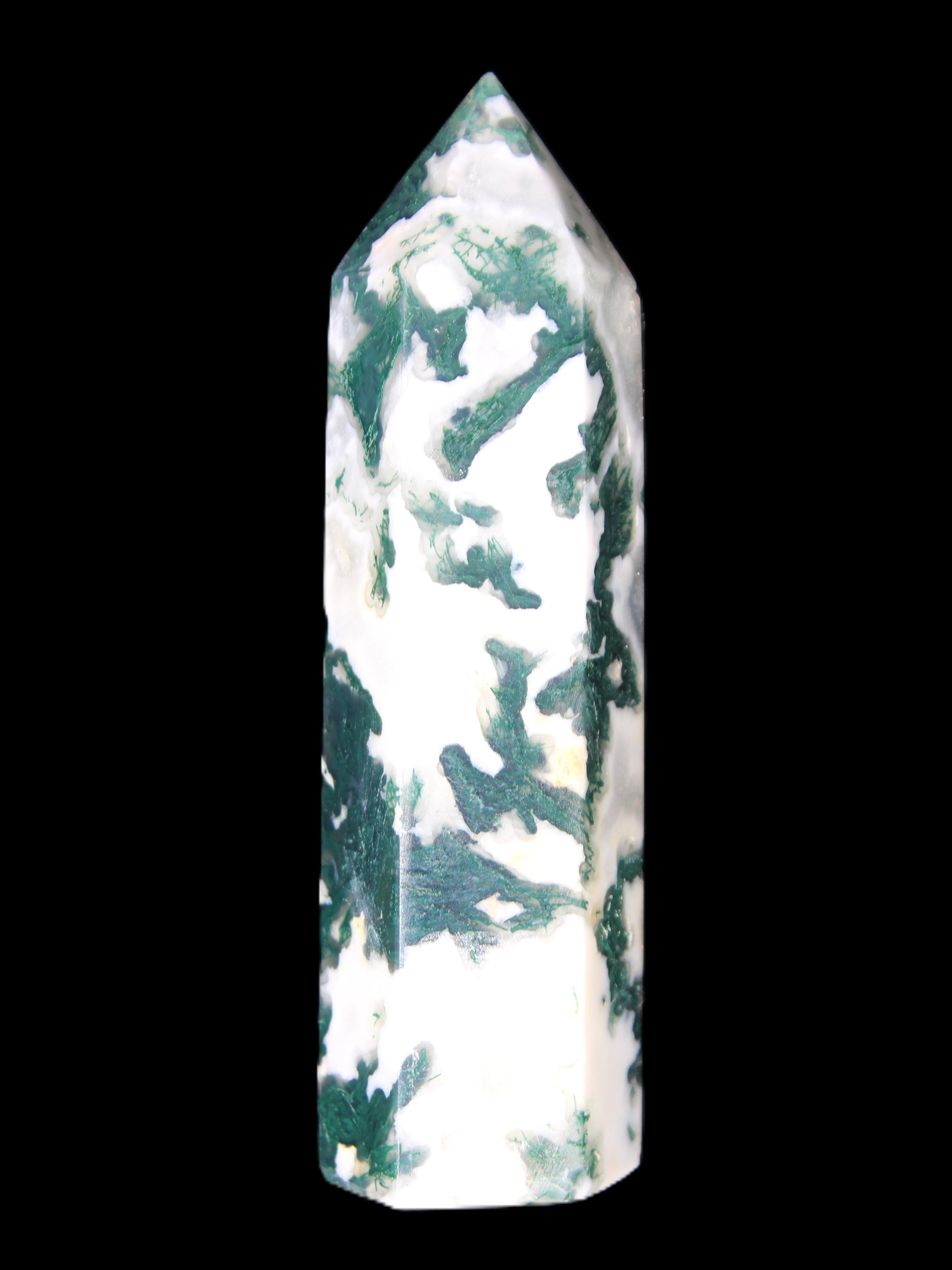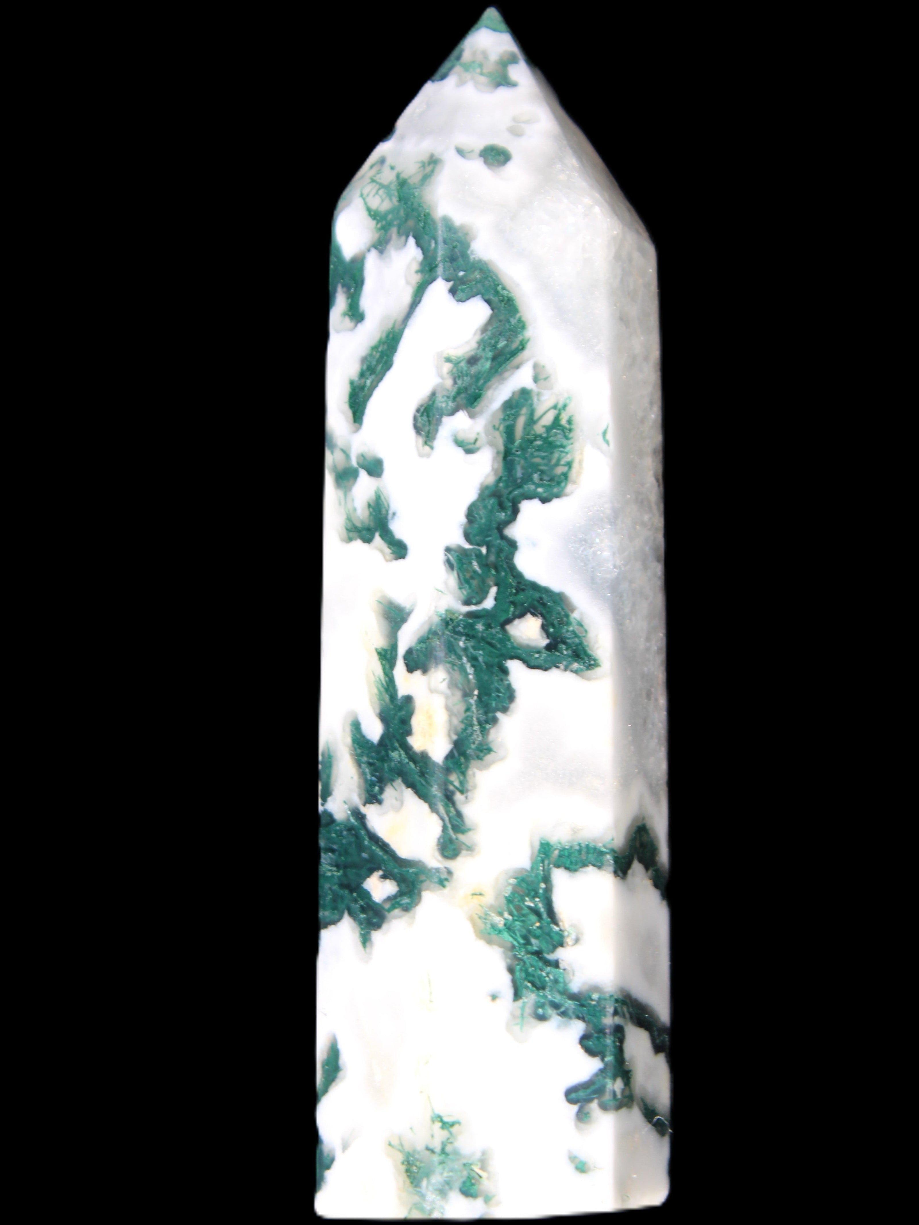 Moss Agate is a form of Chalcedony with embedded green minerals formed from oxidised Iron, Manganese and other elements. These green strands in the stone have the appearance of moss-like tendrils. It is not a true agate as it lacks agate banding.