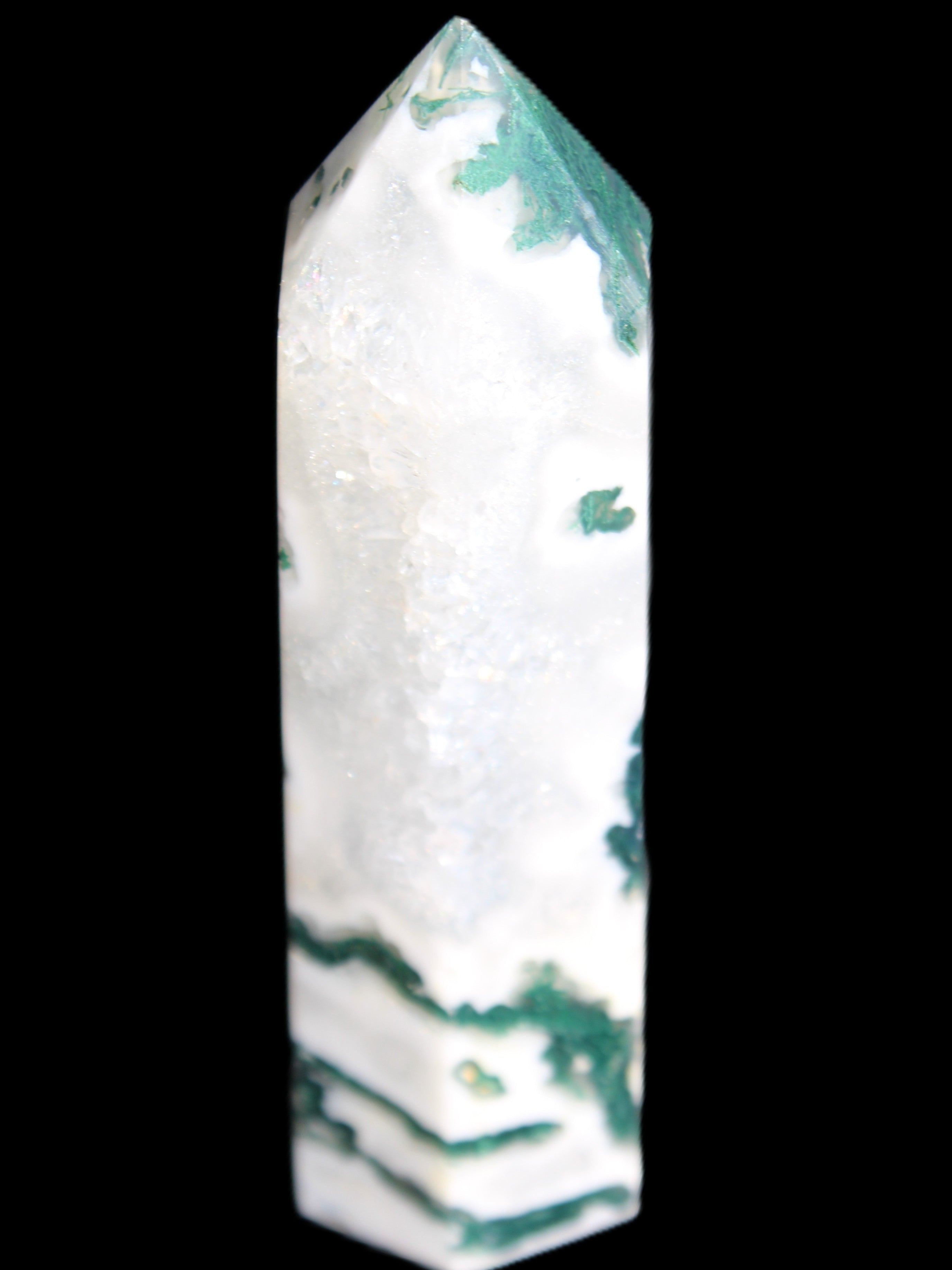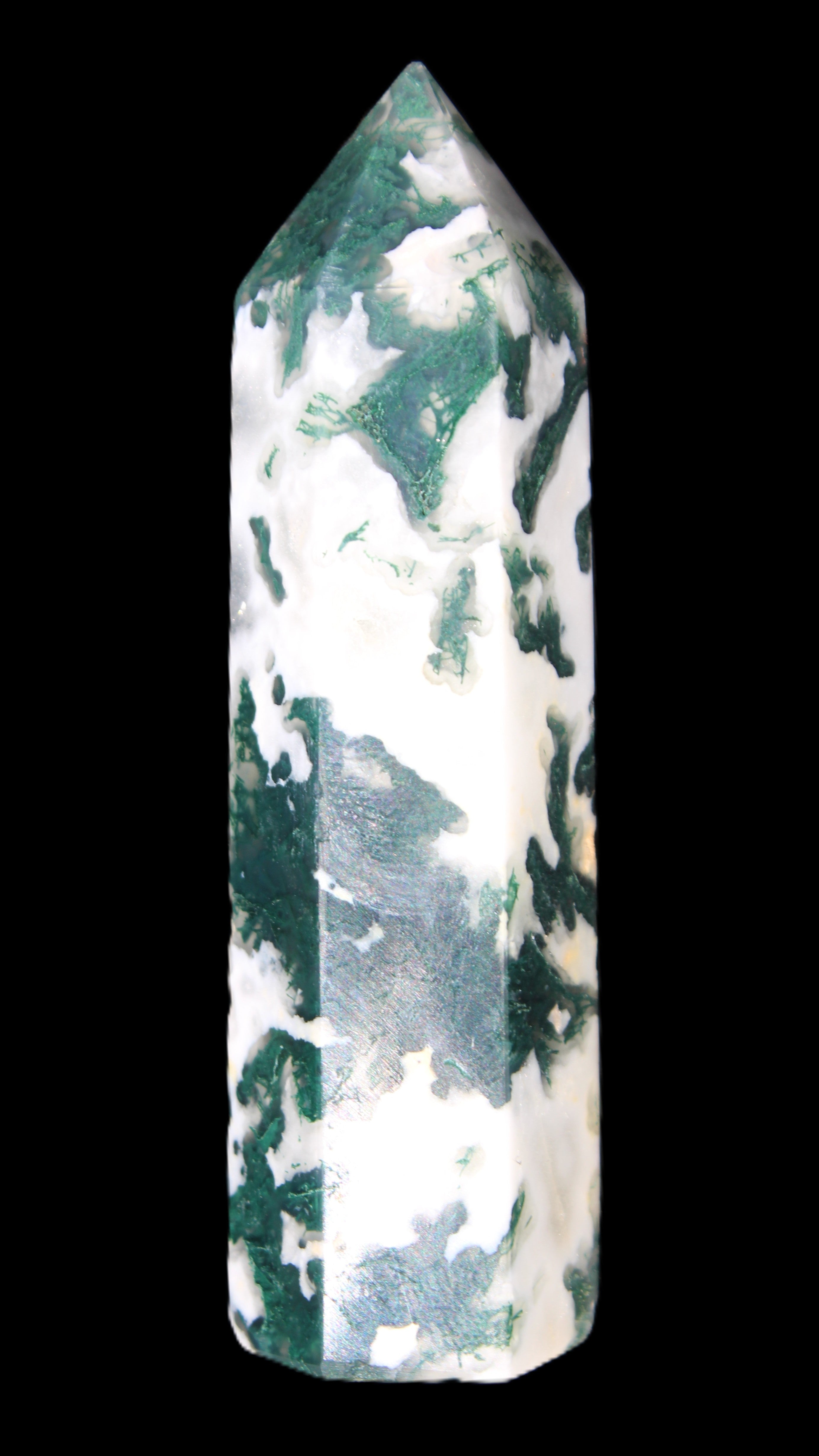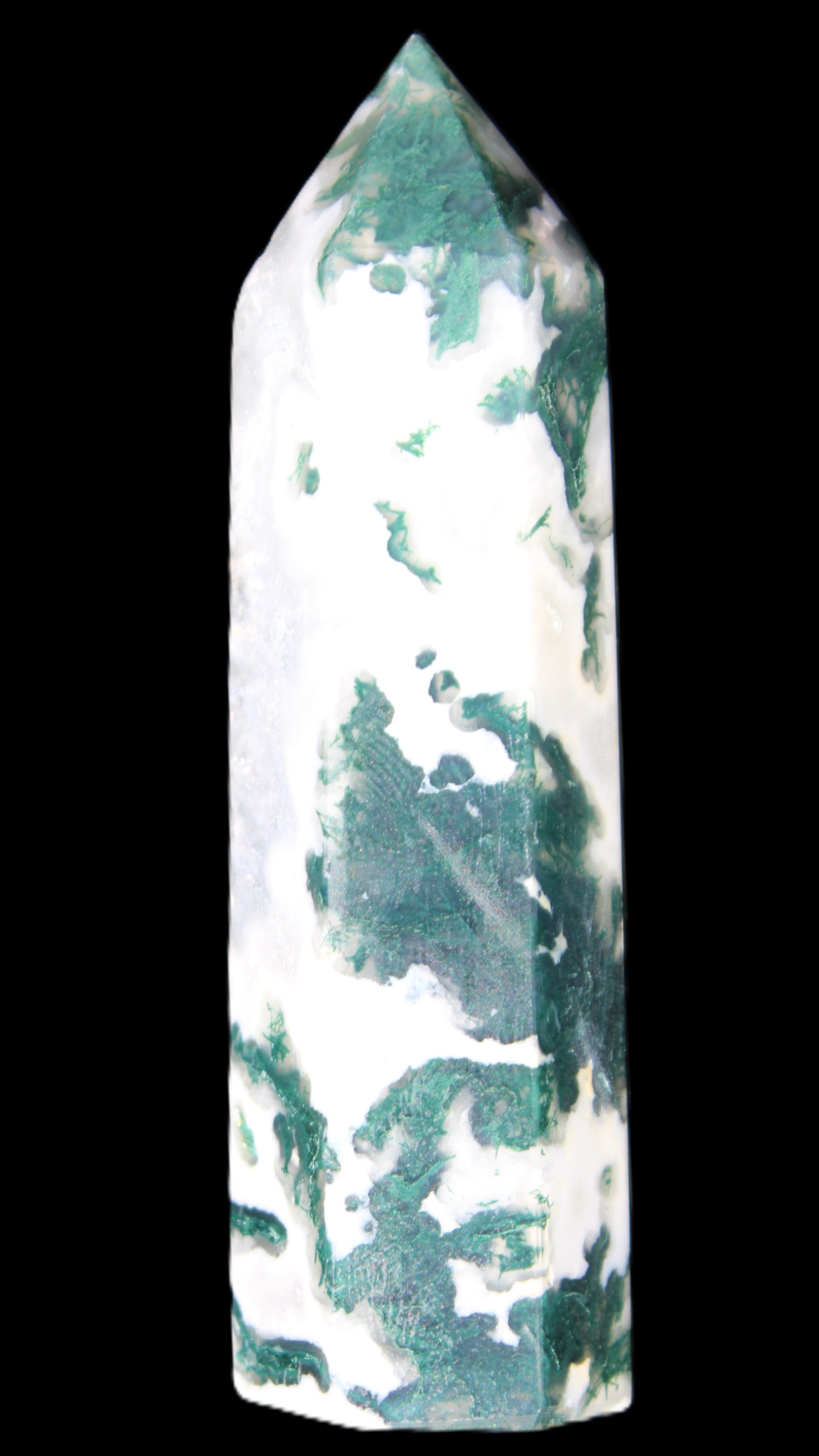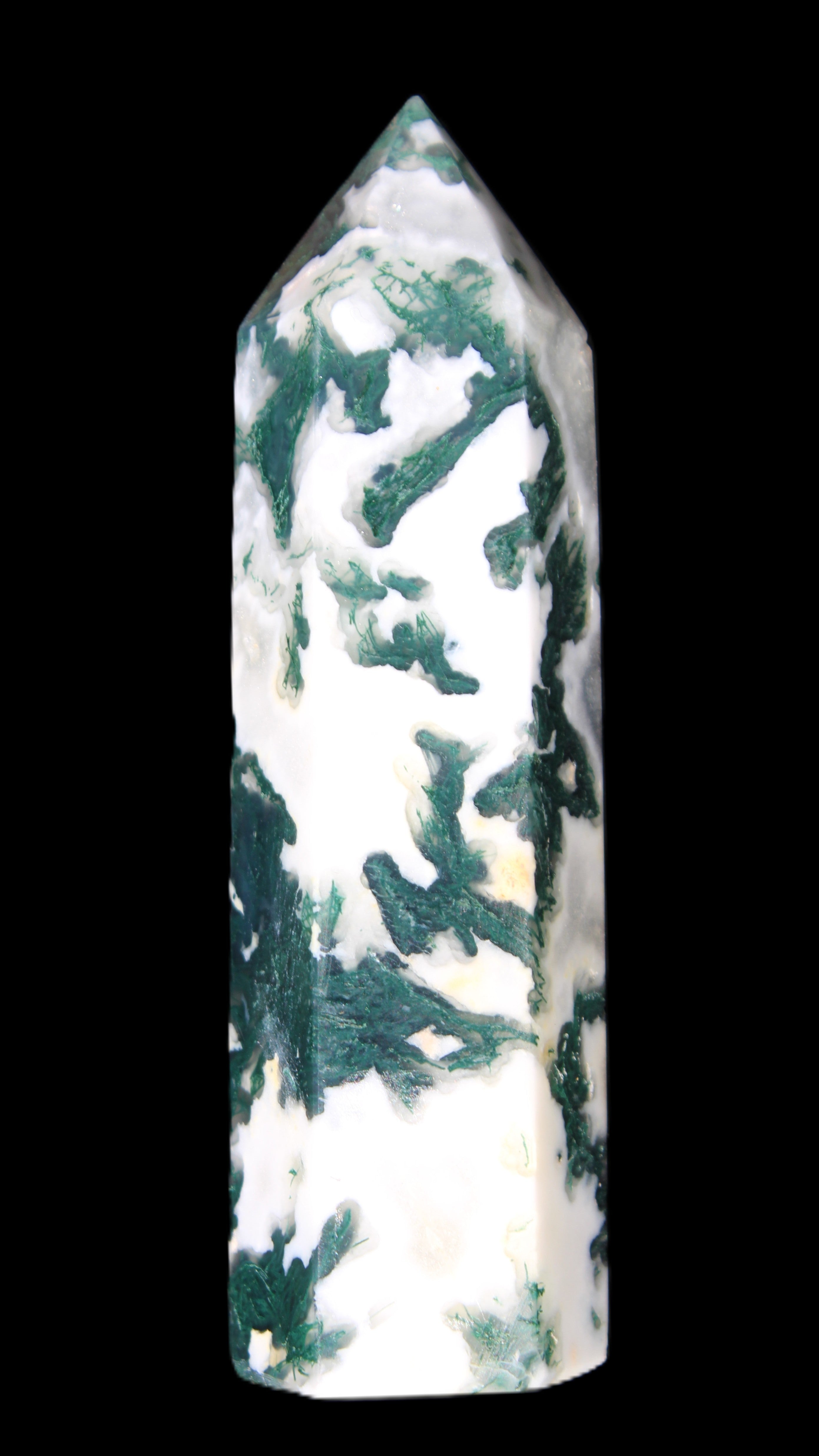 Moss Agate is a form of Chalcedony with embedded green minerals formed from oxidised Iron, Manganese and other elements. These green strands in the stone have the appearance of moss-like tendrils. It is not a true agate as it lacks agate banding.