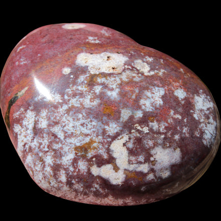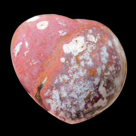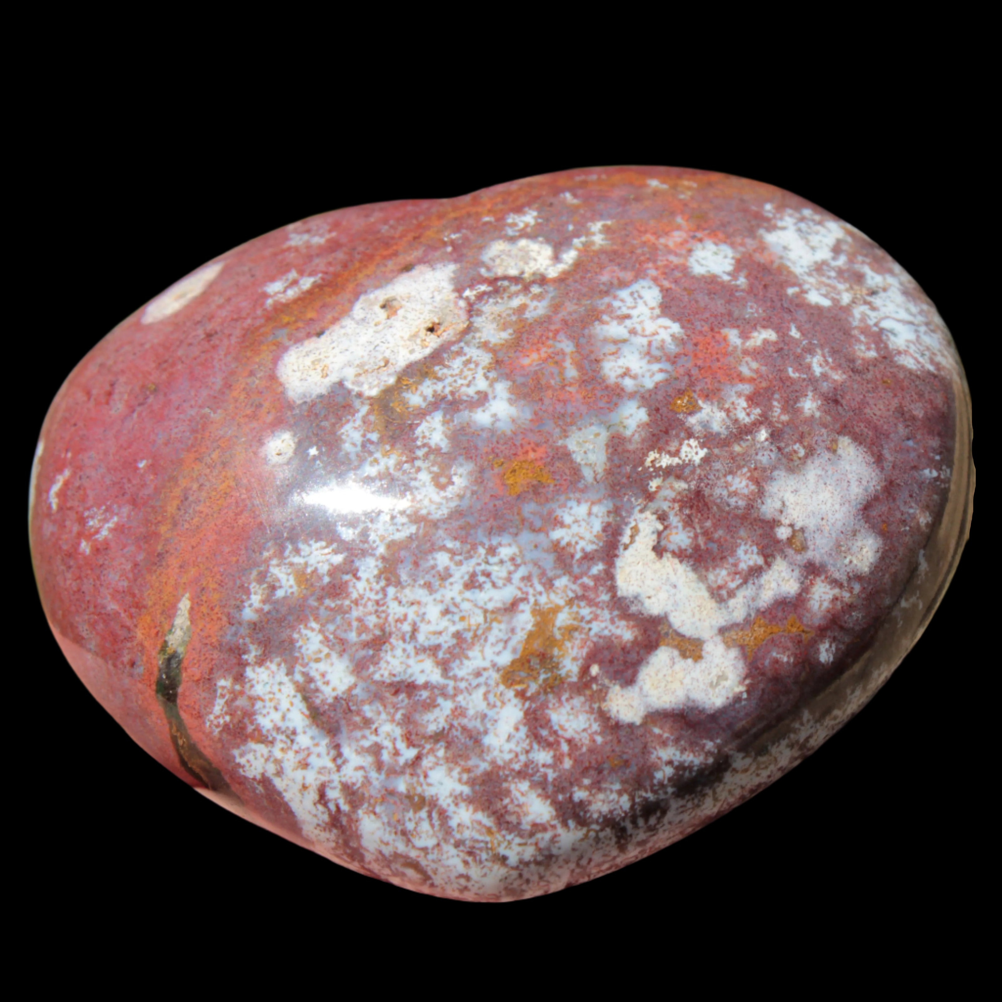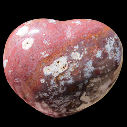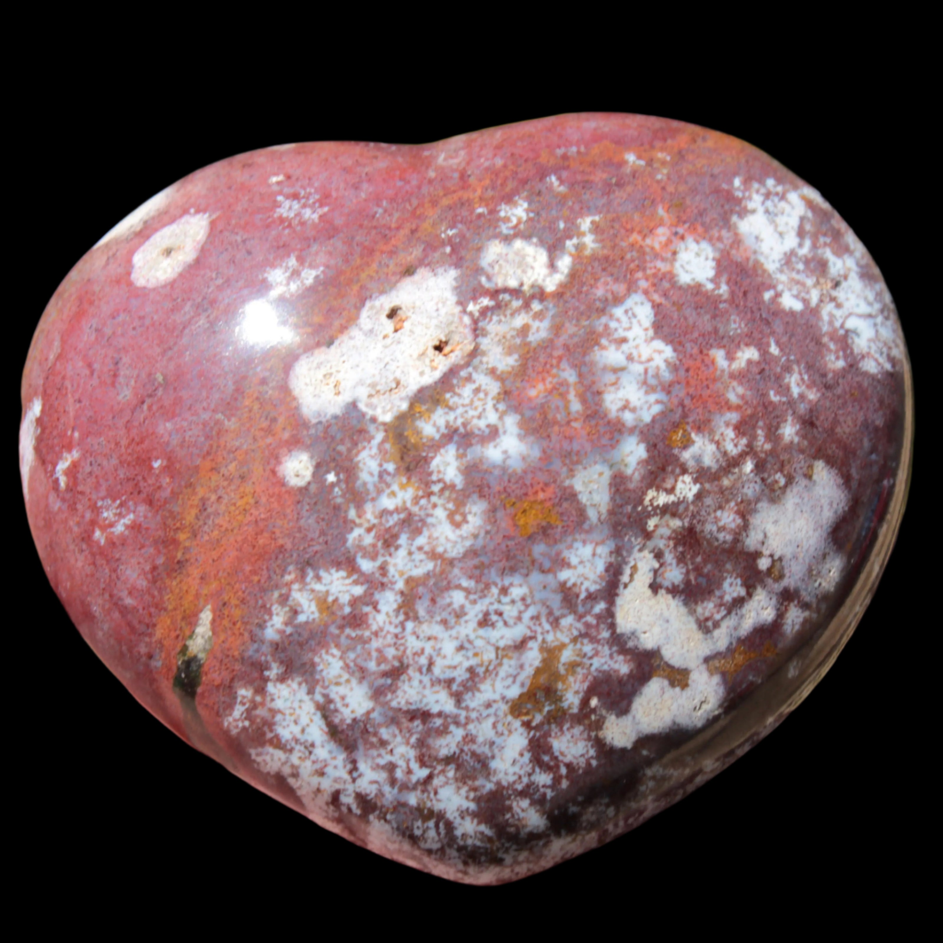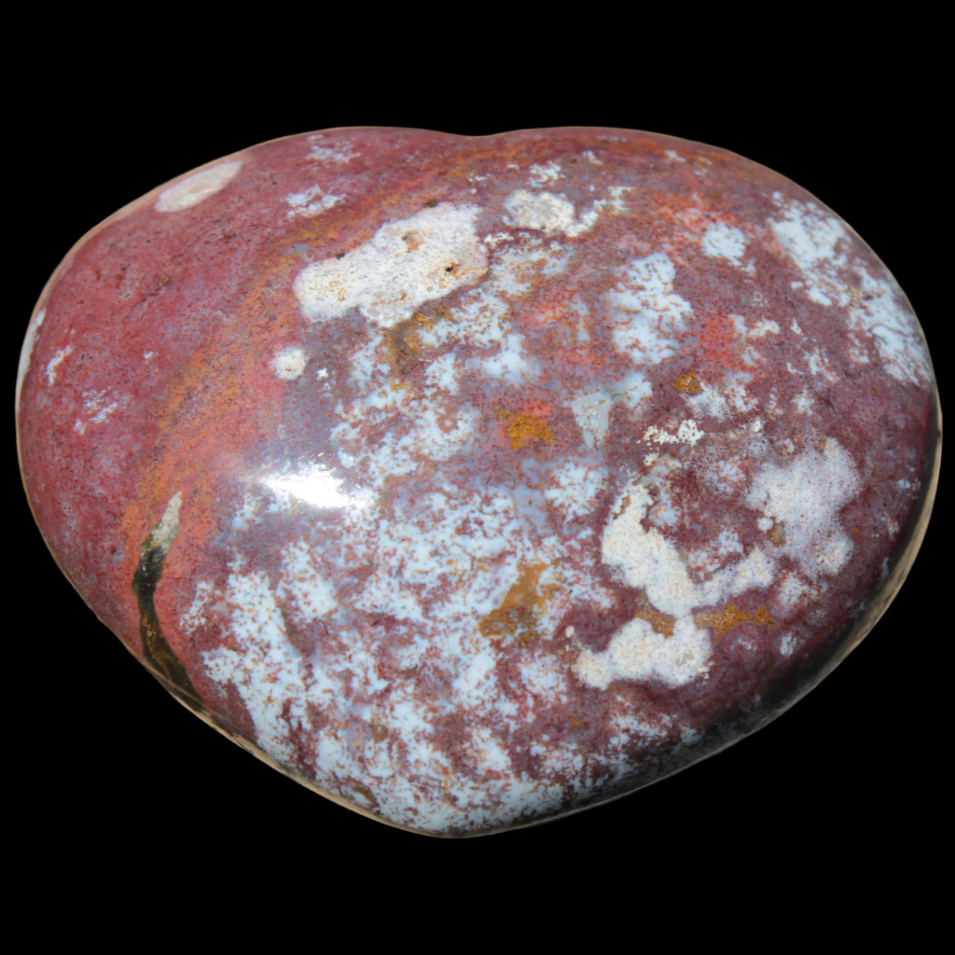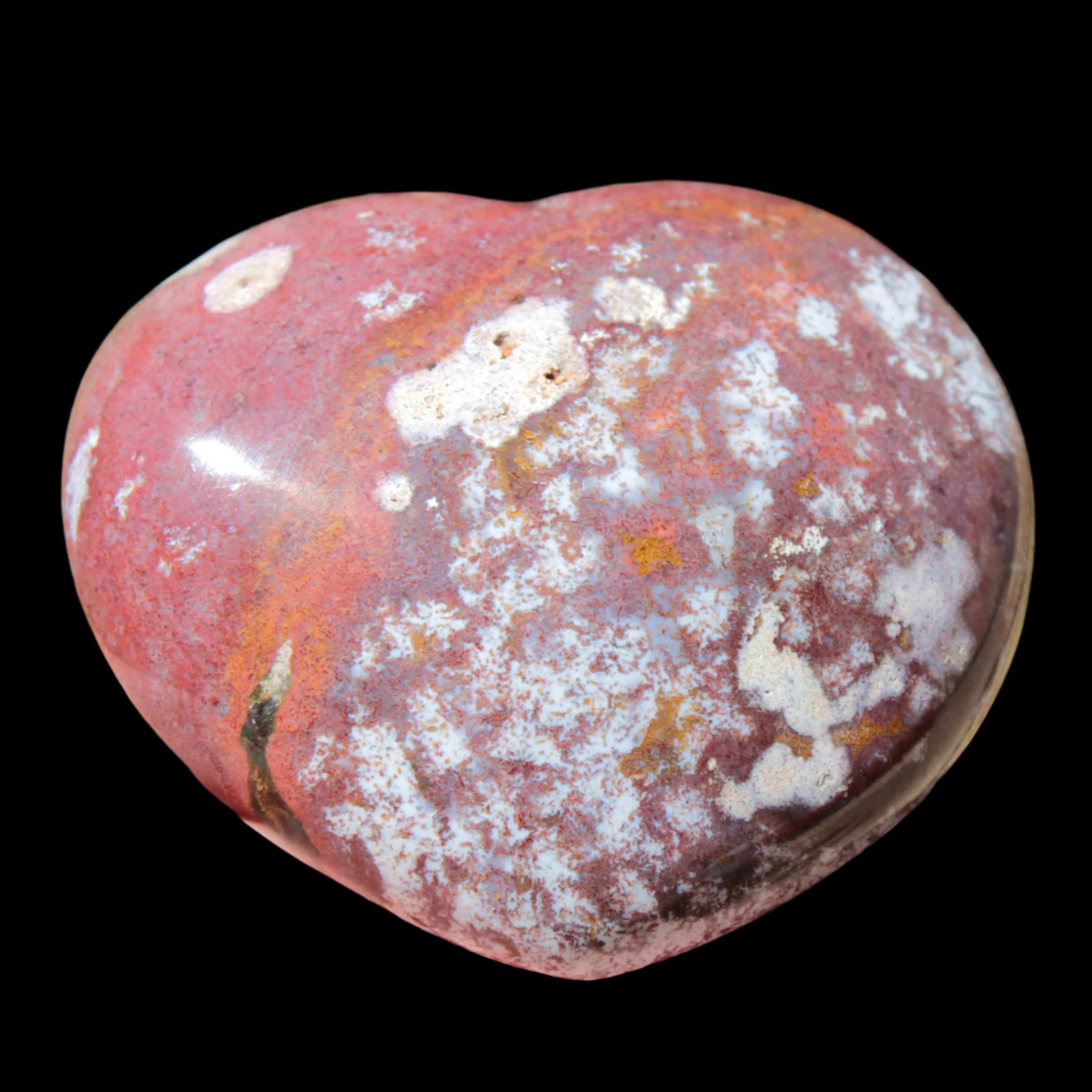 This Ocean Jasper heart weighs 216g. Ocean Jasper contains circular inclusions of quartz or feldspar. These can be seen as a pattern of brown, blue, green, grey, pink, red, yellow or white orbs. Another name for Ocean Jasper is Orbicular Jasper. It is extremely rare, formerly only found at one location on Madagascar’s shoreline at low tide. That major deposit was mined out in 2006.