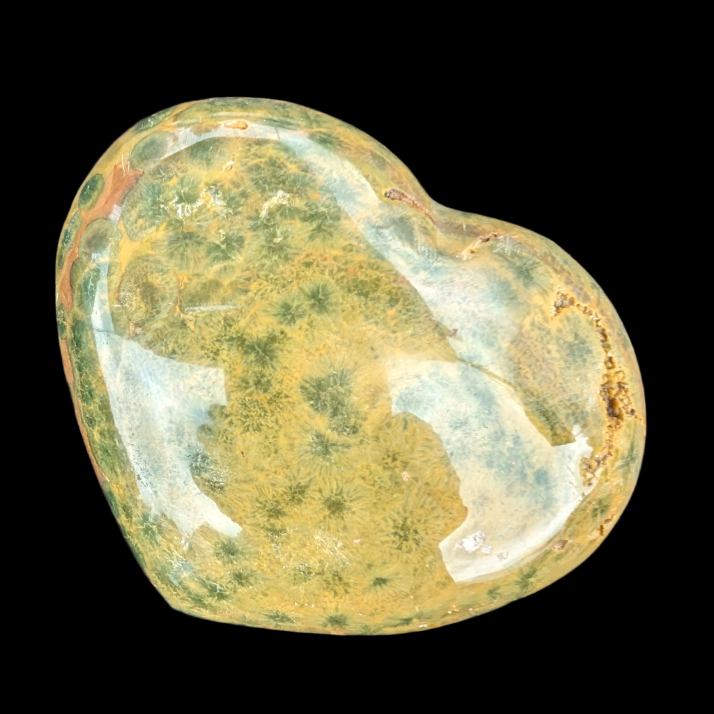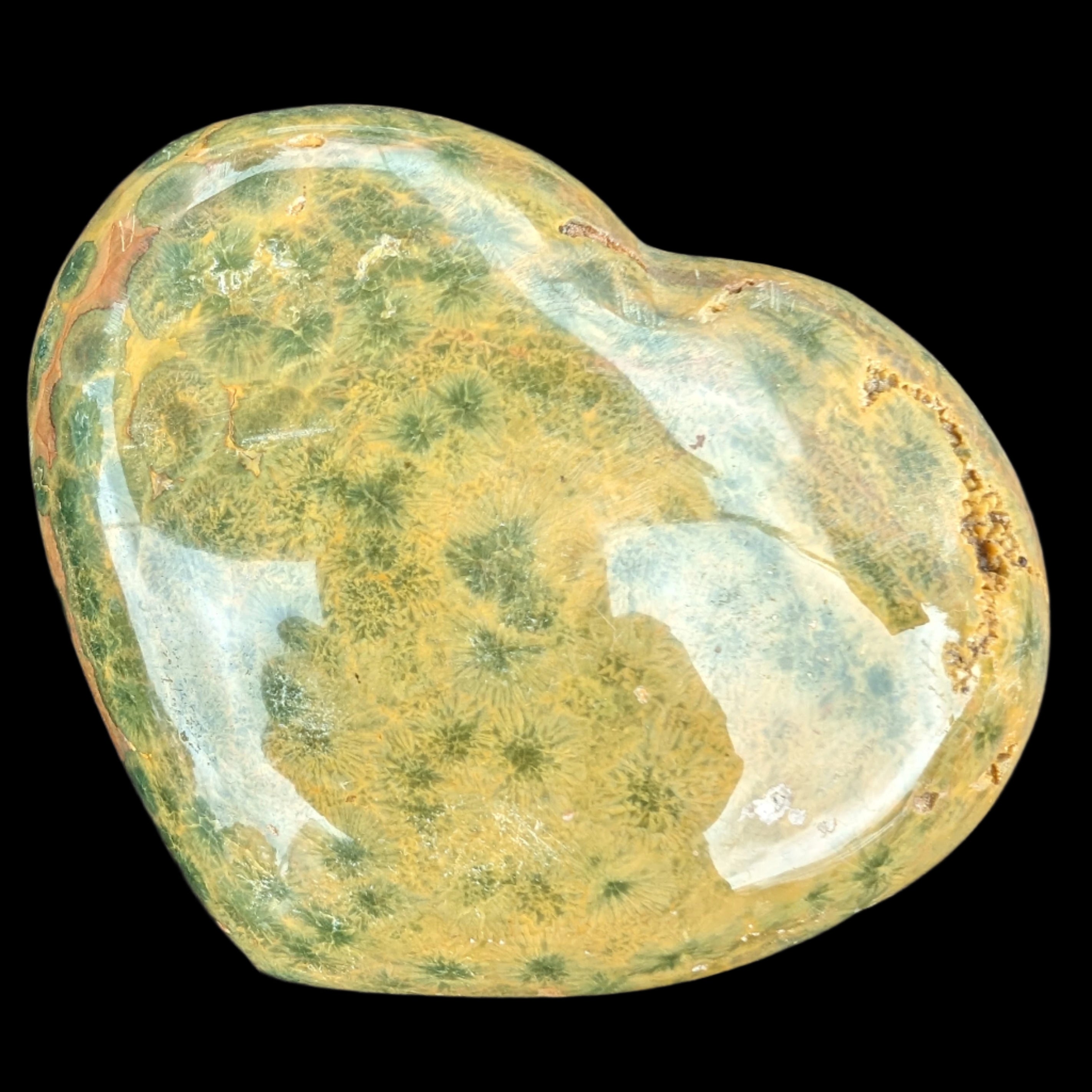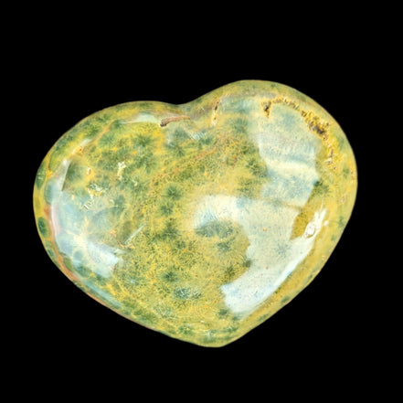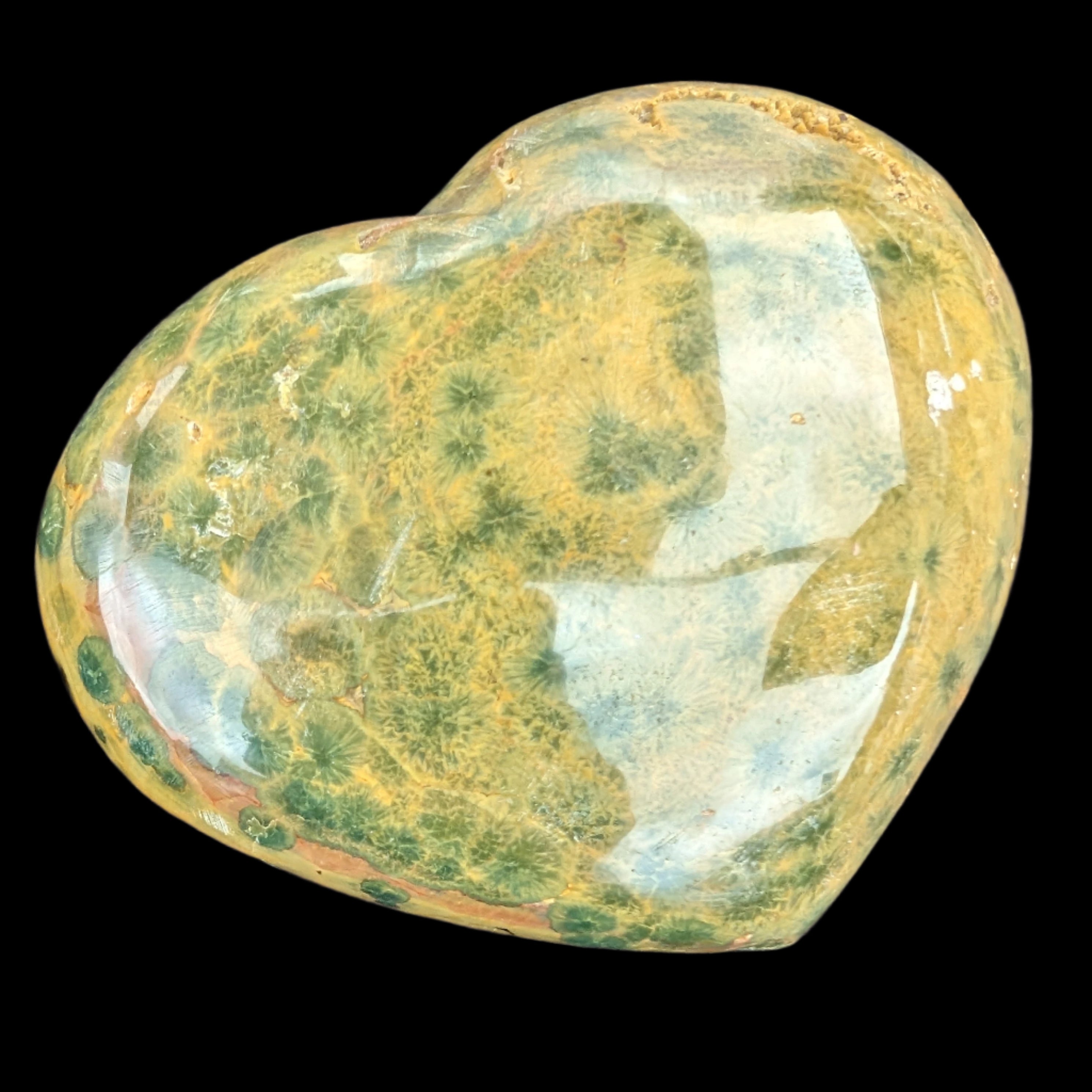 This Ocean Jasper heart weighs 386g. Ocean Jasper contains circular inclusions of quartz or feldspar. These can be seen as a pattern of brown, blue, green, grey, pink, red, yellow or white orbs. Another name for Ocean Jasper is Orbicular Jasper. It is extremely rare, formerly only found at one location on Madagascar’s shoreline at low tide. That major deposit was mined out in 2006.
