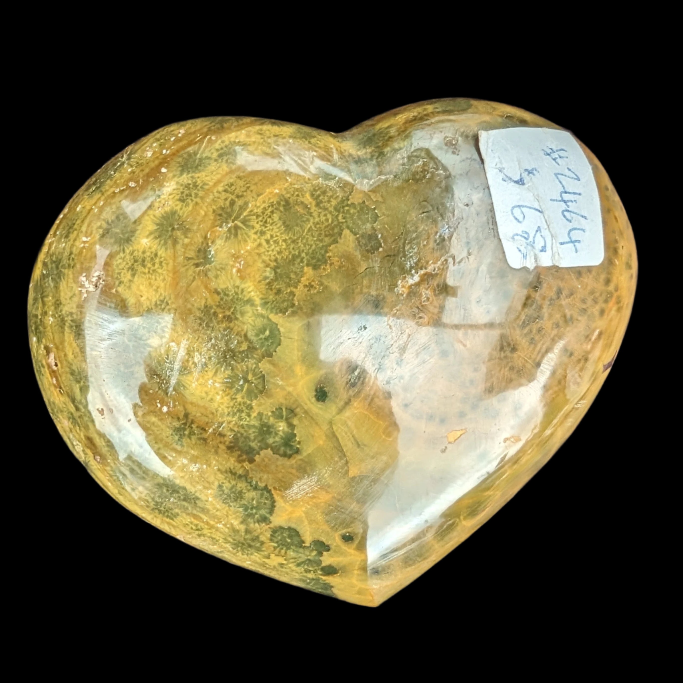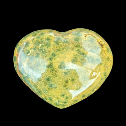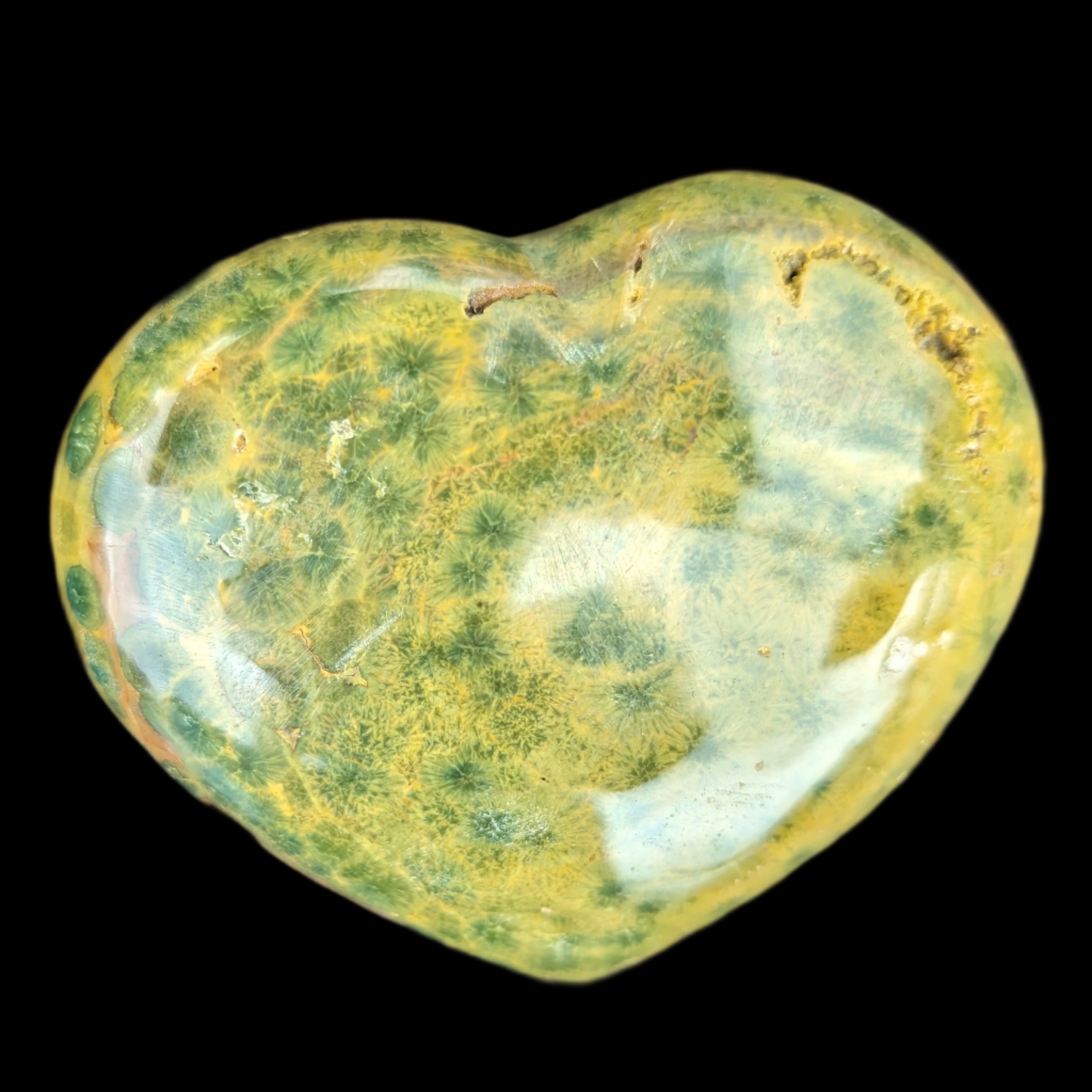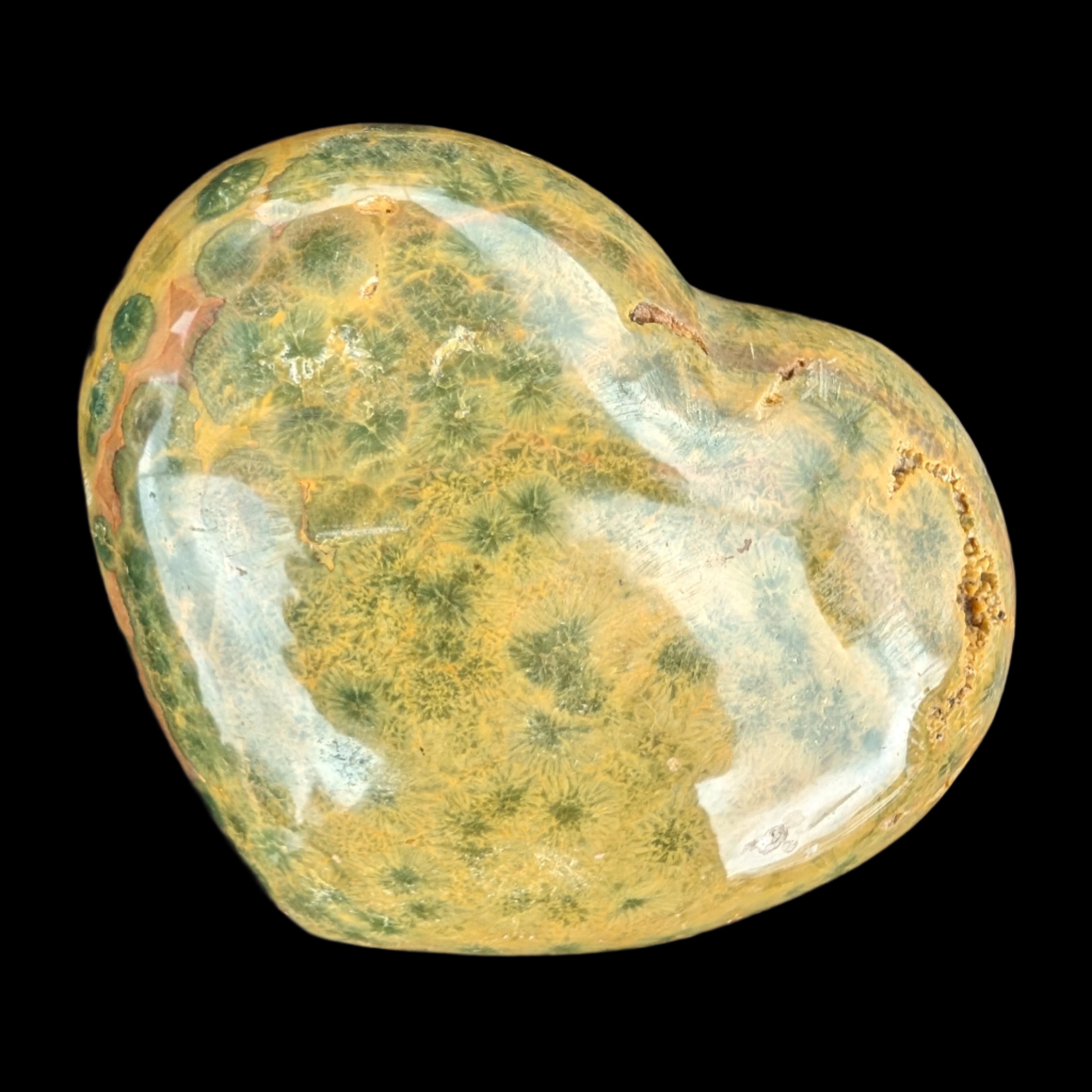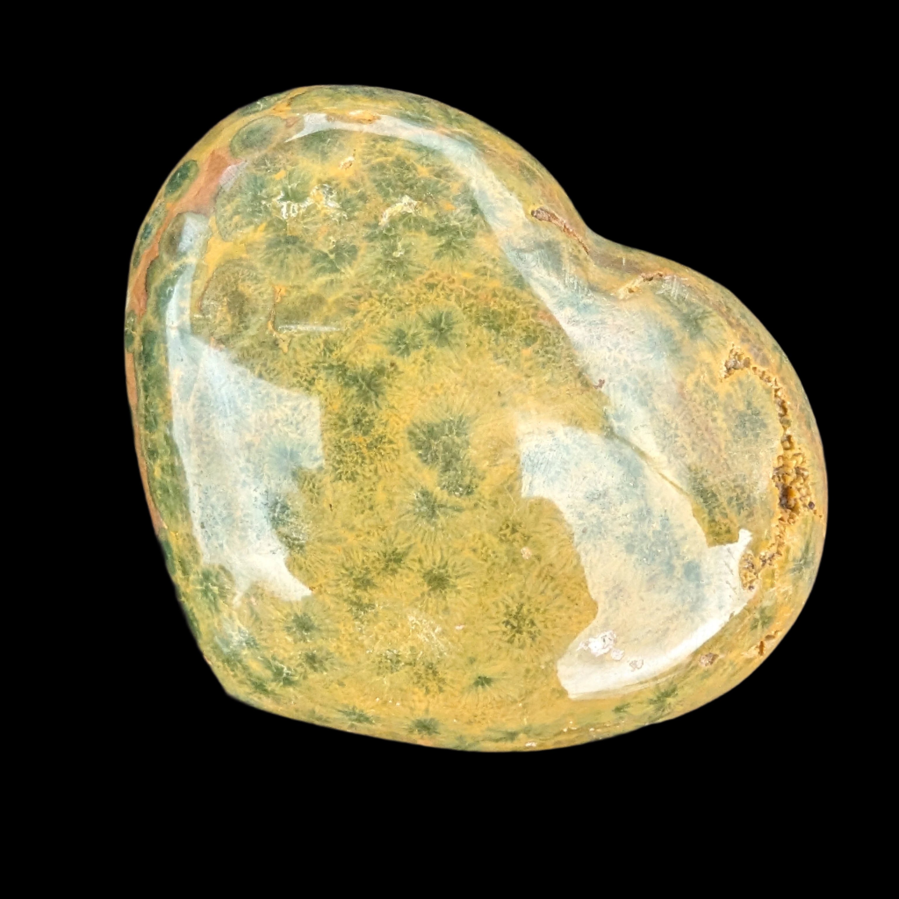 This Ocean Jasper heart weighs 386g. Ocean Jasper contains circular inclusions of quartz or feldspar. These can be seen as a pattern of brown, blue, green, grey, pink, red, yellow or white orbs. Another name for Ocean Jasper is Orbicular Jasper. It is extremely rare, formerly only found at one location on Madagascar’s shoreline at low tide. That major deposit was mined out in 2006.