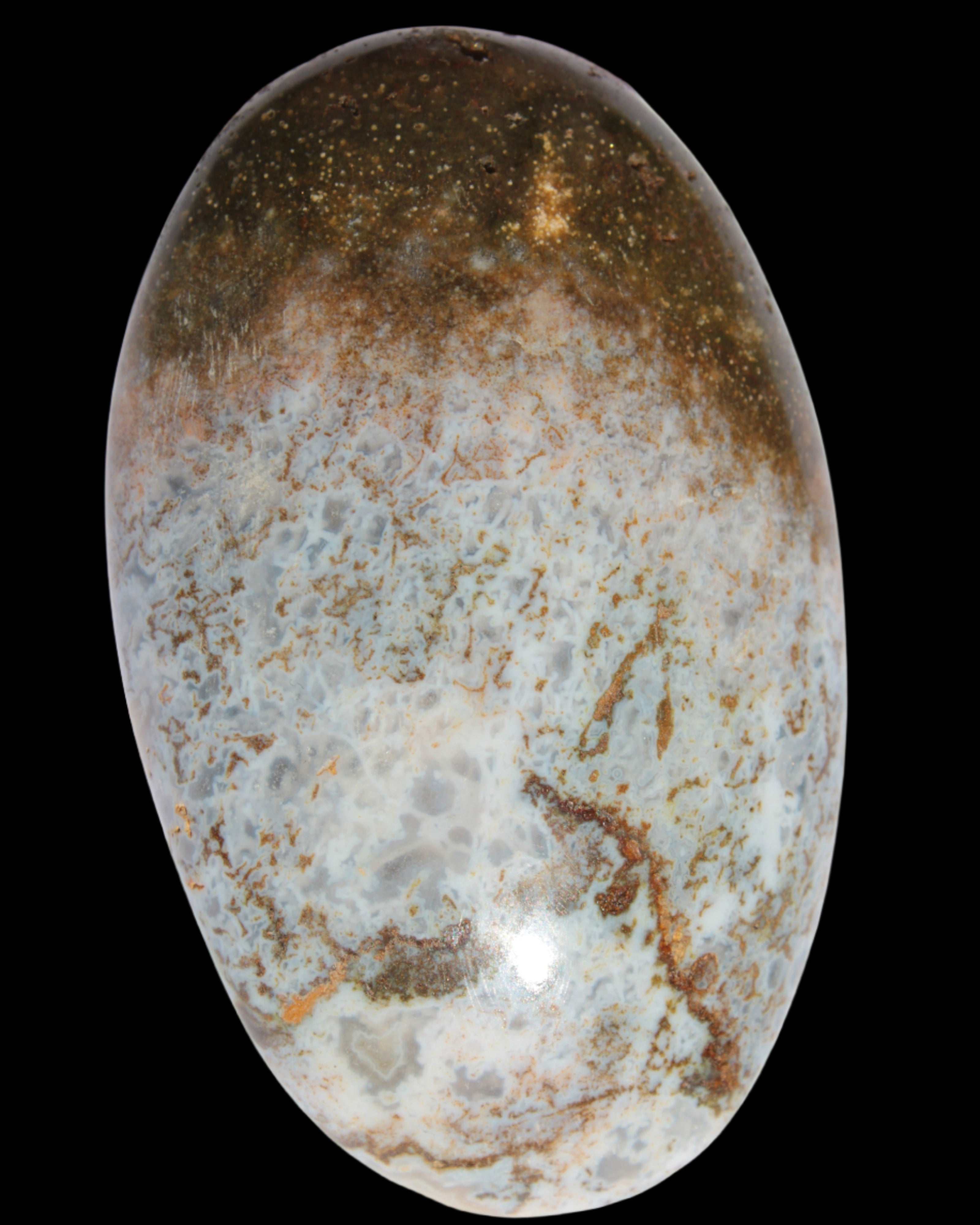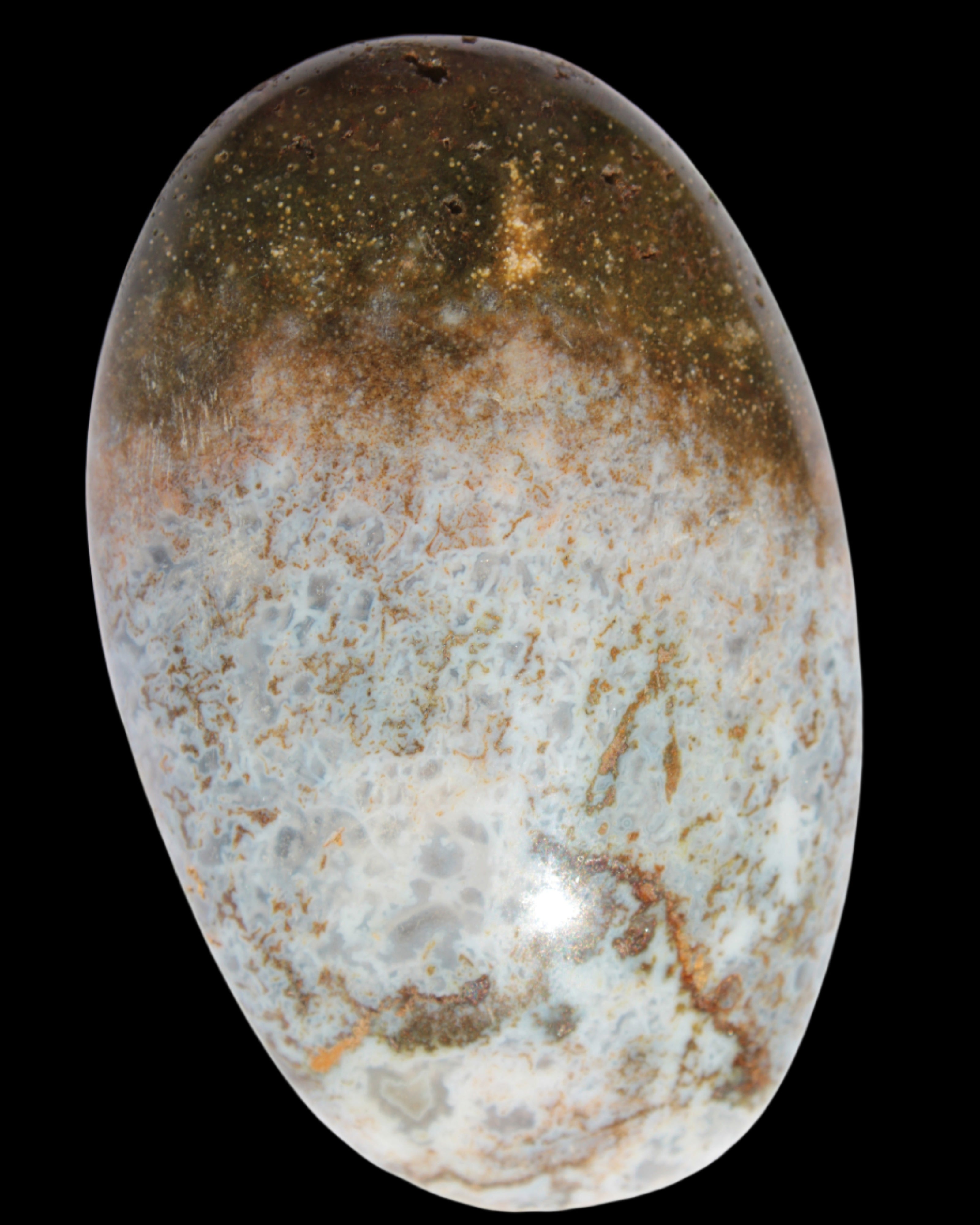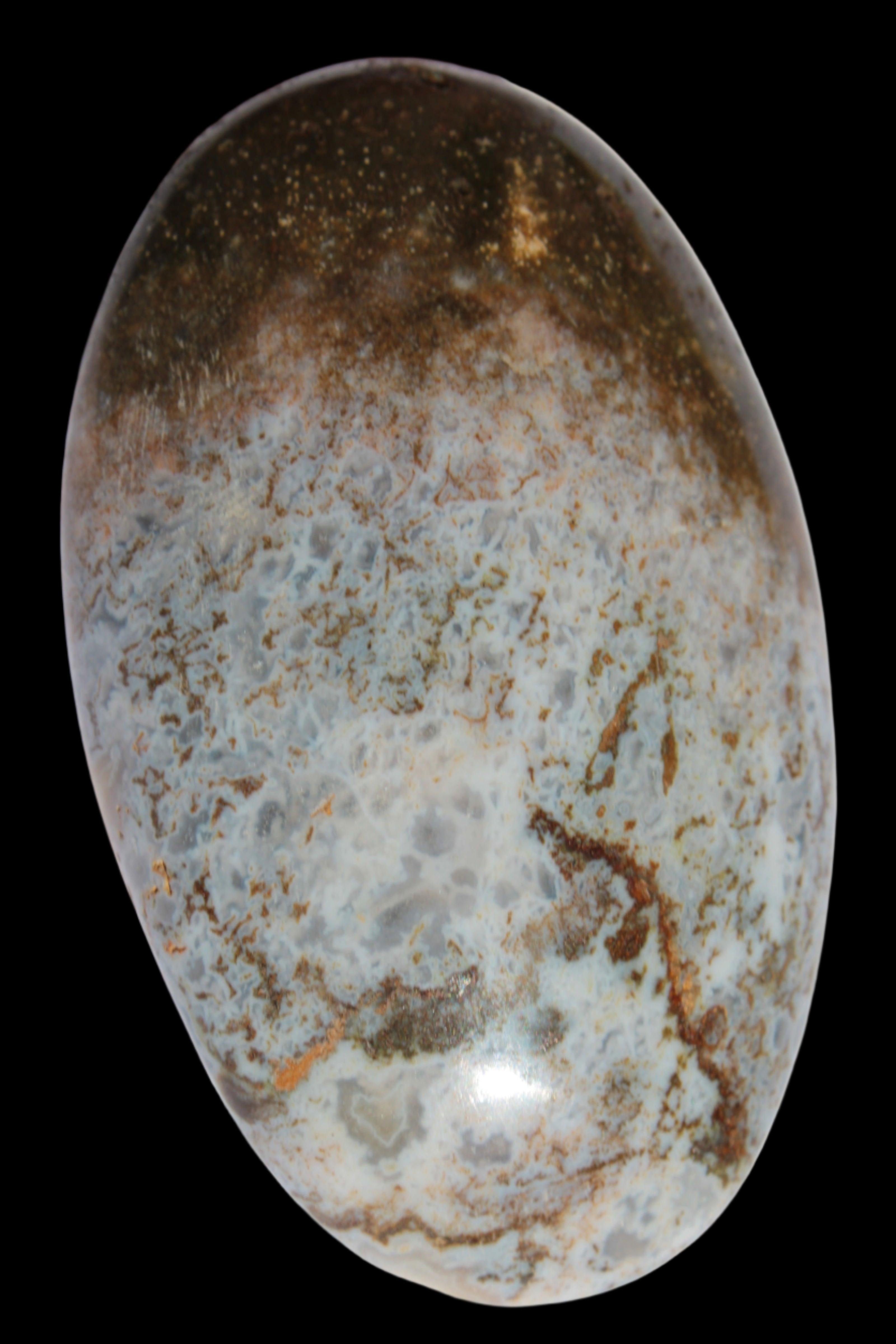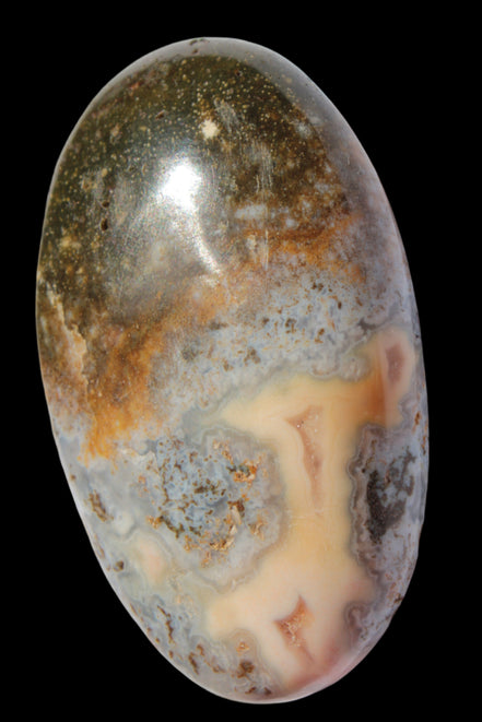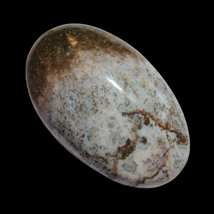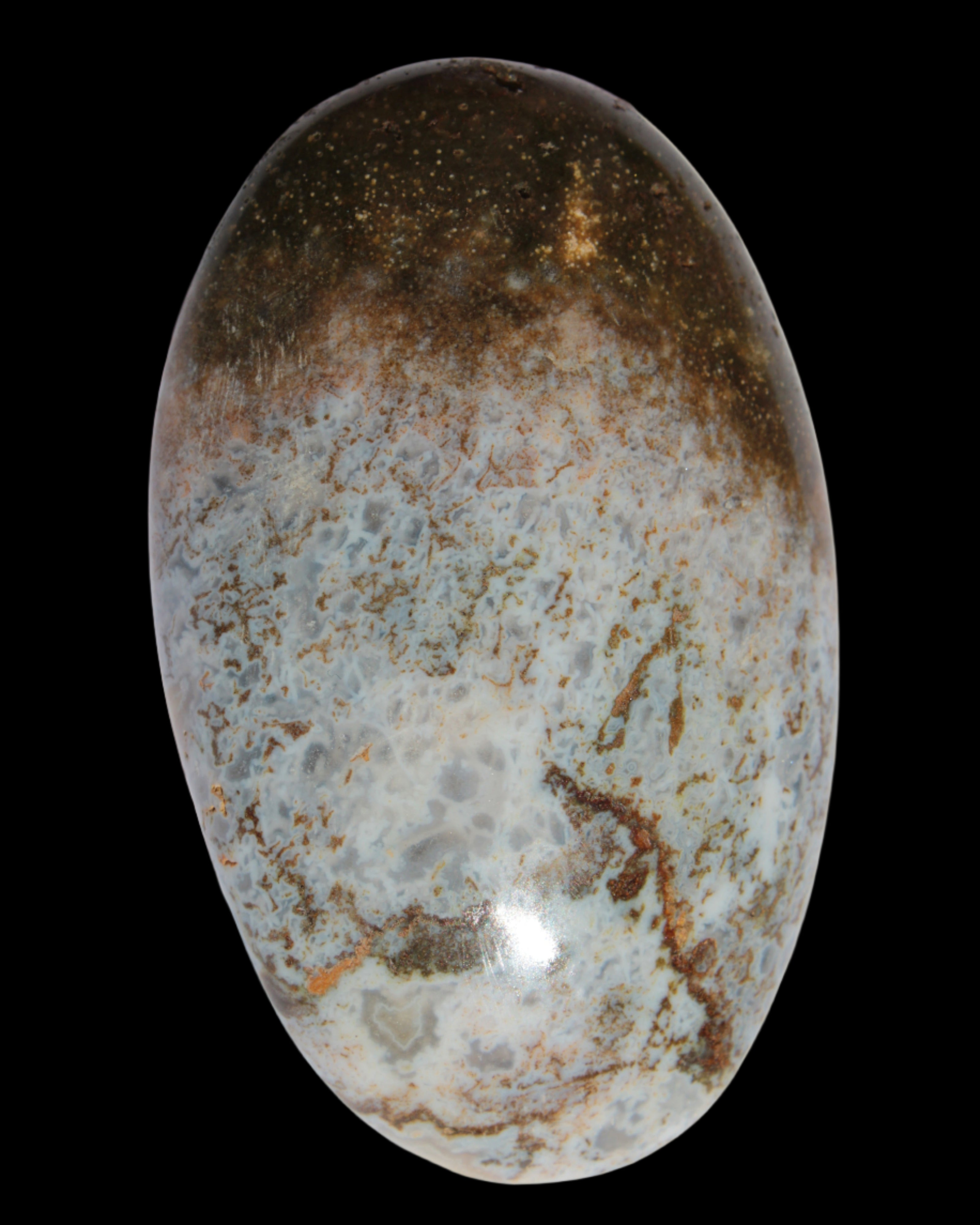 This Ocean Jasper palmstone weighs 81g. Ocean Jasper contains circular inclusions of quartz or feldspar. These can be seen as a pattern of brown, blue, green, grey, pink, red, yellow or white orbs. Another name for Ocean Jasper is Orbicular Jasper. It is extremely rare, formerly only found at one location on Madagascar’s shoreline at low tide. That major deposit was mined out in 2006.