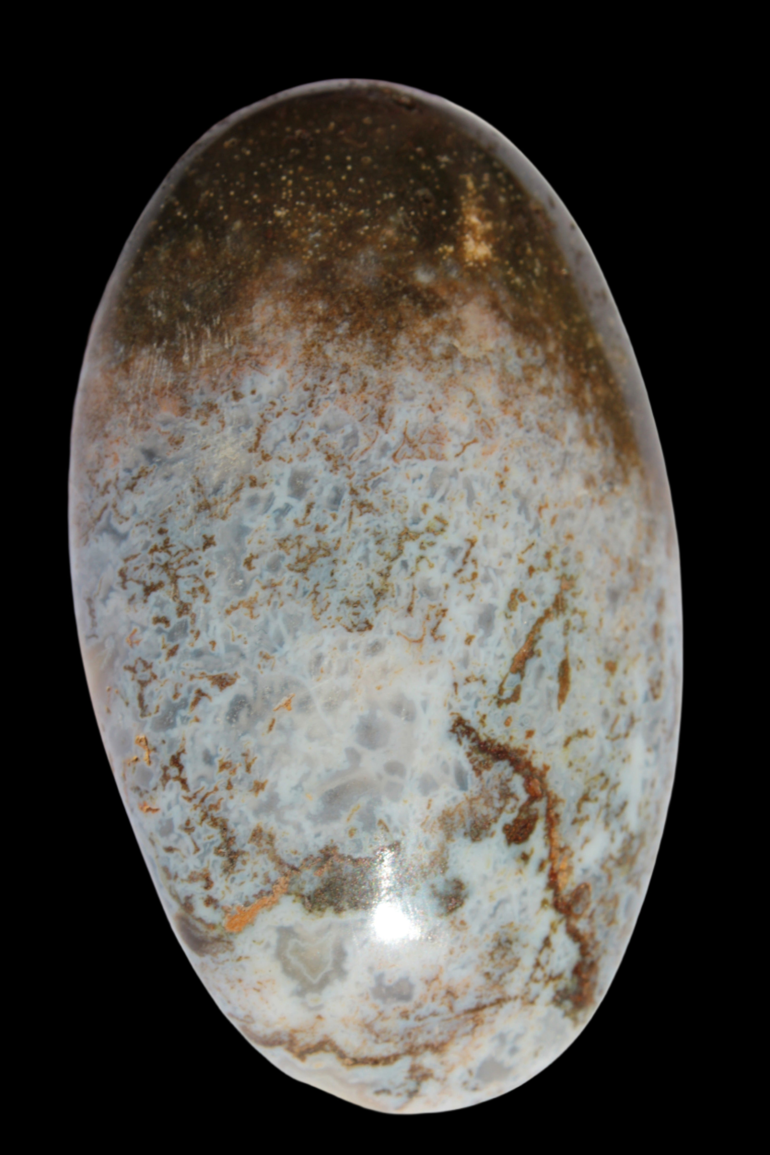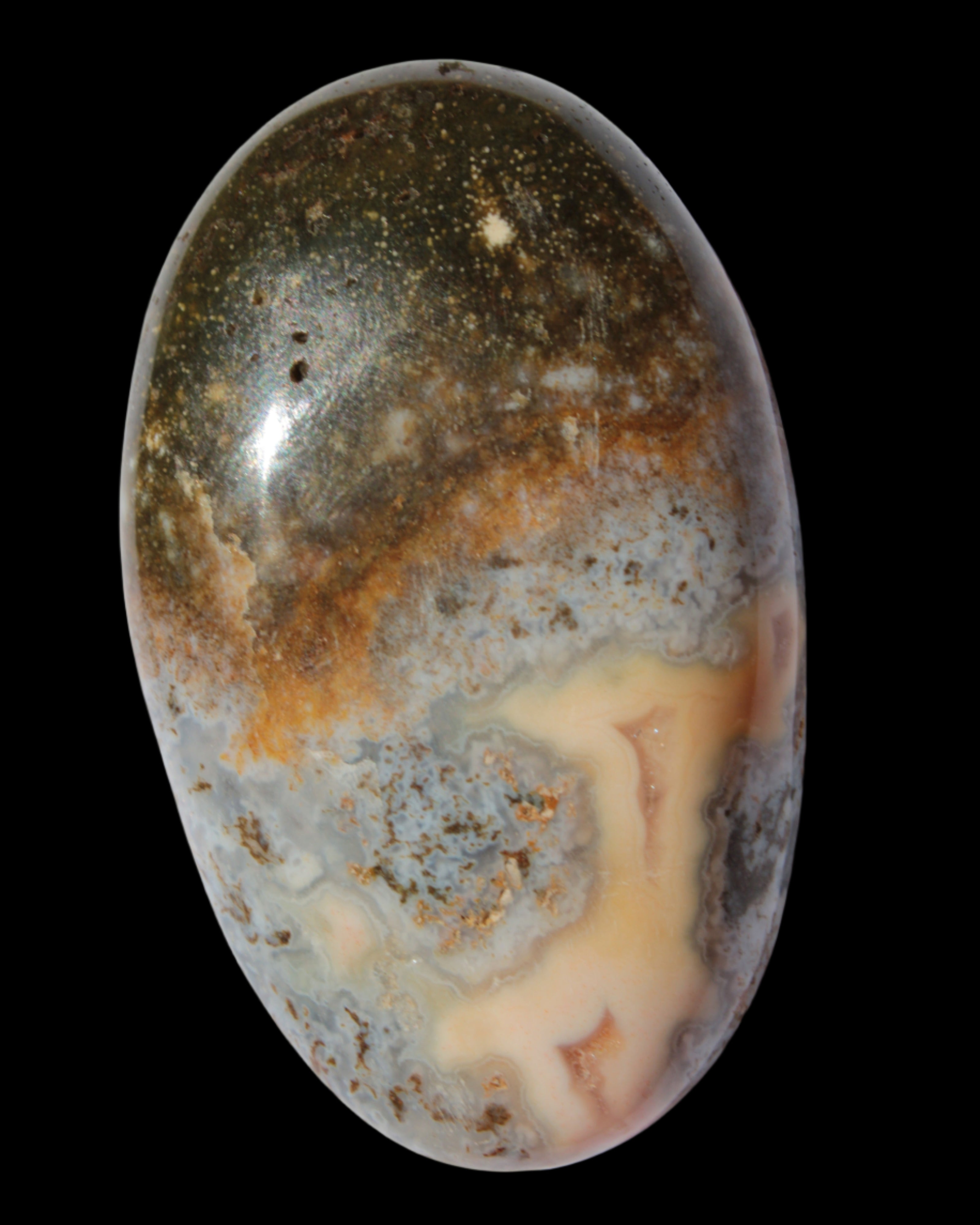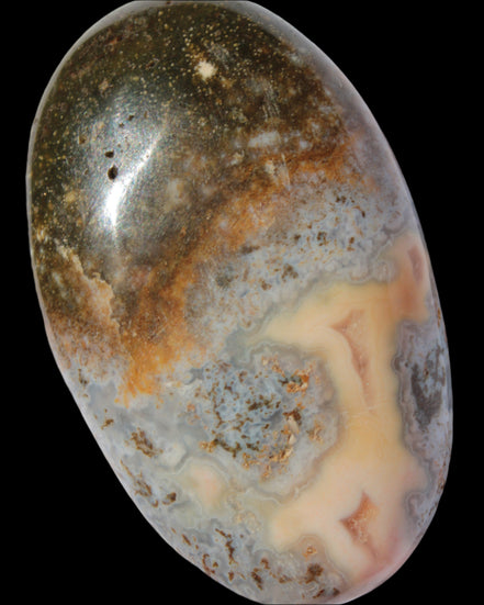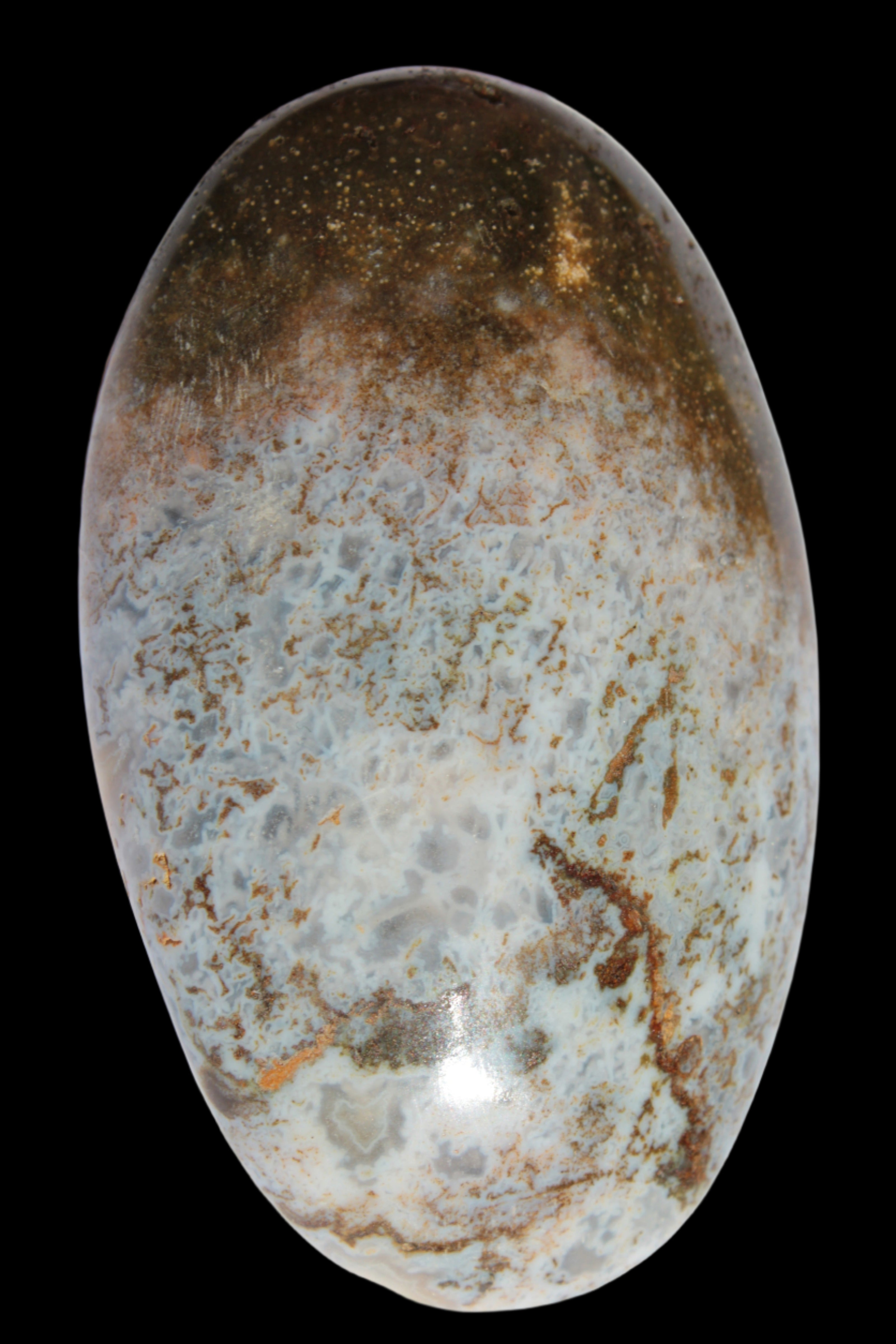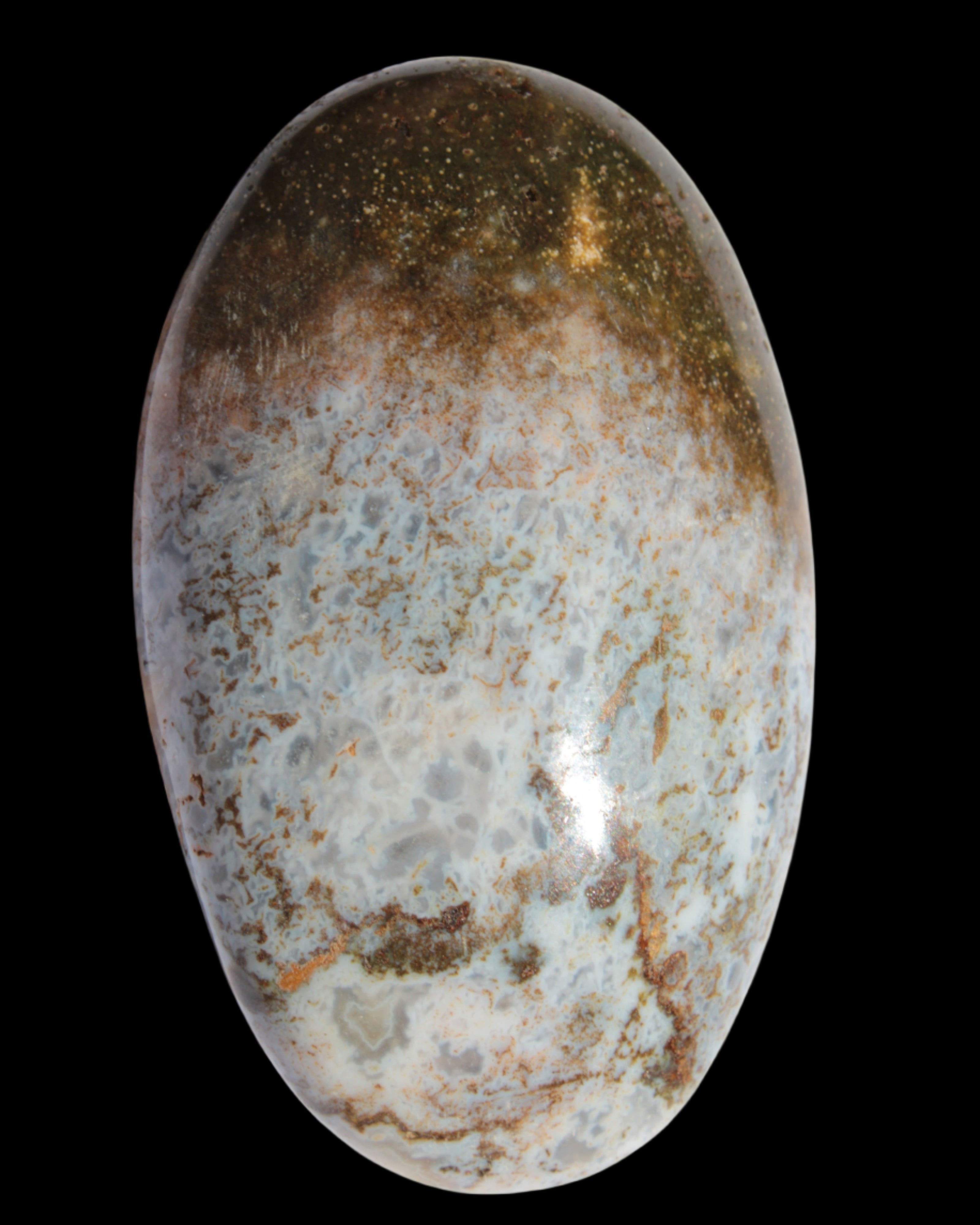 This Ocean Jasper palmstone weighs 81g. Ocean Jasper contains circular inclusions of quartz or feldspar. These can be seen as a pattern of brown, blue, green, grey, pink, red, yellow or white orbs. Another name for Ocean Jasper is Orbicular Jasper. It is extremely rare, formerly only found at one location on Madagascar’s shoreline at low tide. That major deposit was mined out in 2006.