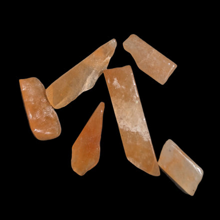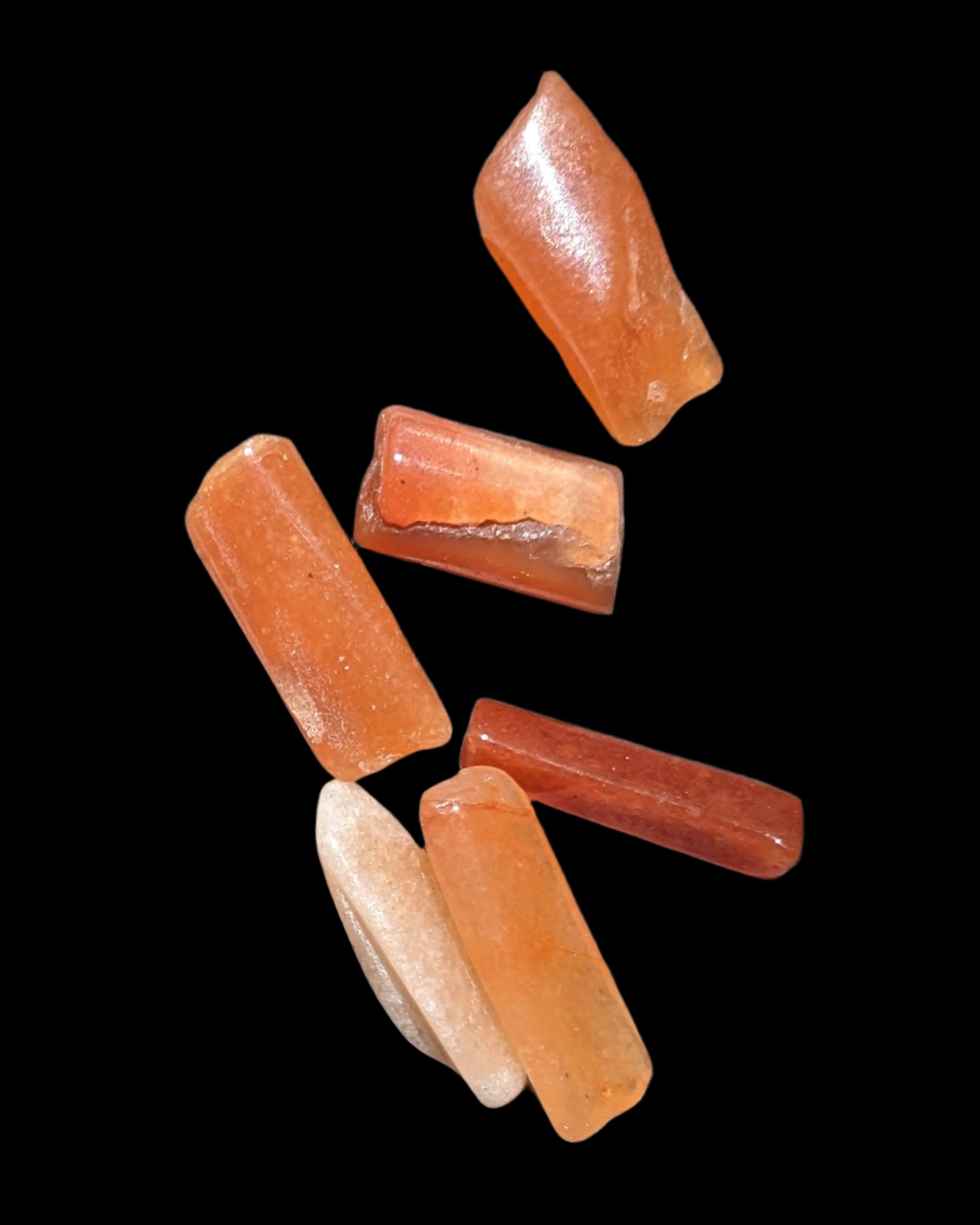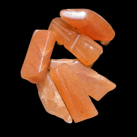 These Orange Aventurine 5-7 tiny tumbled stones selections weigh 5g. Aventurine is known both as the ‘Lucky stone’ and as the ‘Stone of Opportunity’. It is a form of translucent quartz with platy mineral inclusions that give a shimmering effect. Chrome-bearing fuchsite (a muscovite mica) is the main inclusion, giving the stone its silvery-green or blue glistening.